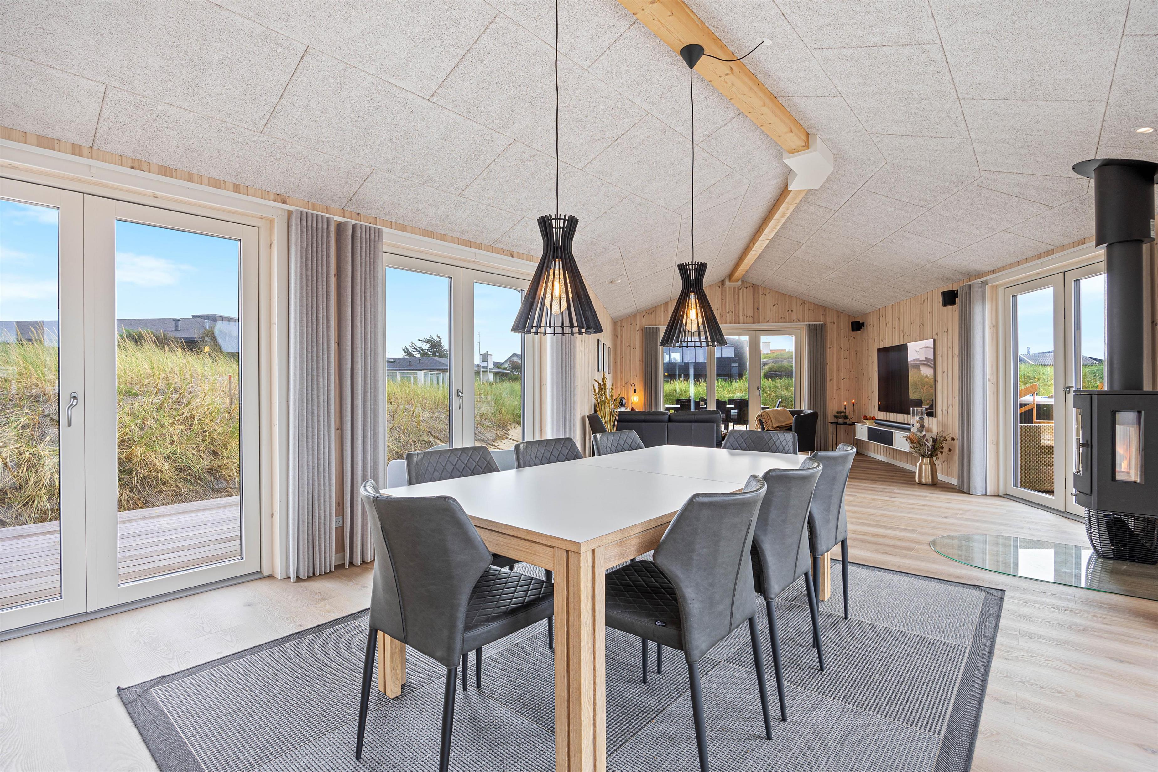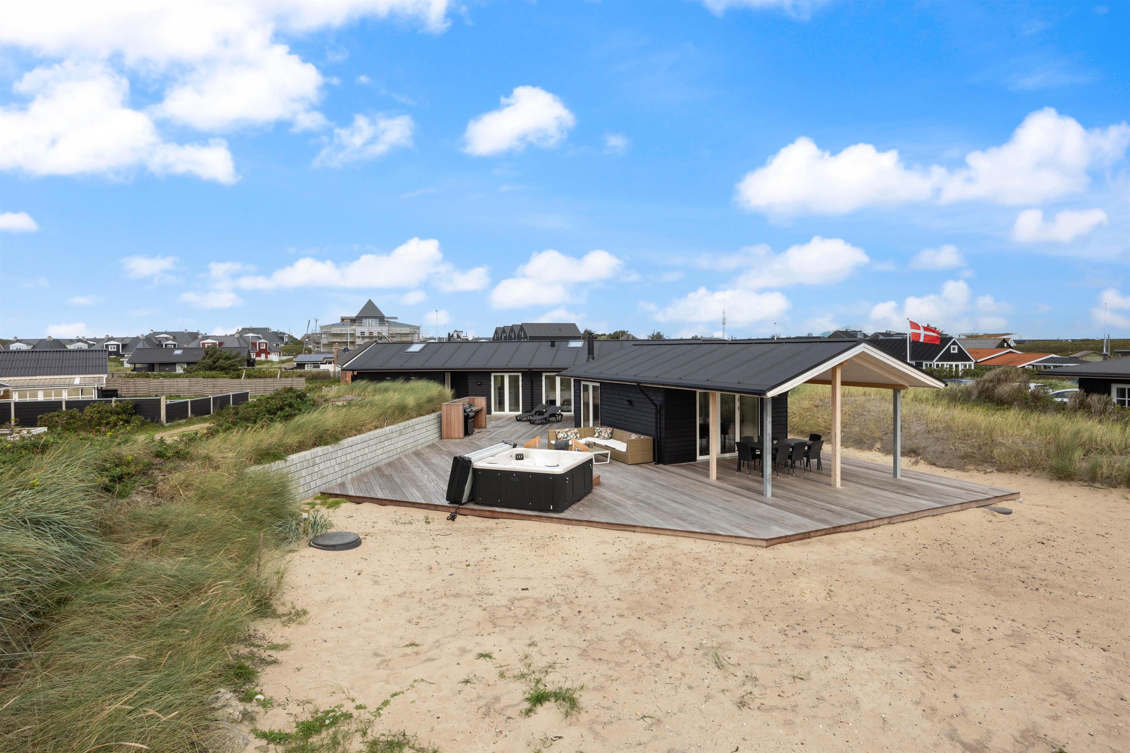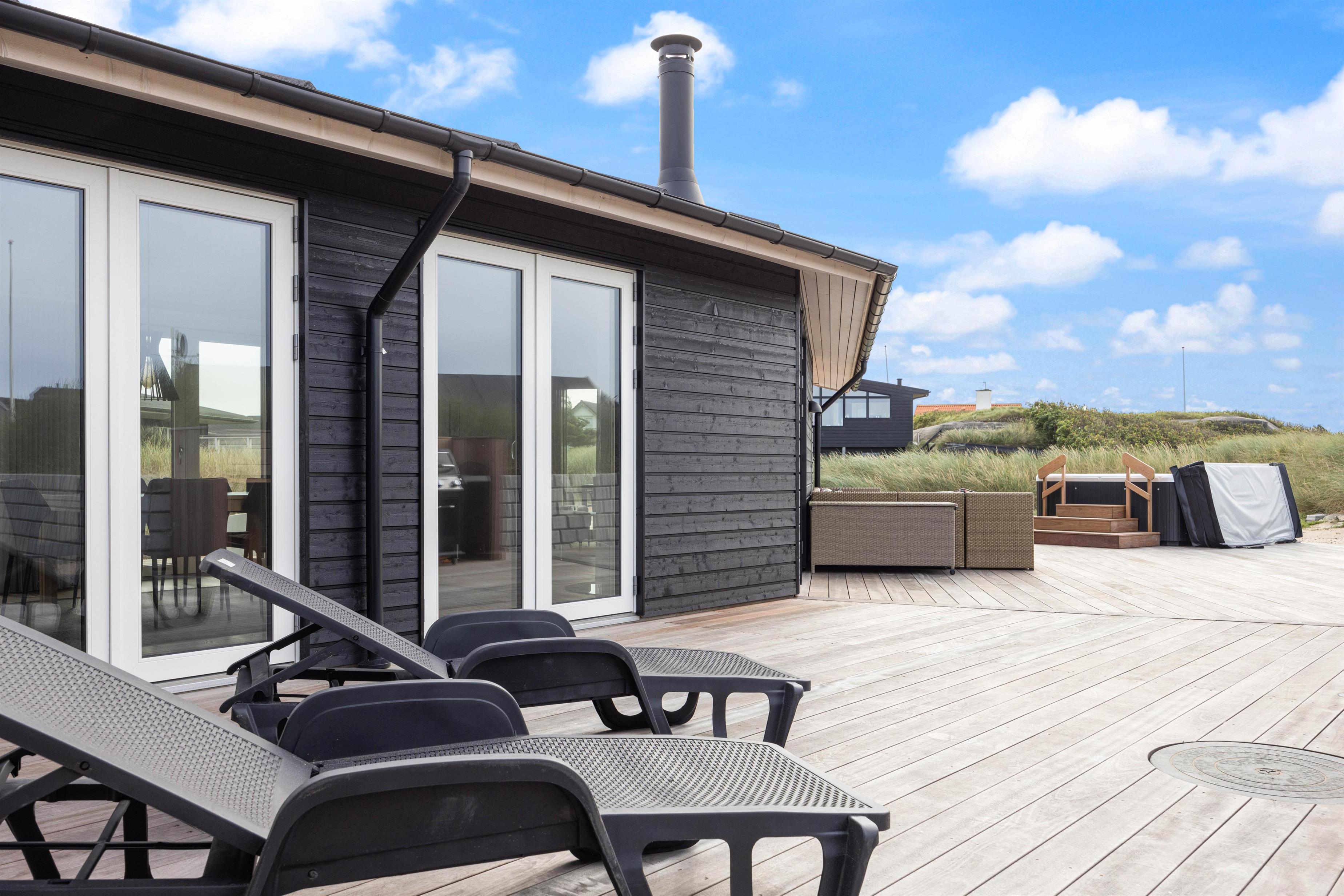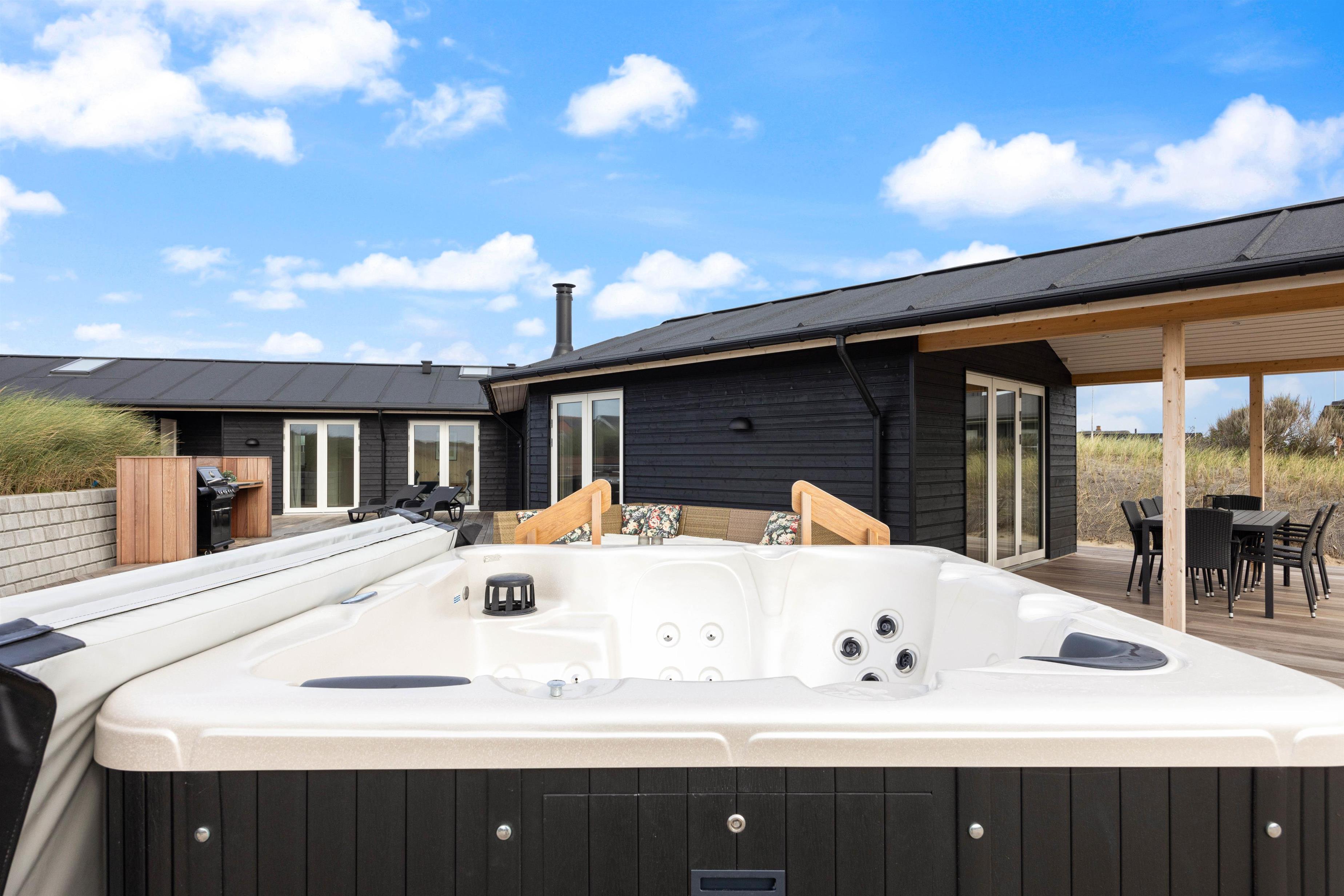Et absolut højdepunkt på terrassen er det super skønne spabad, der har plads til 6 personer. Uanset om det er om dagen eller om aftenen, kan I skabe en afslappende atmosfære og nyde øjeblikke af ren velvære med jeres kære. Terrassen byder på skønne hyggekroge, hvor I kan nyde drinks eller bare slappe af efter en forfriskende gåtur til Vesterhavet.