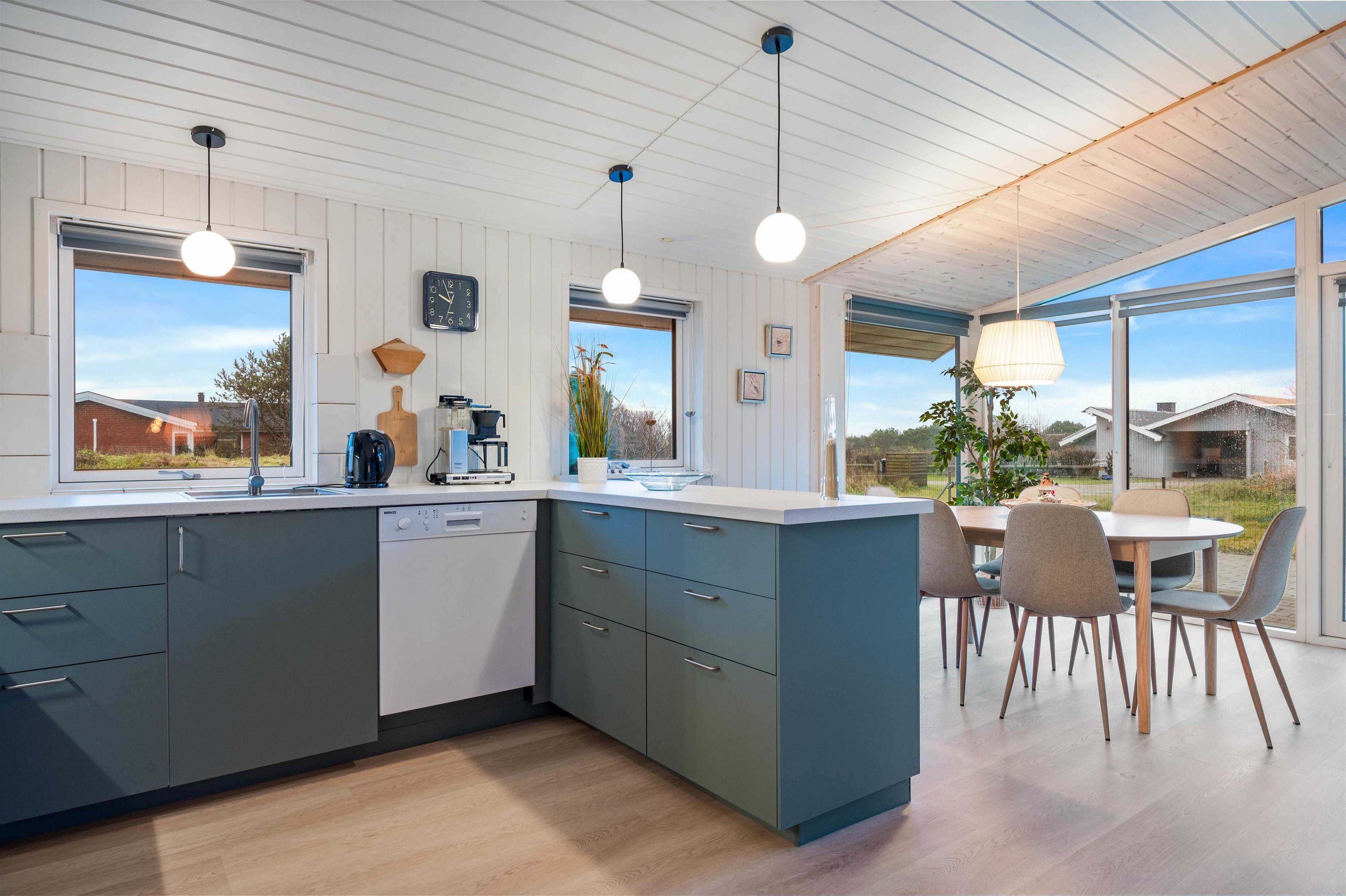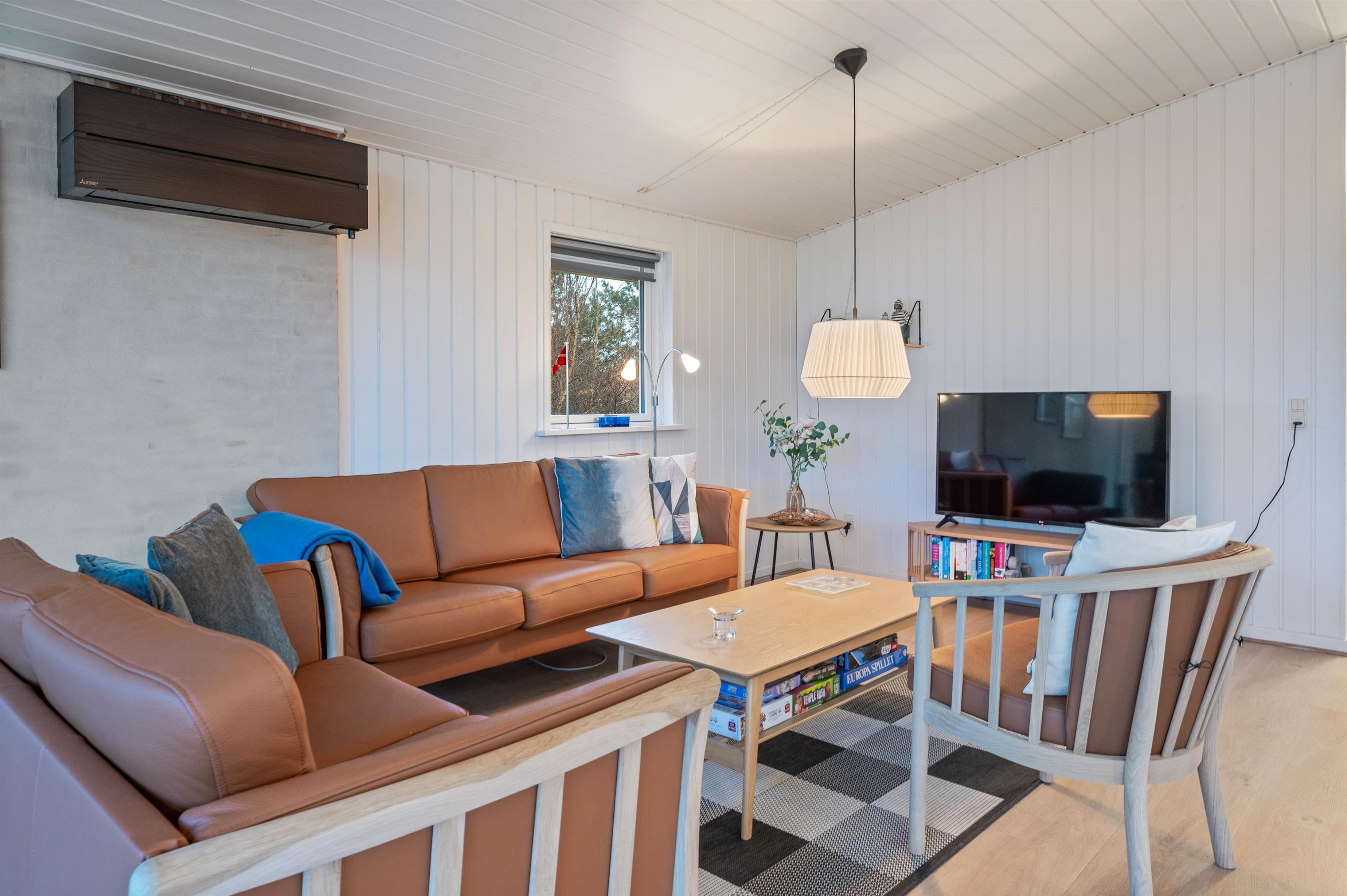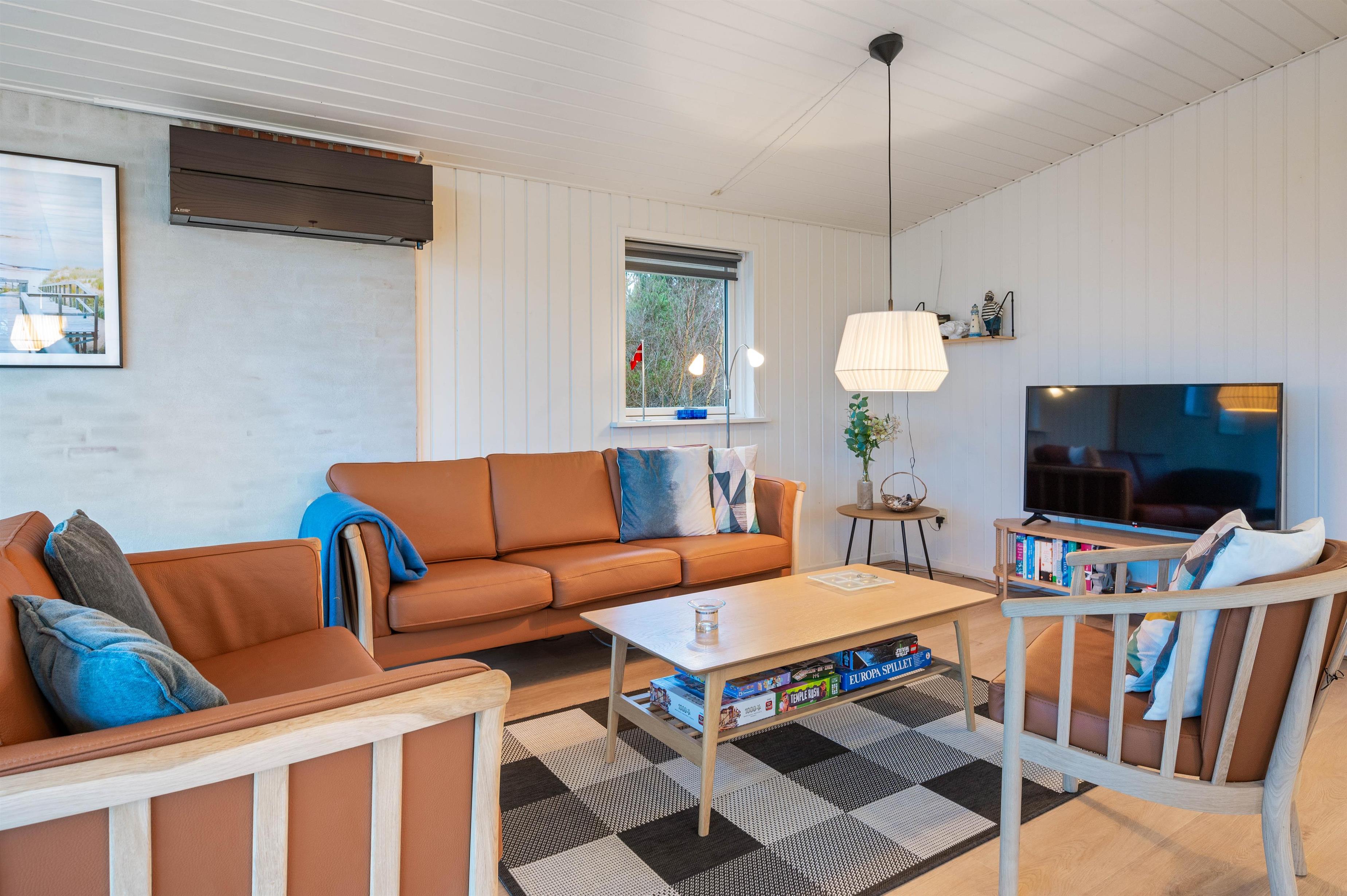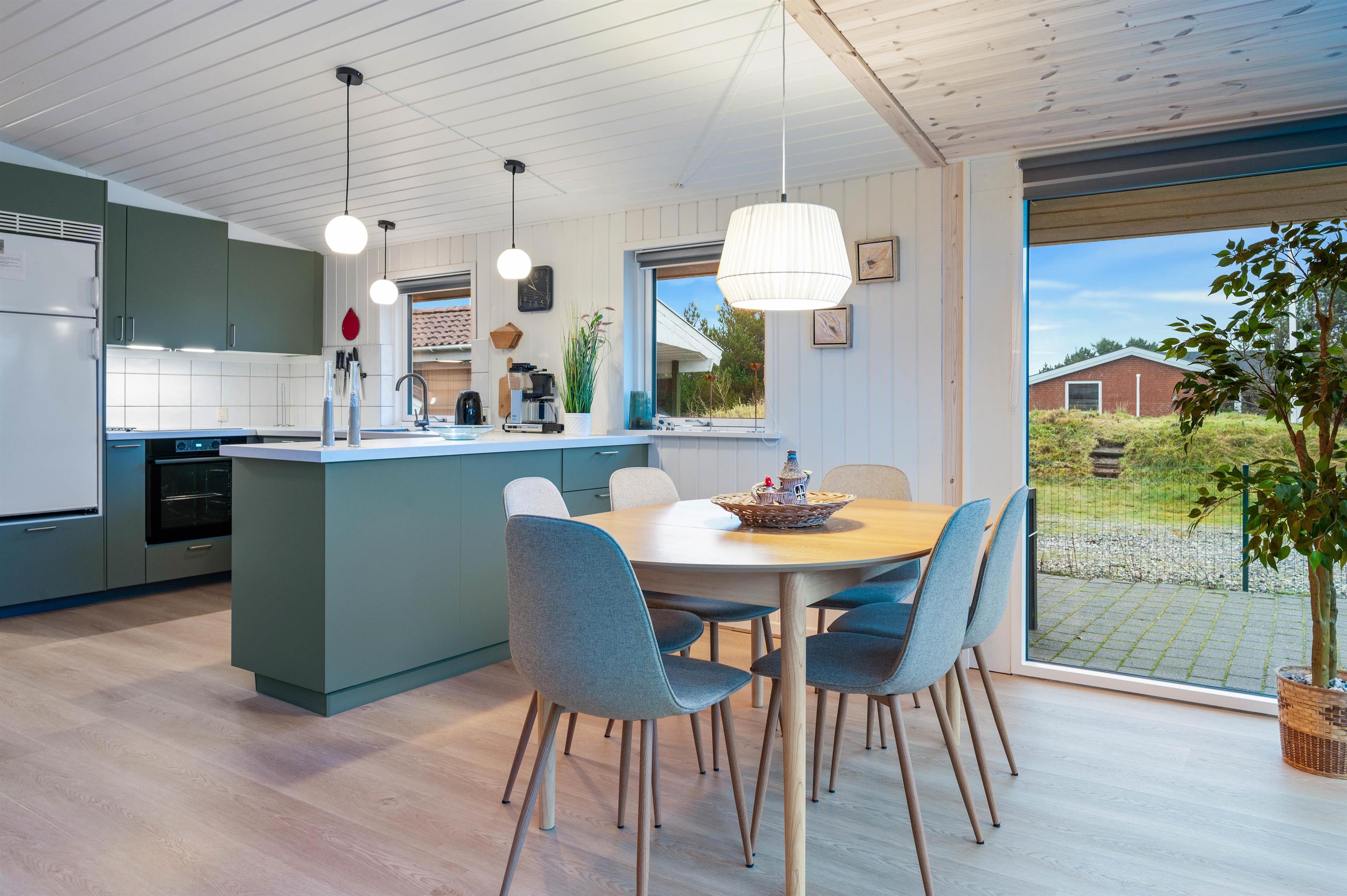 Køkken, spiseplads og stue ligger i forlængelse af hinanden, hvilket betyder at I kan være sammen uanset om det gælder madlavning, hygge i sofaen med en god film, eller planlægning af ugens aktiviteter. I vintermånederne kan I tænde op i brændeovnen og nyde lyden af knitrende træ, der fylder rummet med varme. Efter en lang dag ude i den friske luft ved det skønne Vesterhav, er det oplagt at sætte sig i saunaen og få varmen tilbage i kroppen.