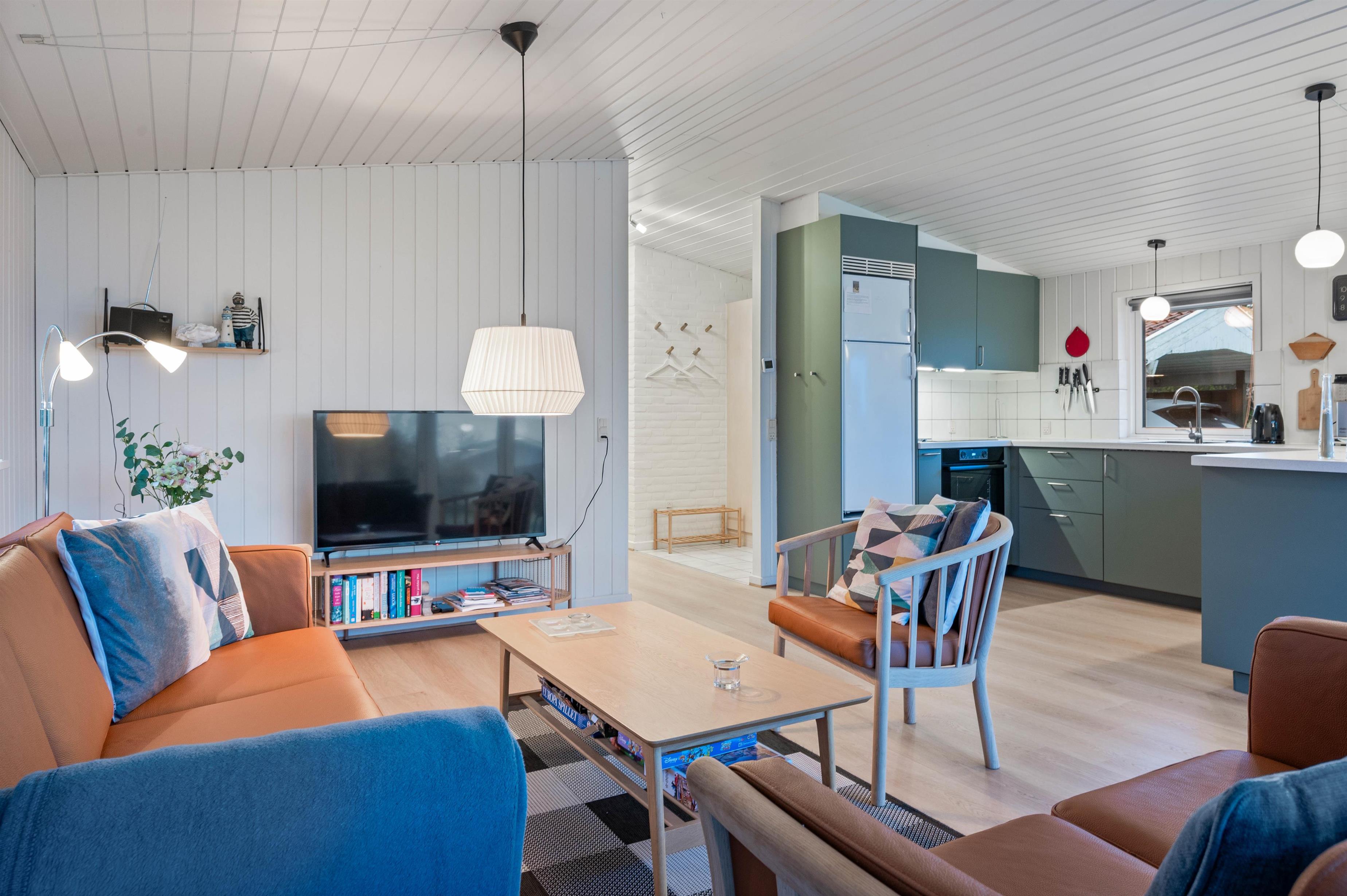 Alt i feriehuset fremstår pænt og velholdt, da det løbende er blevet opdateret. Senest i 2023, hvor bl.a. stuen og køkkenet har fået en udbedring og der er kommet nye gulve. Opholdsrummet er desuden udvidet lidt. Indretningen er holdt enkel, lys og med et personligt præg. Det skaber en dejlig, hjemlig stemning i sommerhuset, som er perfekt til afslapning. Feriehuset råder over 7 sovepladser fordelt på 3 soverum. 2 af soverummene er udstyret med enkeltsenge, hvor det sidste værelse er indrettet med en dobbelt - og køjeseng i én.