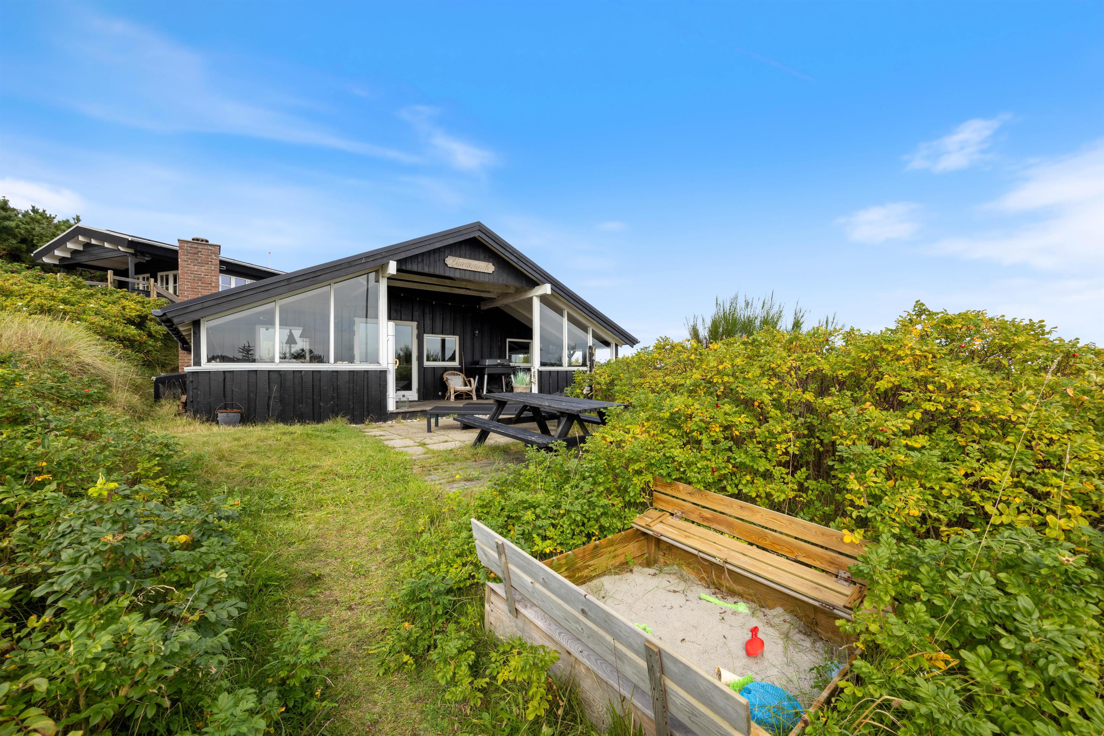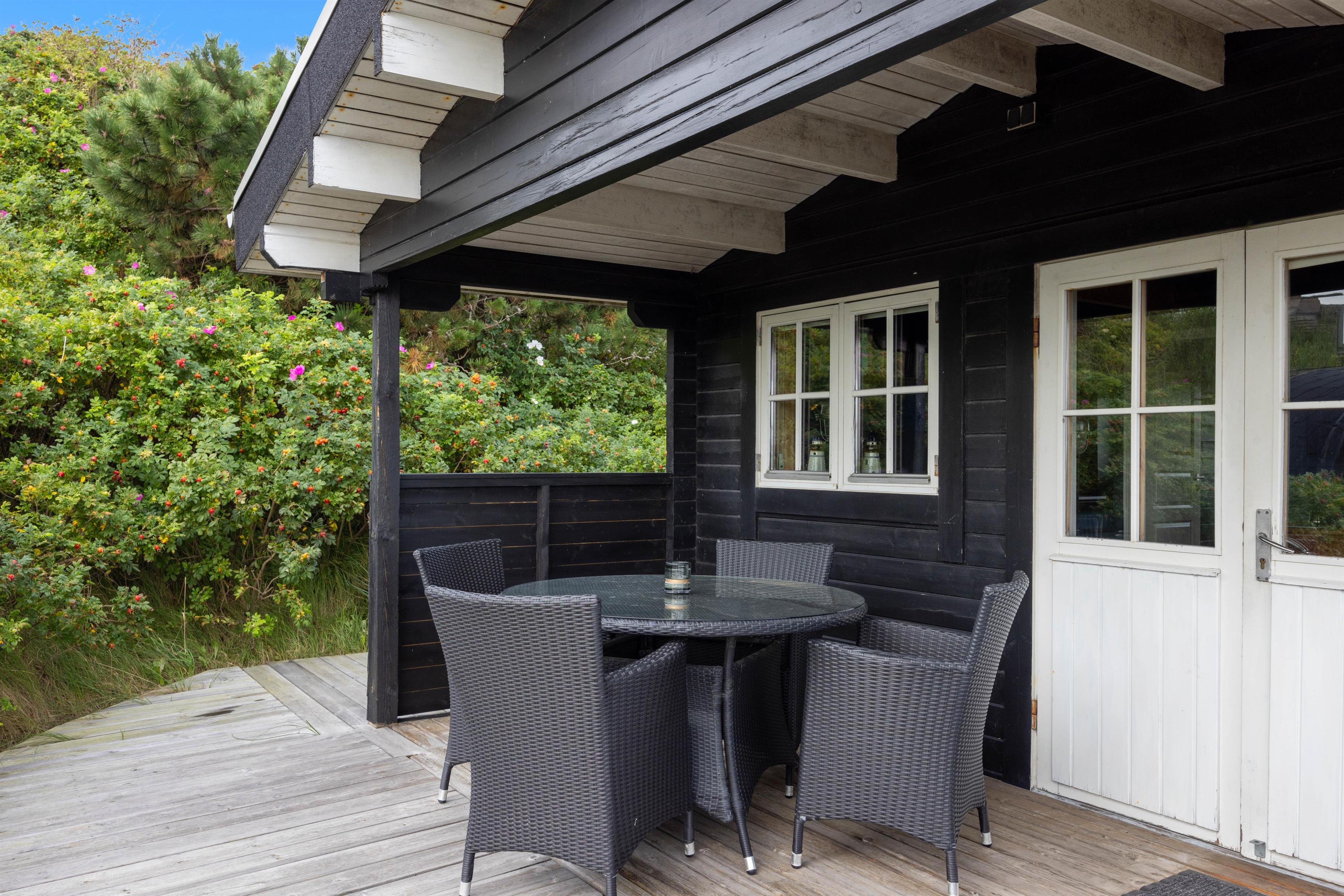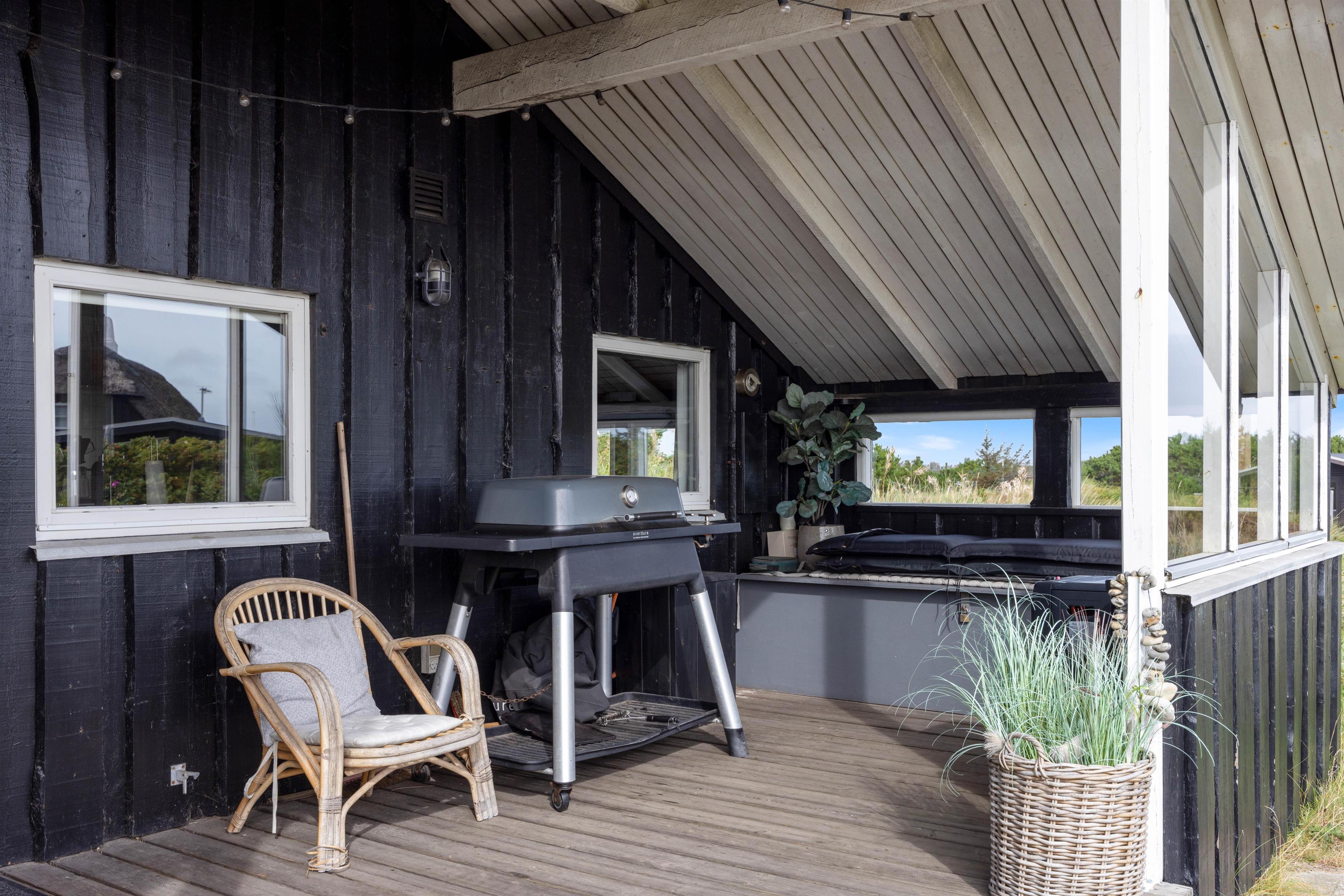 Sommerhuset har flere skønne terrasser – både en afskærmet og overdækket samt åben del. Her er masser af hyggekroge, hvor I kan sætte jer til rette med en god bog eller en lækker frokost i solen. Der er sandkasse til børnene, og så får I også en gasgrill, så I nemt og hurtigt kan tilberede en lækker grillmiddag.