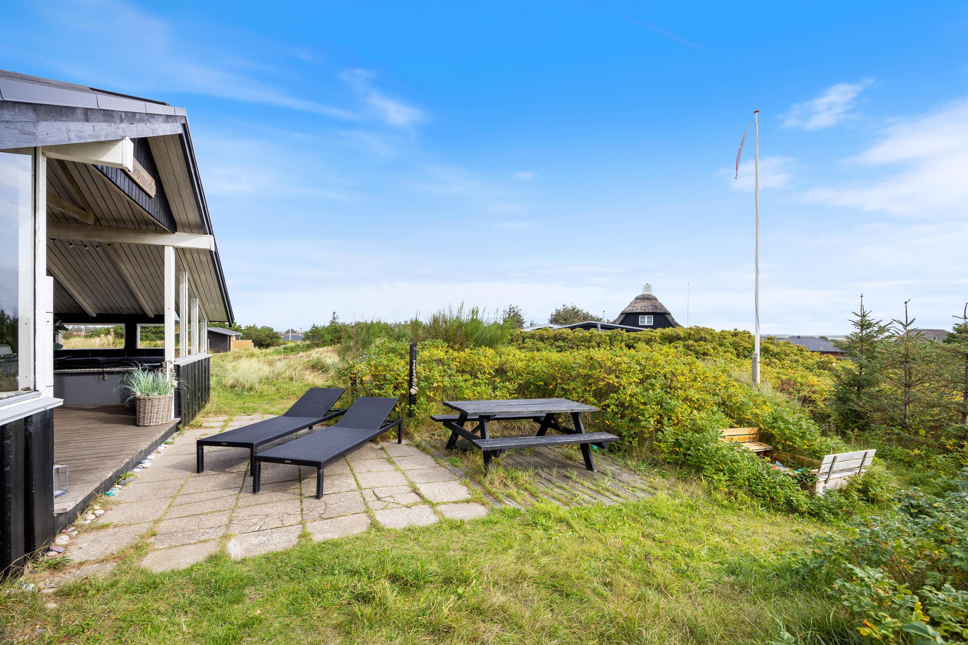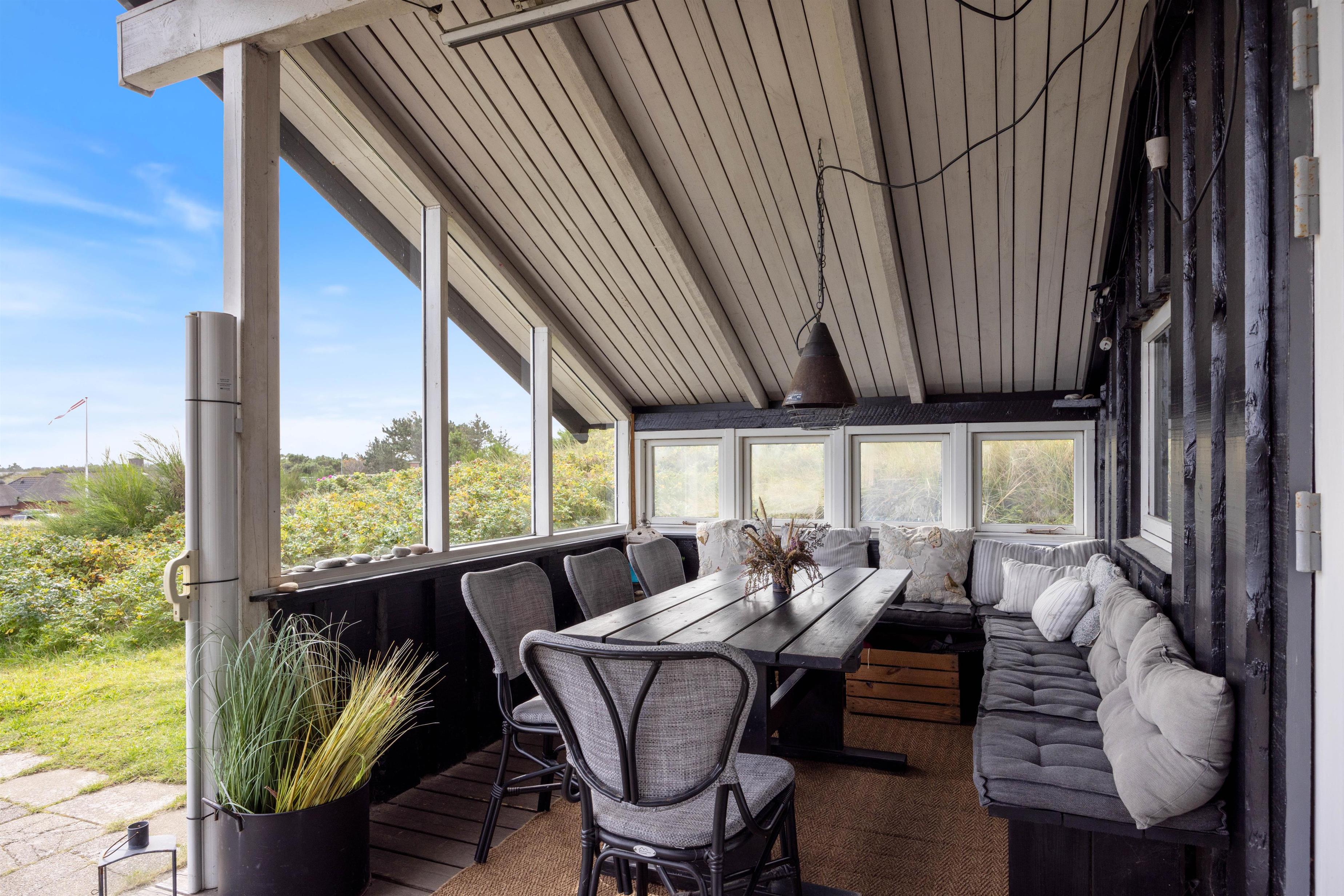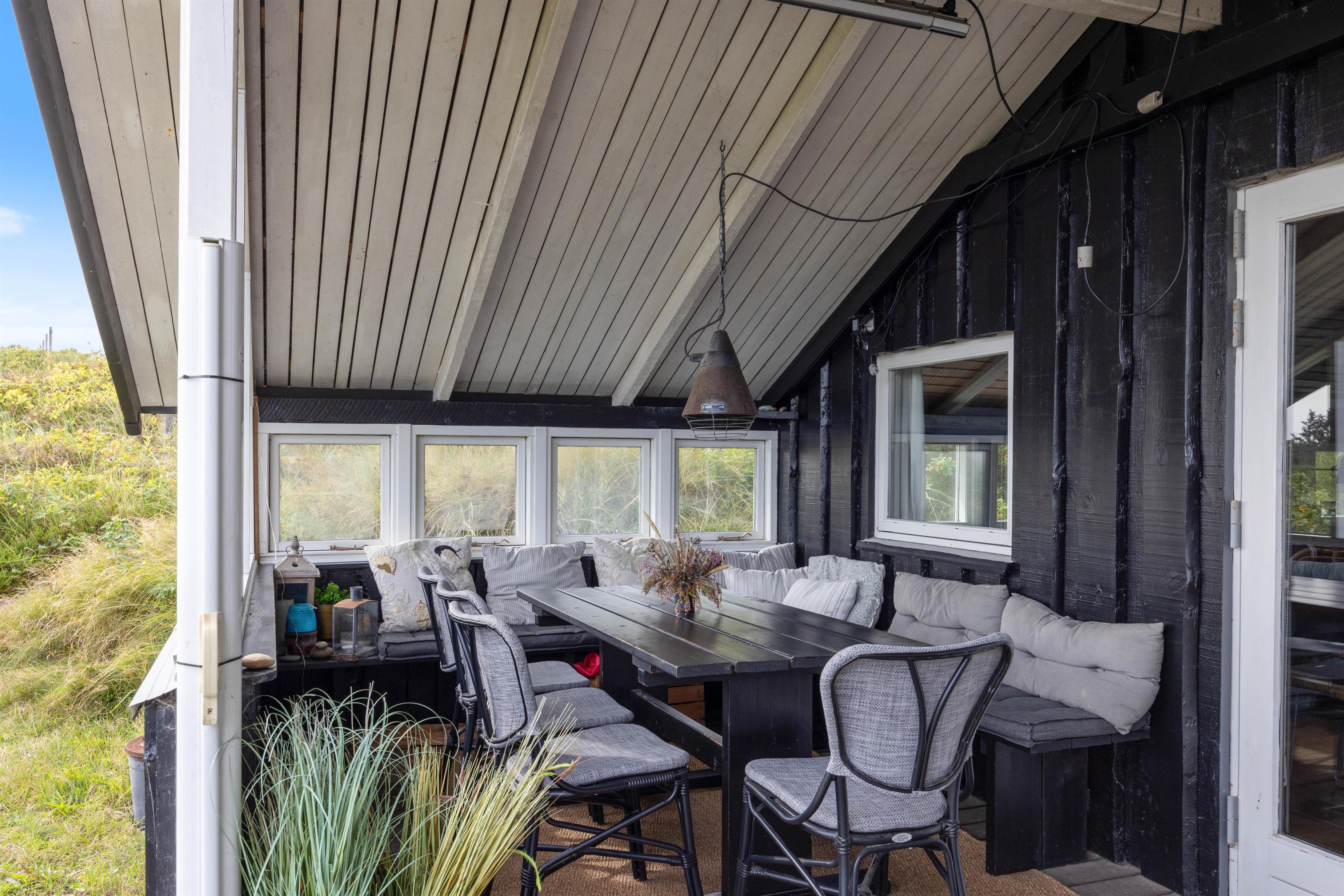 Sommerhuset har flere skønne terrasser – både en afskærmet og overdækket samt åben del. Her er masser af hyggekroge, hvor I kan sætte jer til rette med en god bog eller en lækker frokost i solen. Der er sandkasse til børnene, og så får I også en gasgrill, så I nemt og hurtigt kan tilberede en lækker grillmiddag.