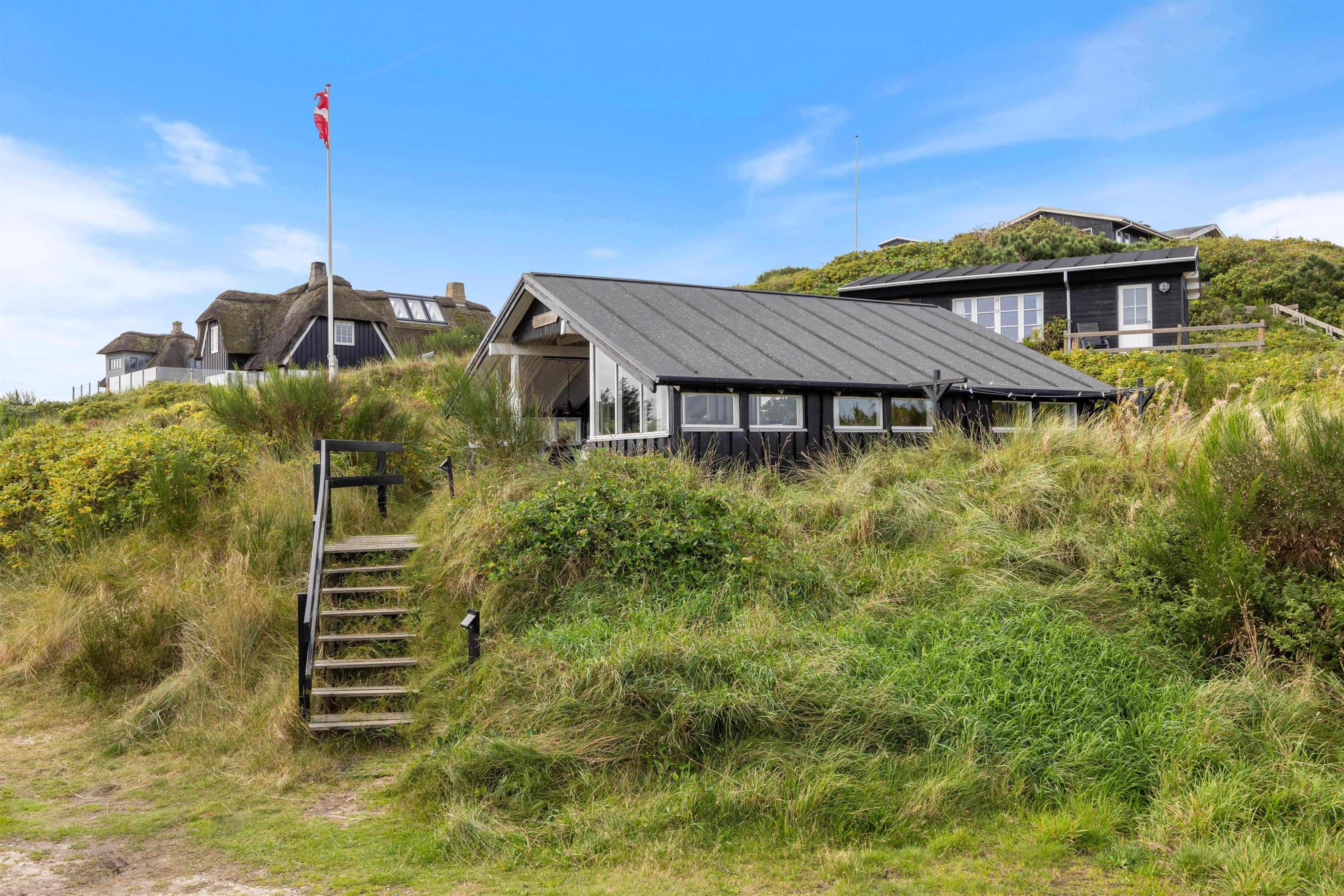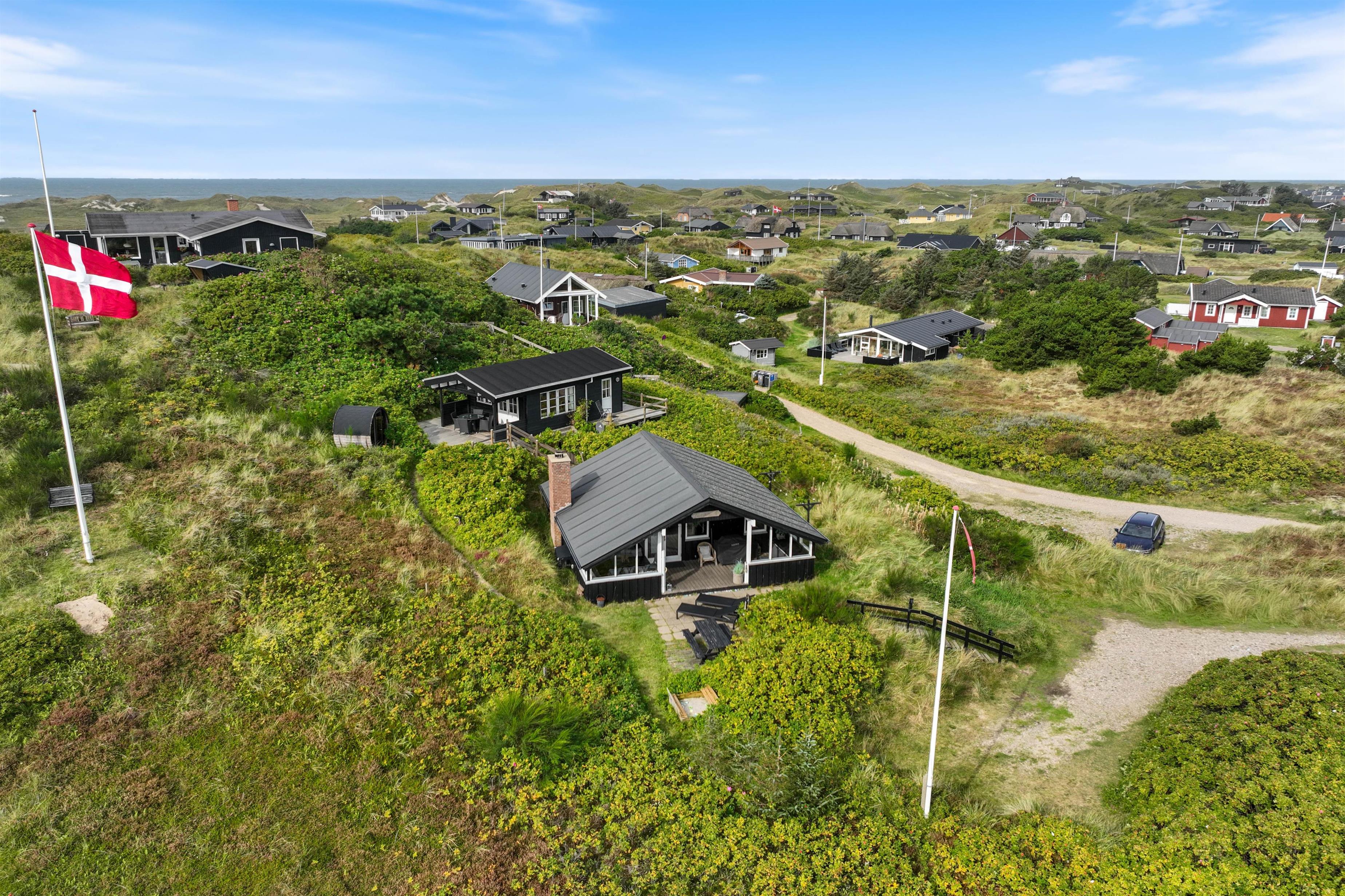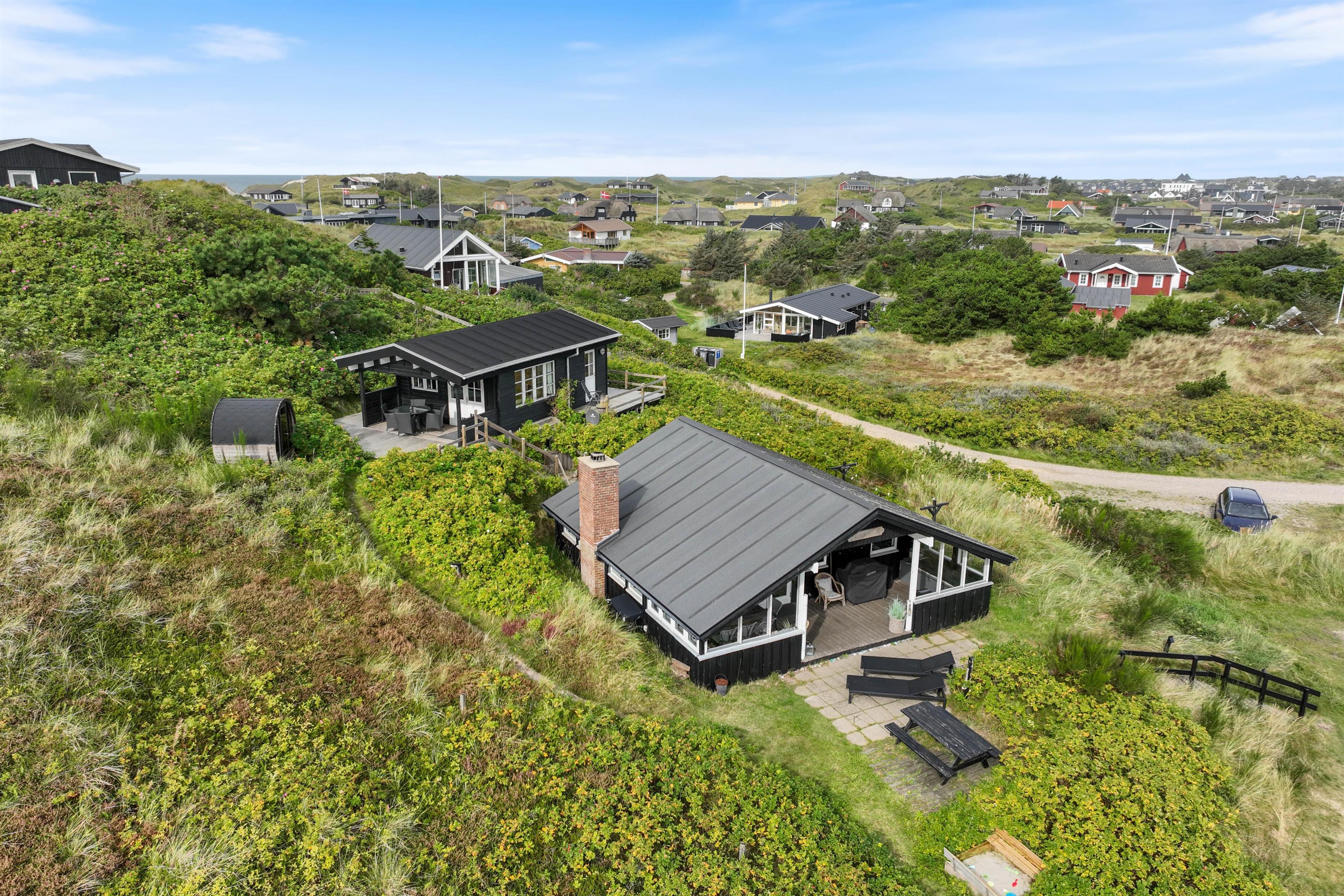 Midt i det vestjyske klitlandskab, kun 300 meter fra havet og mindre end 10 minutters gang fra Søndervigs centrum, ligger dette charmerende og renoverede sommerhus. Dette 78 km2 sommerhus på Nordsøvej 198 har plads til 6 personer og 2 hunde. Sommerhuset er indrettet i flot, skandinavisk stil med brændeovn og Chromecast. Her er også et anneks med eget badeværelse og egen terrasse, en lækker saunatønde og flere gode terrasser – med udsigt hele vejen til Ringkøbing Fjord. Hunden er også velkommen her!