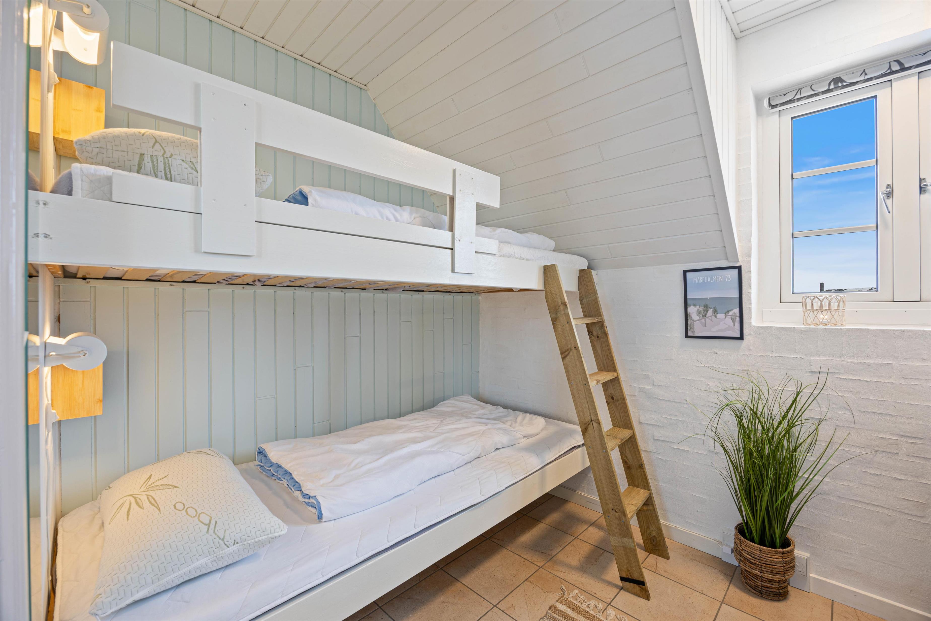 Dette velindrettede sommerhus i Søndervig byder på en skøn brændeovn, der sikrer hyggelige aftener i samvær med dem, I elsker. Sommerhuset har med sine 3 gode soveværelser plads til 6 personer. To af værelserne er med dobbeltsenge og det tredje med køjesenge til børnene. Sommerhuset har et dejligt, lyst badeværelse med gulvvarme, bruseniche og indgang til sauna. I den hyggeligt møblerede stue er der faste tæpper på gulvene og en dejlig brændeovn til kølige dage.