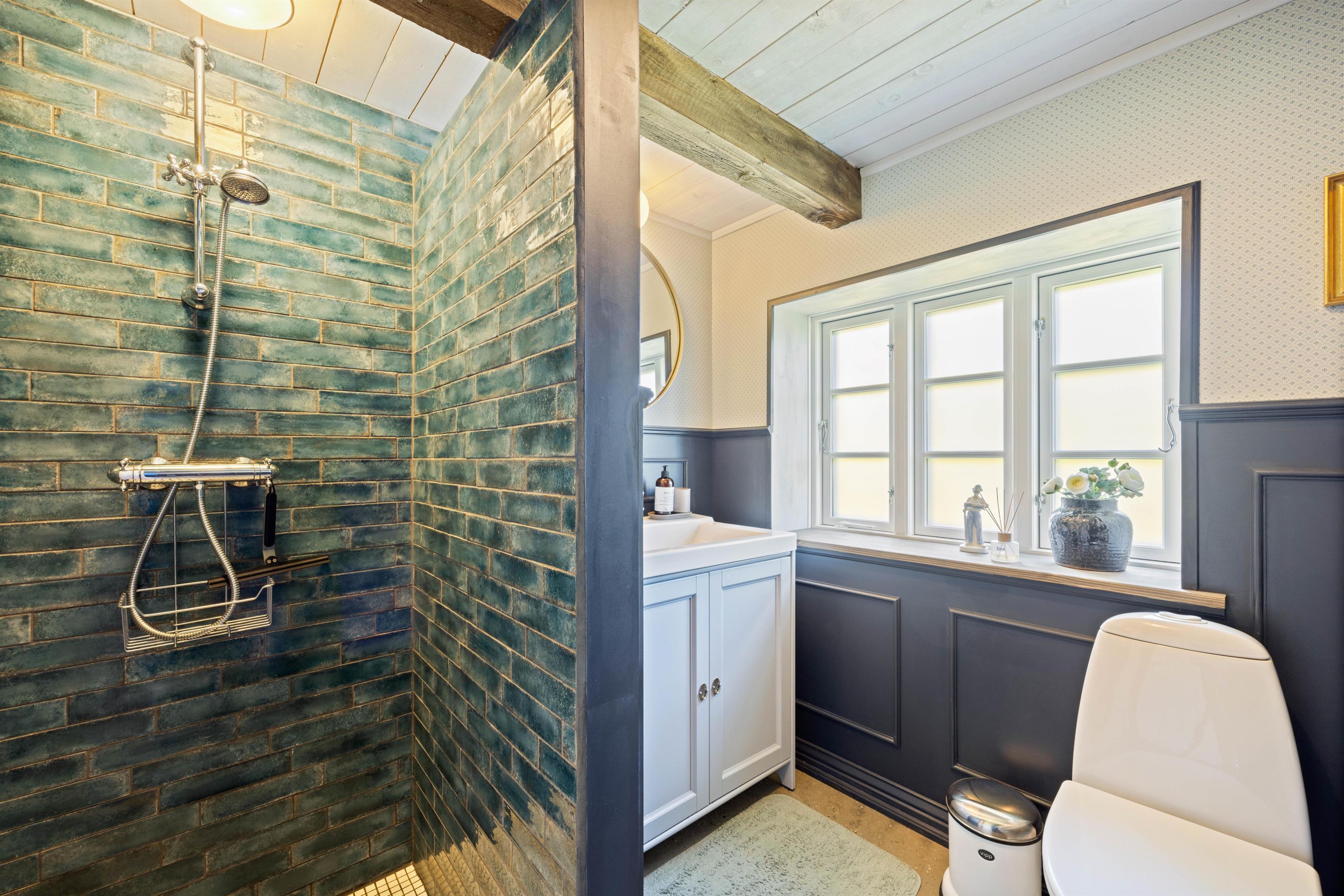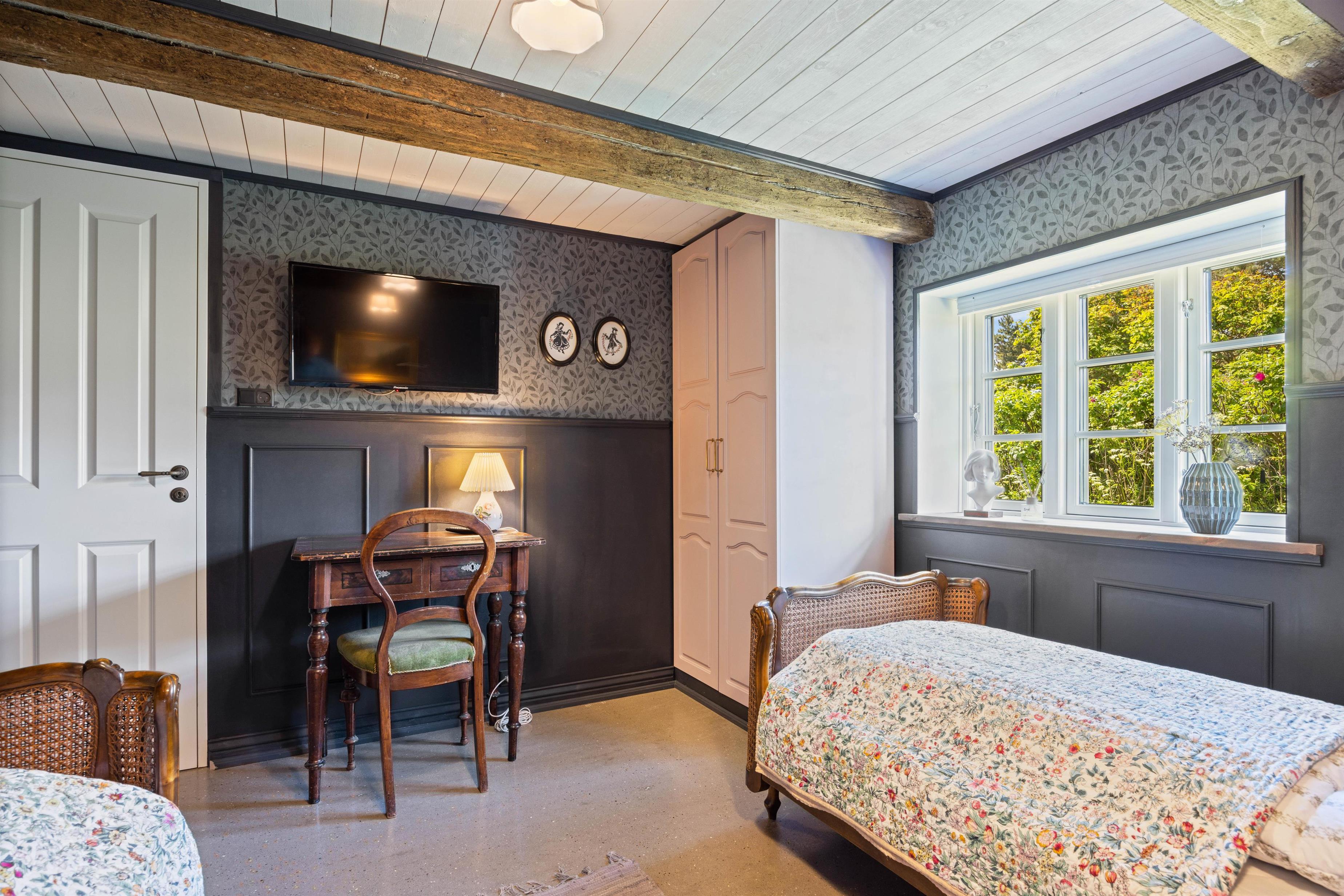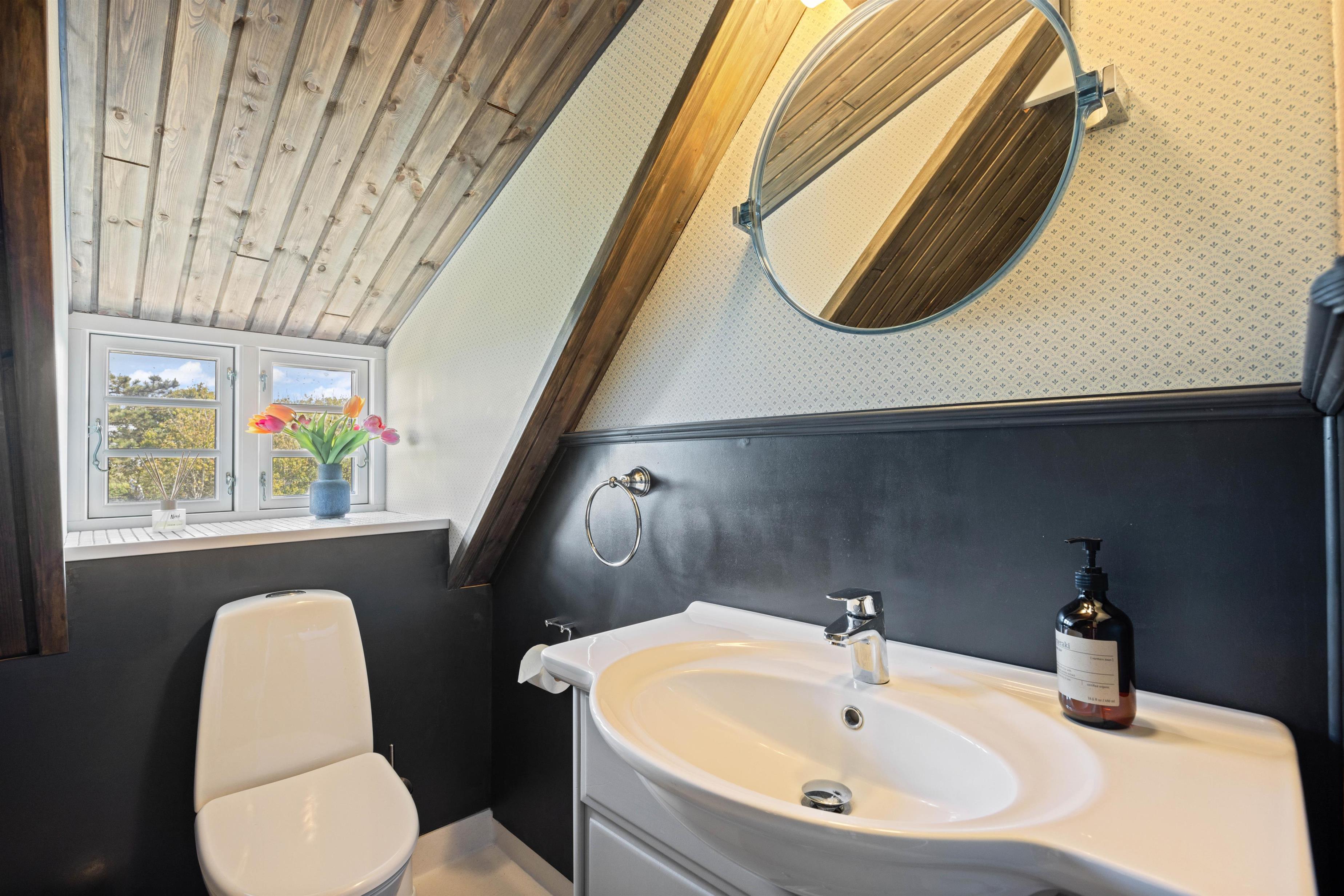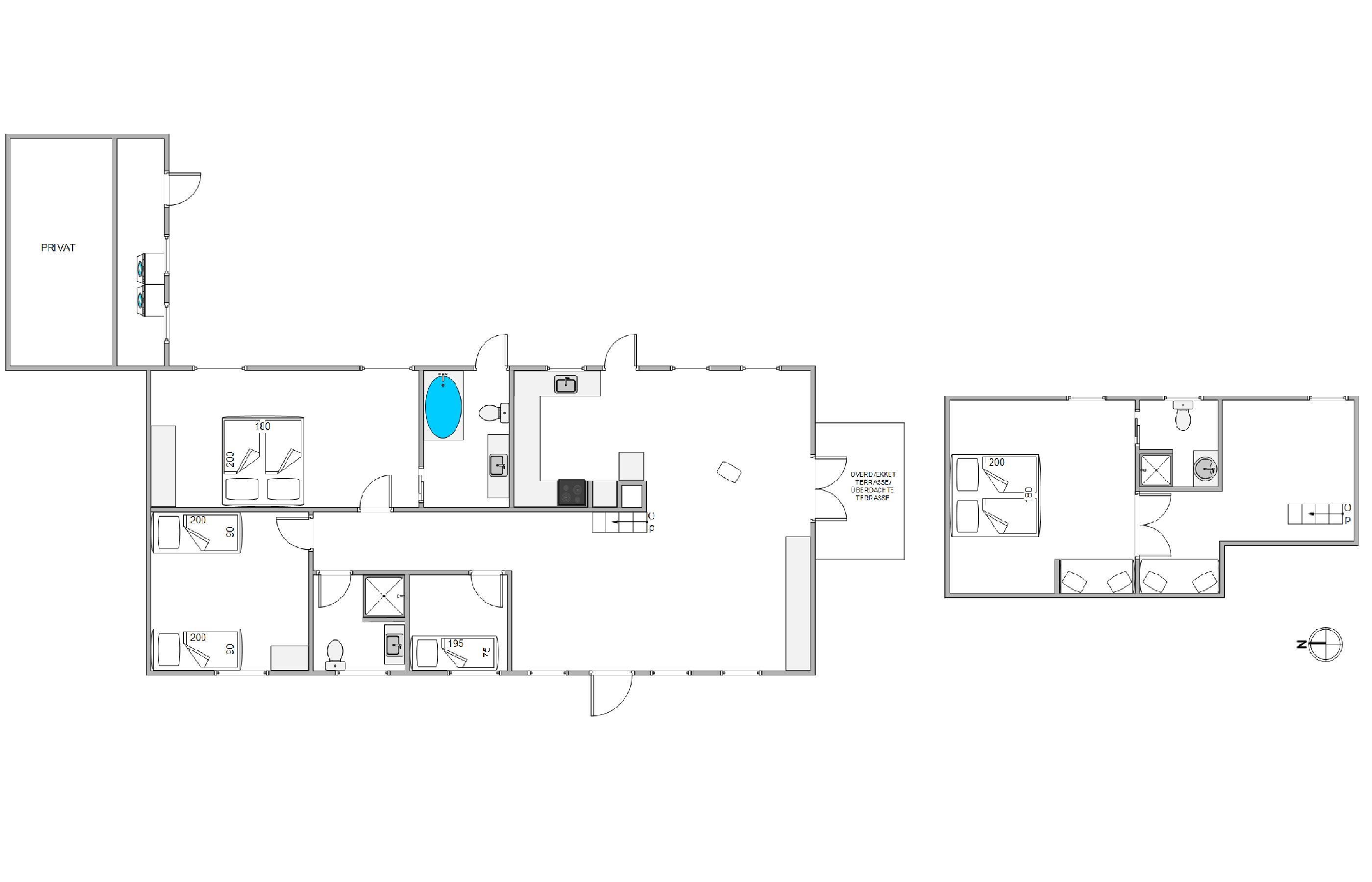Soveværelserne og badeværelserne er fordelt på de to etager i feriehuset, så I finder 2 soveværelser og 2 badeværelser i stueetagen, mens det tredje soveværelse og badeværelse ligger på første sal. Den energibesparende luft/luft-varmepumpe sikrer en konstant og behagelig temperatur i feriehuset. Desuden er alle soveværelser, badeværelser og stuen udstyret med gulvvarme.