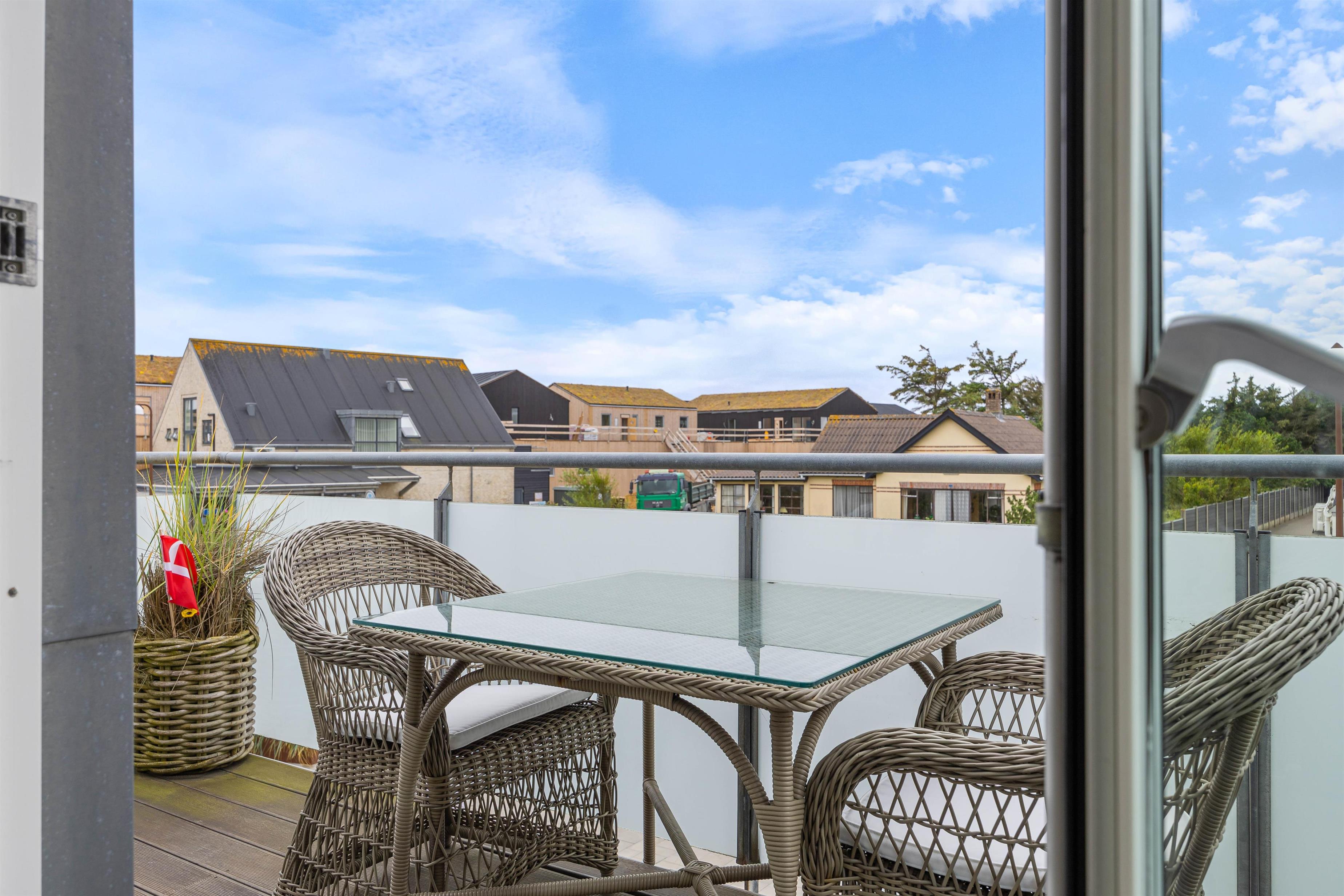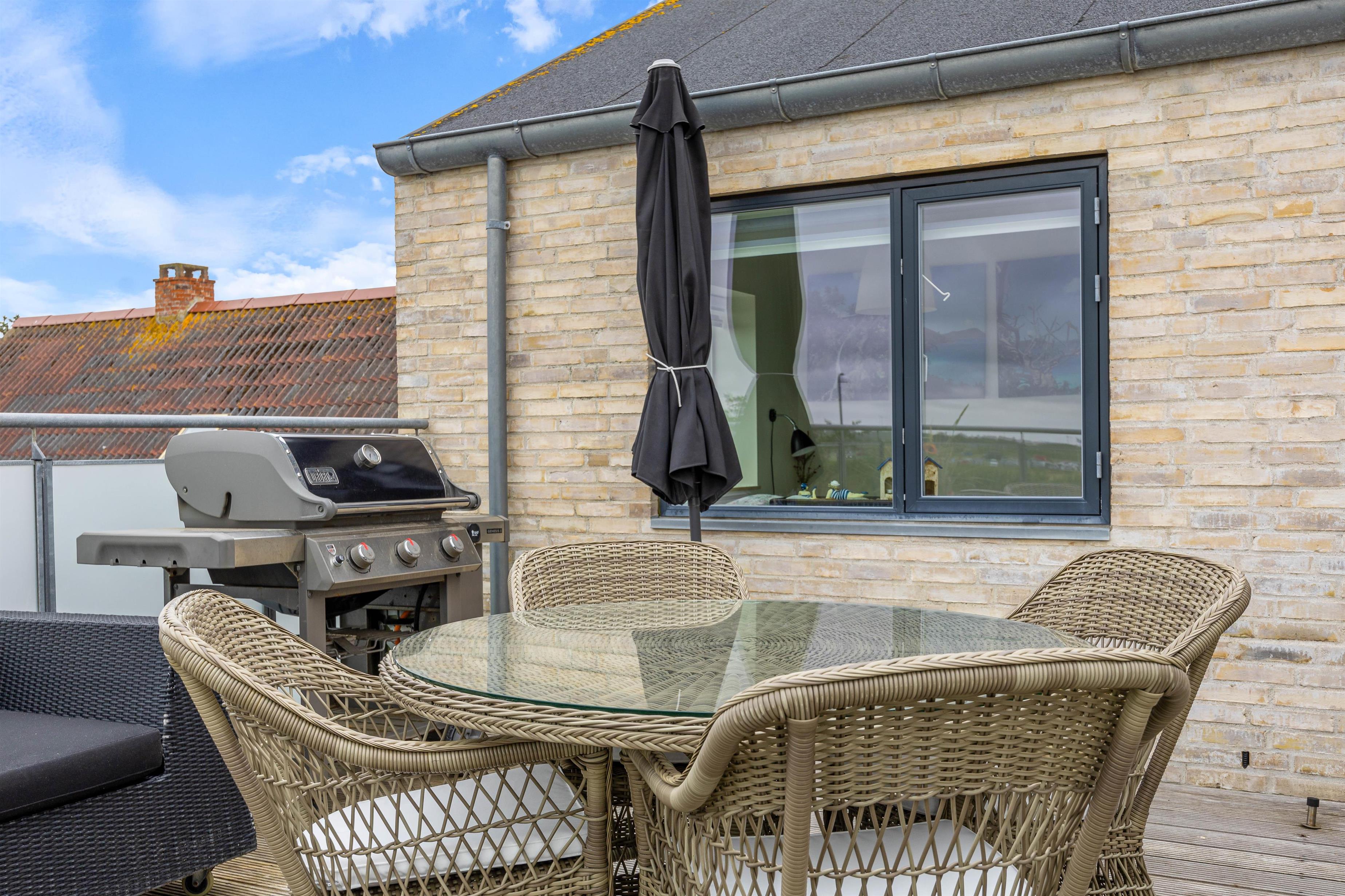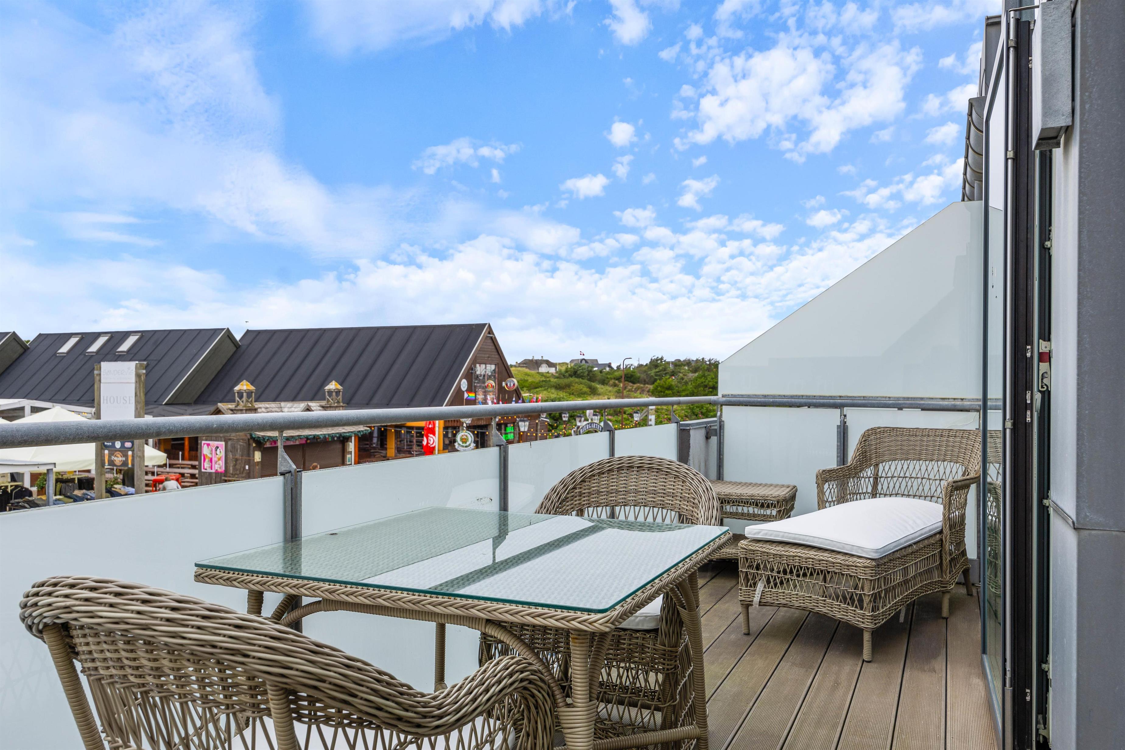 Fra ferielejlighedens stue er der udgang til den åbne og afskærmede terrasse, hvorfra man kan se ud over Søndervigs pulserende ferieliv. Terrassen er udstyret med matchende havemøbler, så I kan sætte jer godt til rette og nyde solskinnet. Om aftenen kan I runde en vellykket feriedag af med en hyggelig grillaften fra gasgrillen.