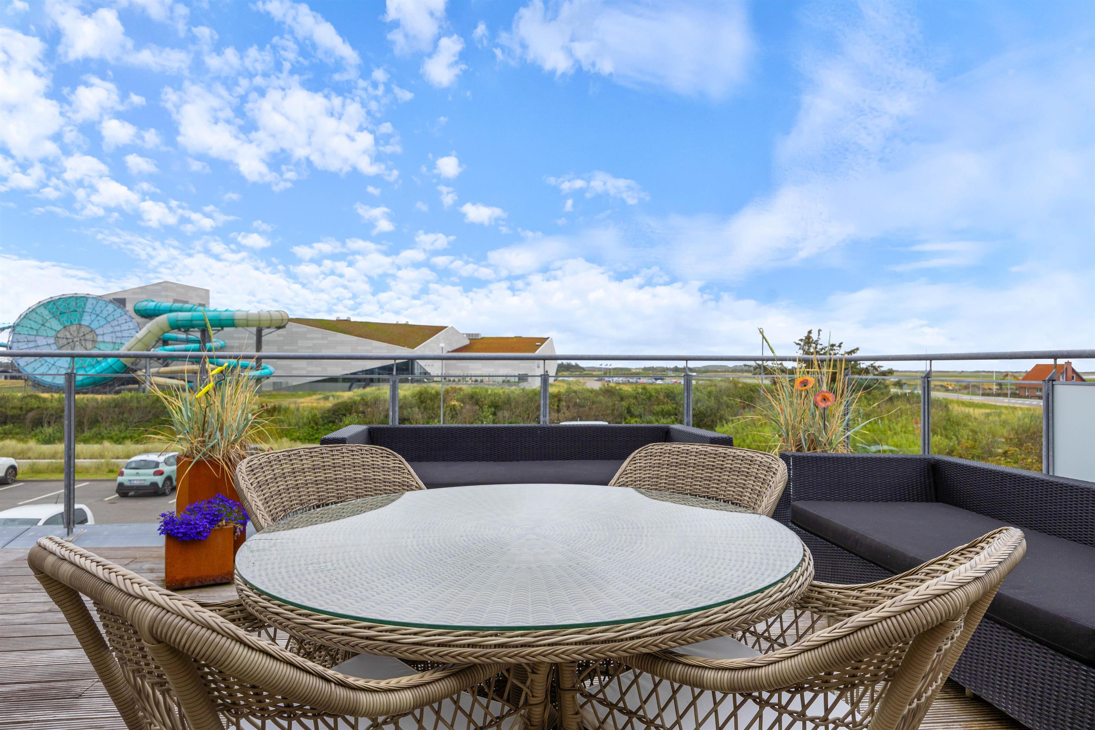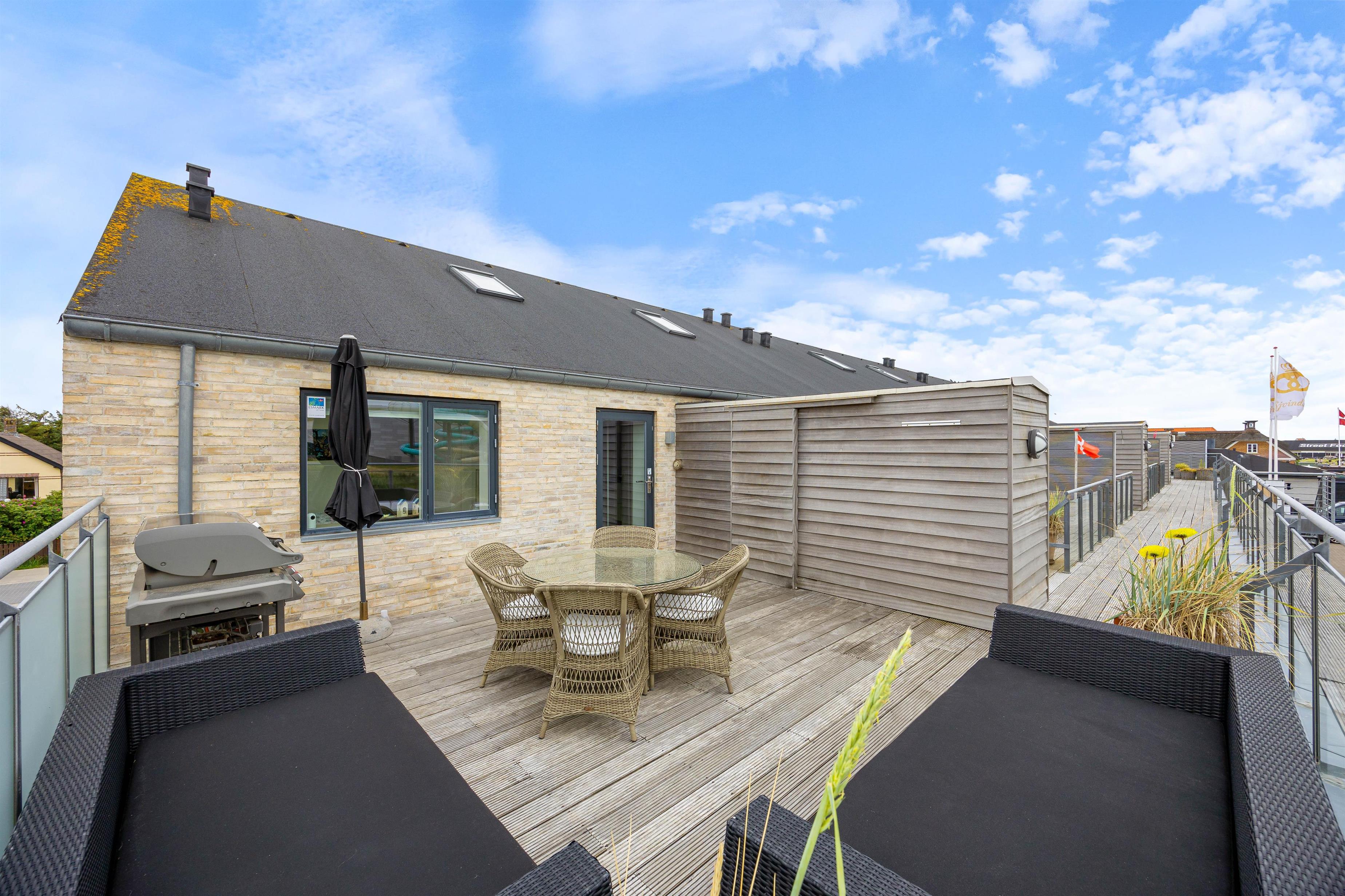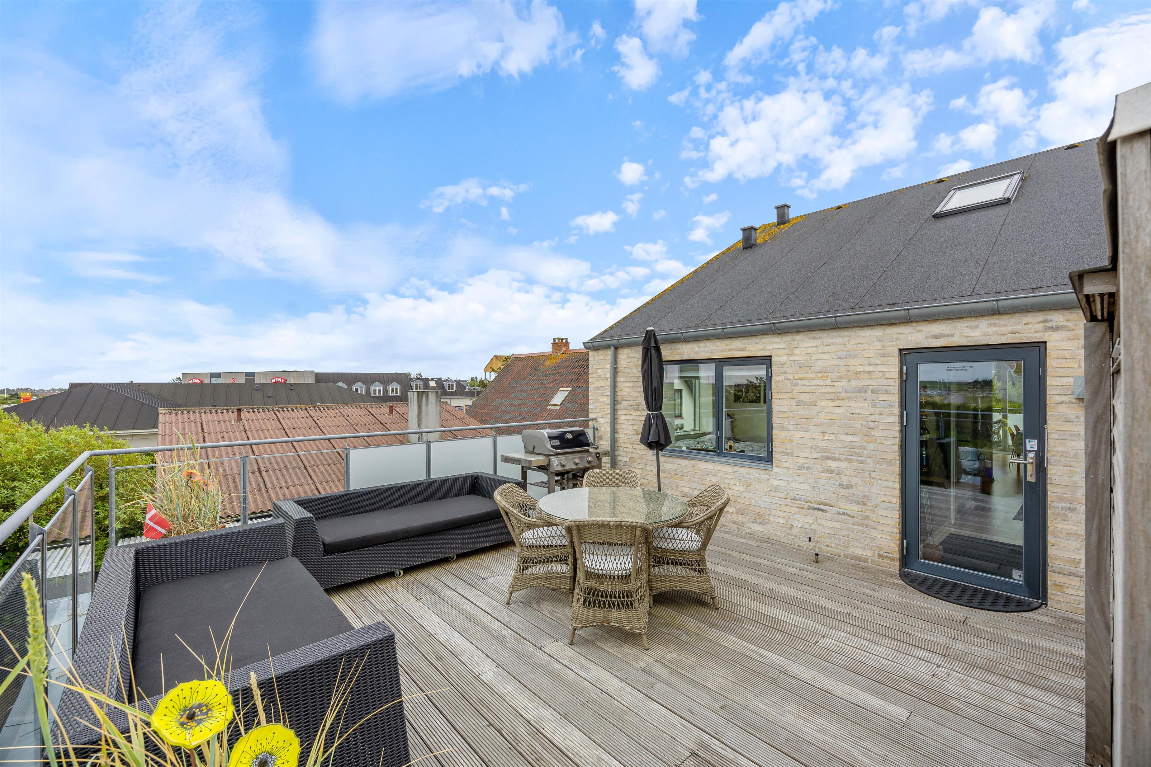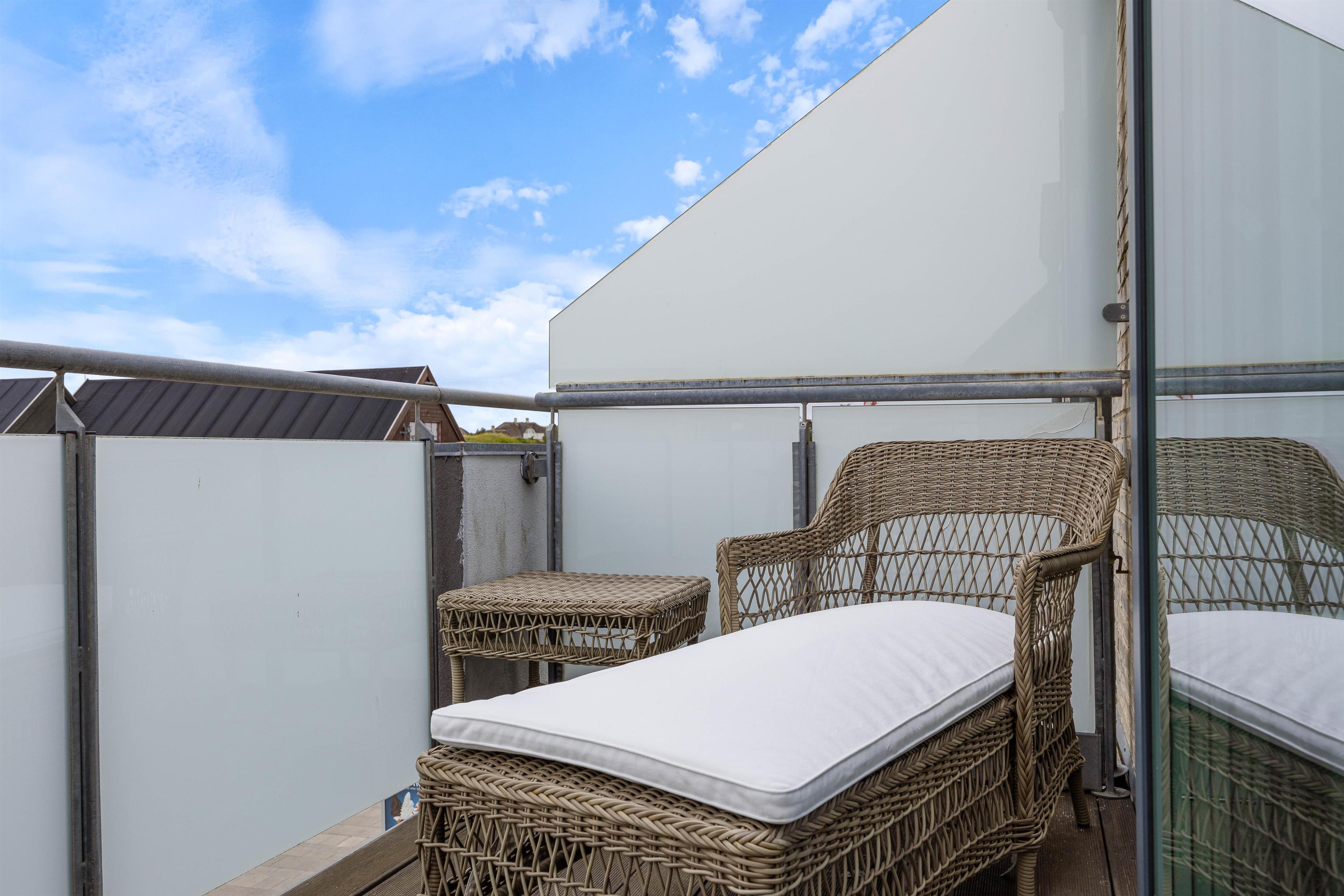 Fra ferielejlighedens stue er der udgang til den åbne og afskærmede terrasse, hvorfra man kan se ud over Søndervigs pulserende ferieliv. Terrassen er udstyret med matchende havemøbler, så I kan sætte jer godt til rette og nyde solskinnet. Om aftenen kan I runde en vellykket feriedag af med en hyggelig grillaften fra gasgrillen.
