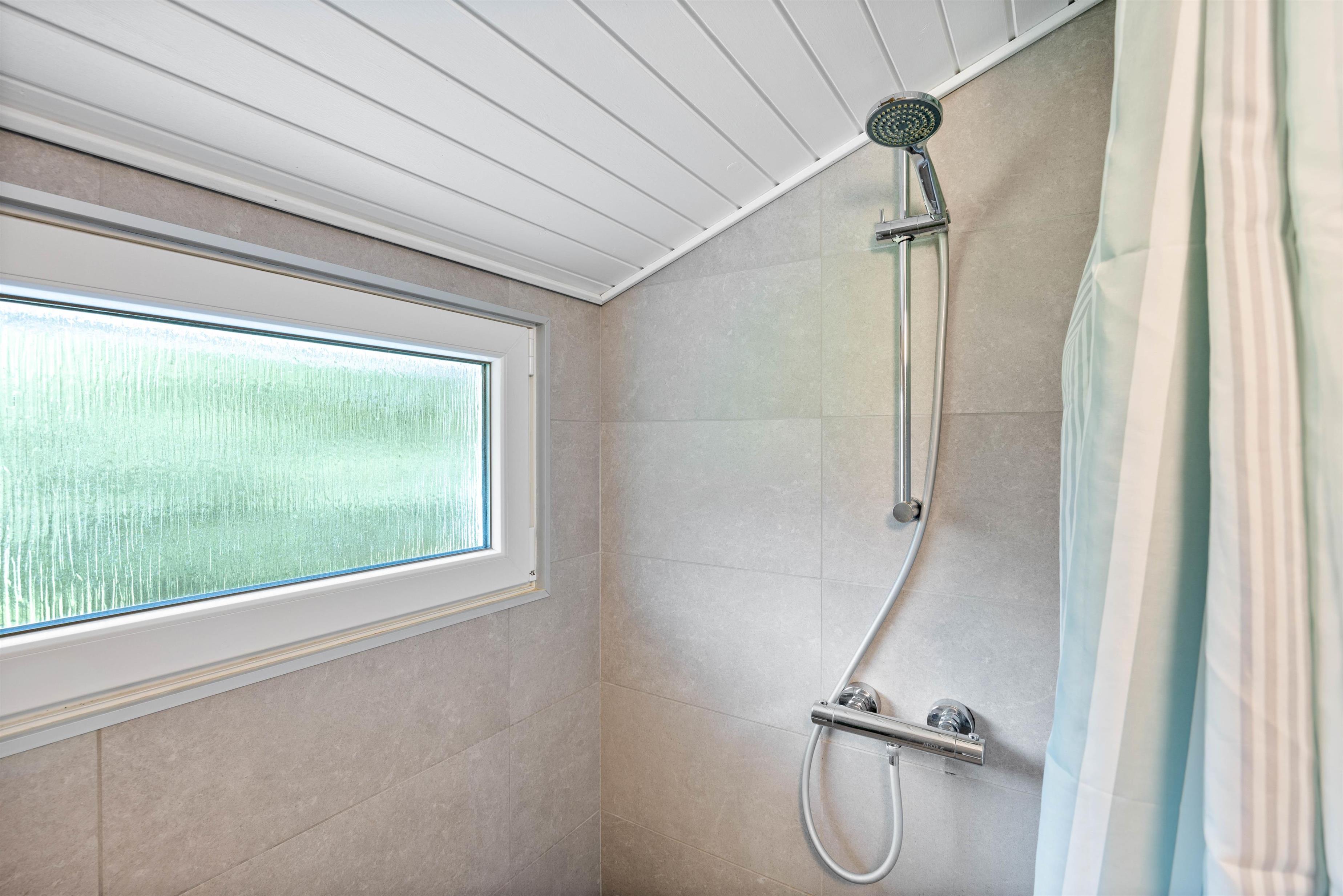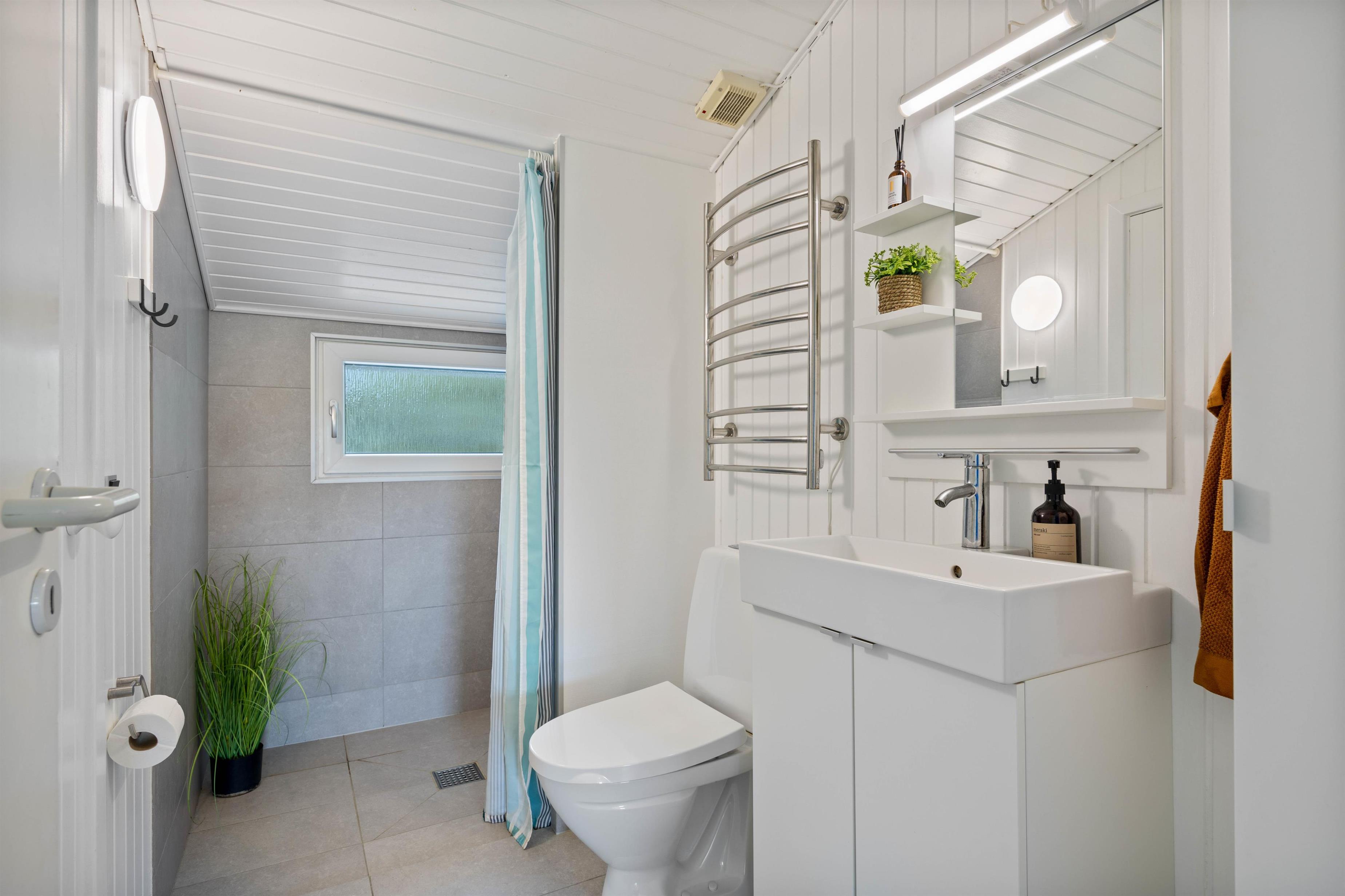 Husets moderne badeværelse er indrettet i samme stil som resten af huset. Her er der gulvvarme, vaskemaskine, tørretumbler og en lækker sauna.