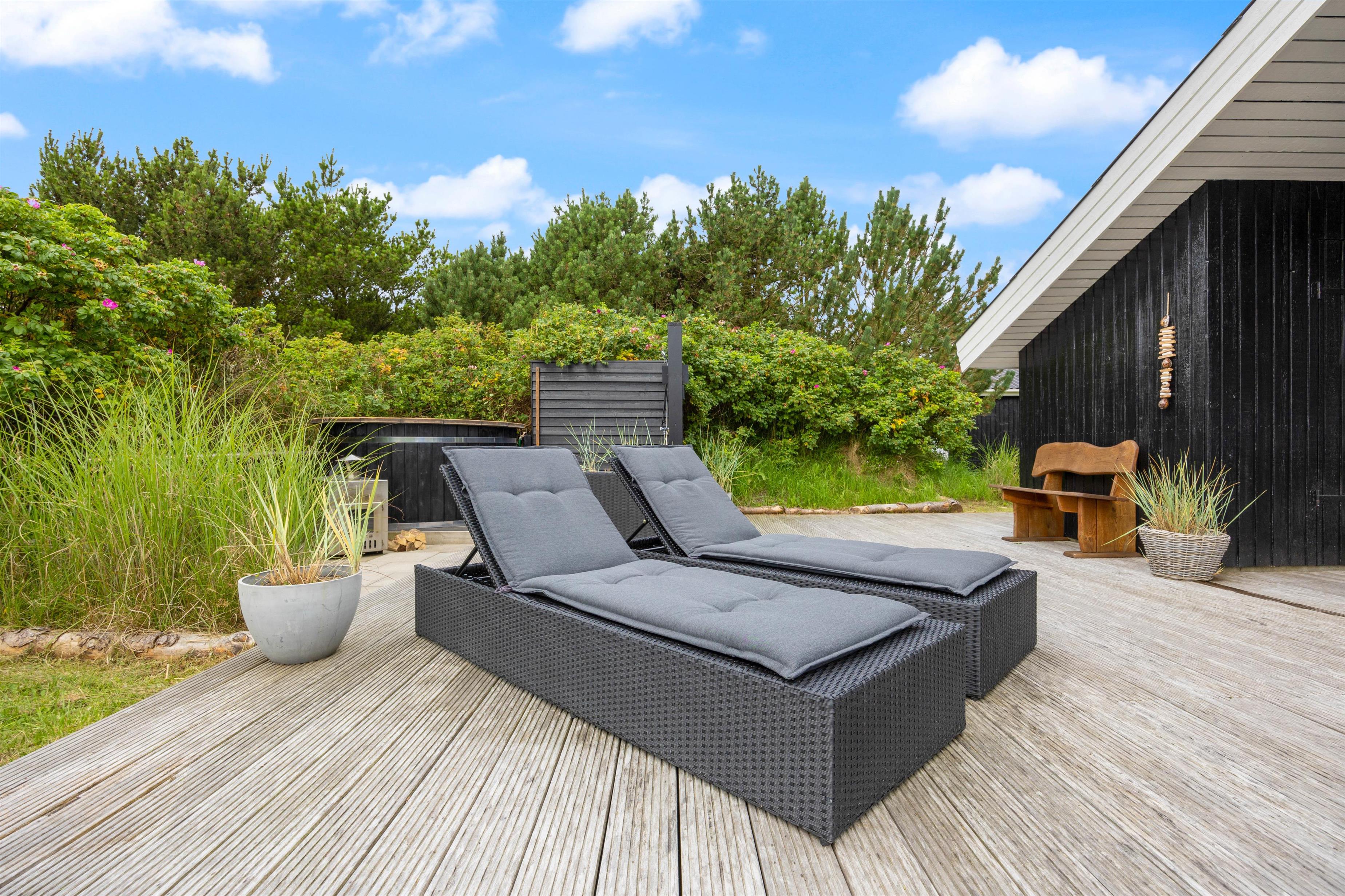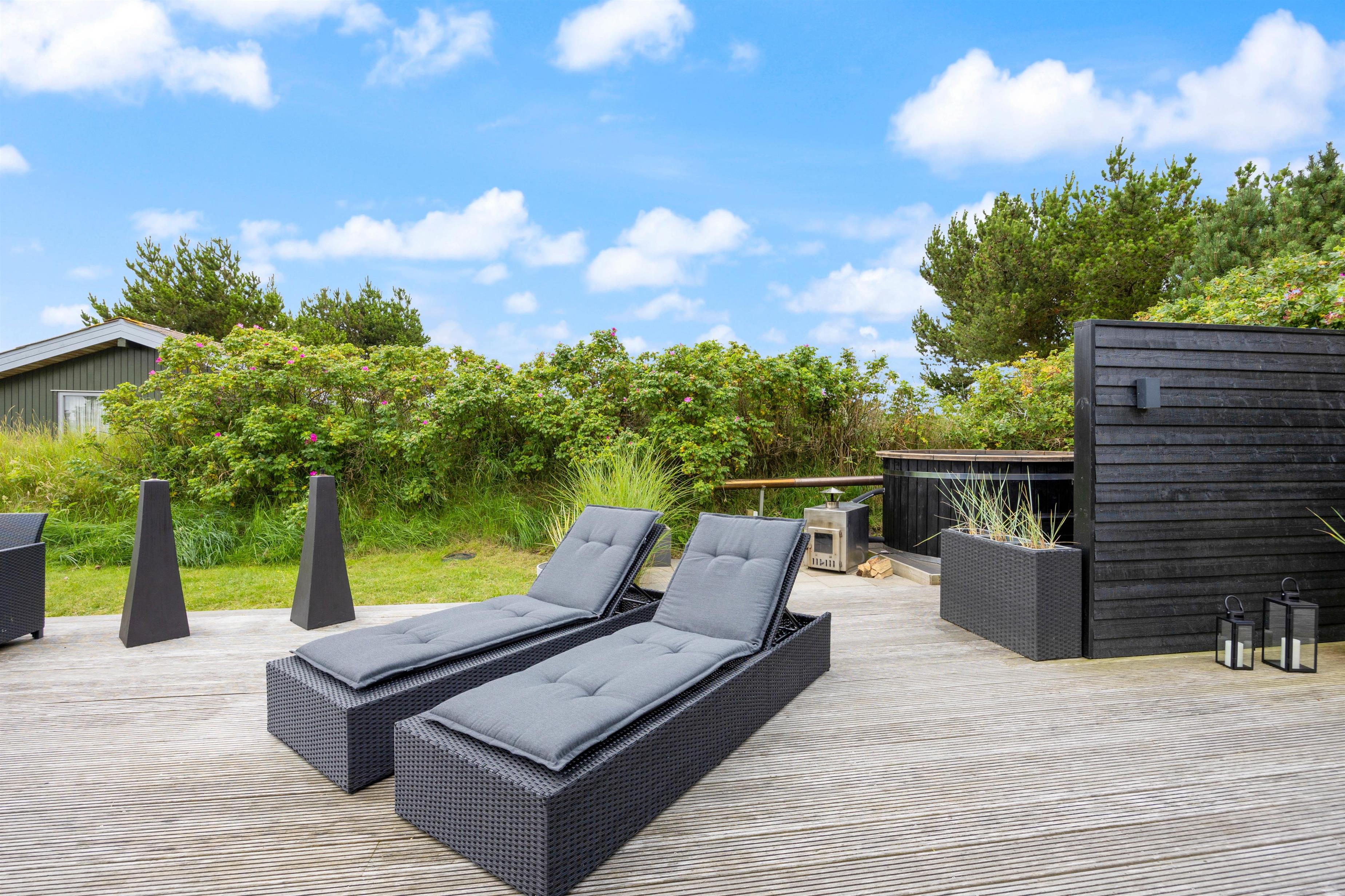 Stort, delvist overdækket terrasse med bålplads, udebruser og vildmarksbad