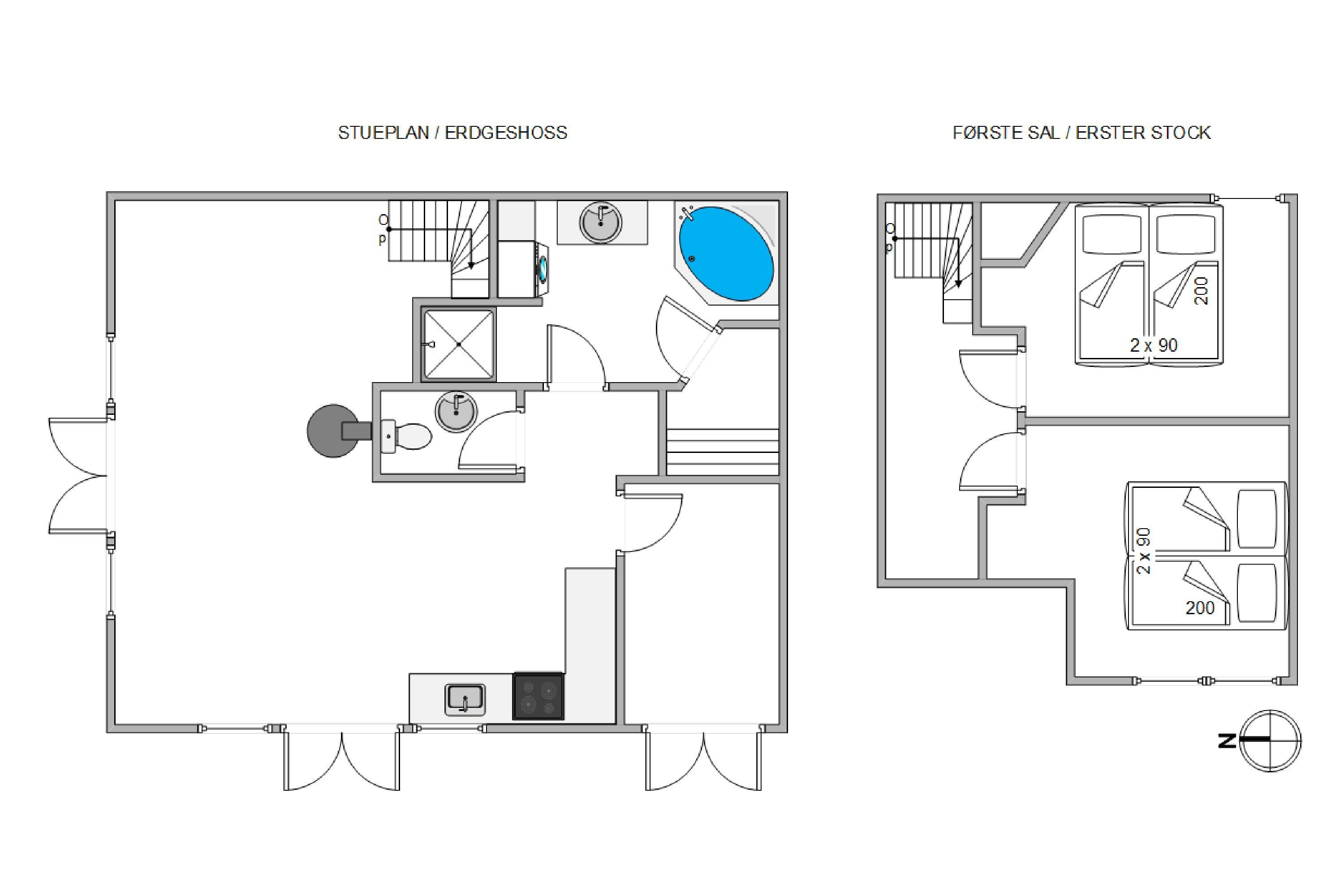 På førstesalen finder i to gode soverum, der begge er indrettet med omtanke og hygge for øje. Begge soverum er udstyret med komfortable dobbeltsenge, der sikrer en god nats søvn, så I kan vågne friske og veludhvilede. På badeværelset finder I både sauna og spabad, der giver jer mulighed for den ultimative afslapning og mini wellnessoplevelse på ferien.