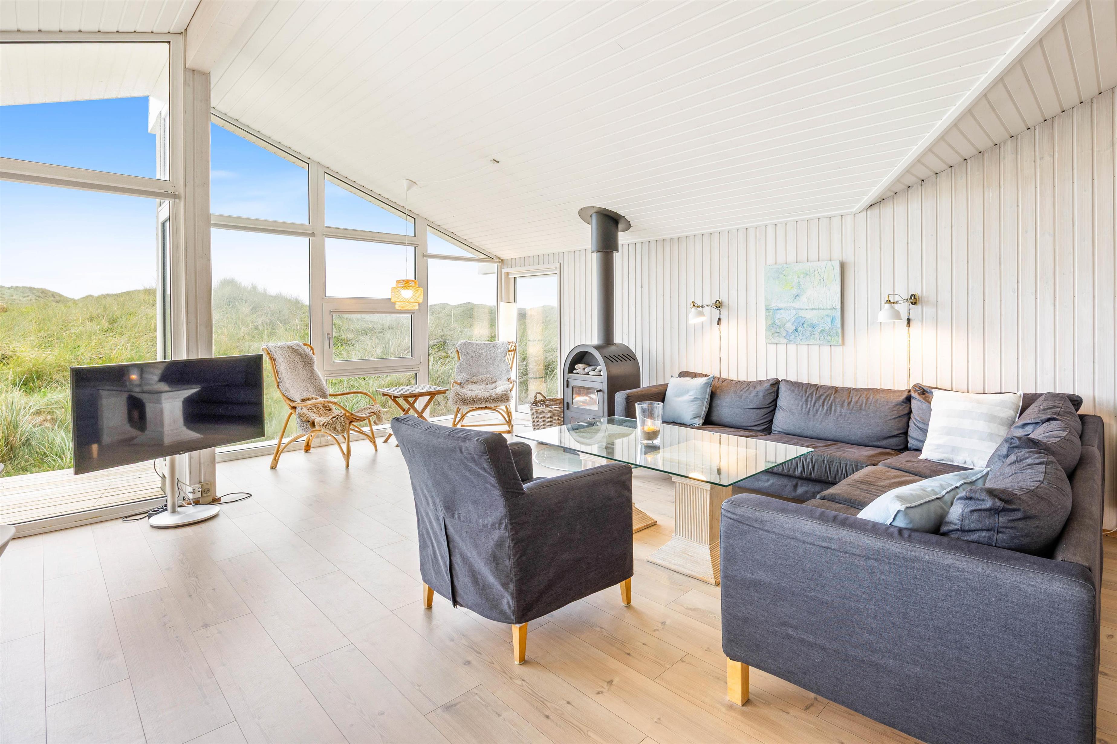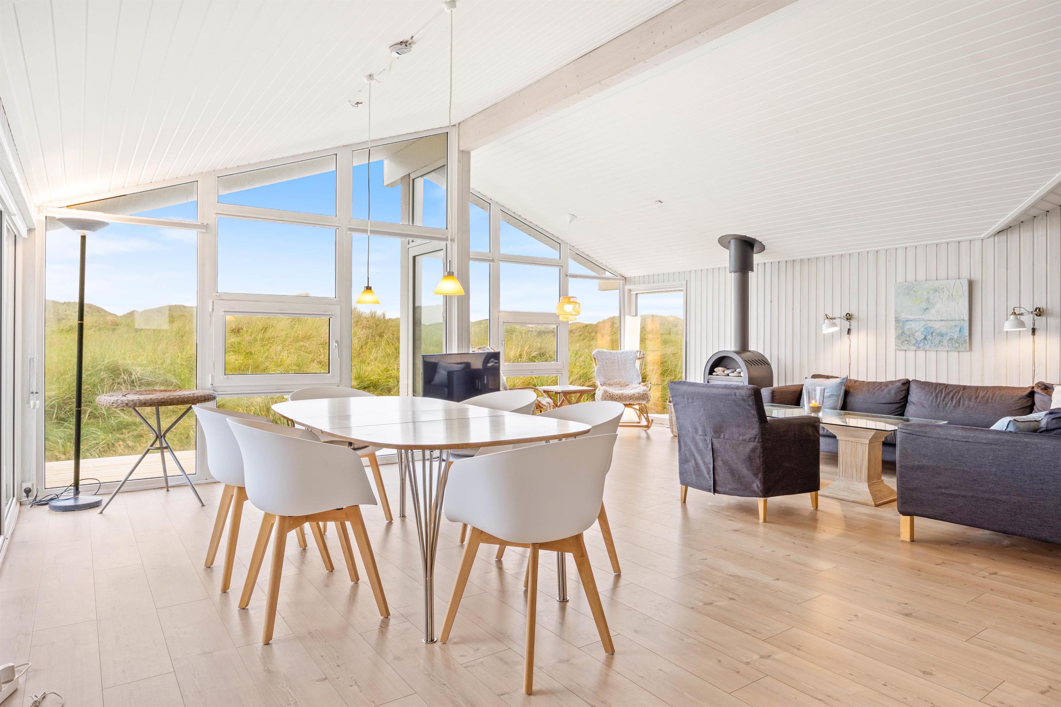 Husets dejlige og smagfuldt møblerede stue er i åben forbindelse med spisestue og køkken. Denne rumfordeling giver jer mulighed for at nyde masser af kvalitetstid sammen hele tiden, om end I hygger jer med madlavningen, et spil kort eller en quiz. Her i stuen er der fladskærms-TV, parabol, DVD-afspiller og en hyggelig brændeovn. Det store vindusparti mod terrassen giver et flot lysindfald og gør rummet meget lyst og venligt.