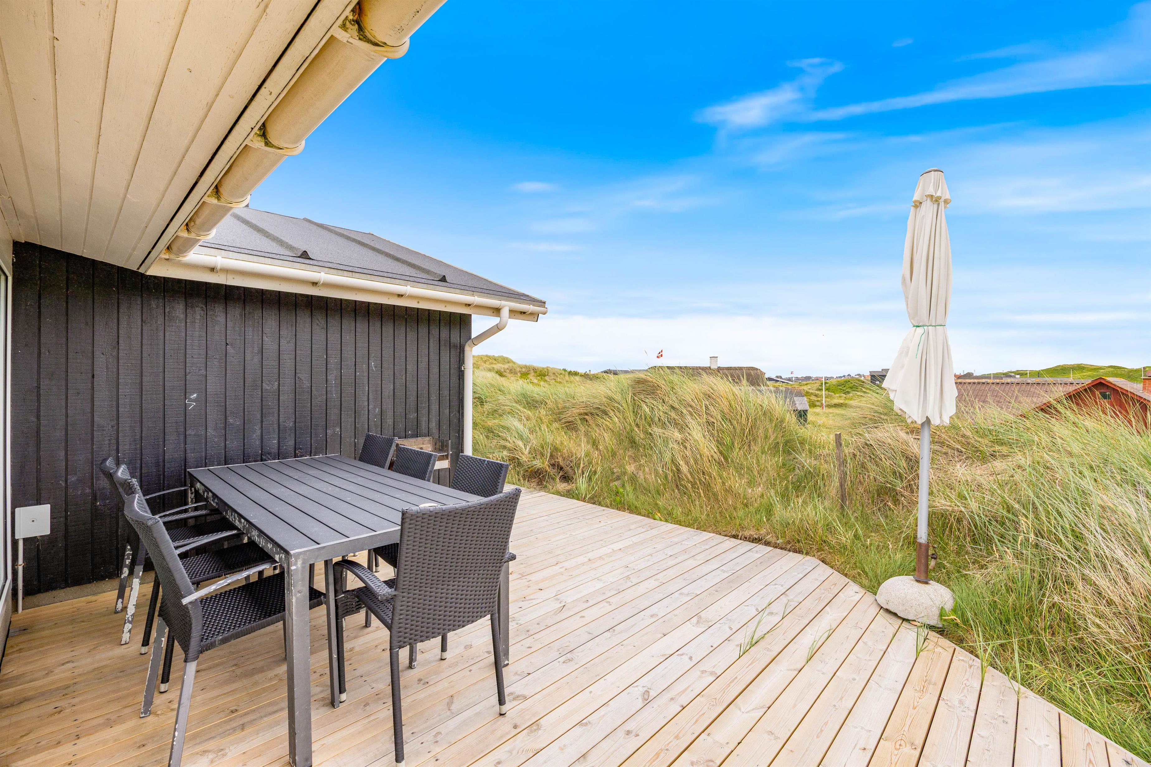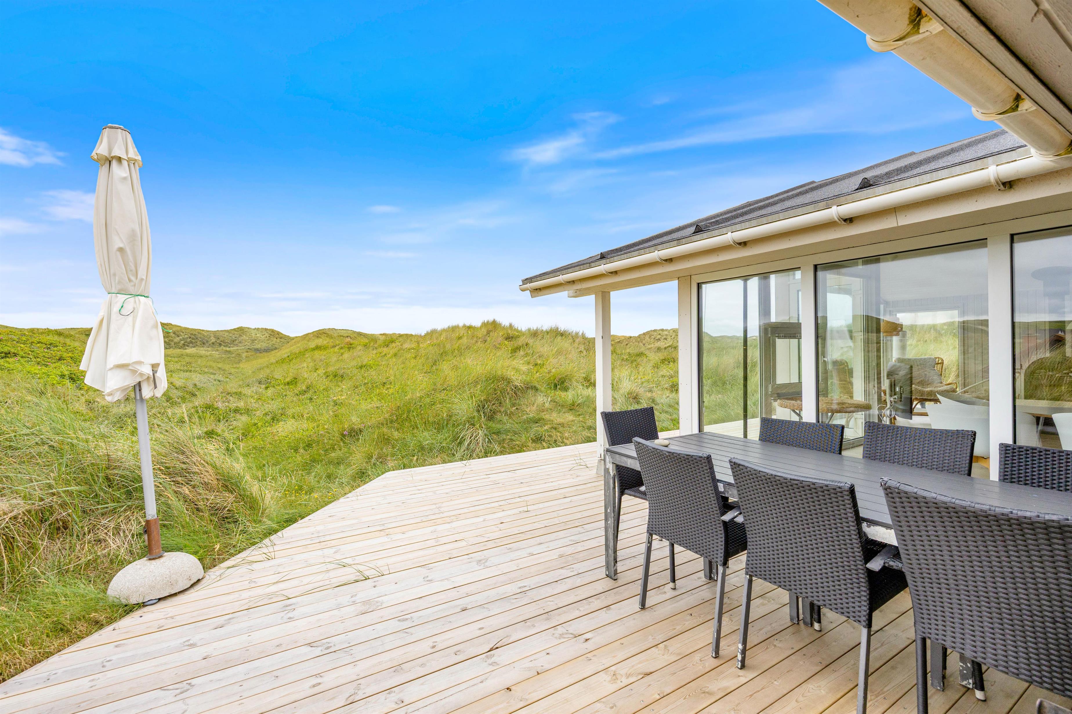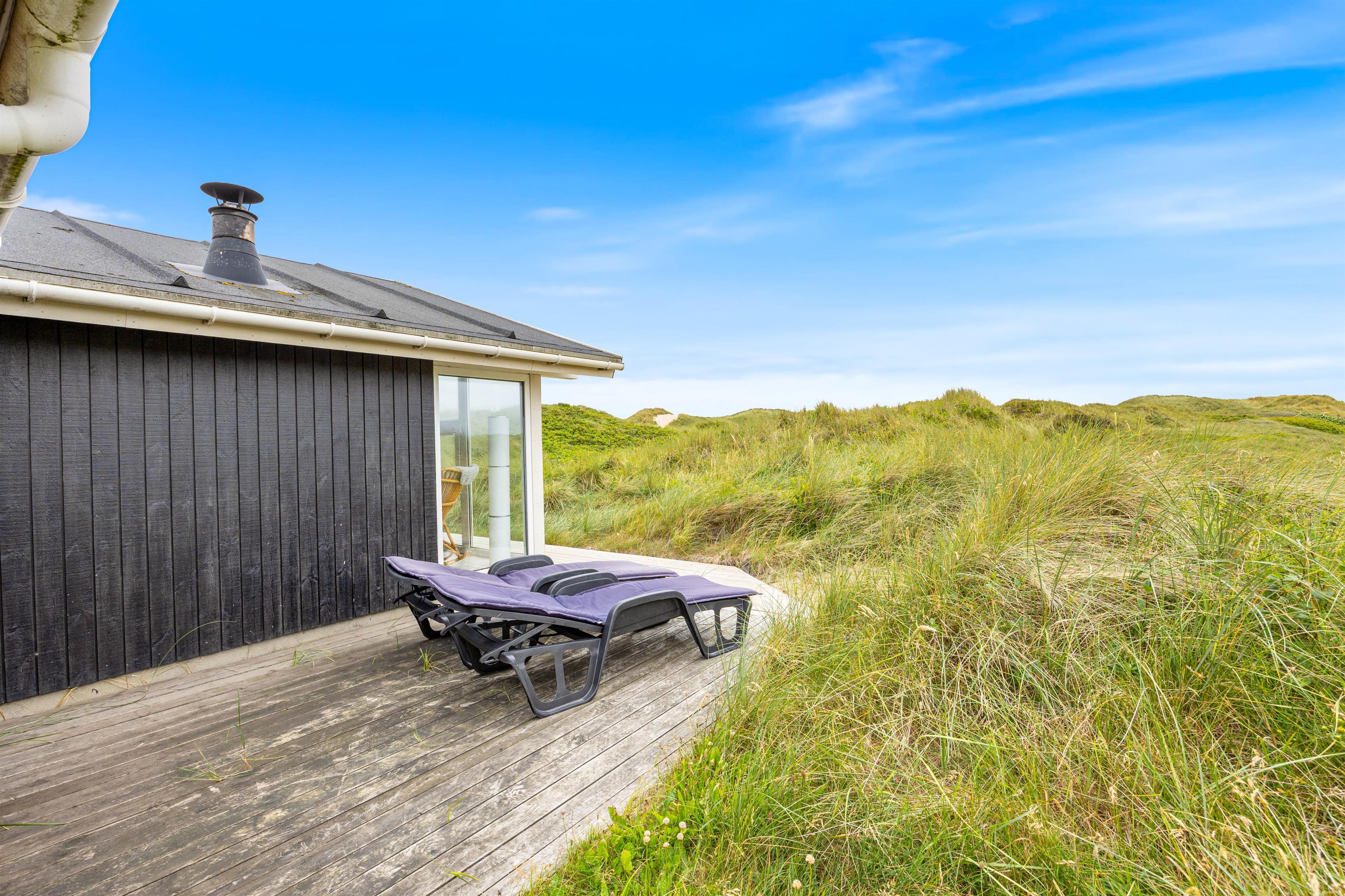 Udendørsområdet på dette sommerhus i Søndervig er lige så inbydende som indeni. På den smukke klitgrund kan I nyde den friske havluft og betagende panoramaudsigt. For de mindste er der en sandkasse, mens de voksne kan tilbringe varme aftener med grillmad på terrassen, udstyret med havemøbler. Hvis I har hund, er det også velkomment, da der er mulighed for at medbringe op til to husdyr.