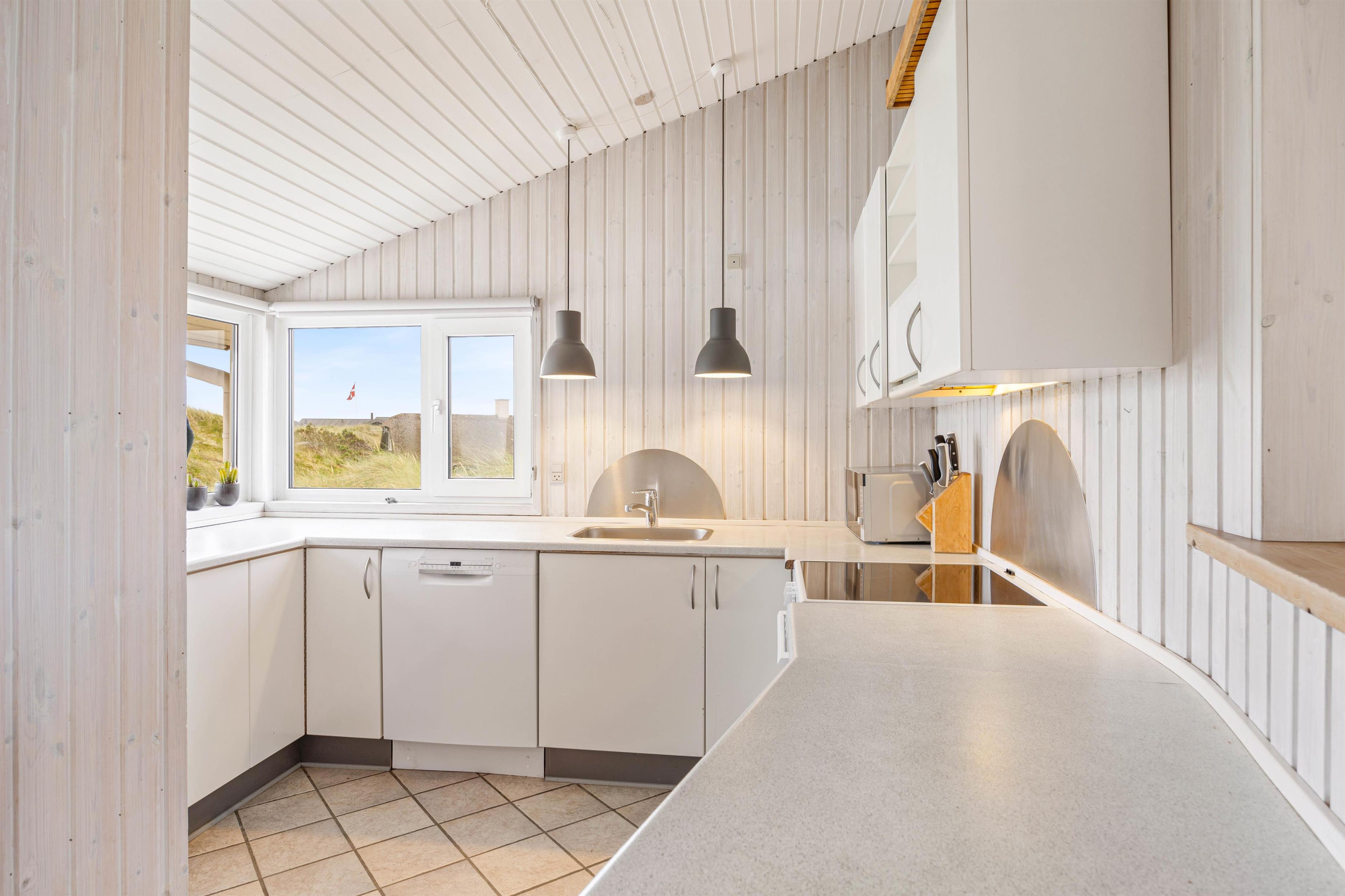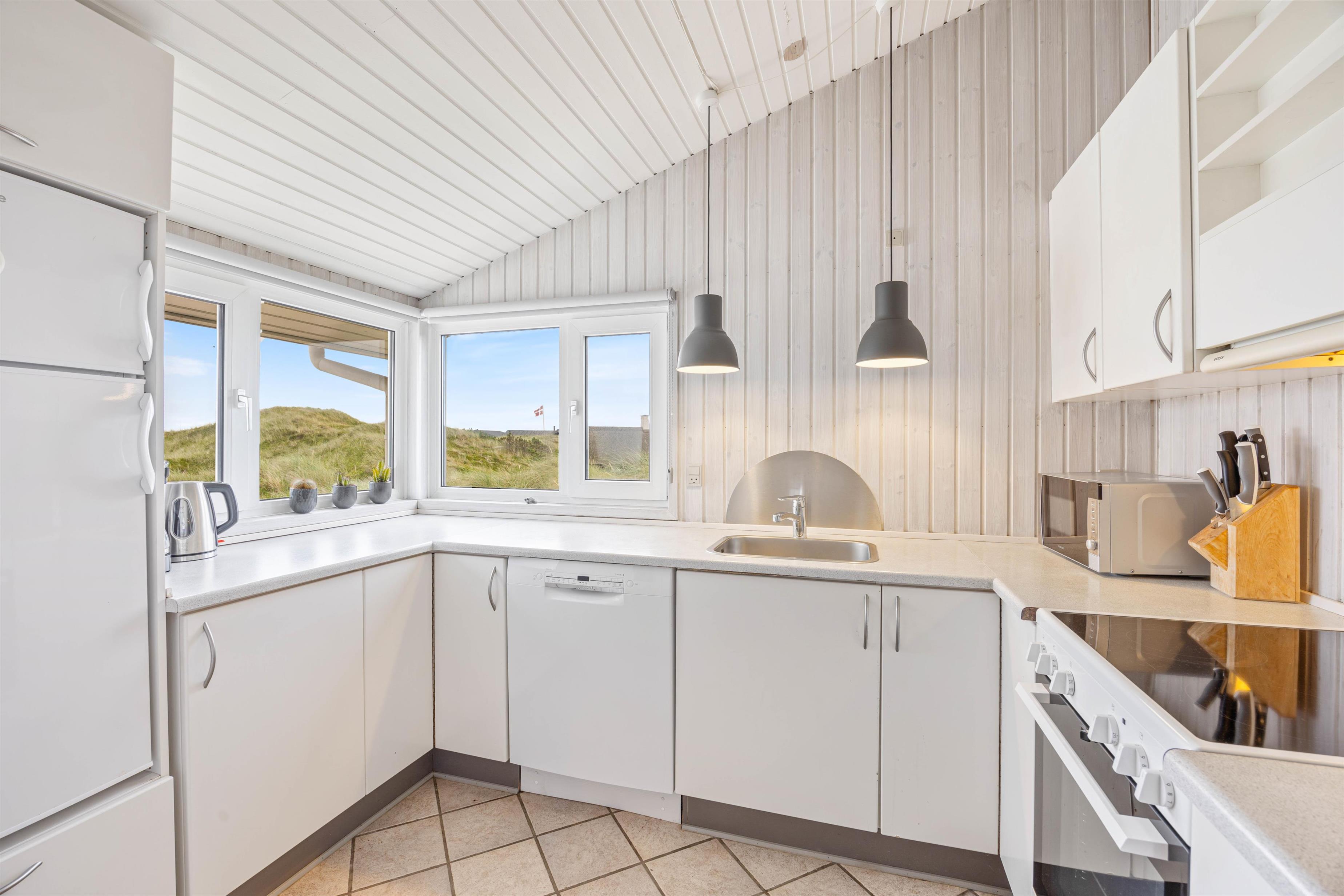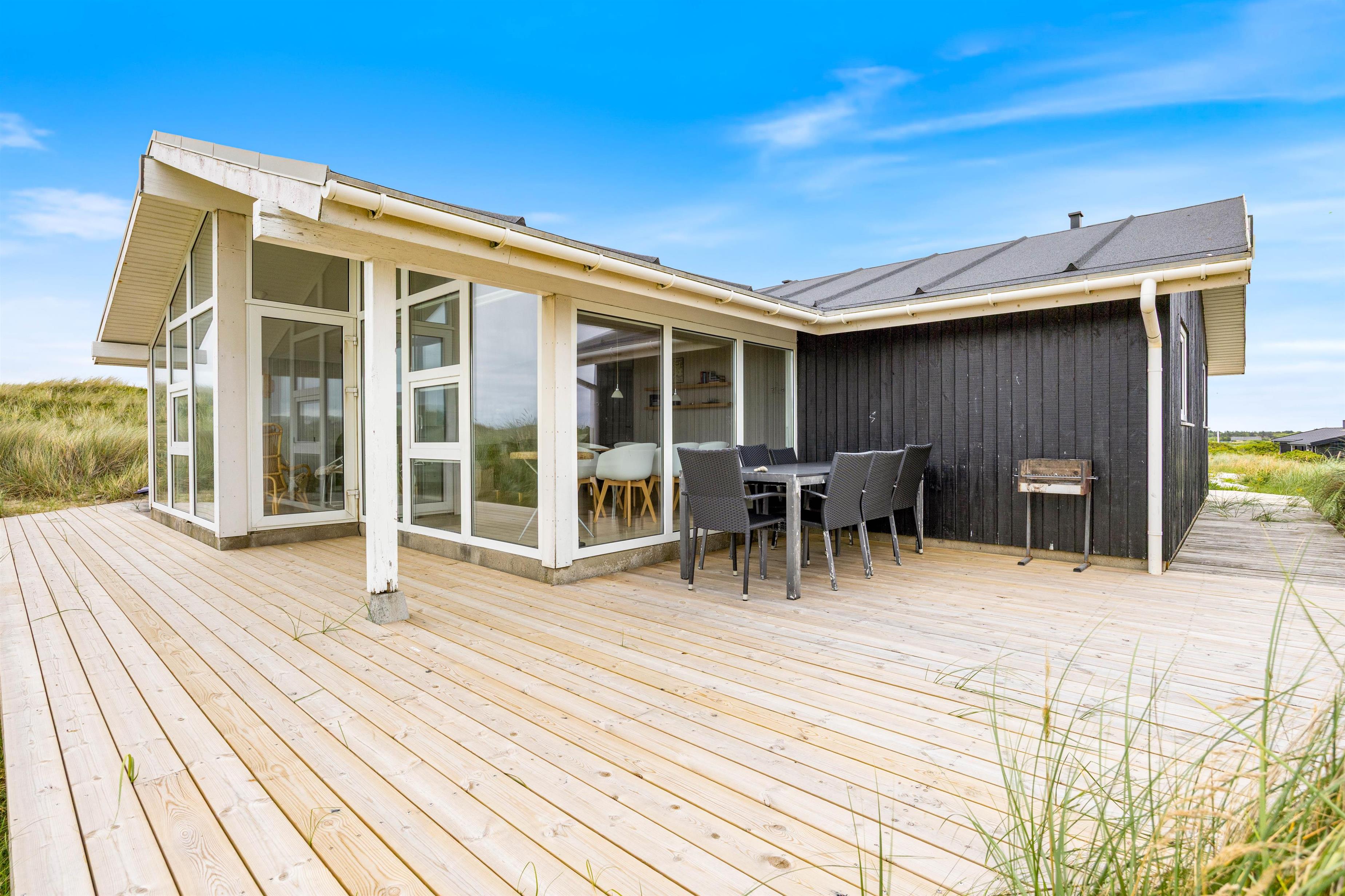 Udendørsområdet på dette sommerhus i Søndervig er lige så inbydende som indeni. På den smukke klitgrund kan I nyde den friske havluft og betagende panoramaudsigt. For de mindste er der en sandkasse, mens de voksne kan tilbringe varme aftener med grillmad på terrassen, udstyret med havemøbler. Hvis I har hund, er det også velkomment, da der er mulighed for at medbringe op til to husdyr.