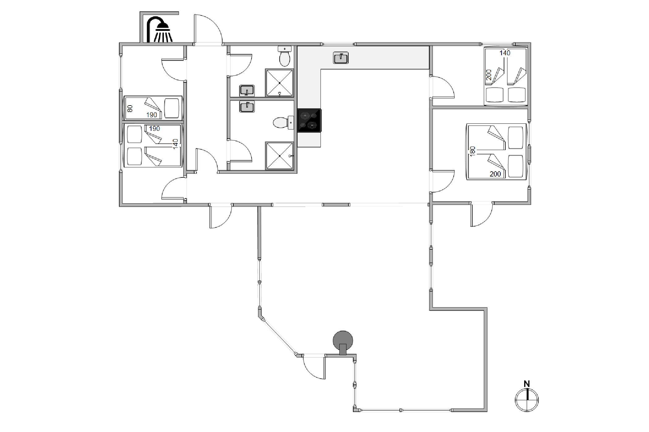 Sommerhuset indeholder i alt to badeværelser, som i 2019 er blevet renoveret og fremstår lyse og venlige. Her behøver I ikke at frygte for kolde fødder i vintermånederne - begge badeværelser er udstyret med gulvvarme. Sovepladserne fordeler sig på fire soveværelser, hvor det ene er med en stor dobbeltseng på 180x200, to værelser med en dobbelseng på 140x200 og det sidste værelse med en enkeltseng.