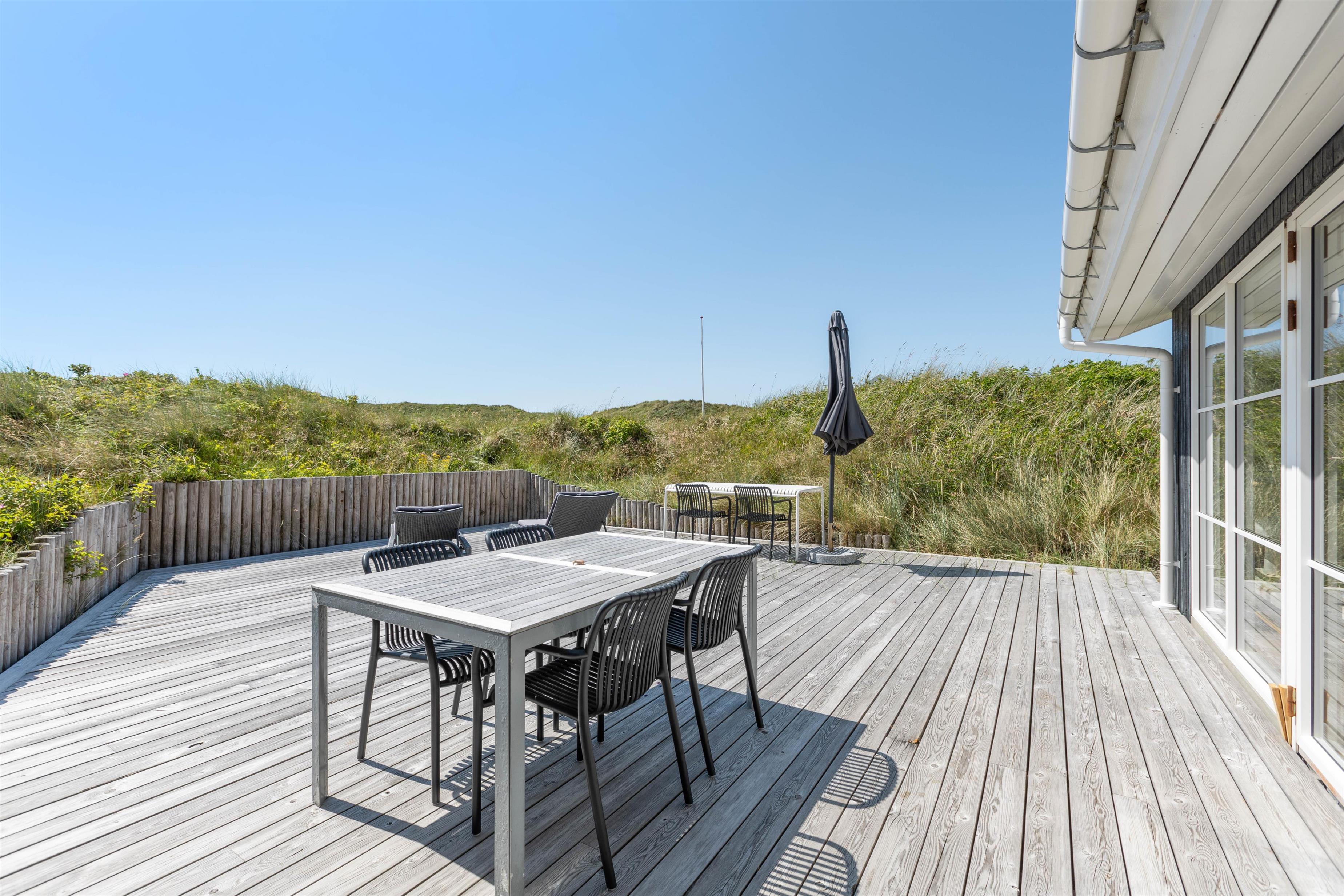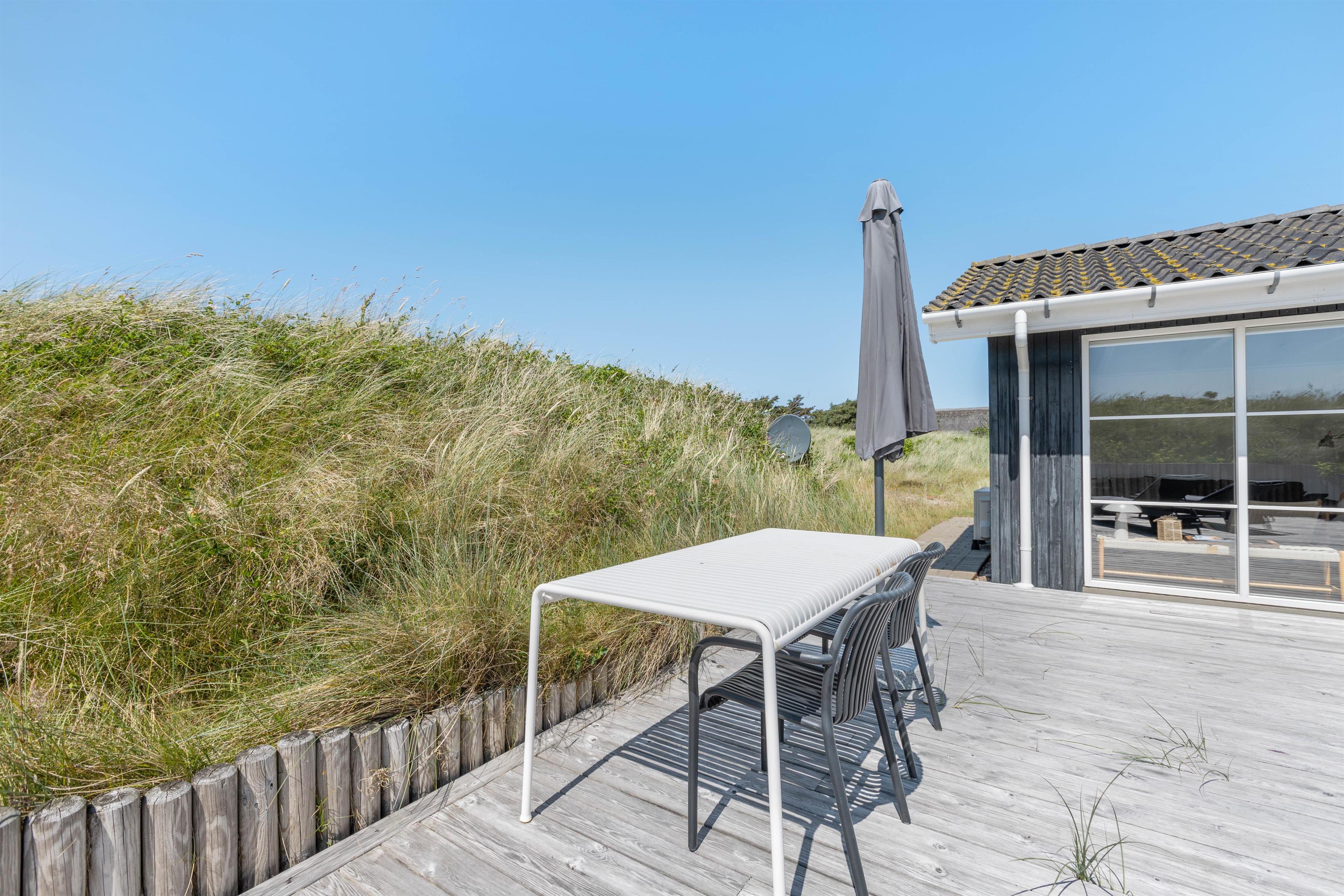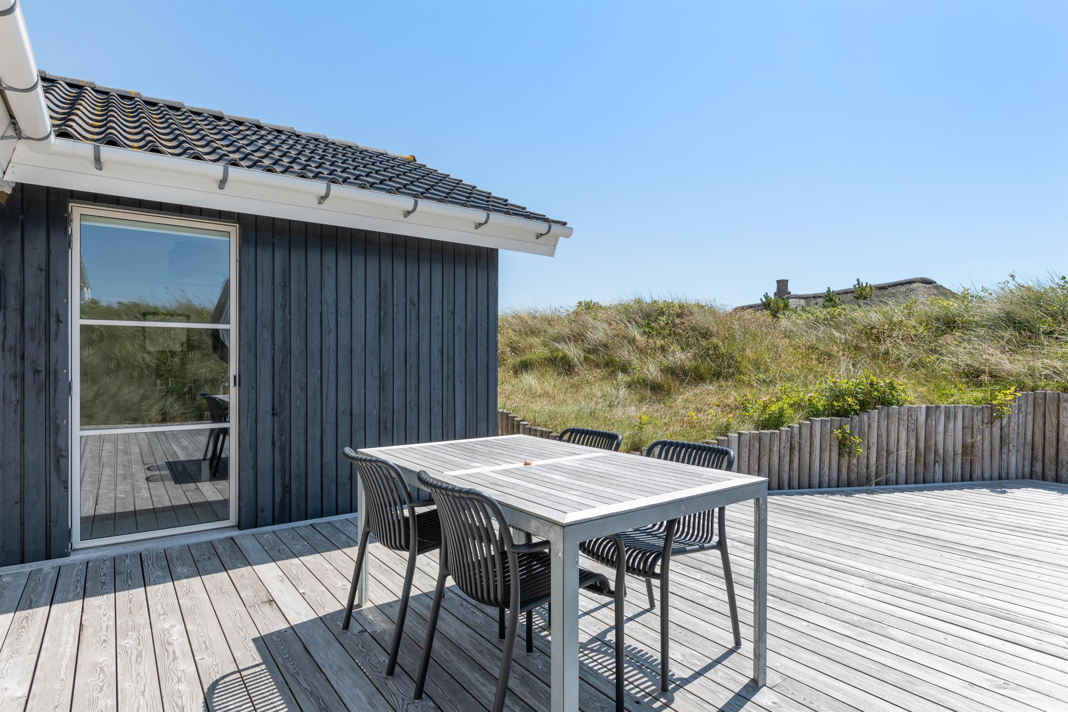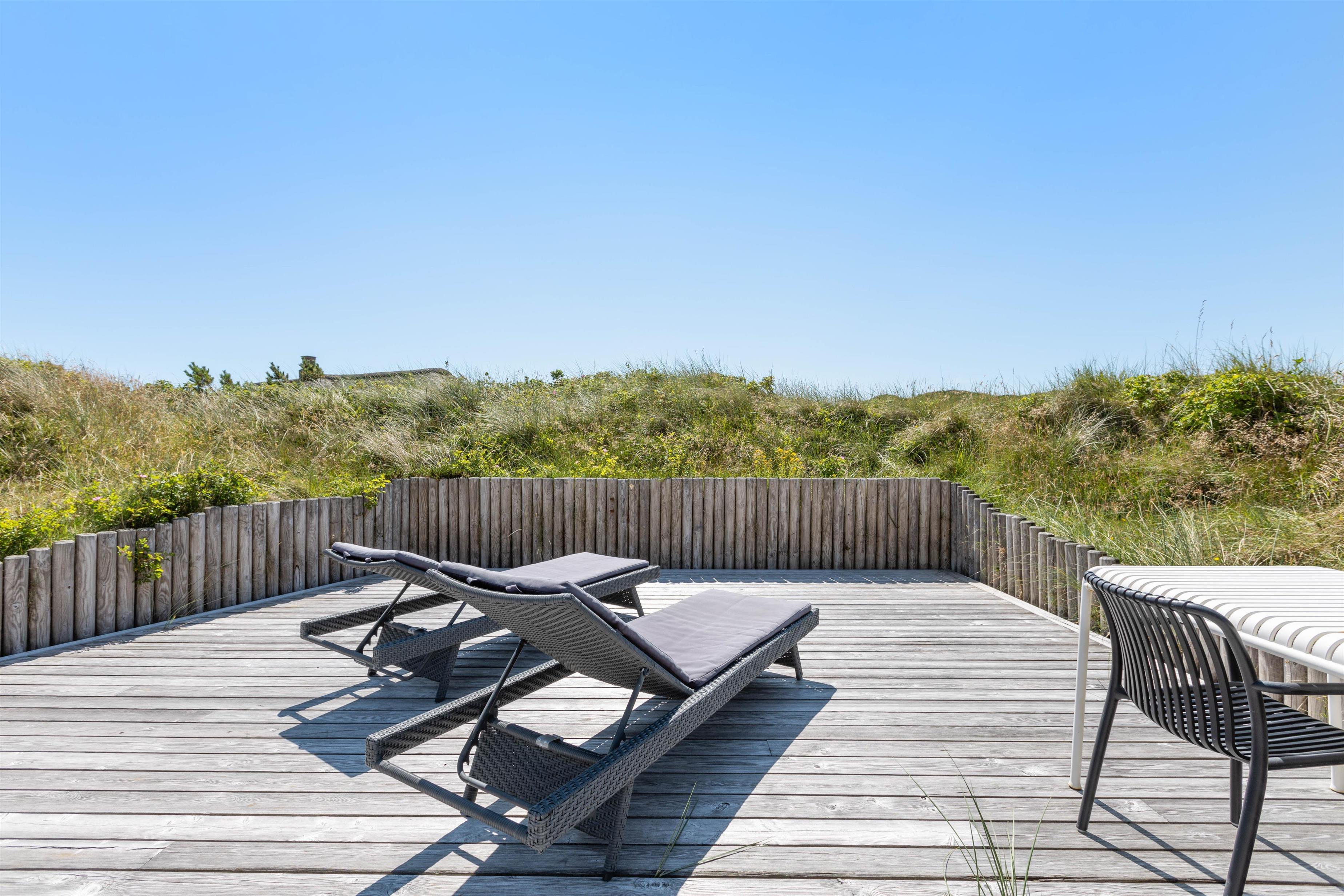 Så I til enhver tid kan nyde husets ugenerte beliggenhed midt i den skønne natur, er der flere terrasser rundt om huset. Når der rigtigt skal slappes af, er den 70m2 store sydvendte solterrasse et hit. Her er god plads til solvognene, og I ligger dejligt i læ af klitten med den fortryllende duft af hav, lyng og marehalm i næsen. Når dagen går på hæld, kan I tænde op i grillen og nyde lidt godt mad, imens solen går ned bag klitterne og de første stjerne titter frem.