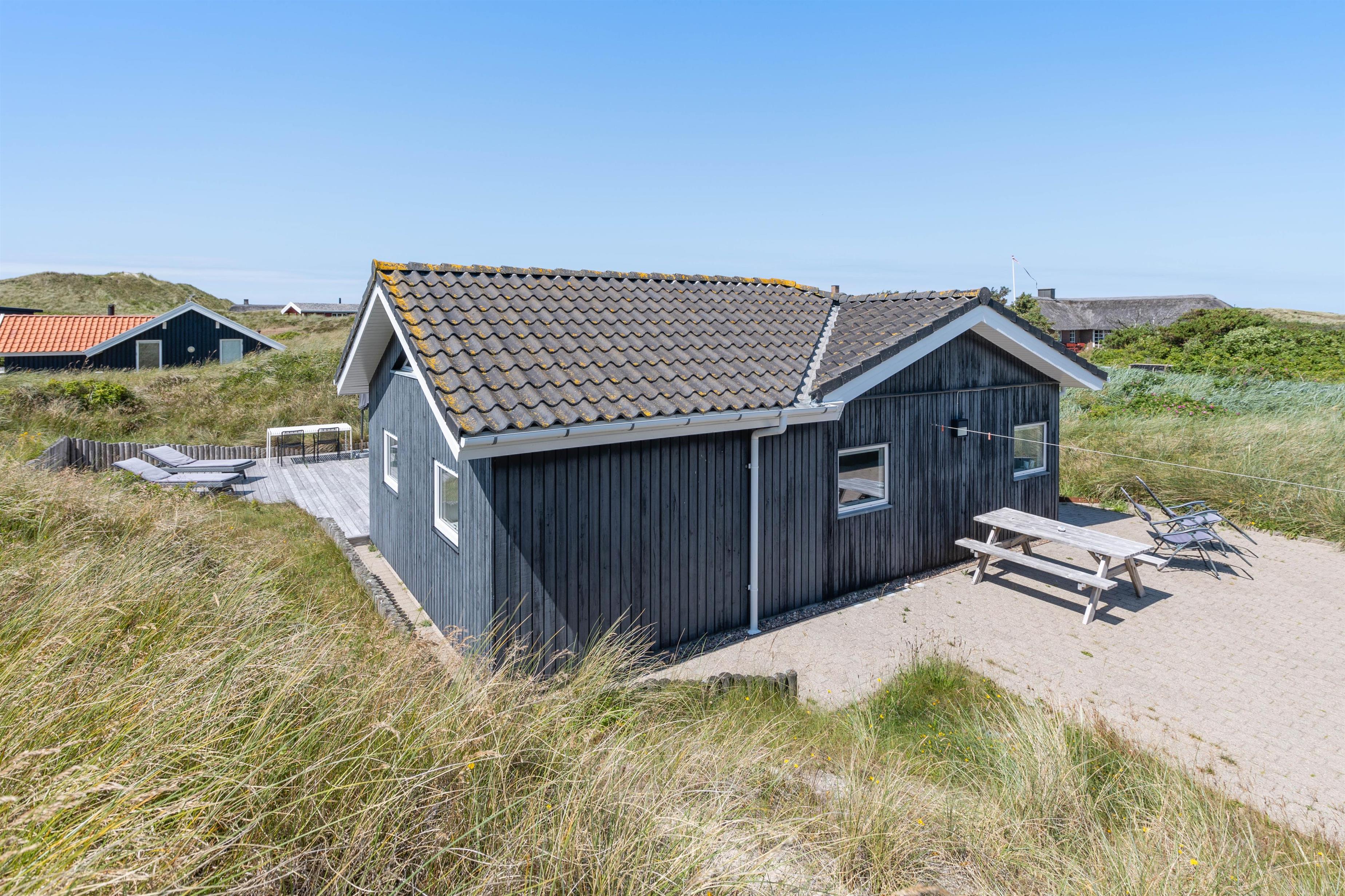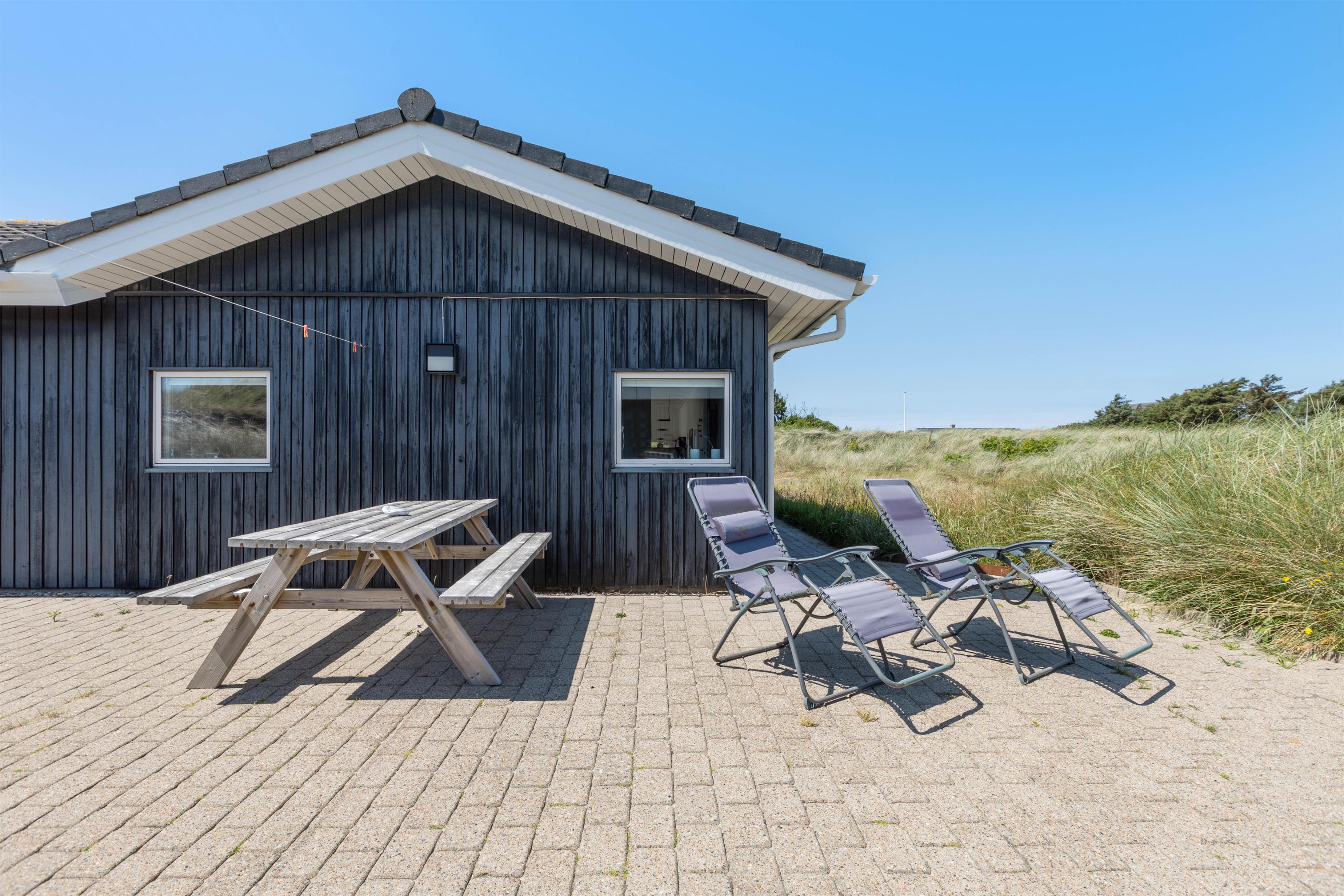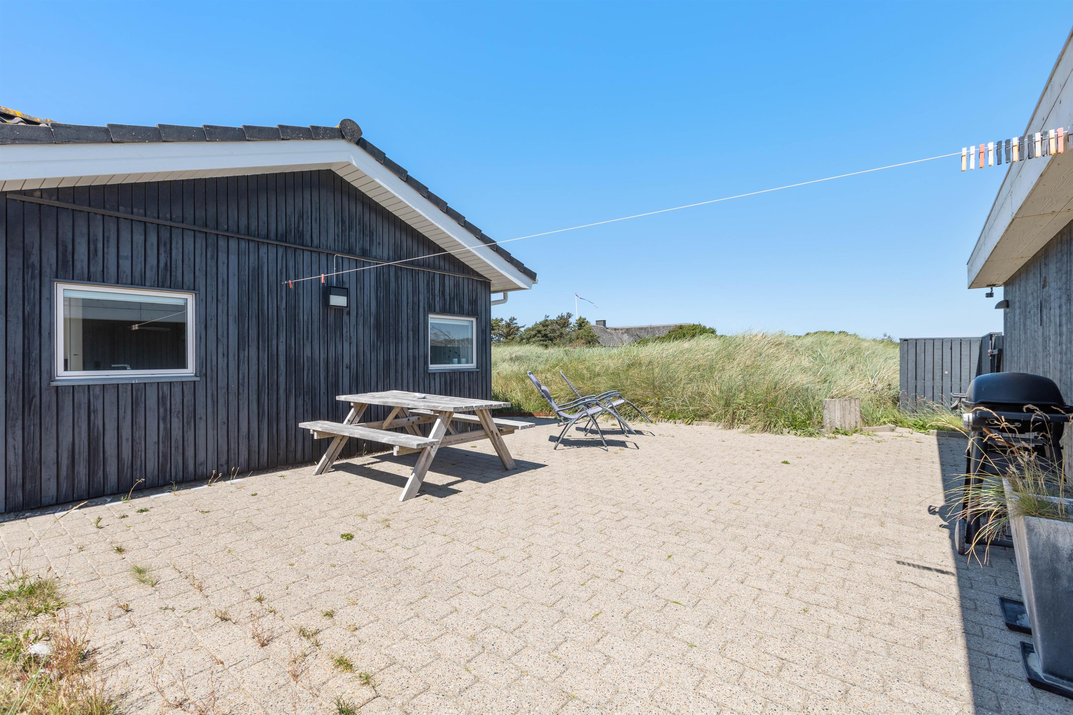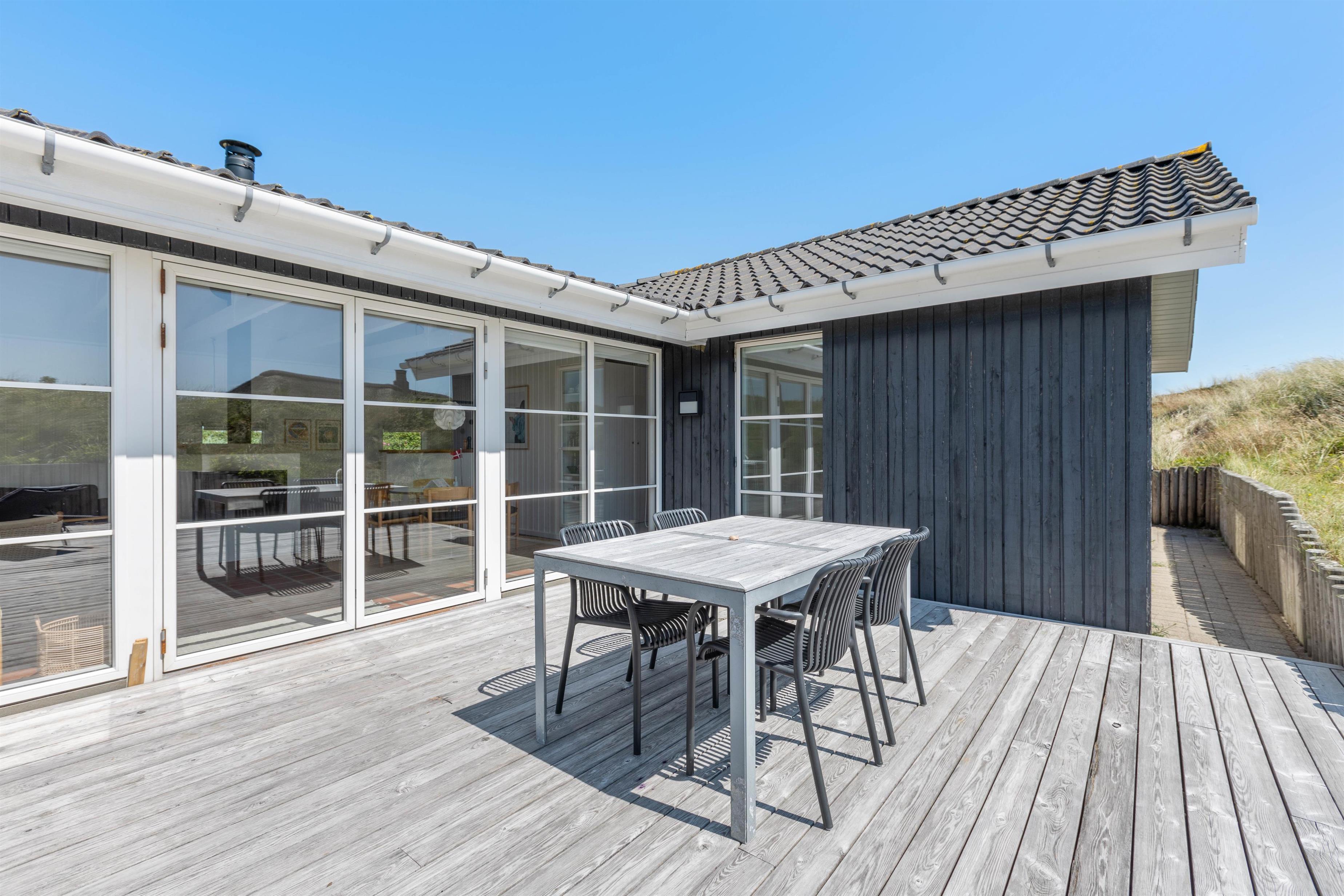 Så I til enhver tid kan nyde husets ugenerte beliggenhed midt i den skønne natur, er der flere terrasser rundt om huset. Når der rigtigt skal slappes af, er den 70m2 store sydvendte solterrasse et hit. Her er god plads til solvognene, og I ligger dejligt i læ af klitten med den fortryllende duft af hav, lyng og marehalm i næsen. Når dagen går på hæld, kan I tænde op i grillen og nyde lidt godt mad, imens solen går ned bag klitterne og de første stjerne titter frem.