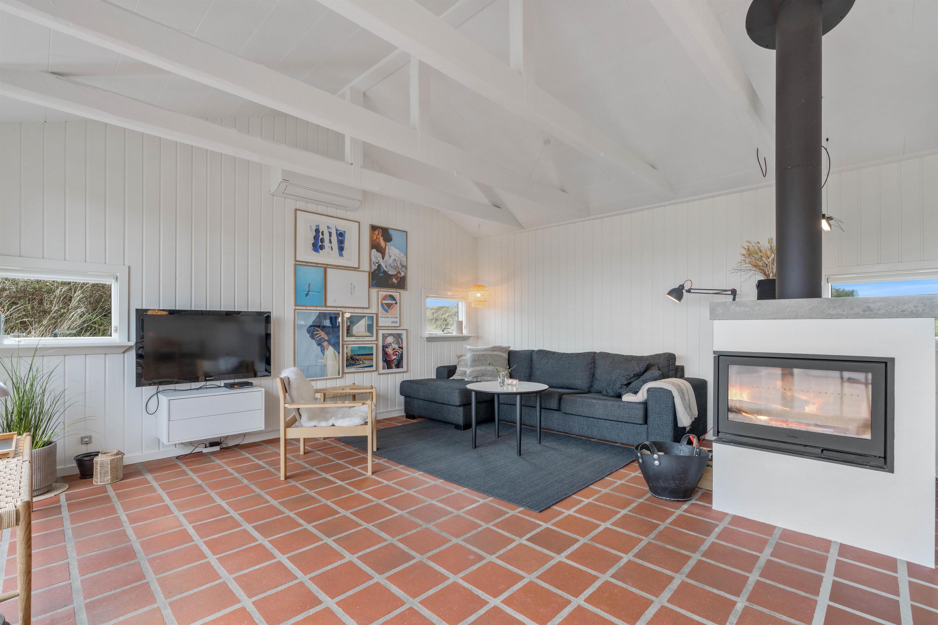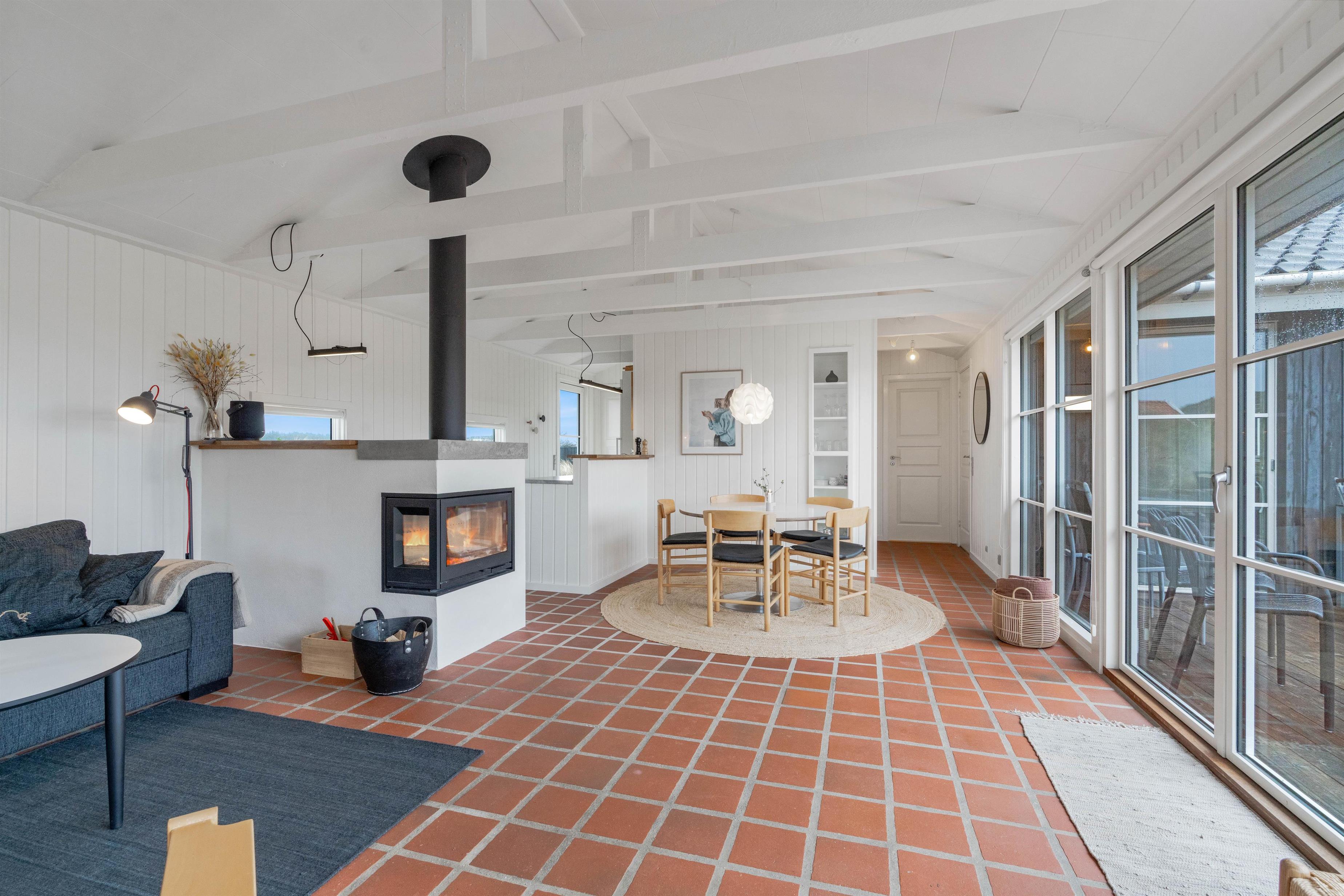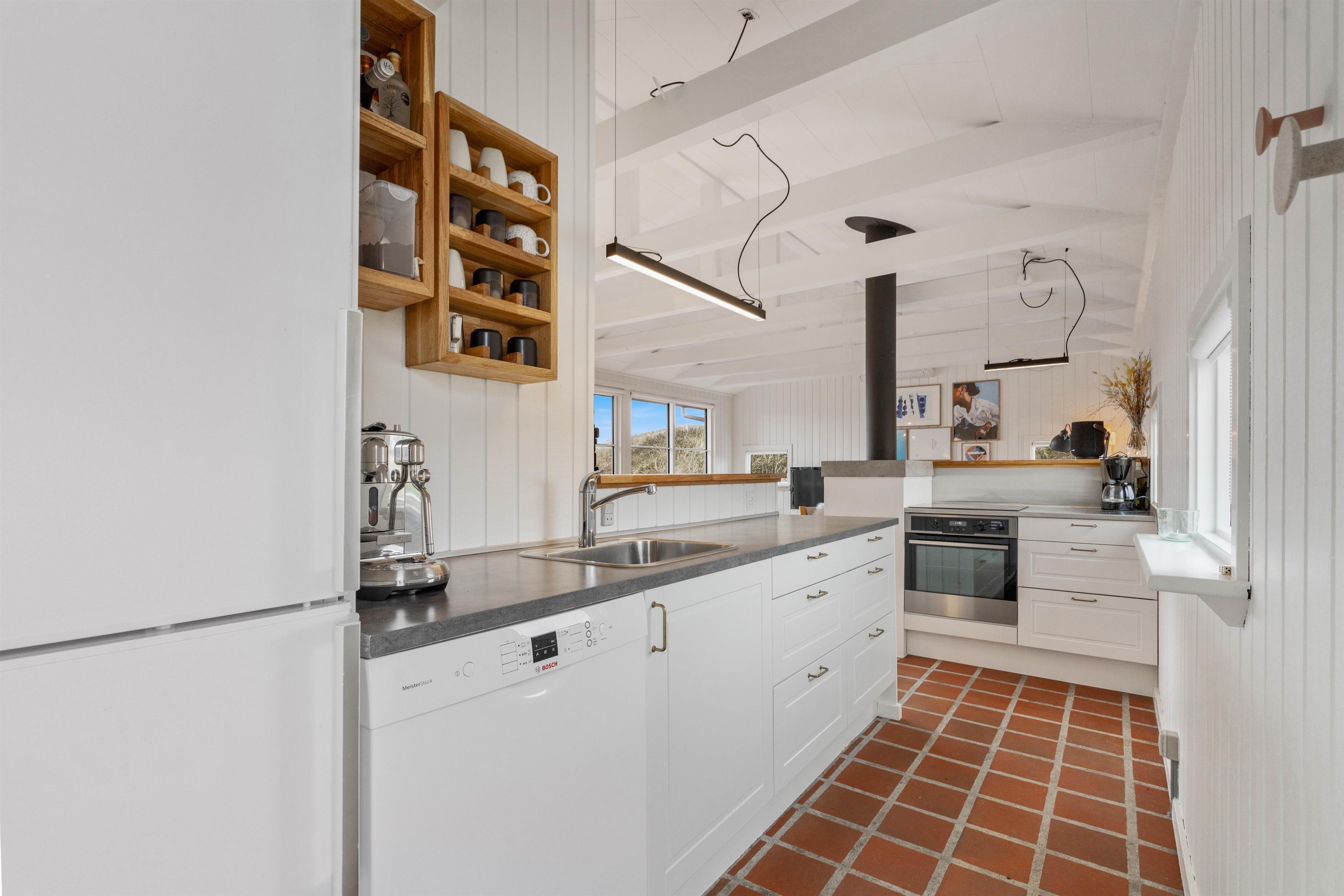 Husets hvidmalede vægge og spær og smagfulde indretning, kombineret med det varme klinkegulv, giver en stemning, så I, som gæster, hurtigt vil føle jer godt tilpas. Huset er dermed udstyret med et splinternyt køkken, hvor i sammen kan lave mad. Stuen er, på grund af det store vinduesparti, meget lys og venlig. Udsigten til klitterne gør, at man også indenfor føler, at man er tæt på naturen. Store dobbeltsenge i 2 af husets soverum og en 140 cm bred seng i det 3. giver garanteret plads til en god nattesøvn efter en dag med masser af frisk havluft.