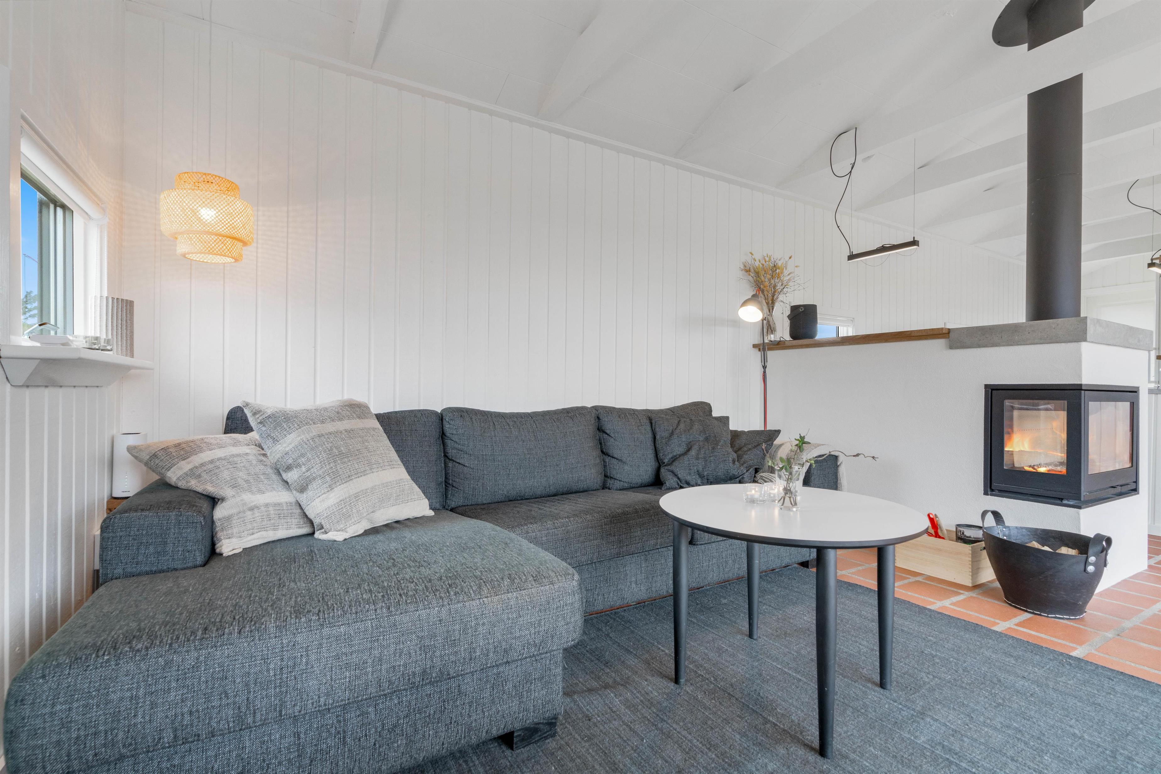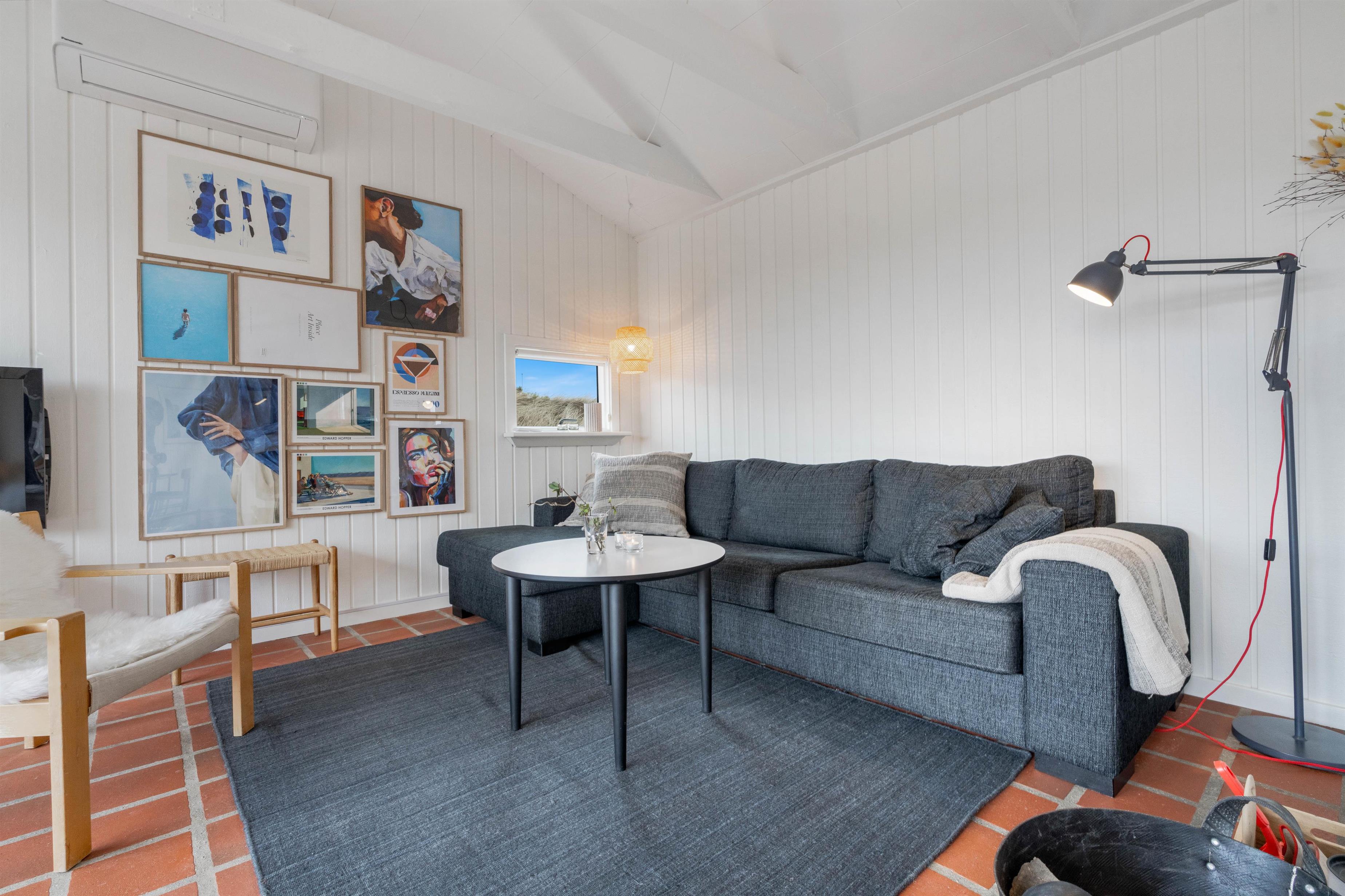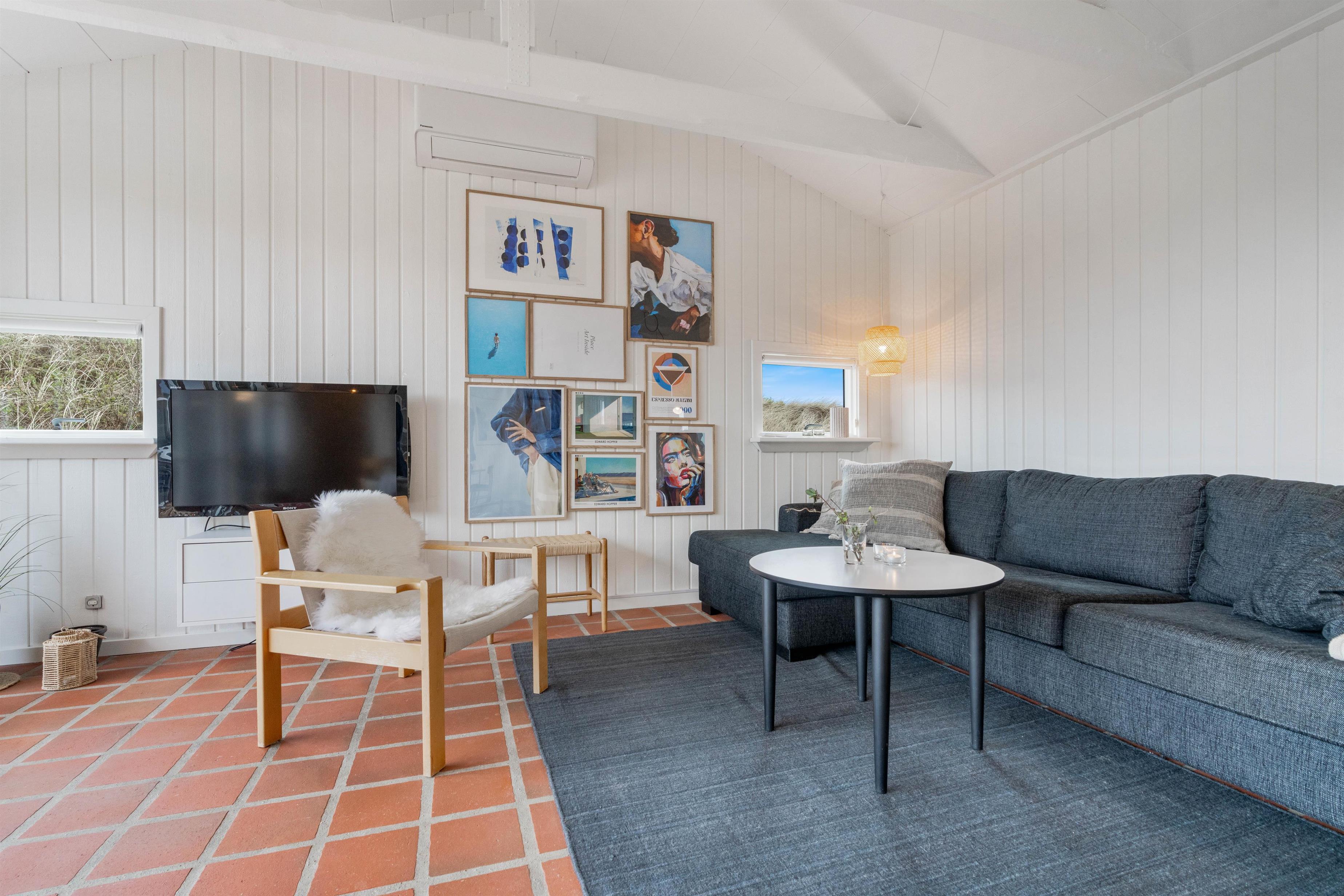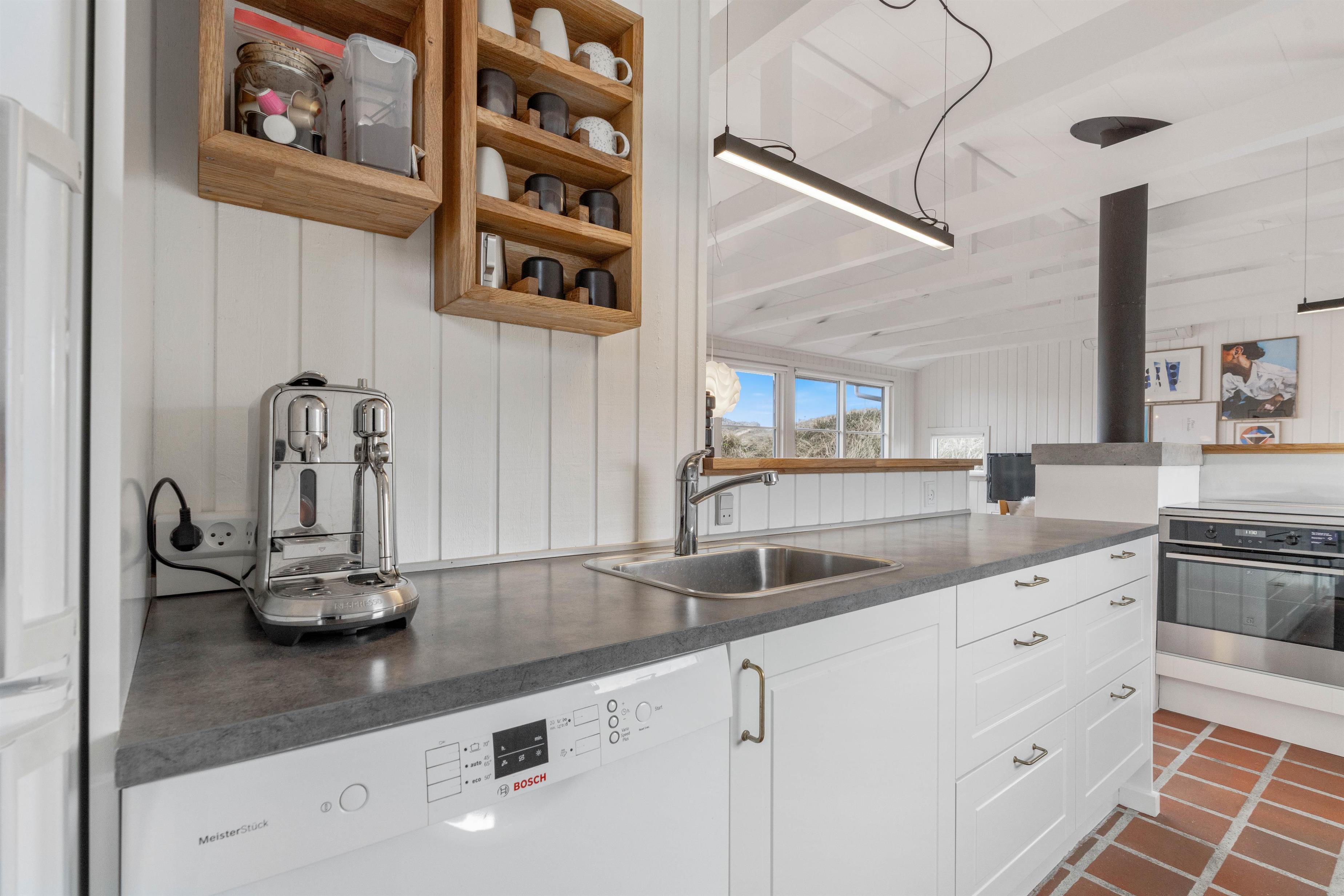 Husets hvidmalede vægge og spær og smagfulde indretning, kombineret med det varme klinkegulv, giver en stemning, så I, som gæster, hurtigt vil føle jer godt tilpas. Huset er dermed udstyret med et splinternyt køkken, hvor i sammen kan lave mad. Stuen er, på grund af det store vinduesparti, meget lys og venlig. Udsigten til klitterne gør, at man også indenfor føler, at man er tæt på naturen. Store dobbeltsenge i 2 af husets soverum og en 140 cm bred seng i det 3. giver garanteret plads til en god nattesøvn efter en dag med masser af frisk havluft.