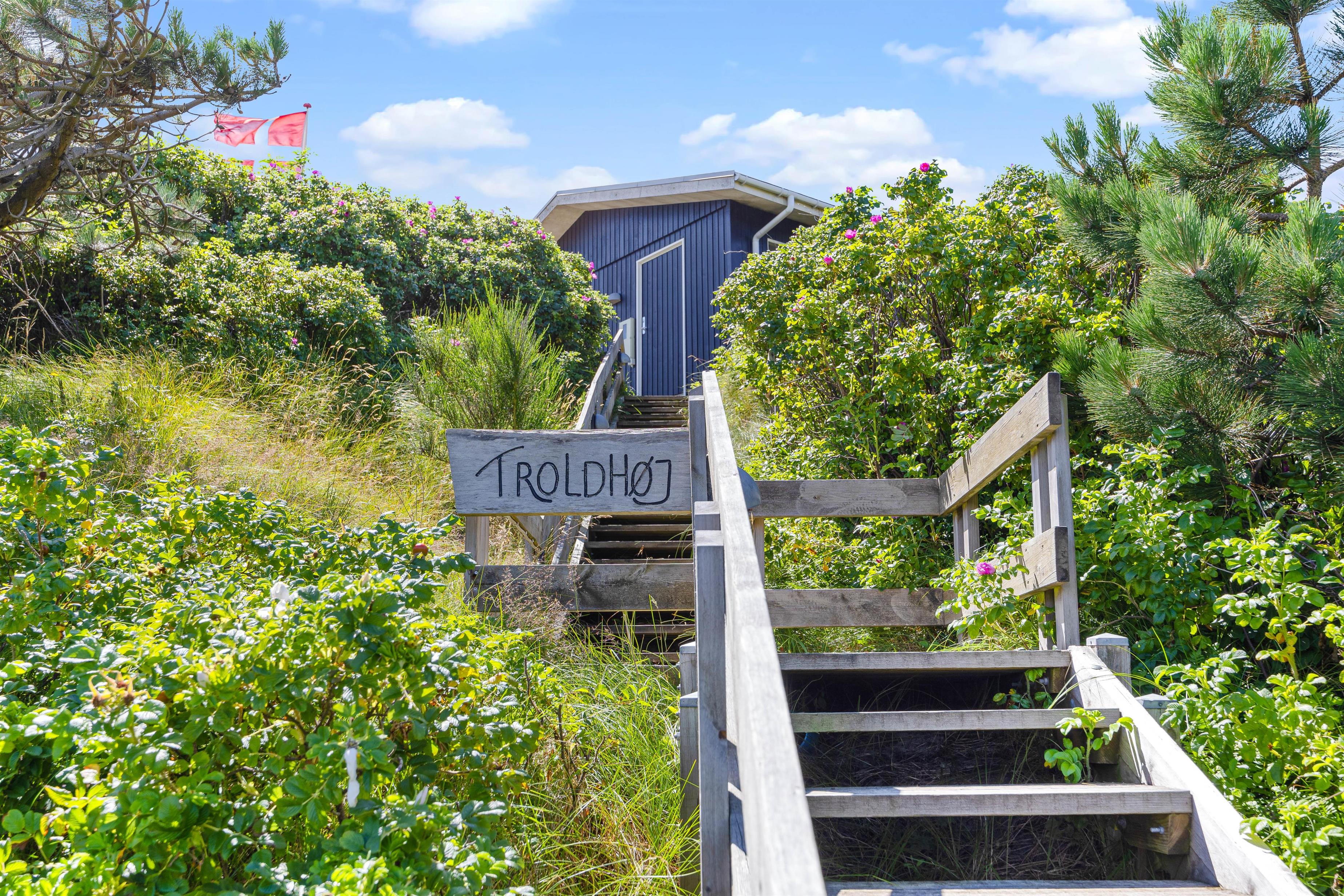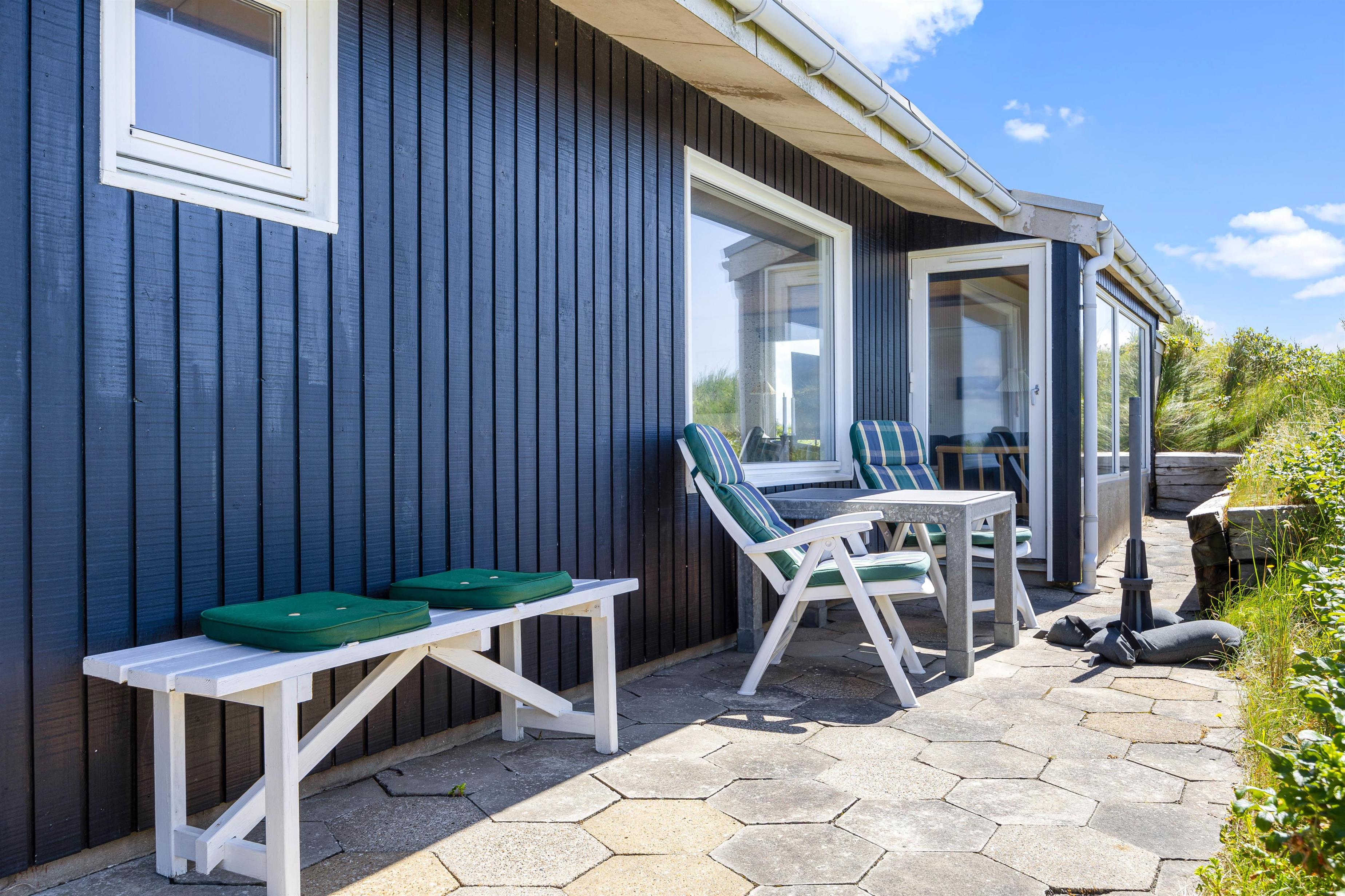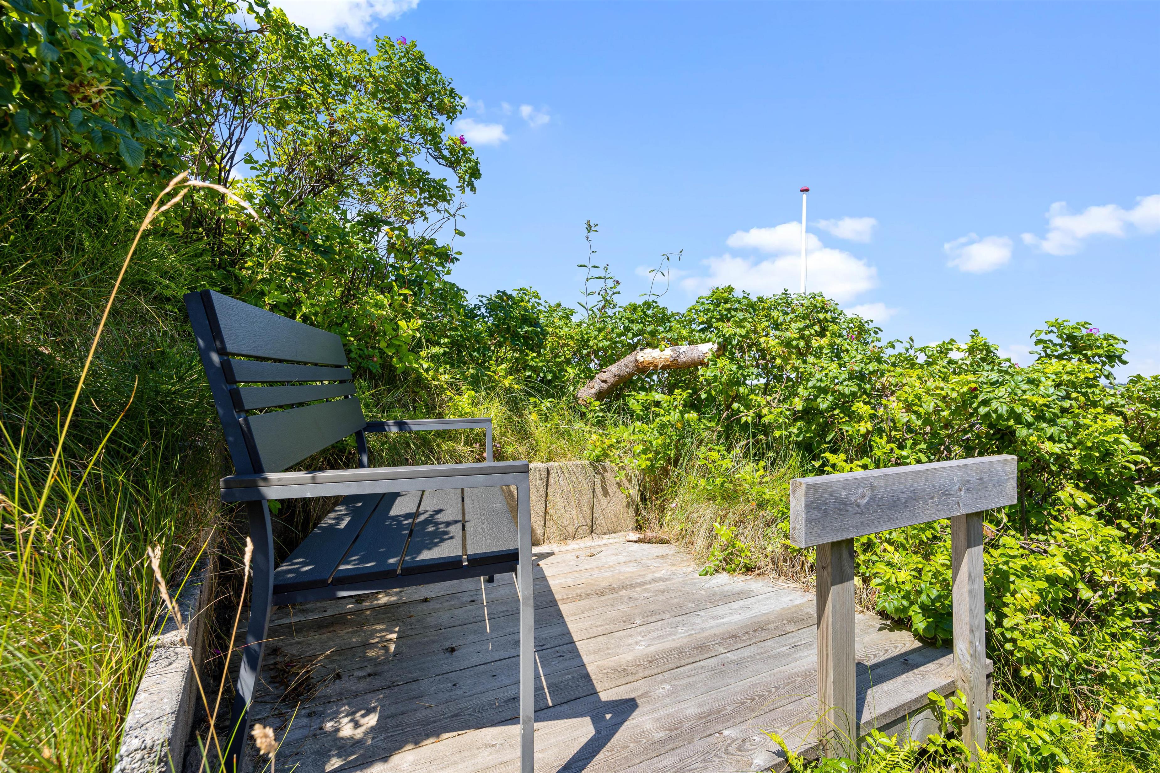 Sommerhusets beliggenhed fås ikke meget bedre. Huset ligger på toppen af en klit, hvilket giver masser af privatliv, men ikke mindst nogle fantastiske udsigter. I kan derfor med ro i maven sætte jer til rette enten indendørs i de behagelige møbler, eller udendørs i de mange små hyggelige kroge, der findes rundt om huset. Om sommeren kan det også anbefales at tage dyne og pude med ud i sommerhusets shelter, og have en eller flere nætter ude i den friske havluft. Bemærk venligst også, at grundet sommerhusets beliggenhed, så parkerer man 25 meter fra sommerhuset, og sommerhuset kan kun tilgås via trapperne