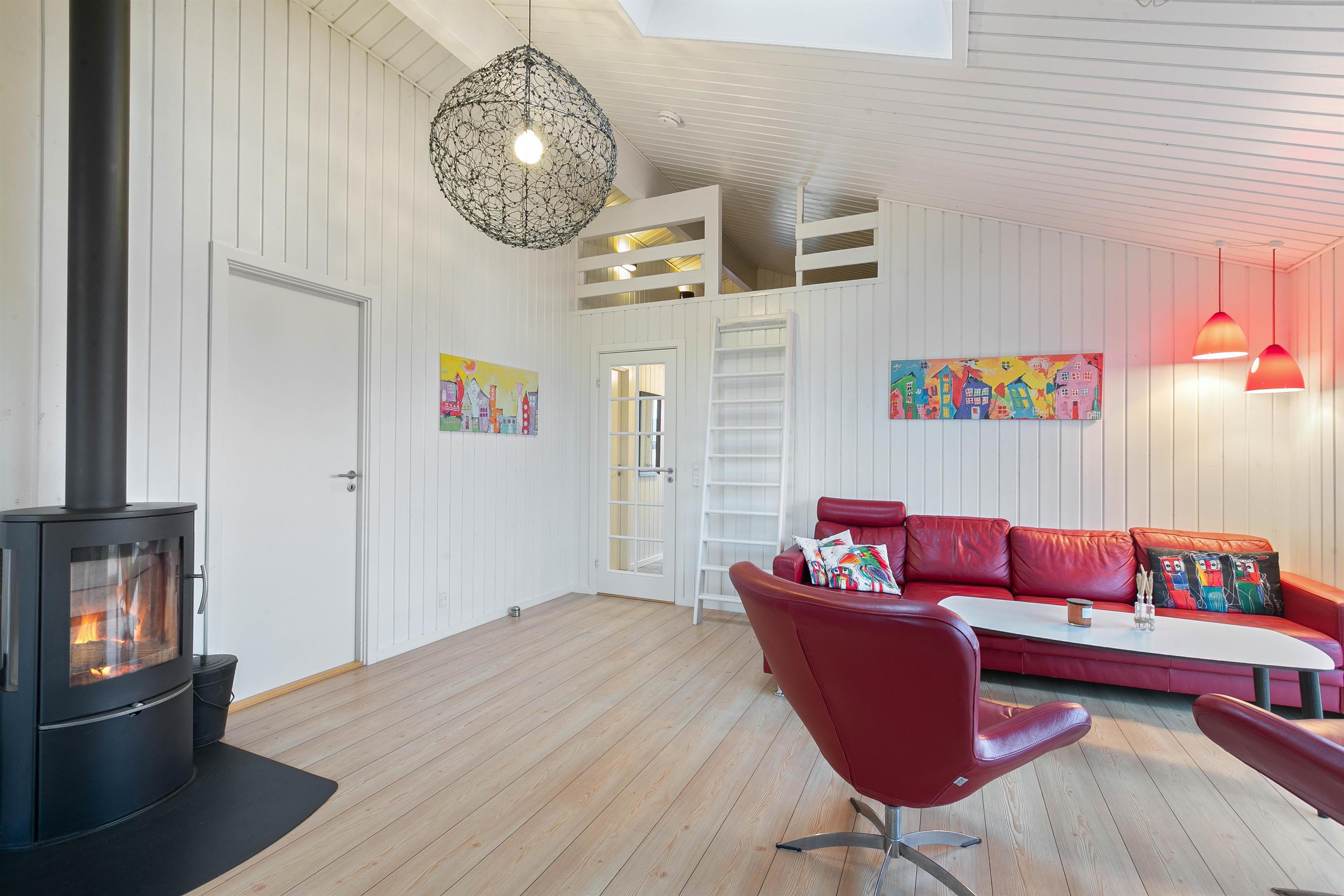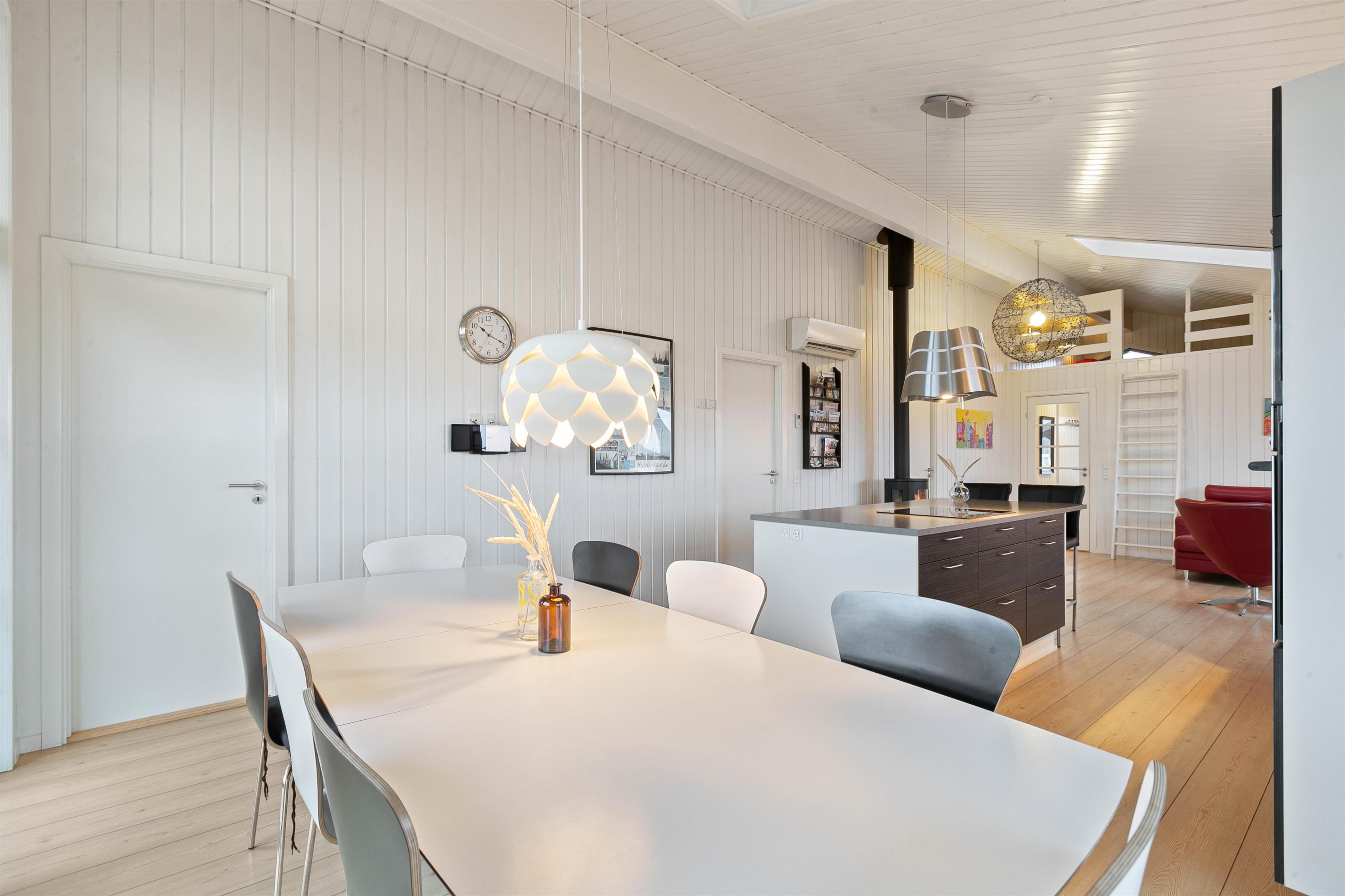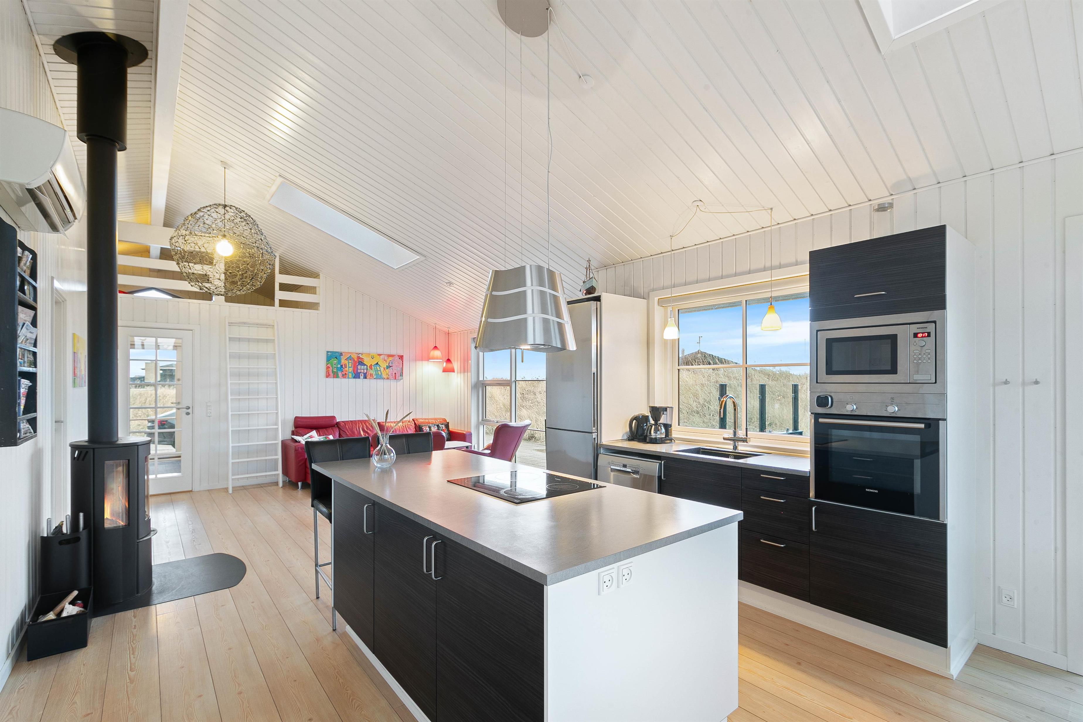Mo køkken med kogeø, opvaskemaskine, stor fryser og mikroovn og Quooker. Køkkenet står i åben forbindelse med stuen, som er lækkert indrettet med komfortable møbler, fladskærm og loft åbent til kip. Sommerhuset er udstyret med energibesparende varmepumpe, et centralstøvsugersystem og gratis trådløst internet. Til de mindste er det barneseng og barnestol.