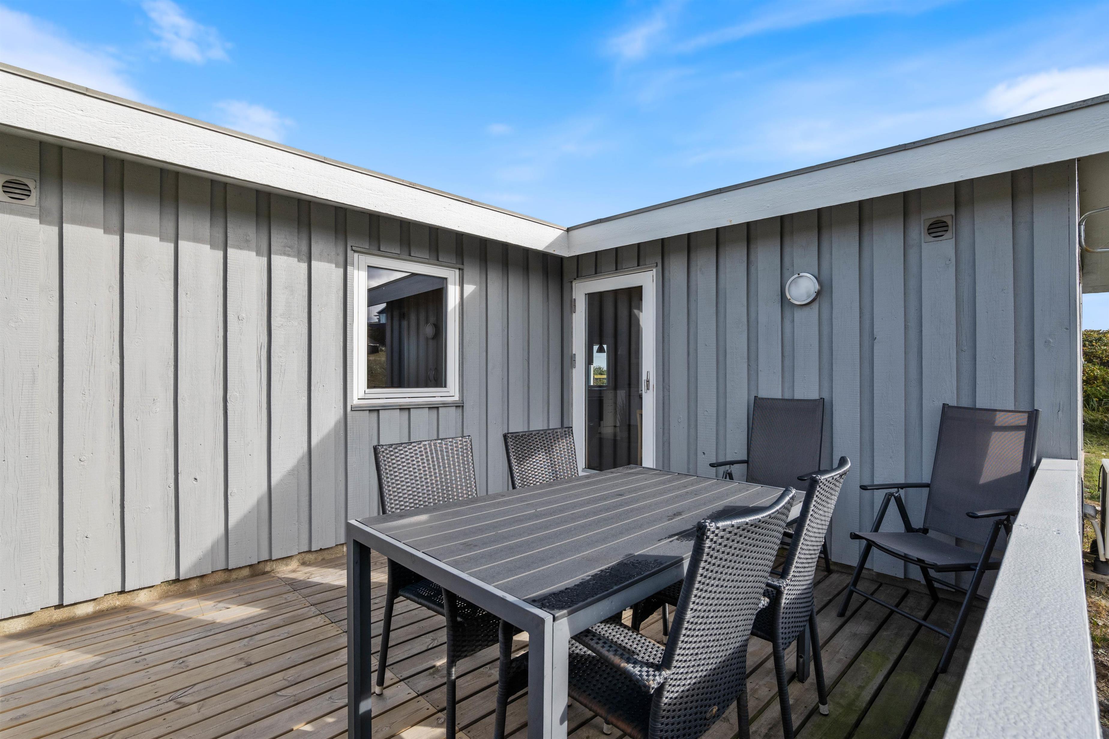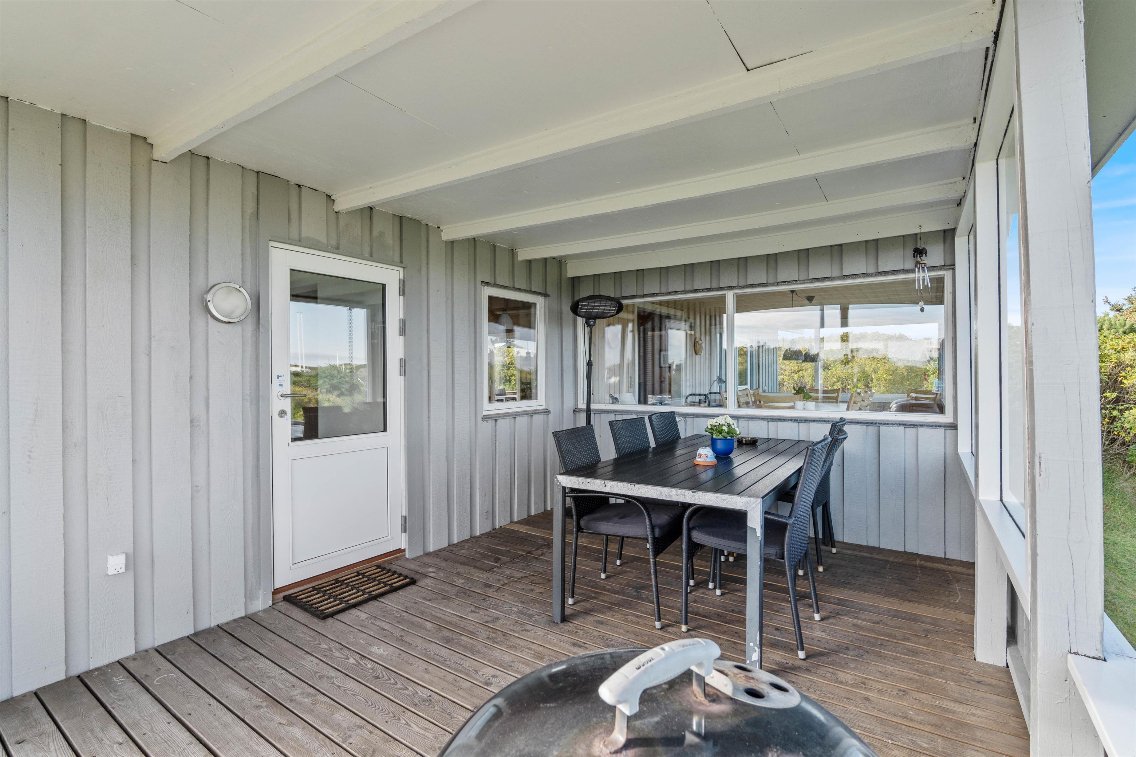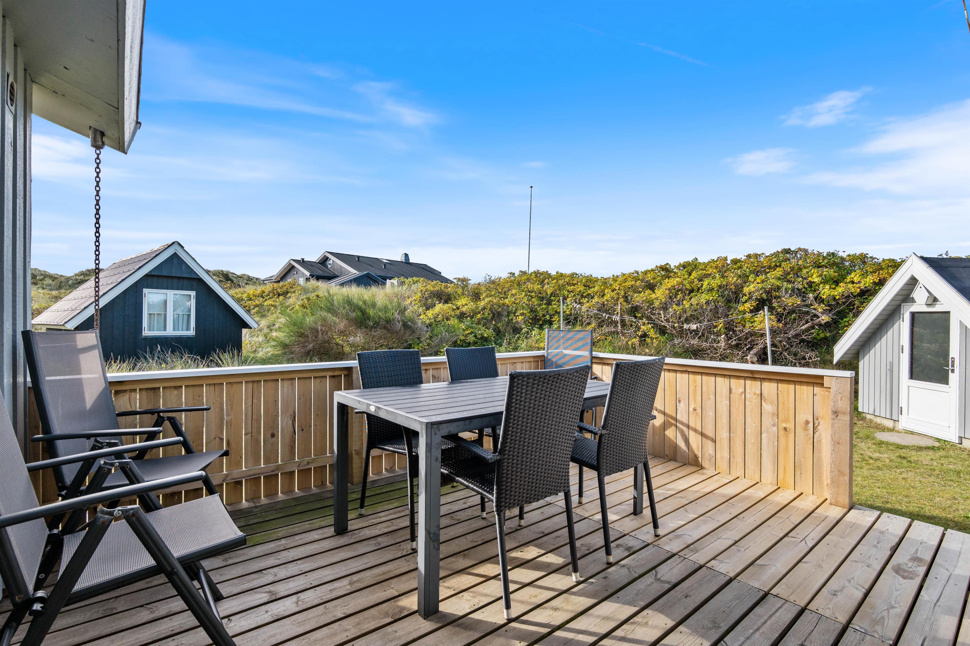 Sommerhuset har en hyggelig udestue mod nord, samt en stor solterrasse mod sydøst og en mod vest. Især terrassen mod vest er skøn, da I kan være helt jer selv, og I kan ikke mindst nyde lyden af Vesterhavets brusende bølger, der slår ind mod strandkanten. Selvom I kun er få minutters gang fra Søndervig centrum, er der særdeles roligt omkring sommerhuset, hvilket gør at dette sommerhus er et godt valg for den familie, som ønsker ro og en ugenert beliggenhed.