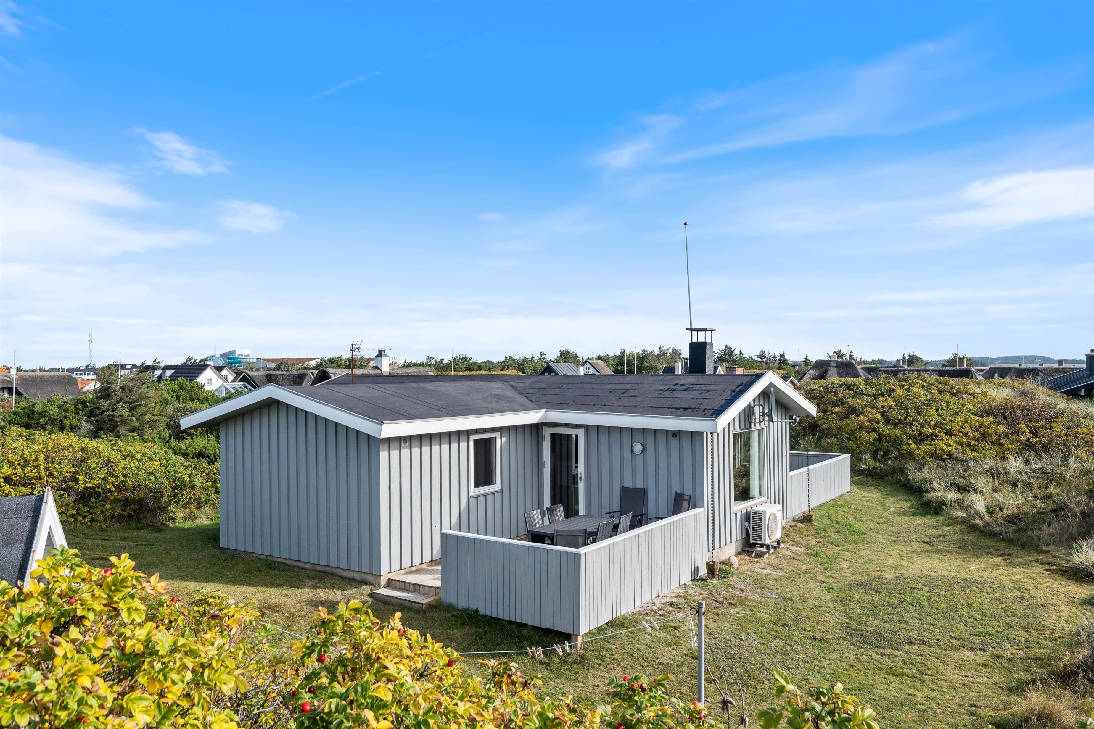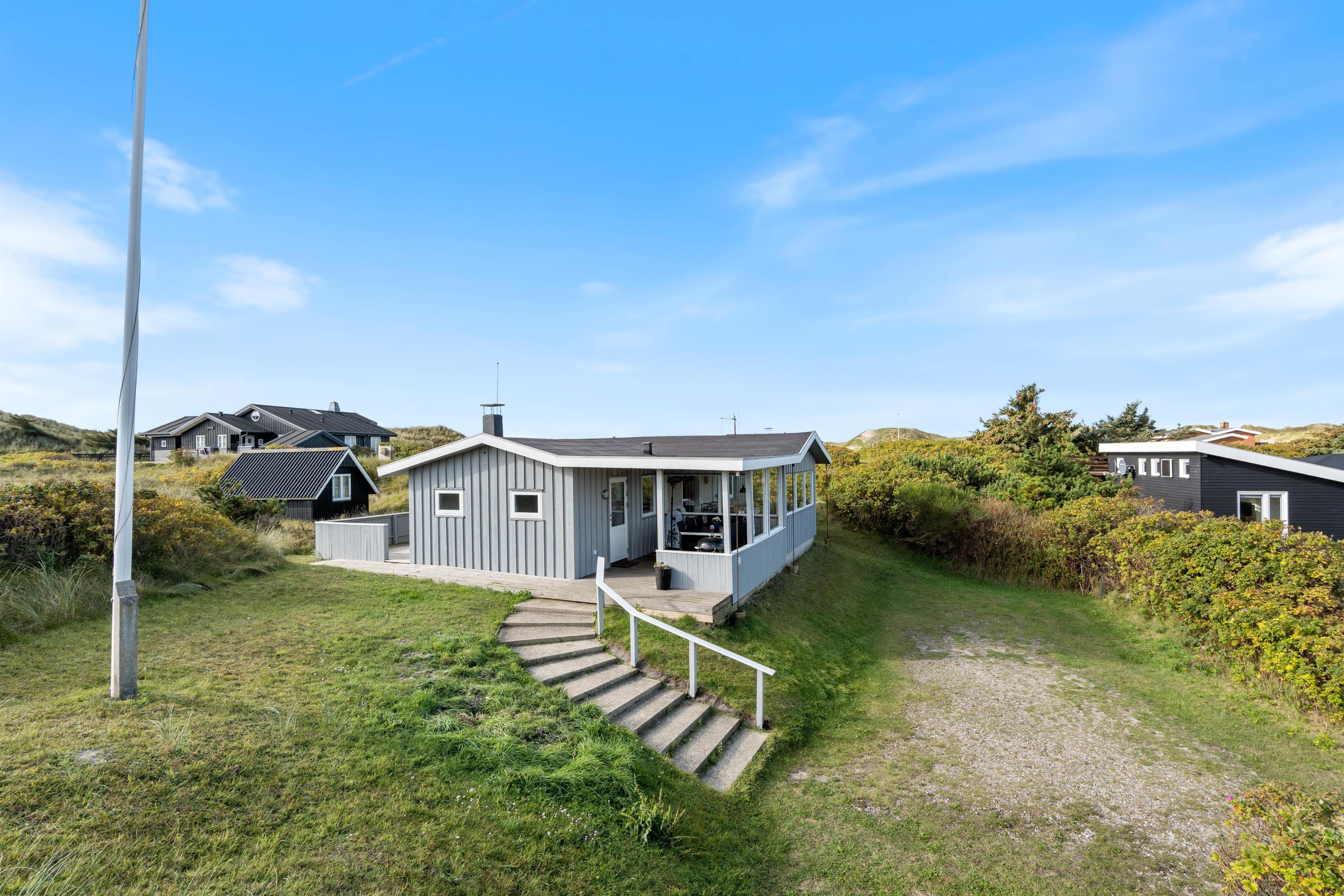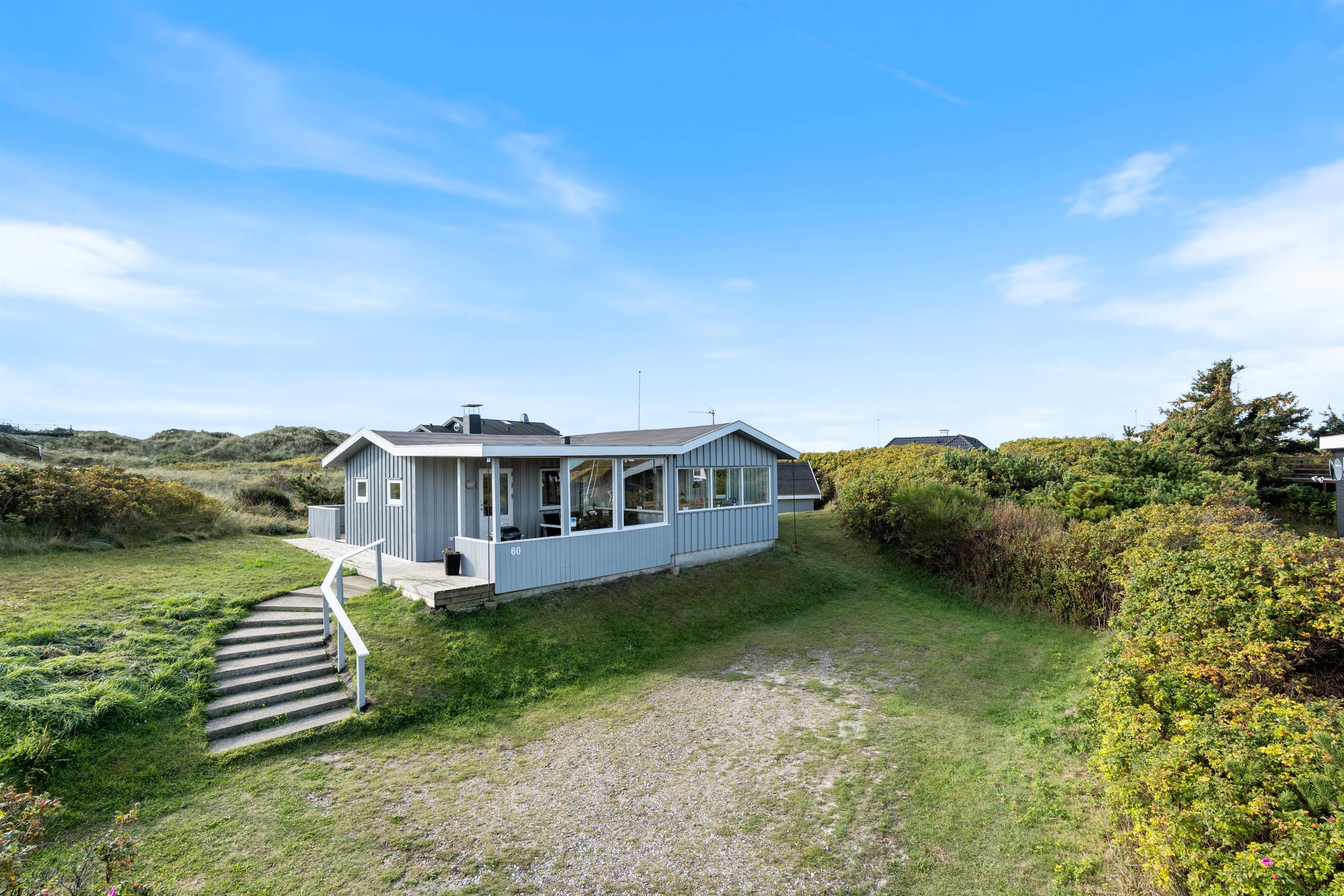 I en lomme tæt på centrum, og med kort afstand fra det brusende Vesterhav, ligger dette charmerende og hyggelige højtbeliggende sommerhus med en fantastisk udsigt ud på feriehusområdet. Sommerhuset har ferieadressen Nordsøvej 60 og ligger på en skøn klitgrund, hvorfra der er direkte sti ned mod stranden. Det er derfor utroligt nemt og hurtigt for jer, at komme ned til stranden, især fordi stranden kun ligger 250 meter væk.