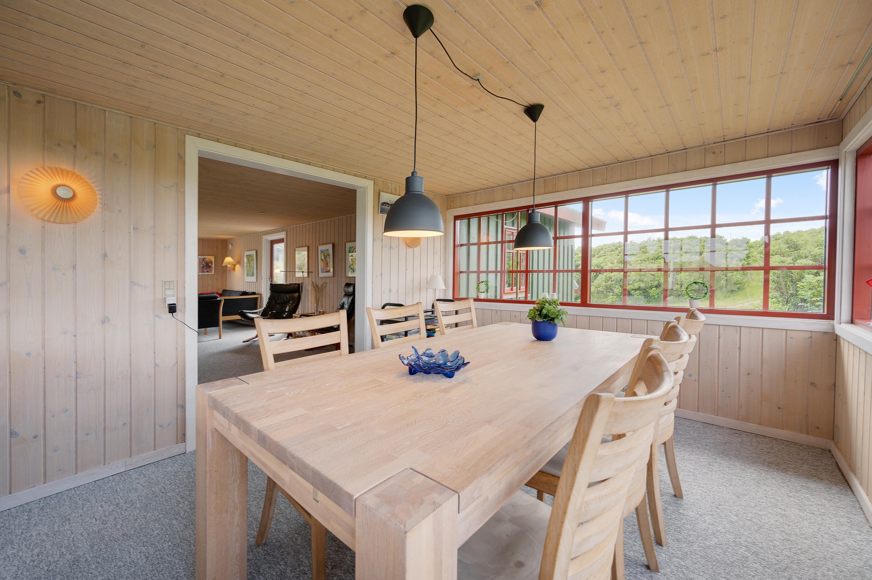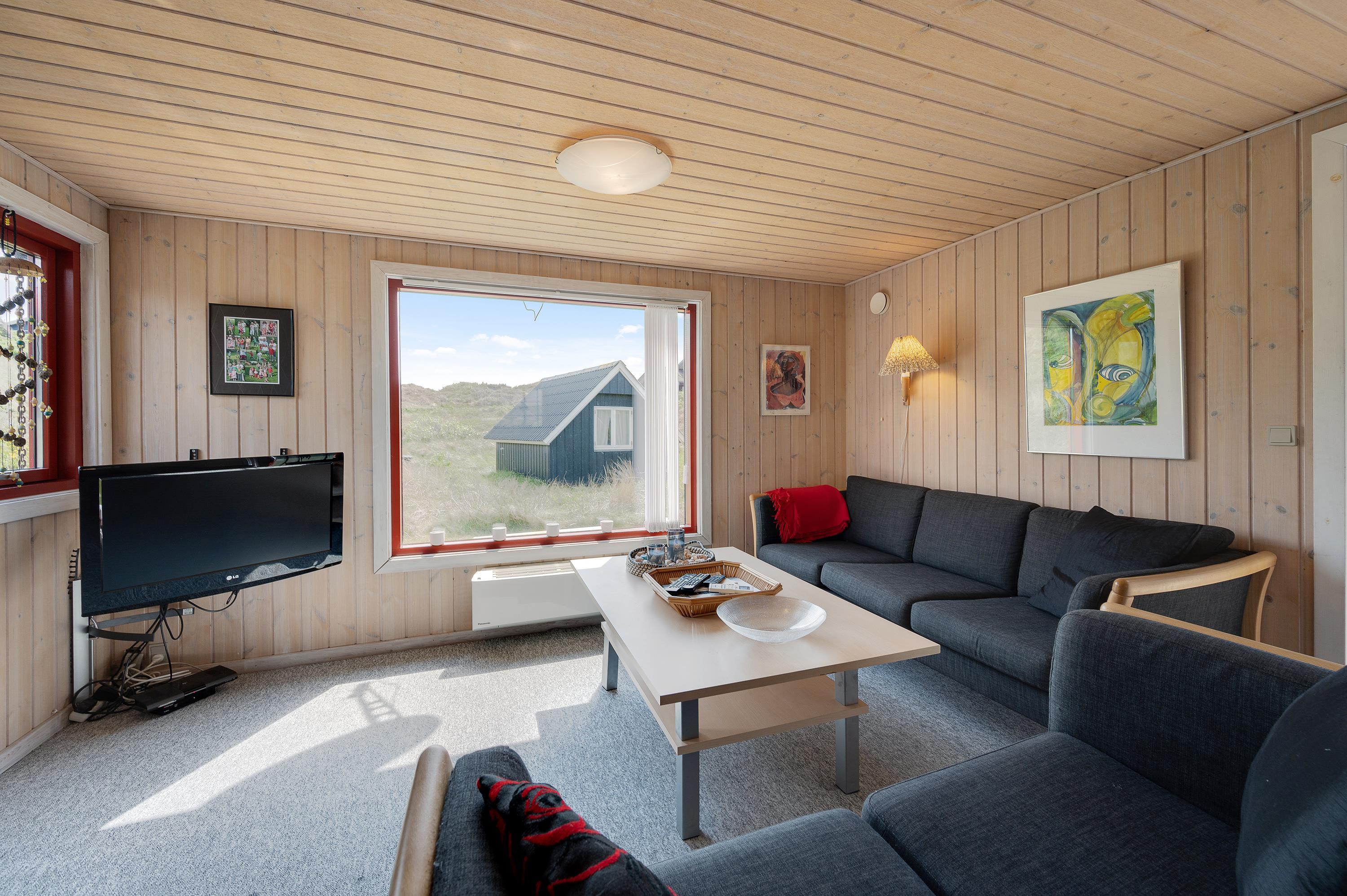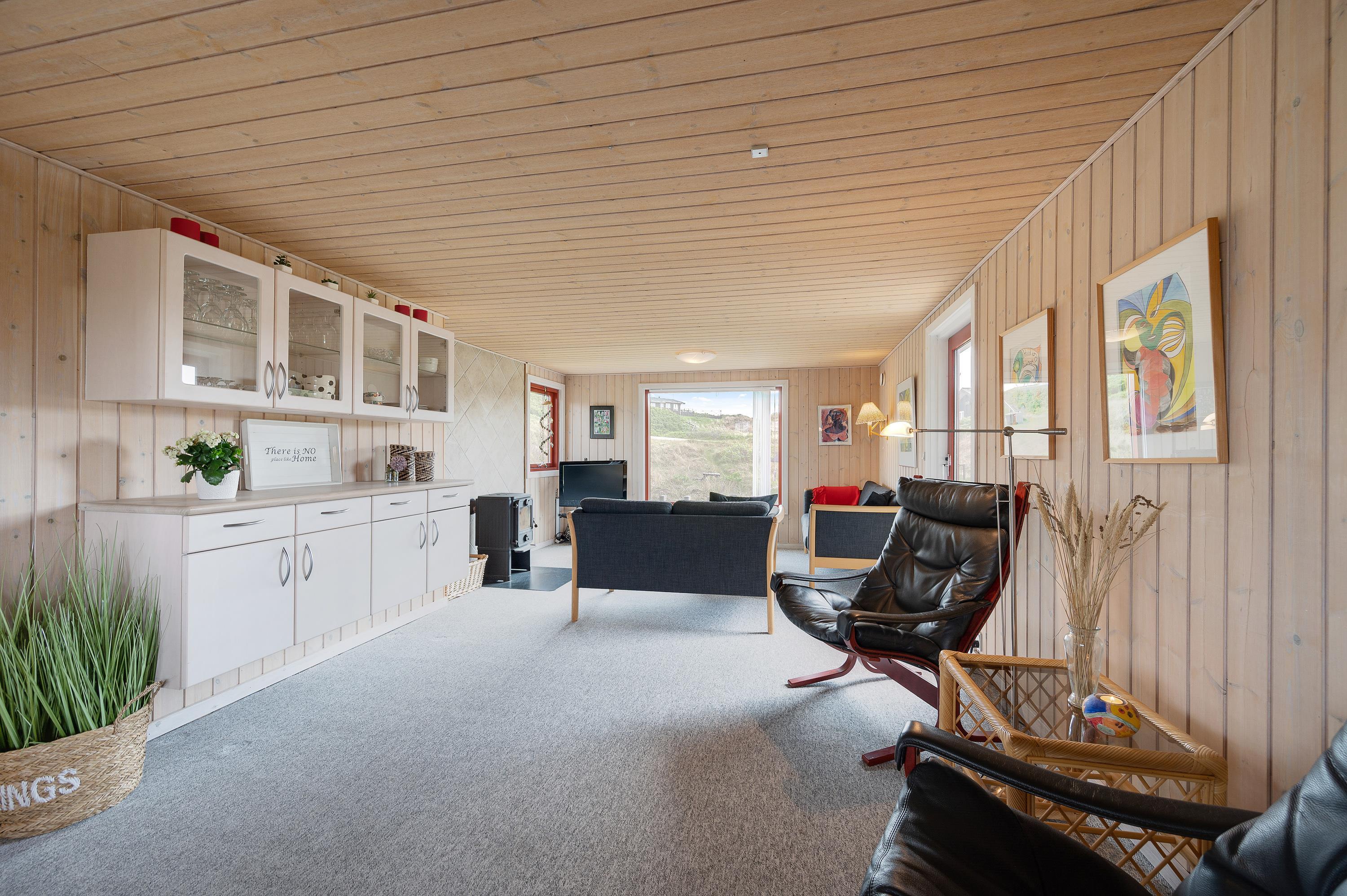 Hvor end I kigger hen er der hyggelige omgivelser og en rar atmosfære, og det er derfor et sommerhus med en masse sjæl. Sommerhuset er hyggeligt indrettet med to gode stuer og en mindre køkkenafdeling. Fra den nordvendte stue kan I nyde panoramaudsigten mod Søndervig centrum og opleve solnedgangen bag klitrækkerne. Og i den nordvendte stue finder I et hyggeligt hjørne med pæne møbler, brændeovn og fladskærms-tv, hvor familien om aftenen kan samles om en god film.