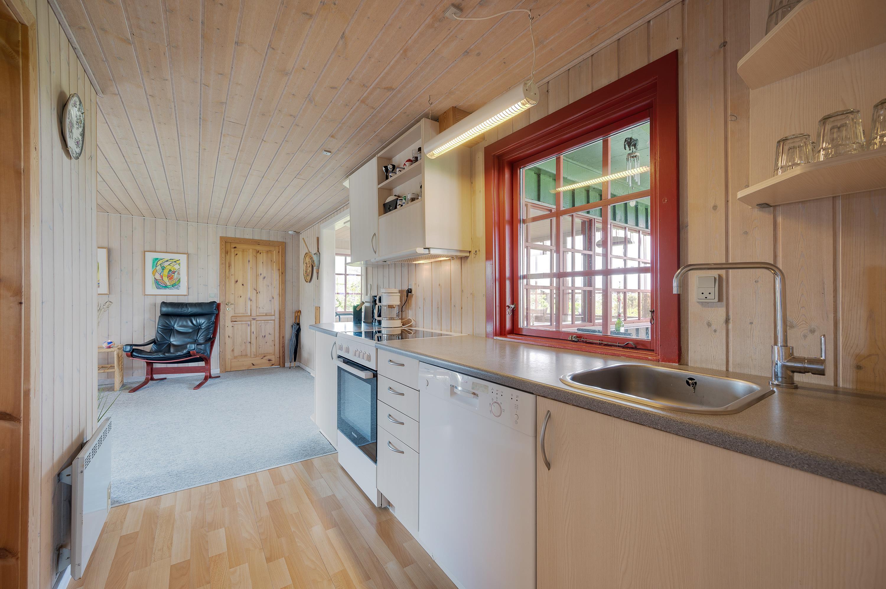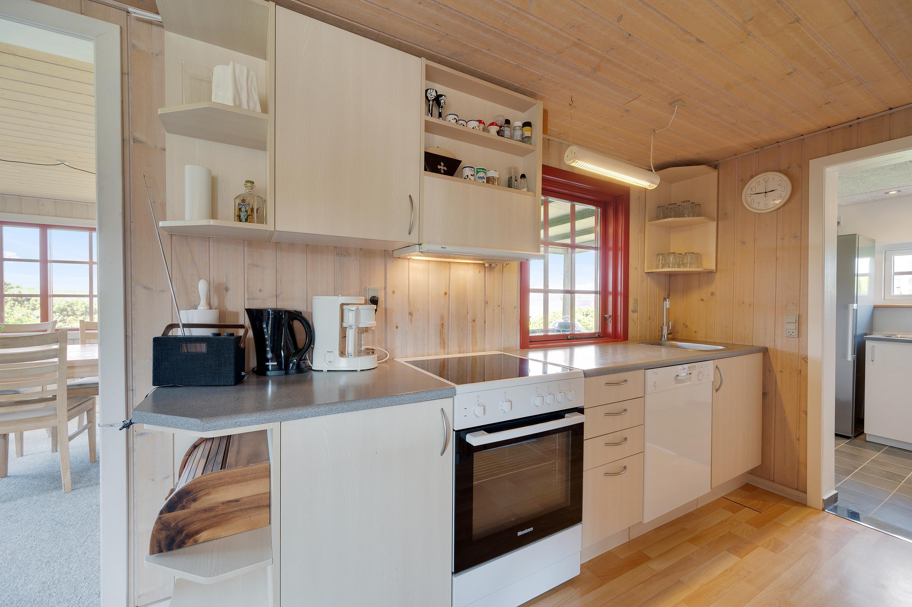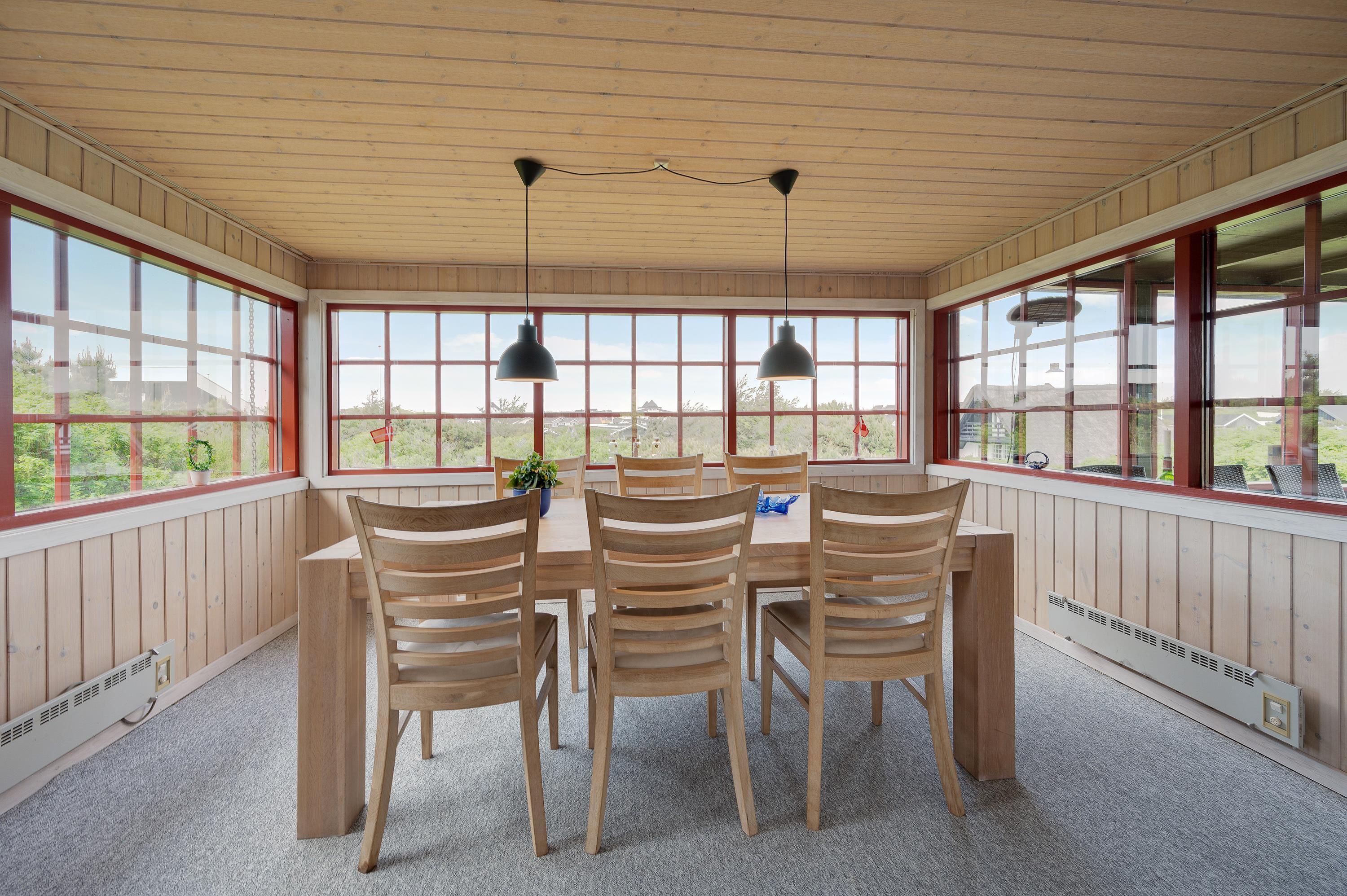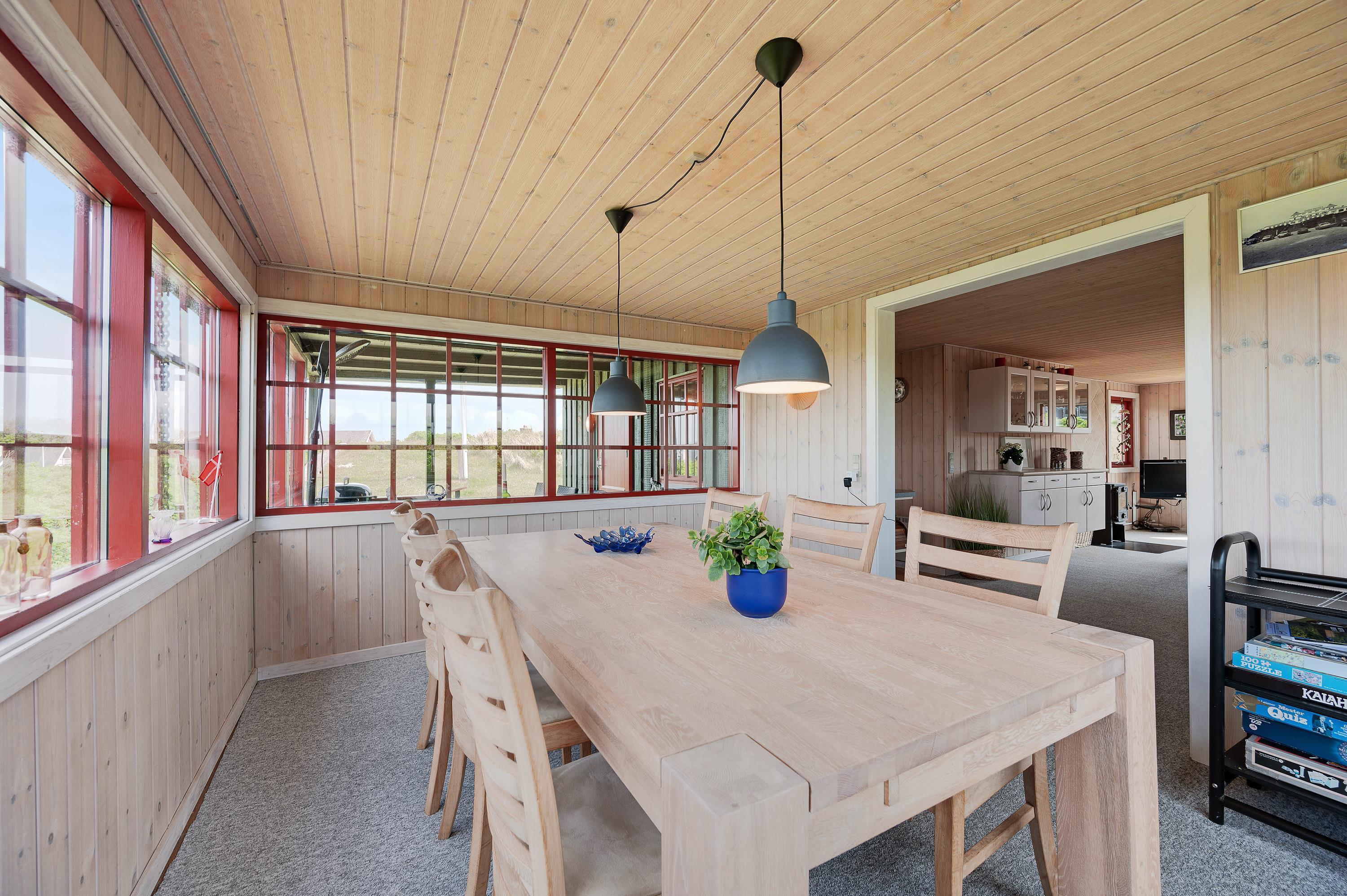 Hvor end I kigger hen er der hyggelige omgivelser og en rar atmosfære, og det er derfor et sommerhus med en masse sjæl. Sommerhuset er hyggeligt indrettet med to gode stuer og en mindre køkkenafdeling. Fra den nordvendte stue kan I nyde panoramaudsigten mod Søndervig centrum og opleve solnedgangen bag klitrækkerne. Og i den nordvendte stue finder I et hyggeligt hjørne med pæne møbler, brændeovn og fladskærms-tv, hvor familien om aftenen kan samles om en god film.