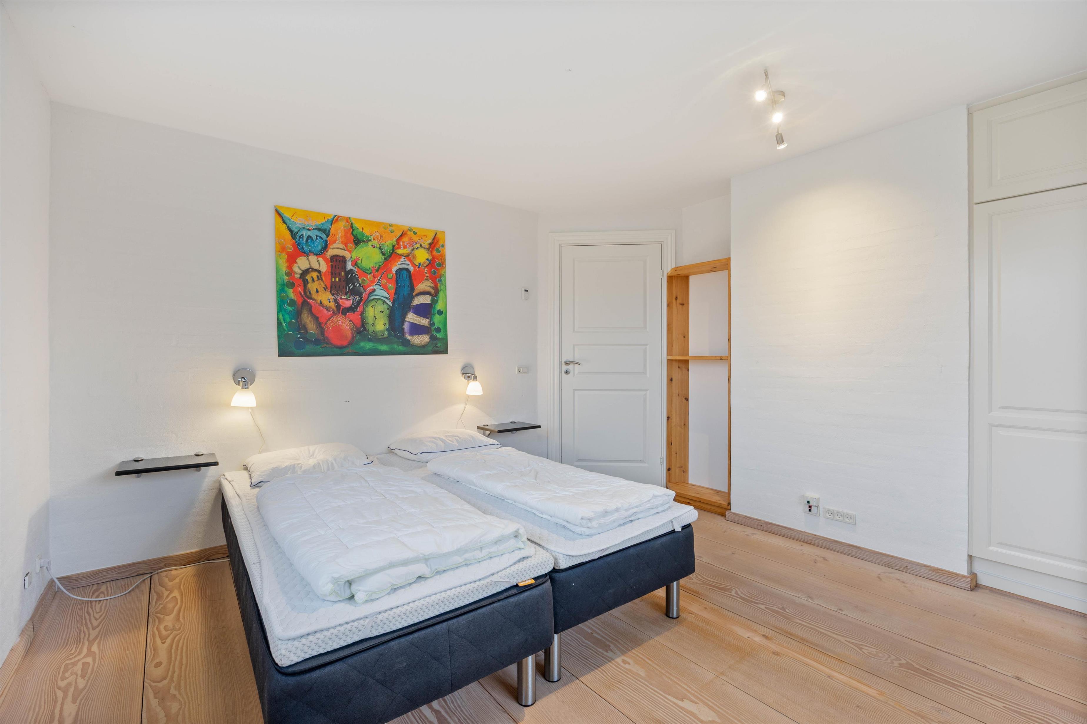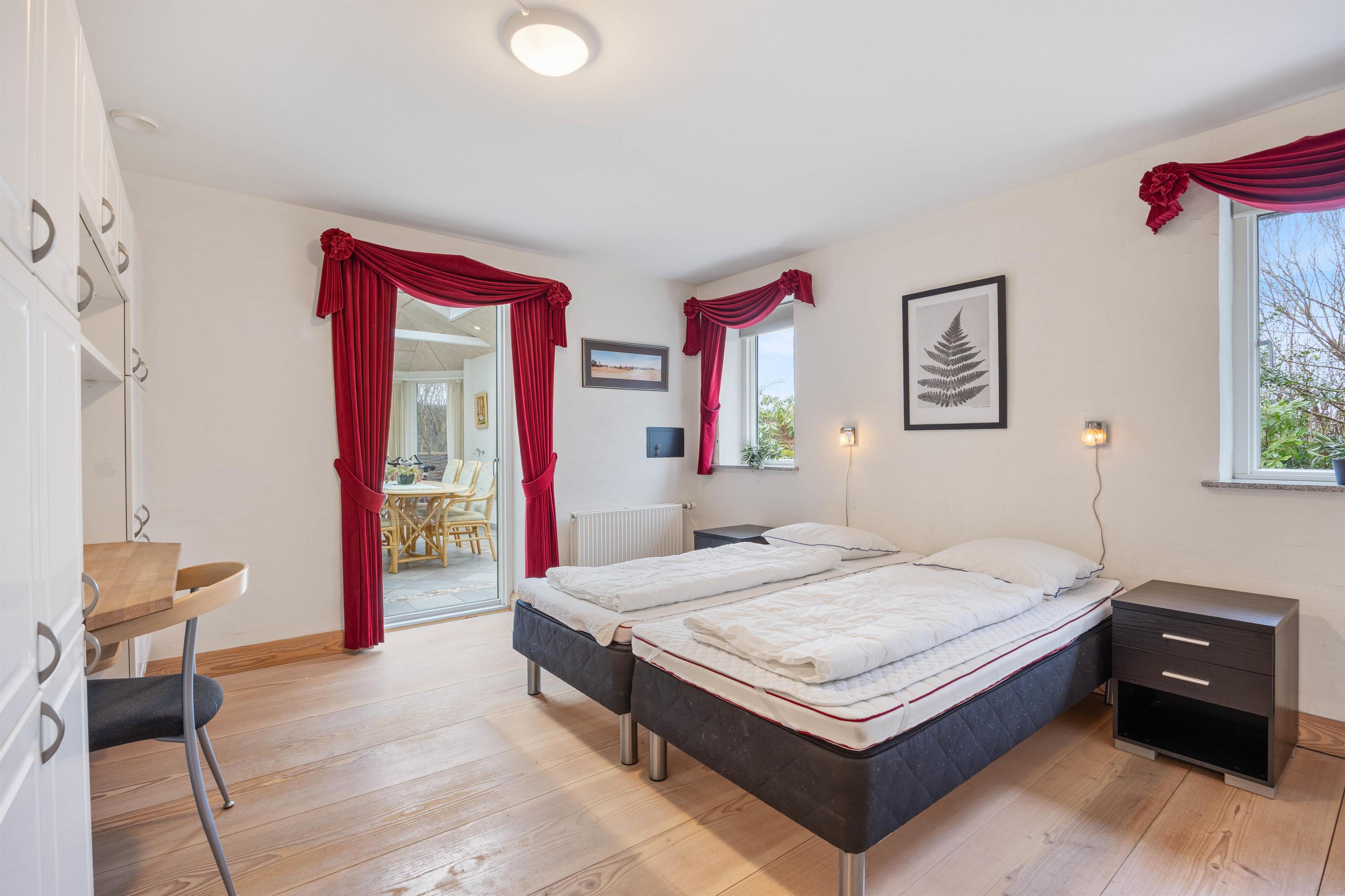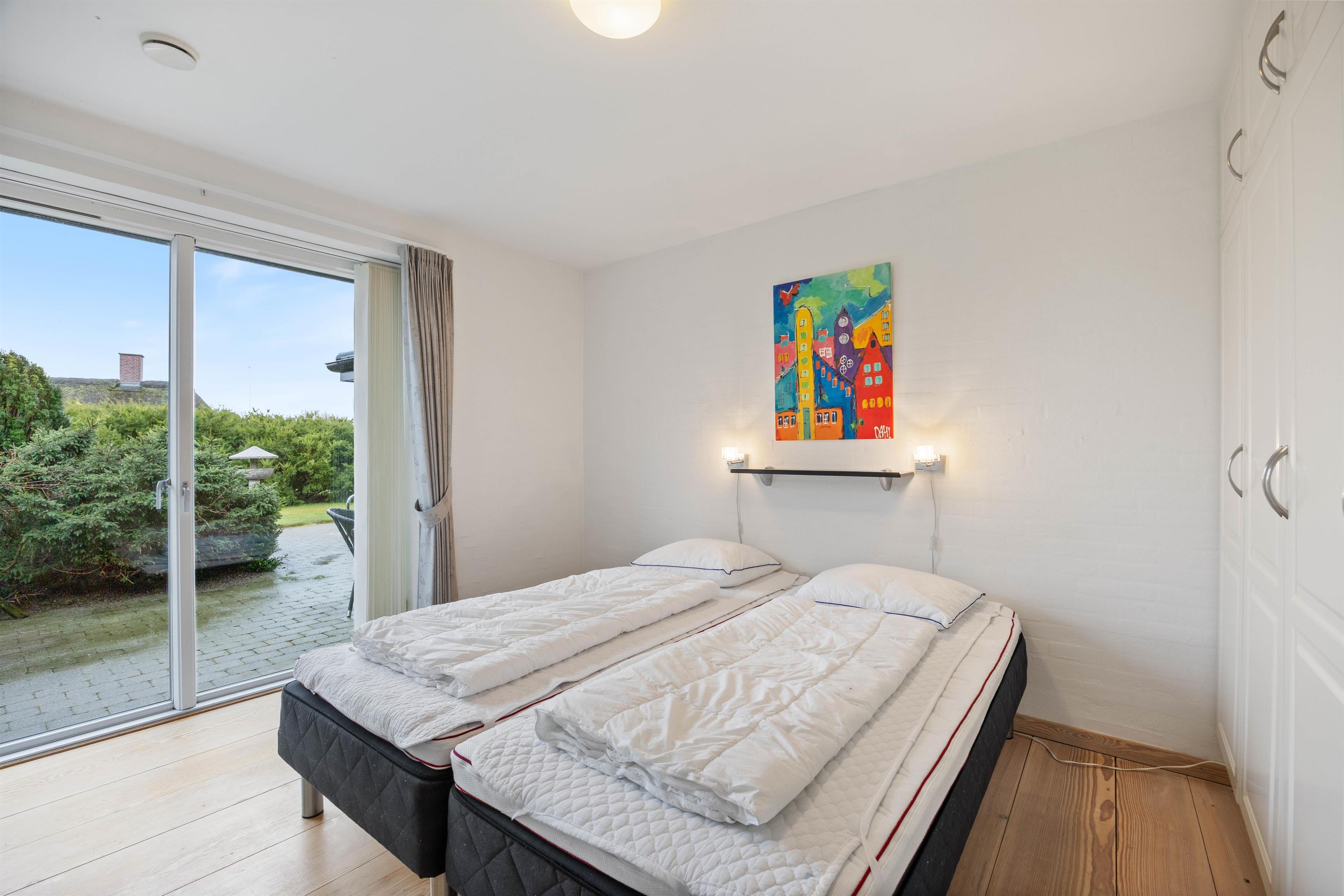 Sommerhuset er indrettet med 4 soverum, hvor I finder 3 dobbeltsenge og 2 enkeltsenge samt 2 badeværelser med gulvvarme. I entréen er der desuden en vaskemaskine og en tørretumbler, som I frit kan benytte jer af.