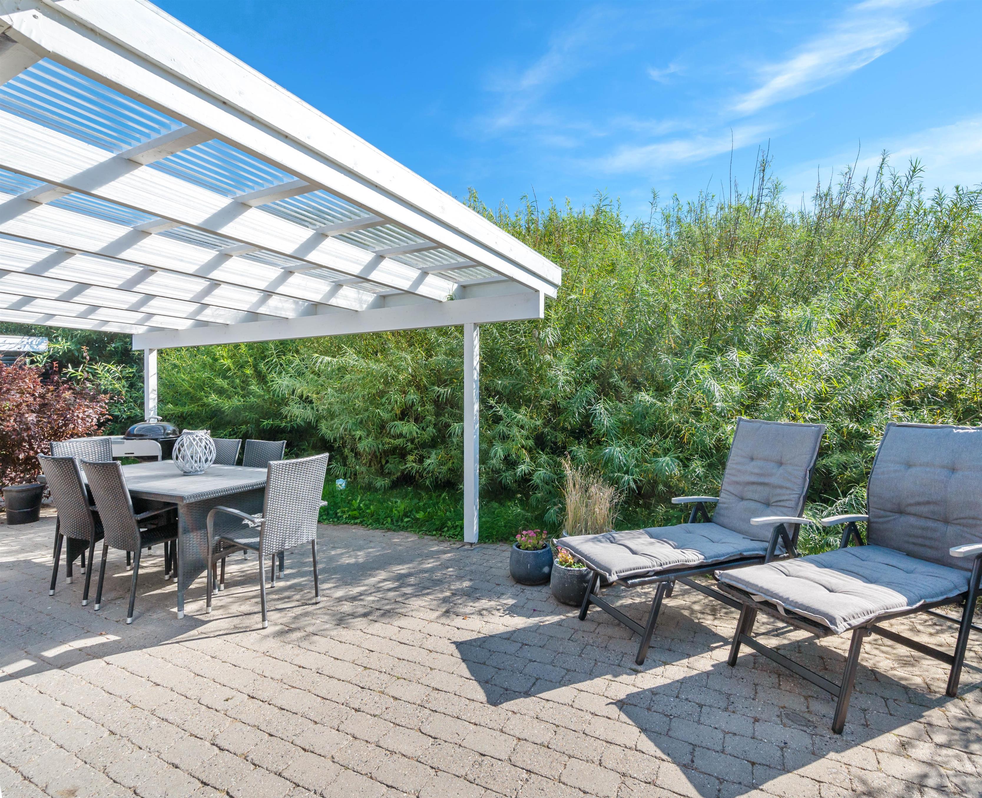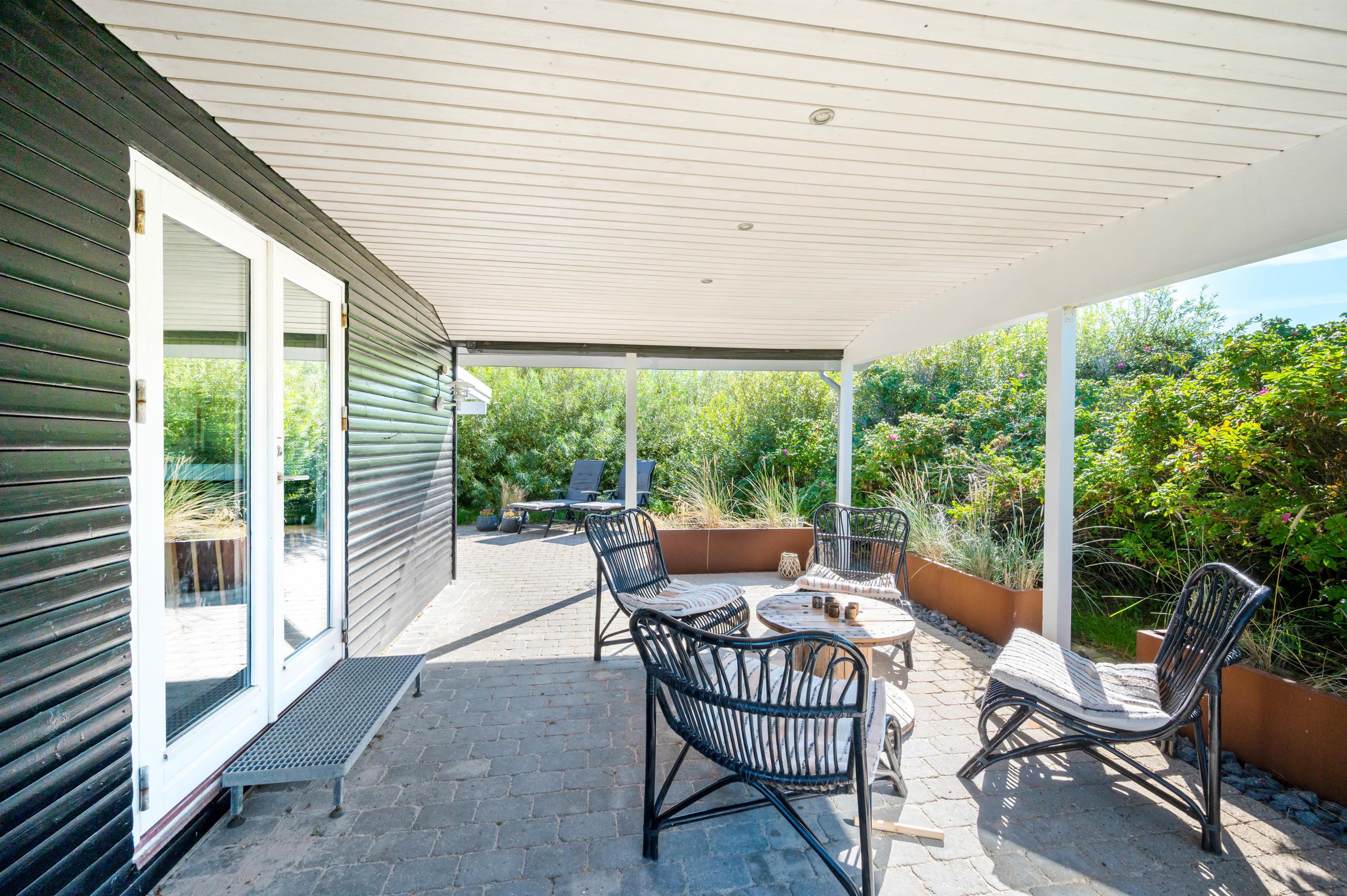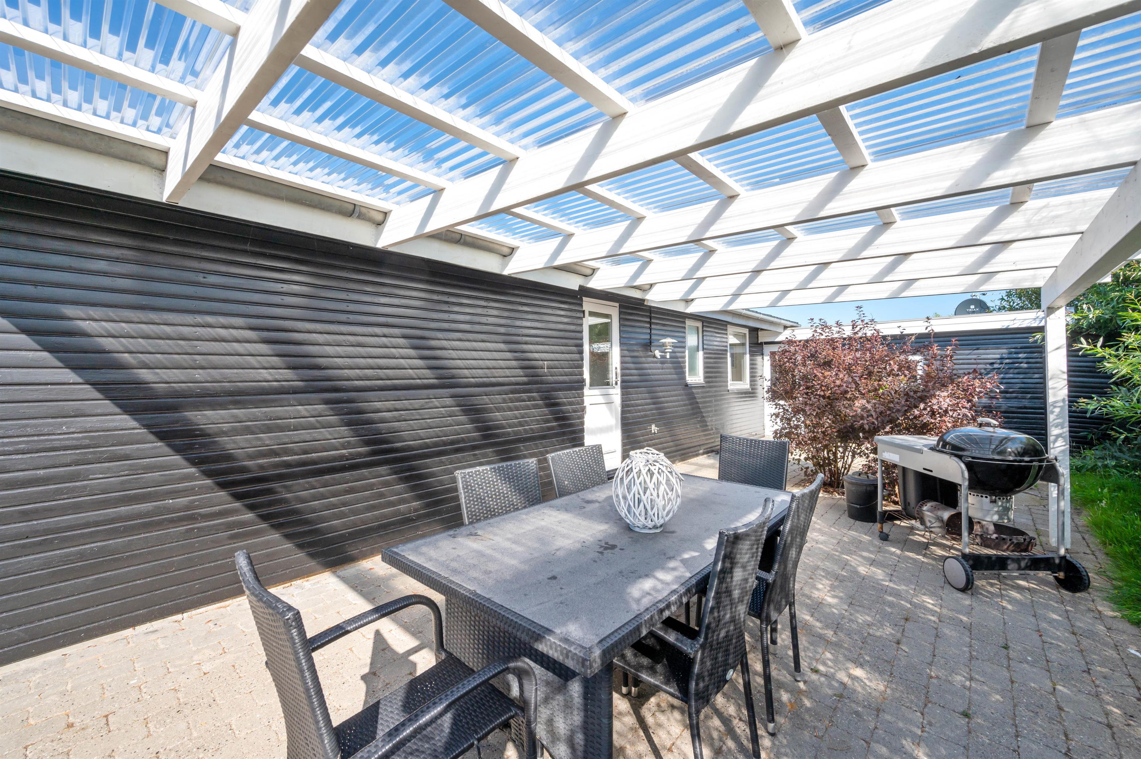 På den afskærmede og delvist overdækkede terrasse, der omgiver sommerhuset, kan I nyde jeres ferie udendørs i de liggestole og havemøbler, I har til rådighed. Her kan I også finde grillen frem og tilbringe de lune sommeraftener med lækker mad, kølige drikkevarer og godt selskab.