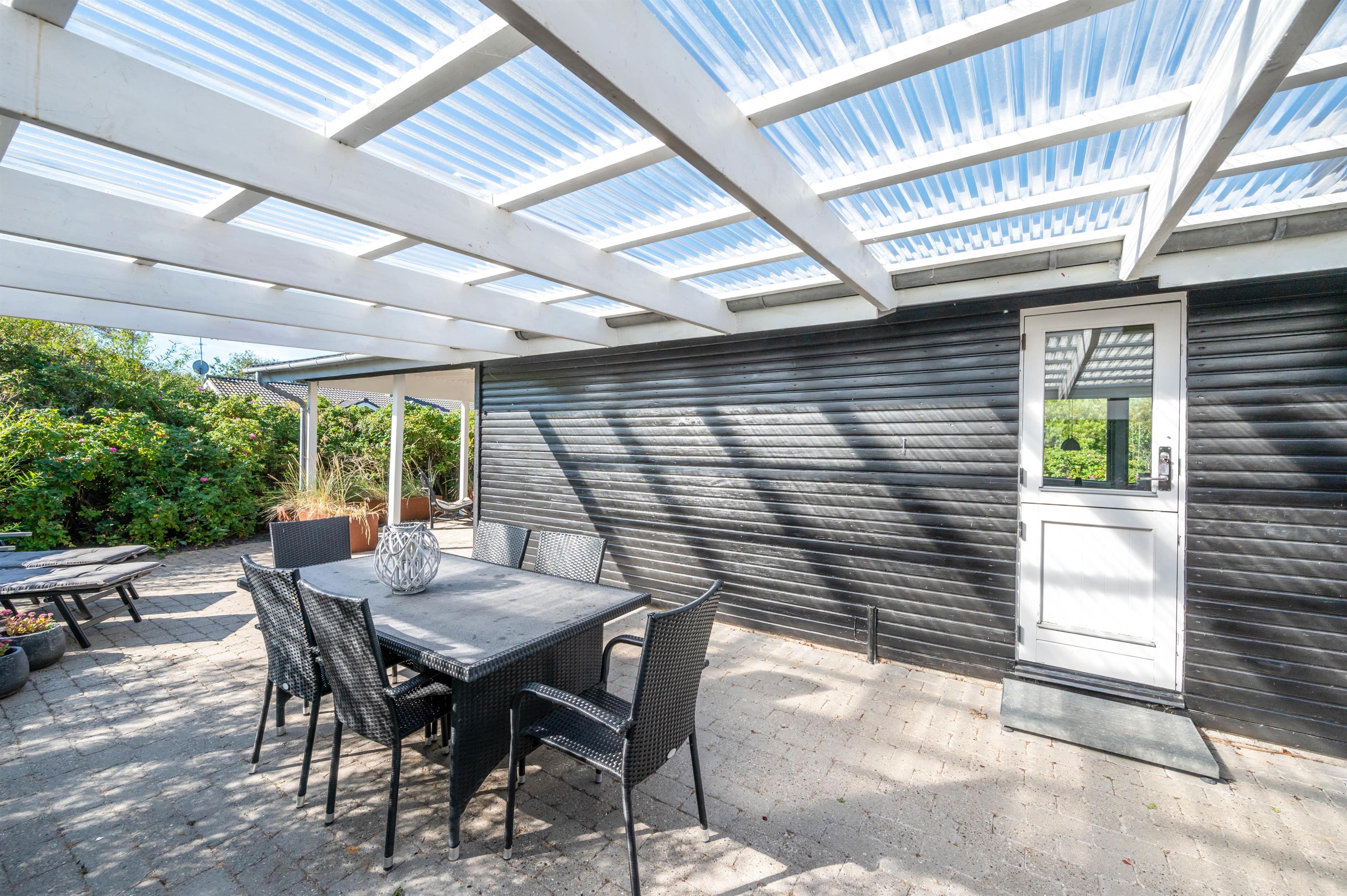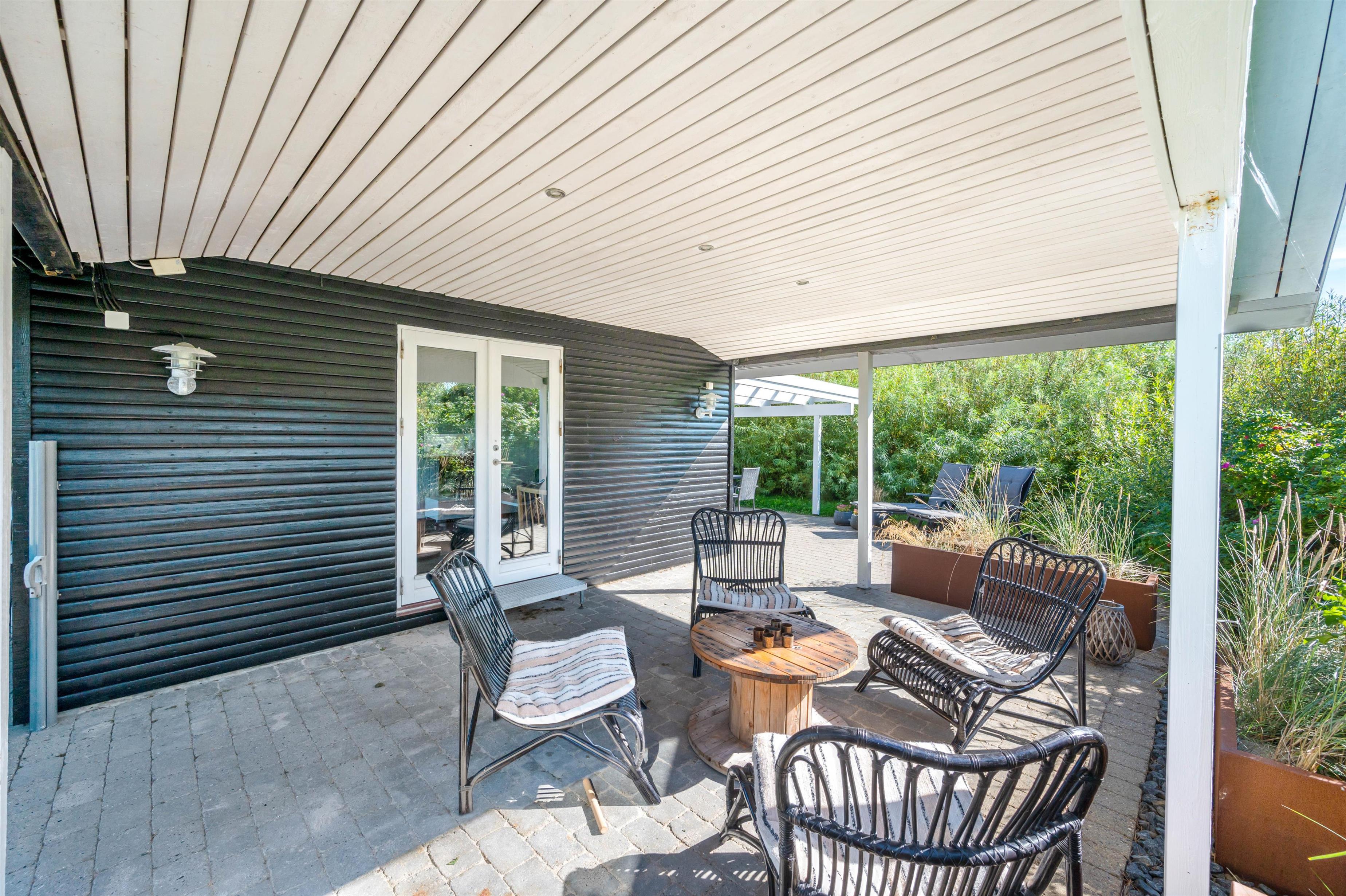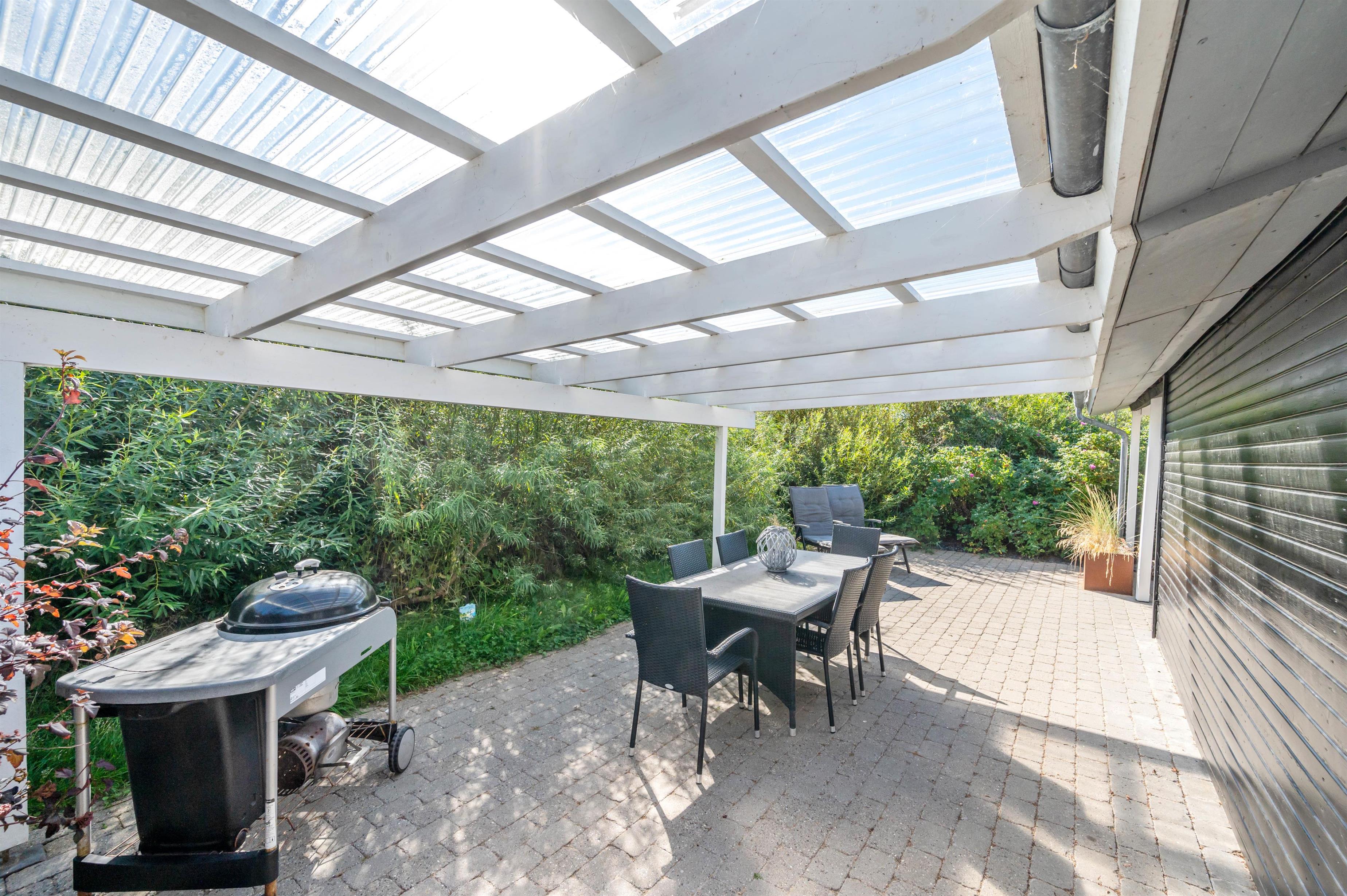 På den afskærmede og delvist overdækkede terrasse, der omgiver sommerhuset, kan I nyde jeres ferie udendørs i de liggestole og havemøbler, I har til rådighed. Her kan I også finde grillen frem og tilbringe de lune sommeraftener med lækker mad, kølige drikkevarer og godt selskab.
