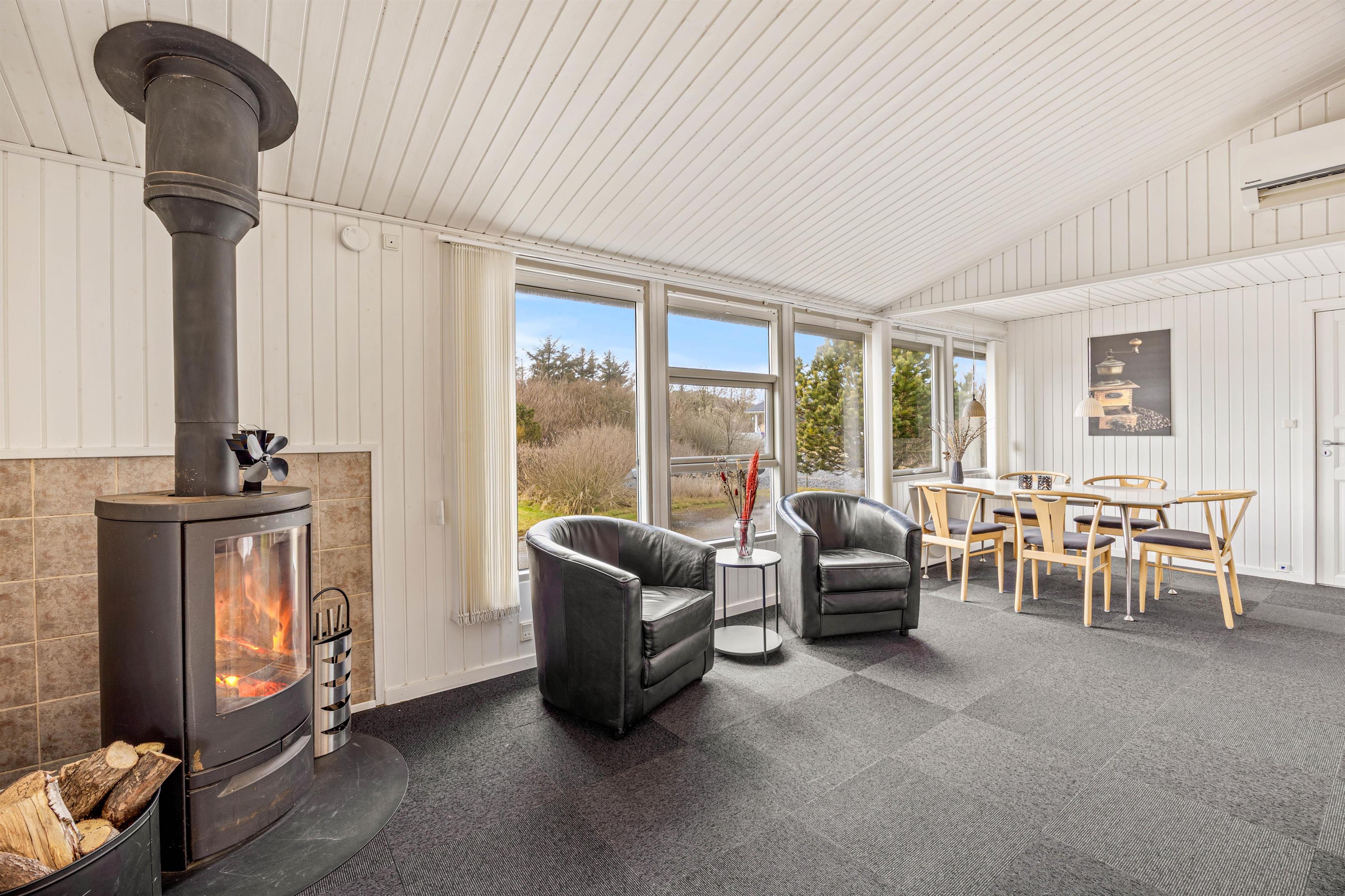 En energivenlig varmepumpe sørger for temperaturerne også i sommerhuset, men I kan også tænde op i brændeovnen, der både skruer op for varmen og feriestemningen, når I er samlet i opholdsrummet til skønne stunder med film - der findes Apple tv og chromecast i huset -, spil, mad og ikke mindst masser af hygge.