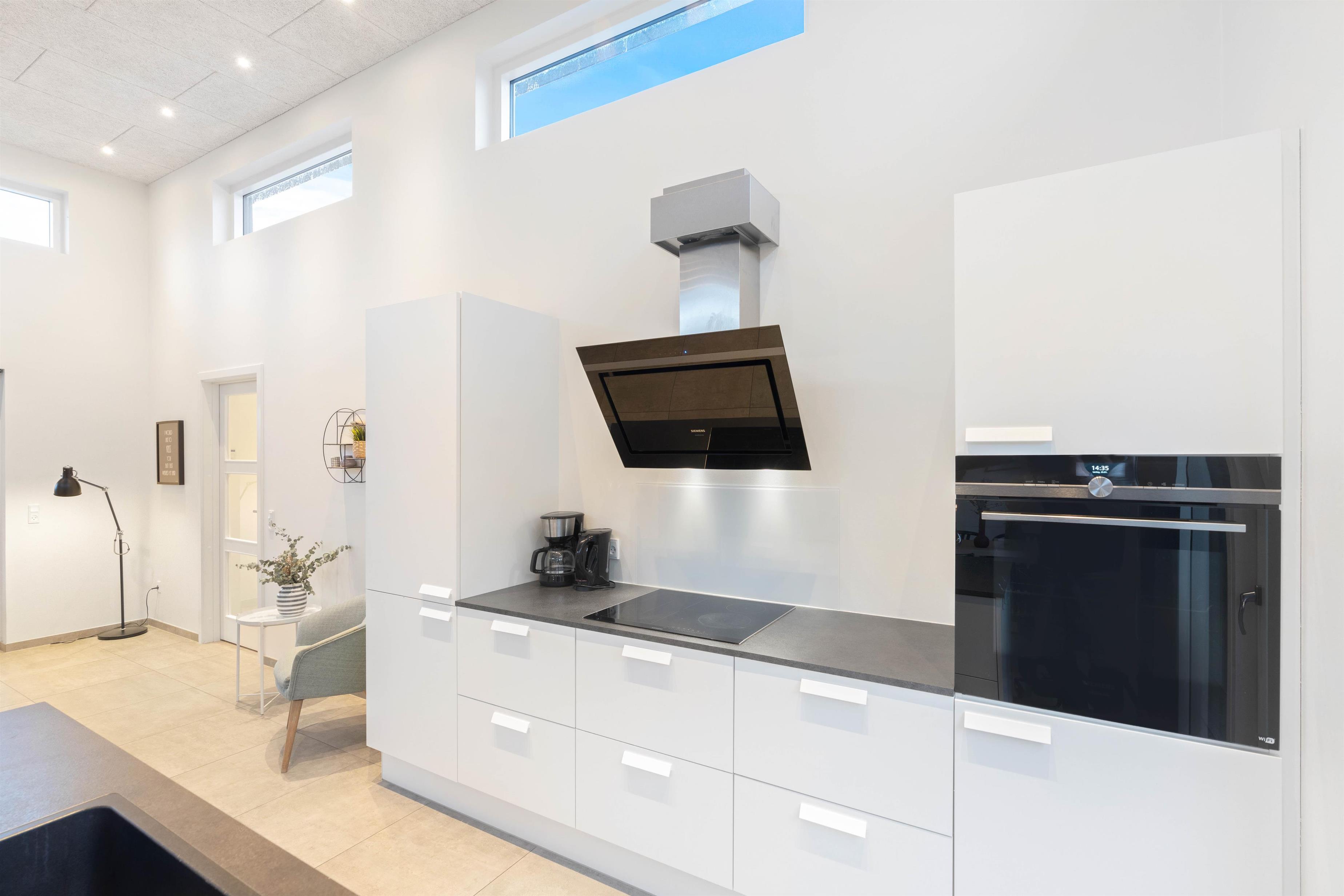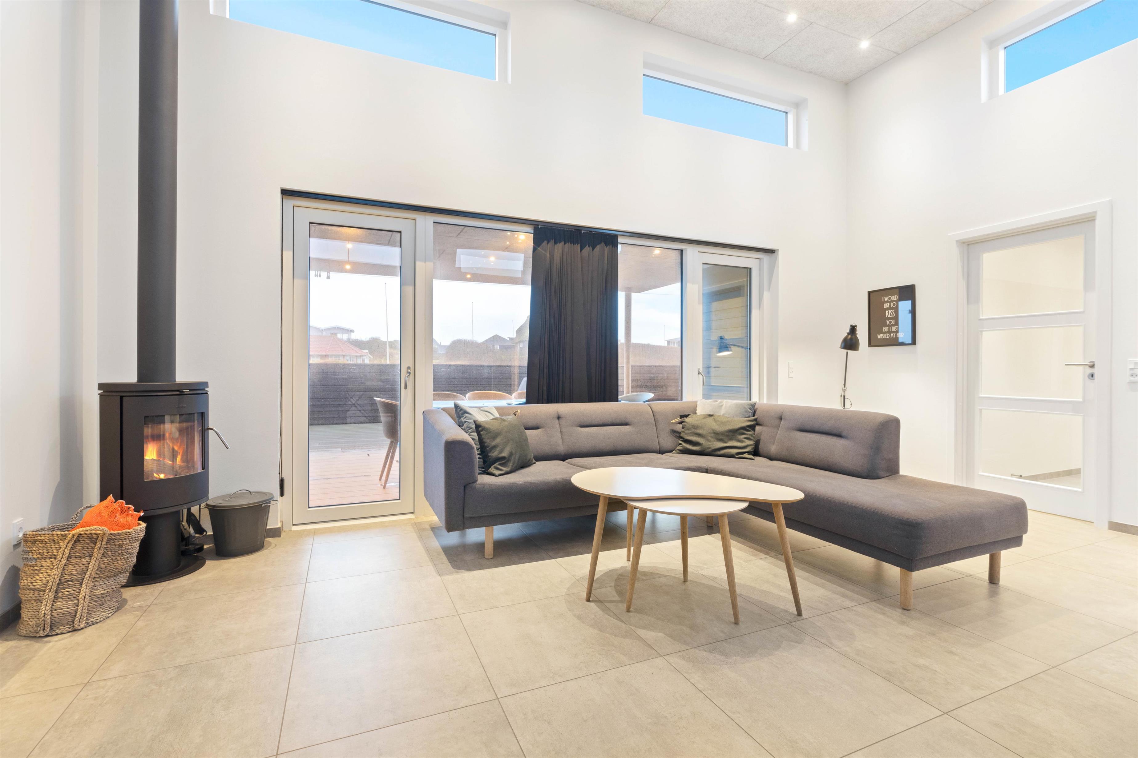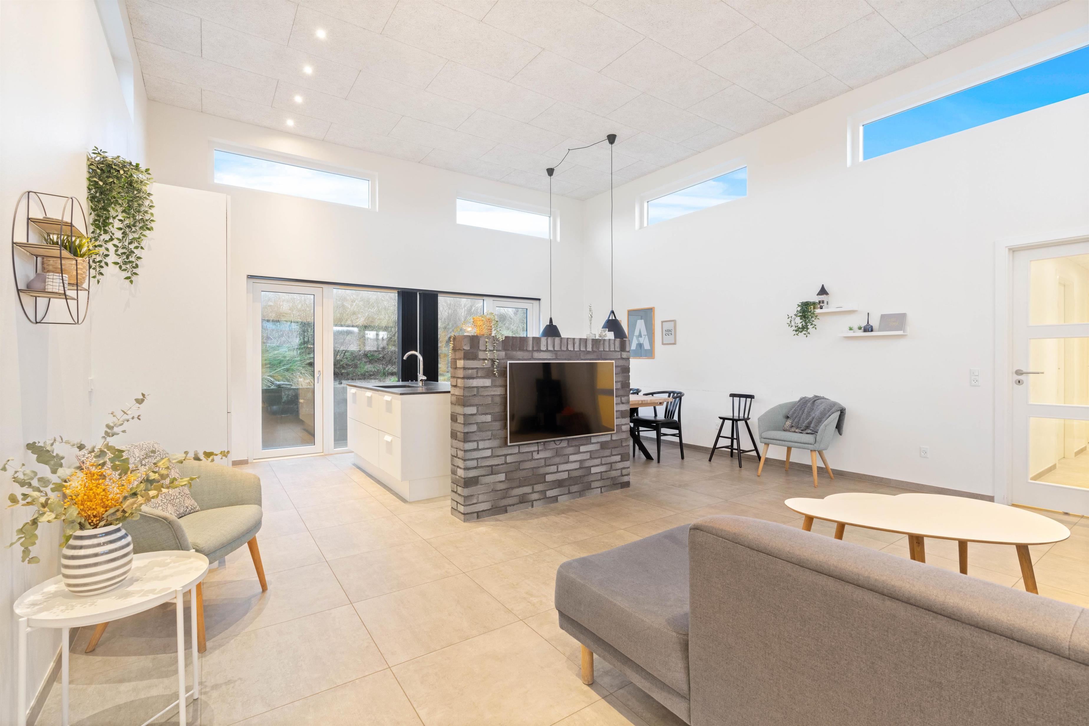 Køkkenet står i åben forbindelse med opholdsstuen, og her kan hele familien samles til et godt måltid eller foran den varme brændeovn. Yderligere har sommerhuset et poolbord, som I frit kan benytte jer af og internet, hvis I vil streame en god film på sommerhusets fladskærms-tv.