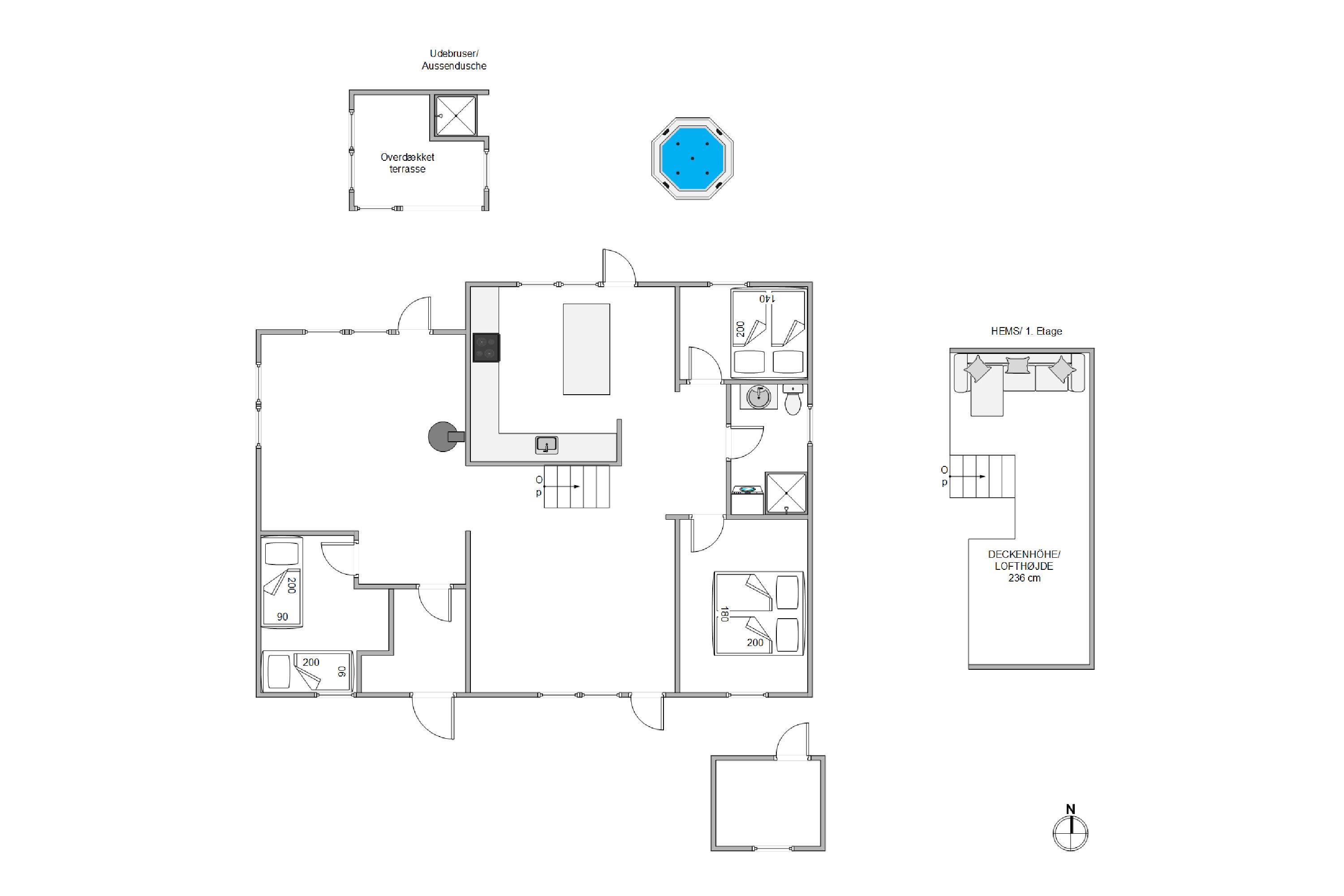 Med højt til loftet og store vinduer, der giver et kig til Søndervigs klitter, er der skabt en åben atmosfære og en rummelighed der sikrer, at I med det samme falder til I jeres hjem for ferien. For at give jer flere muligheder for at slappe af, er huset udstyret med to stuer med en både i stueplan og en enkelt på husets hems. På hemsen finder I også et lille spisebord med tilhørende stole, og her vil I kunne hygge jer omkring nogle af jeres medbragte brætspil.