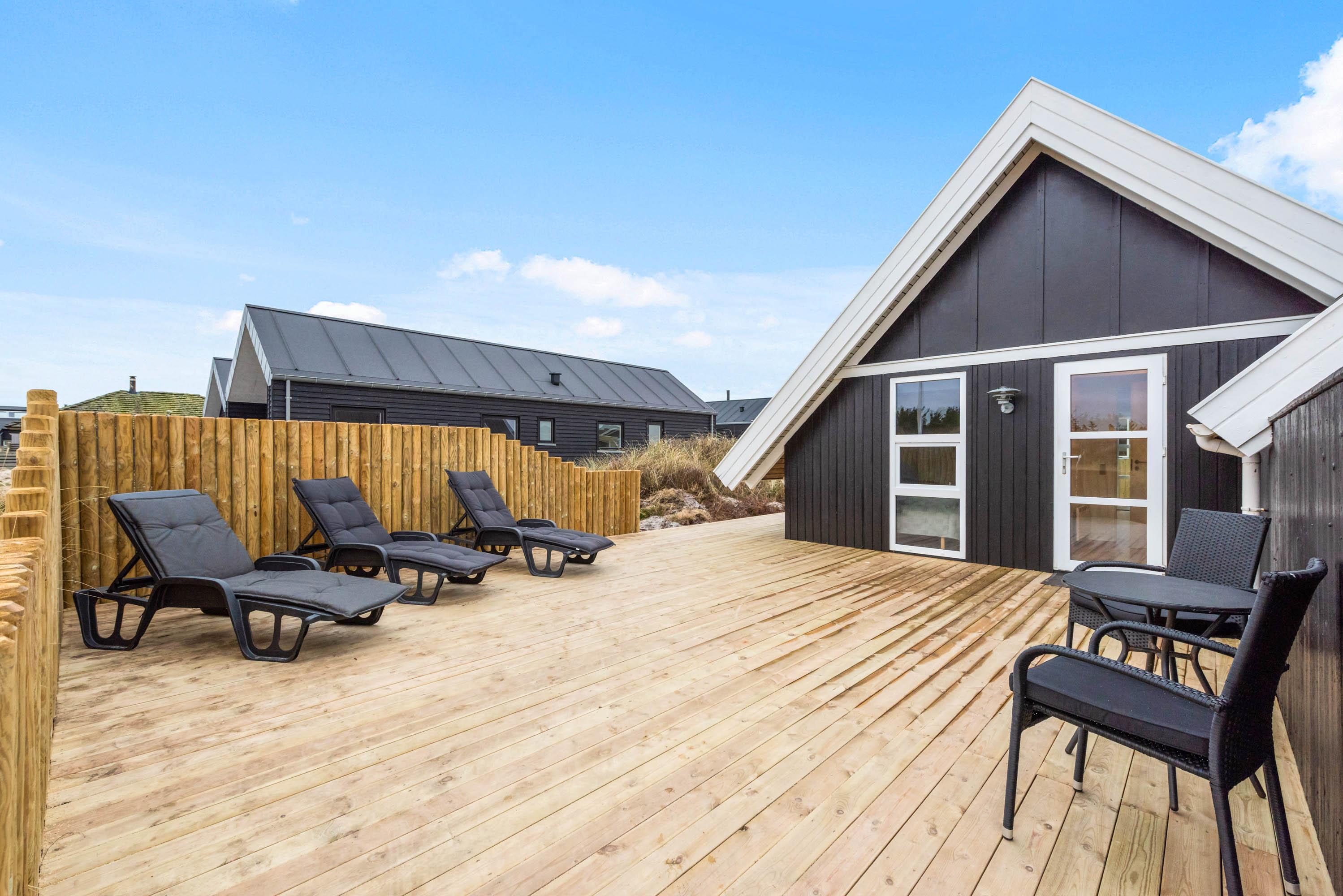 Et af feriehusets højdepunkter er den fantastiske, store træterrasse. Med både en afskærmet og overdækket del kan I nyde den friske havluft hele året rundt, og der er sørget for gode havemøbler og liggestole til jer.