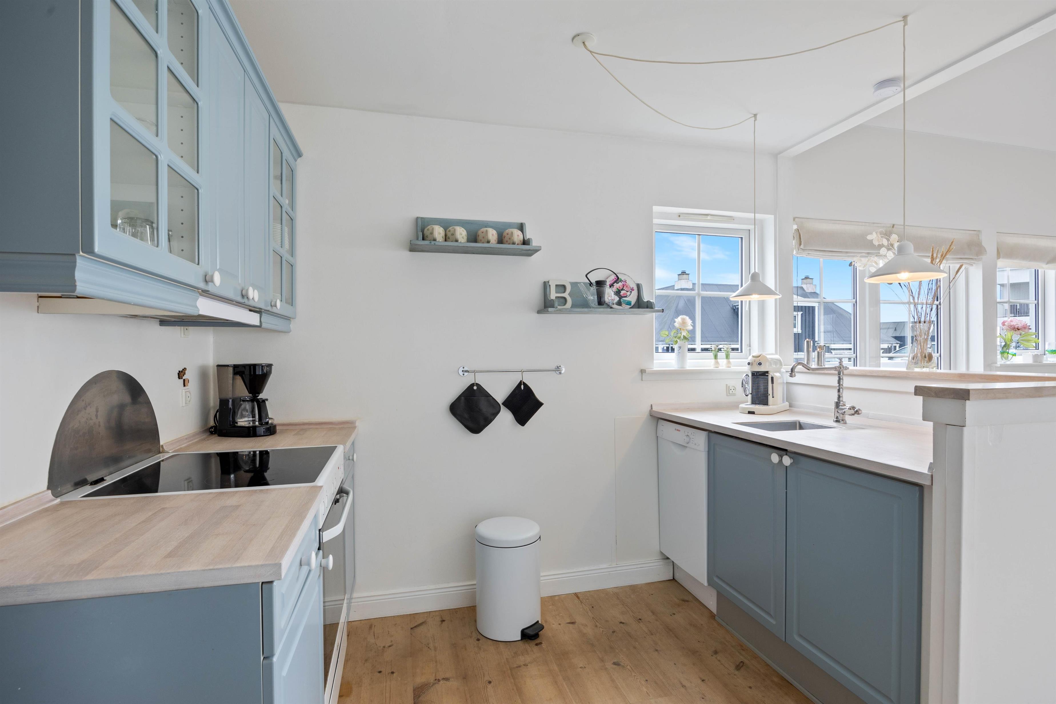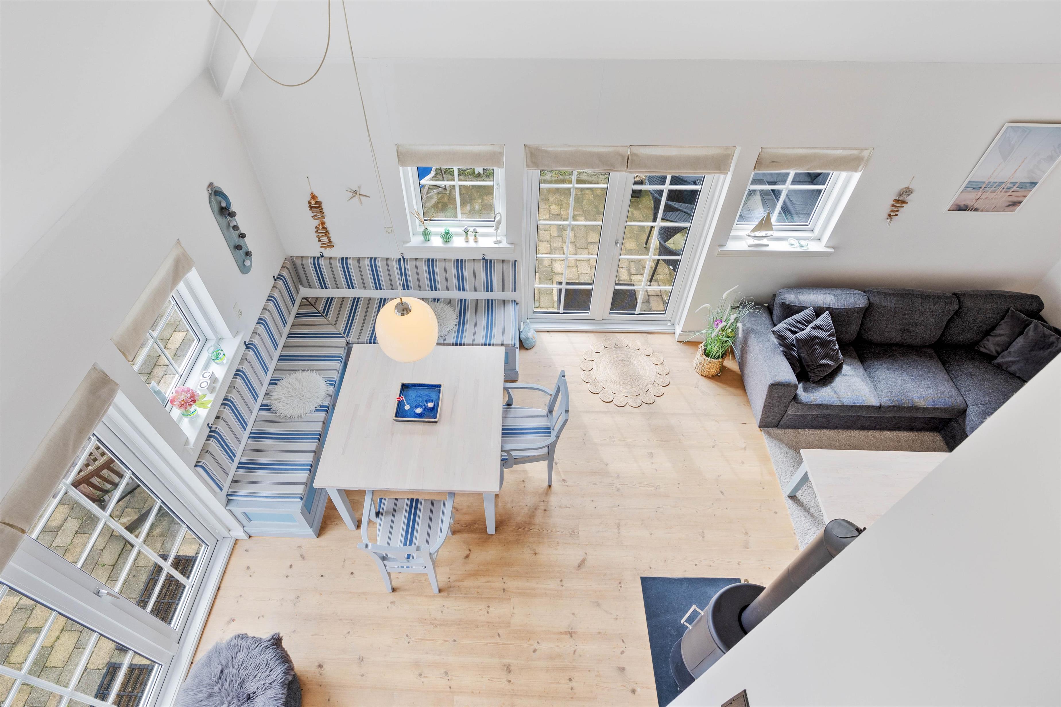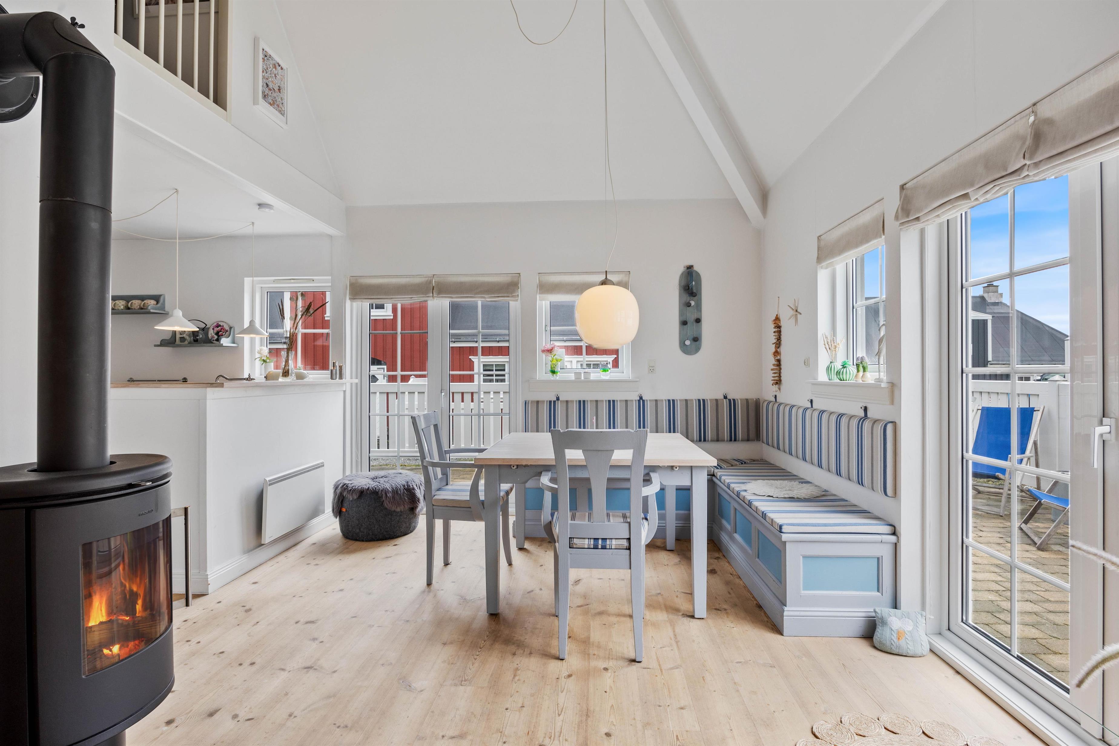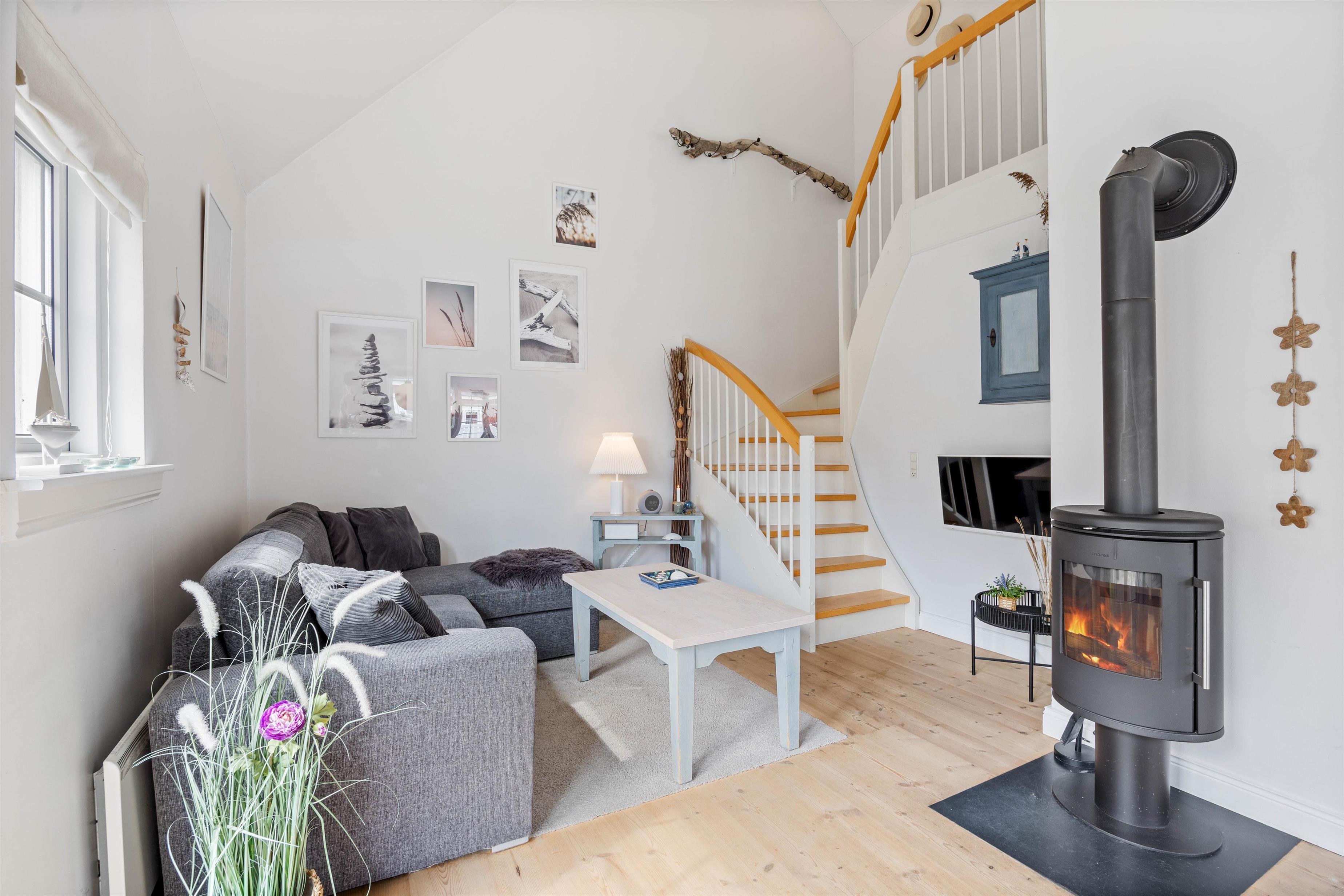 Denne hyggelige ferielejlighed er velindrettet over 2 etager. På øverste etage finder I ferielejlighedens 2 soveværelser, der hver rummer en dobbeltseng. I stuetagen finder I en sovesofa, hvor der er plads til 2 yderligere overnattende gæster. I ferielejligheden finder I en opvaskemaskine, vaskemaskine og tørretumbler, så I ikke skal bekymre jer om det huslige, imens I nyder jeres ferie. I stuen finder I også en brændeovn, som kan varme stuen op i de kolde vintermåneder og bidrager til den helt rigtige stemning.
