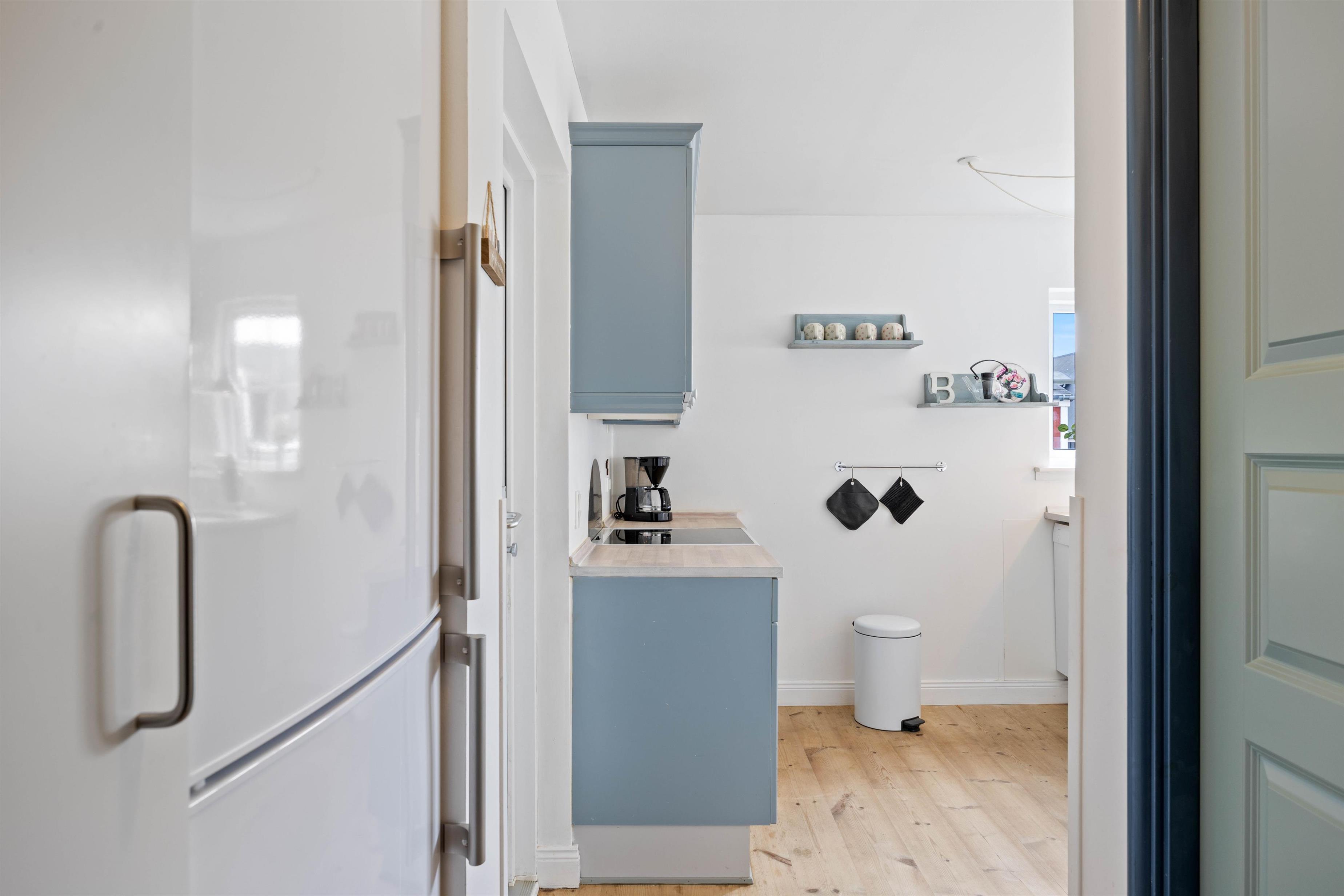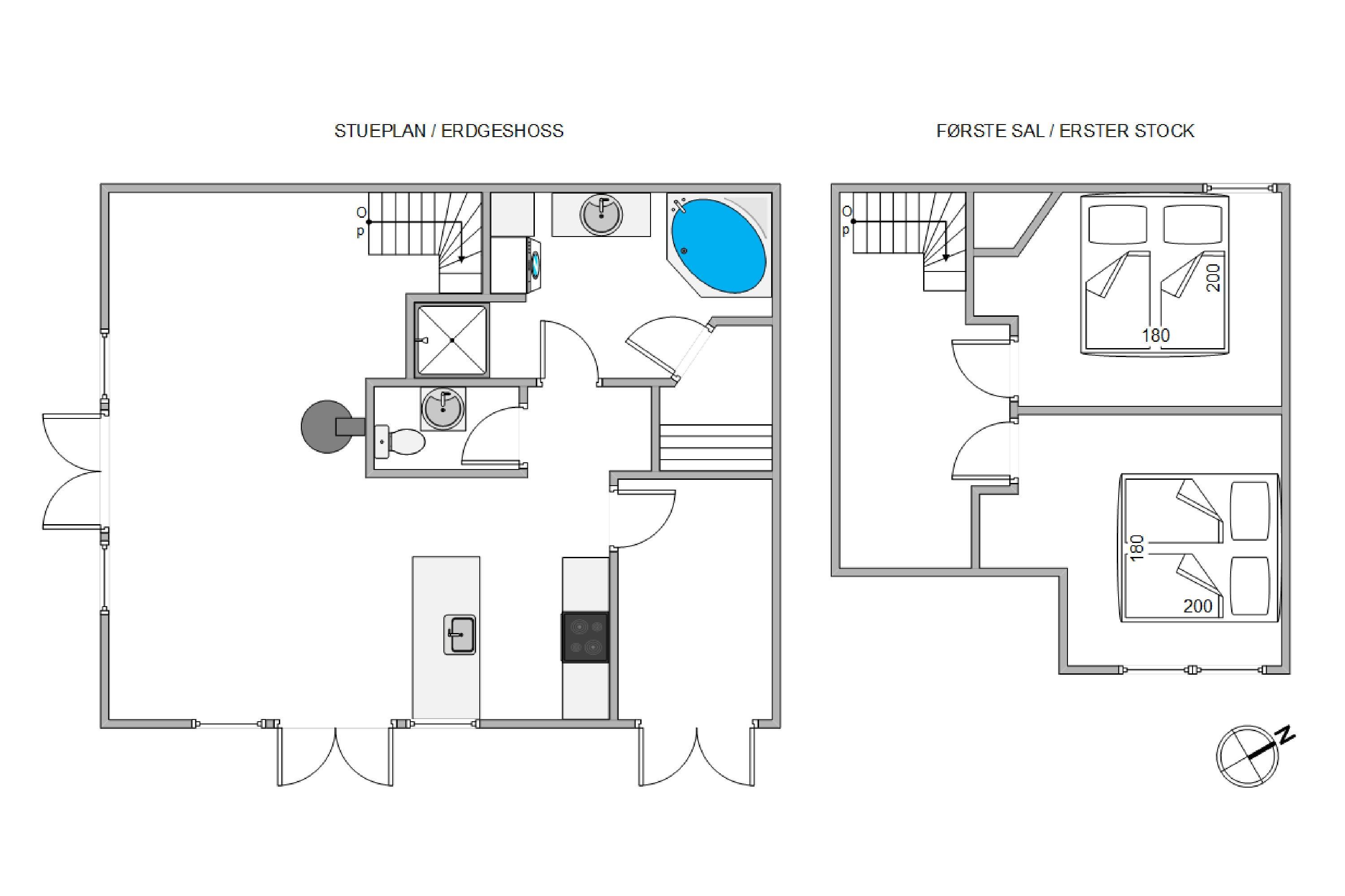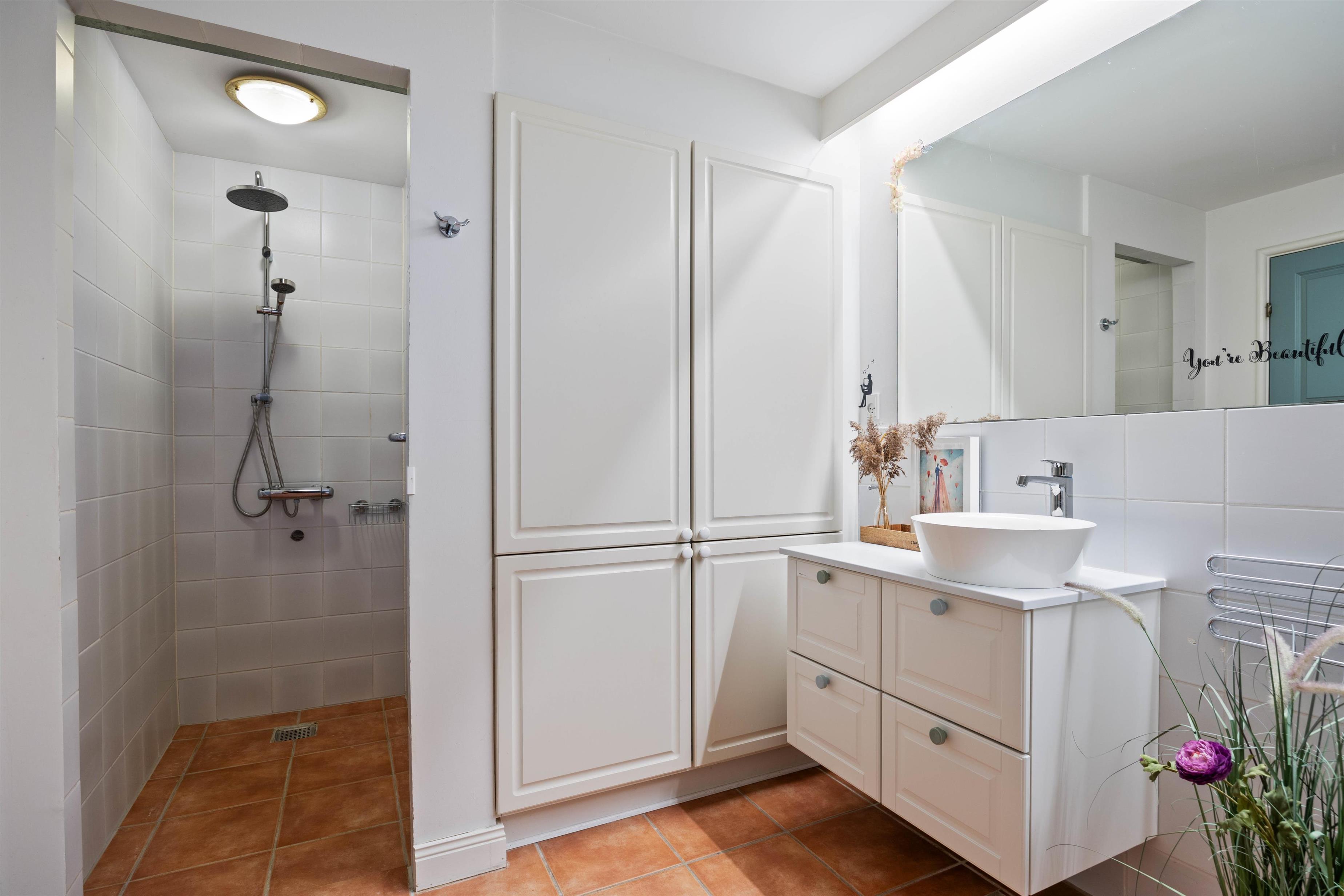 I stueetagen finder I ferielejlighedens badeværelse og et gæstetoilet, der begge har gulvvarme, så I undgår kolde fødder. I badeværelset er en sauna og et spabad, så I virkelig kan slappe af efter en lang gåtur på Søndervigs kilometerlange sandstrand.
