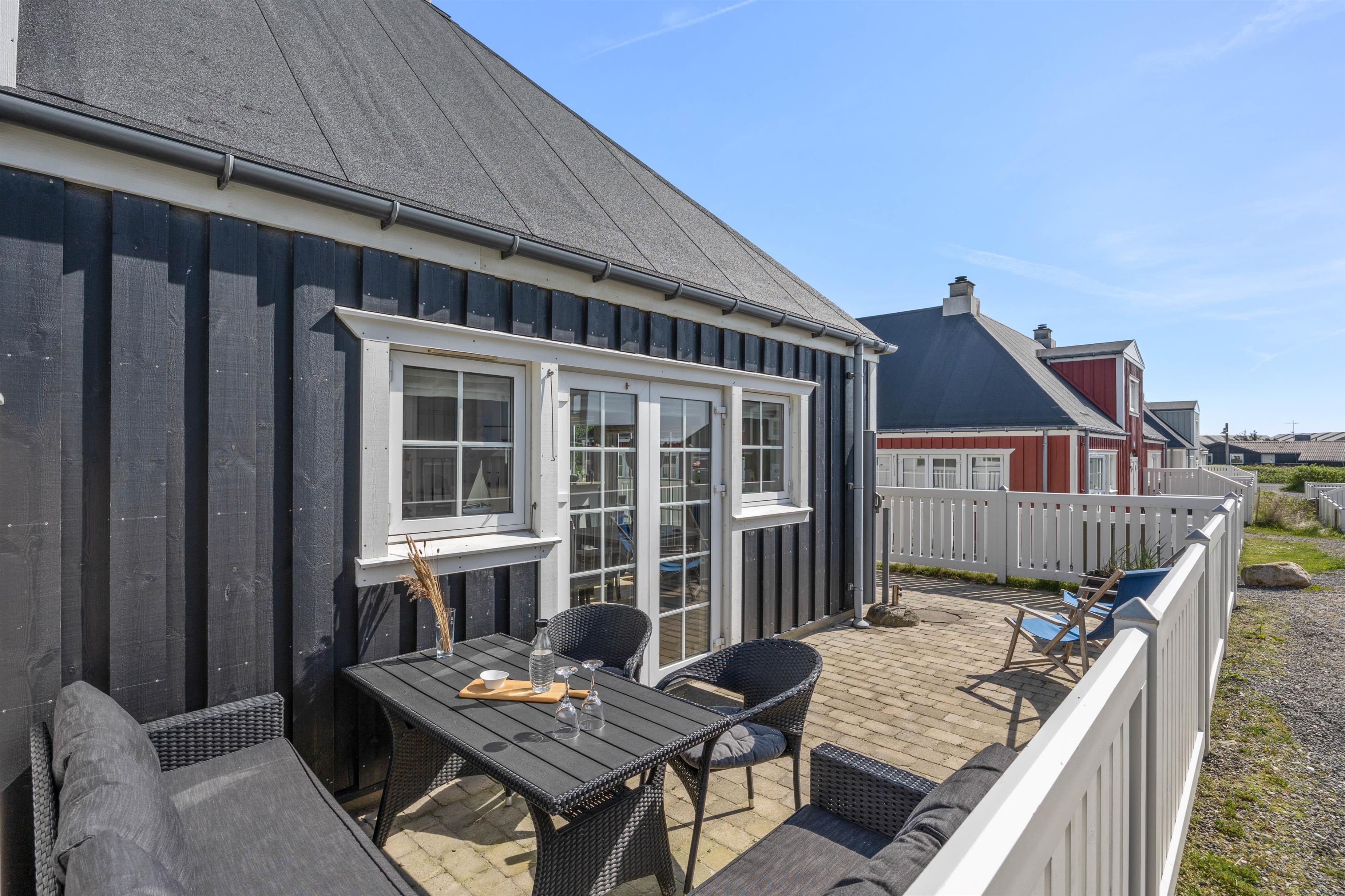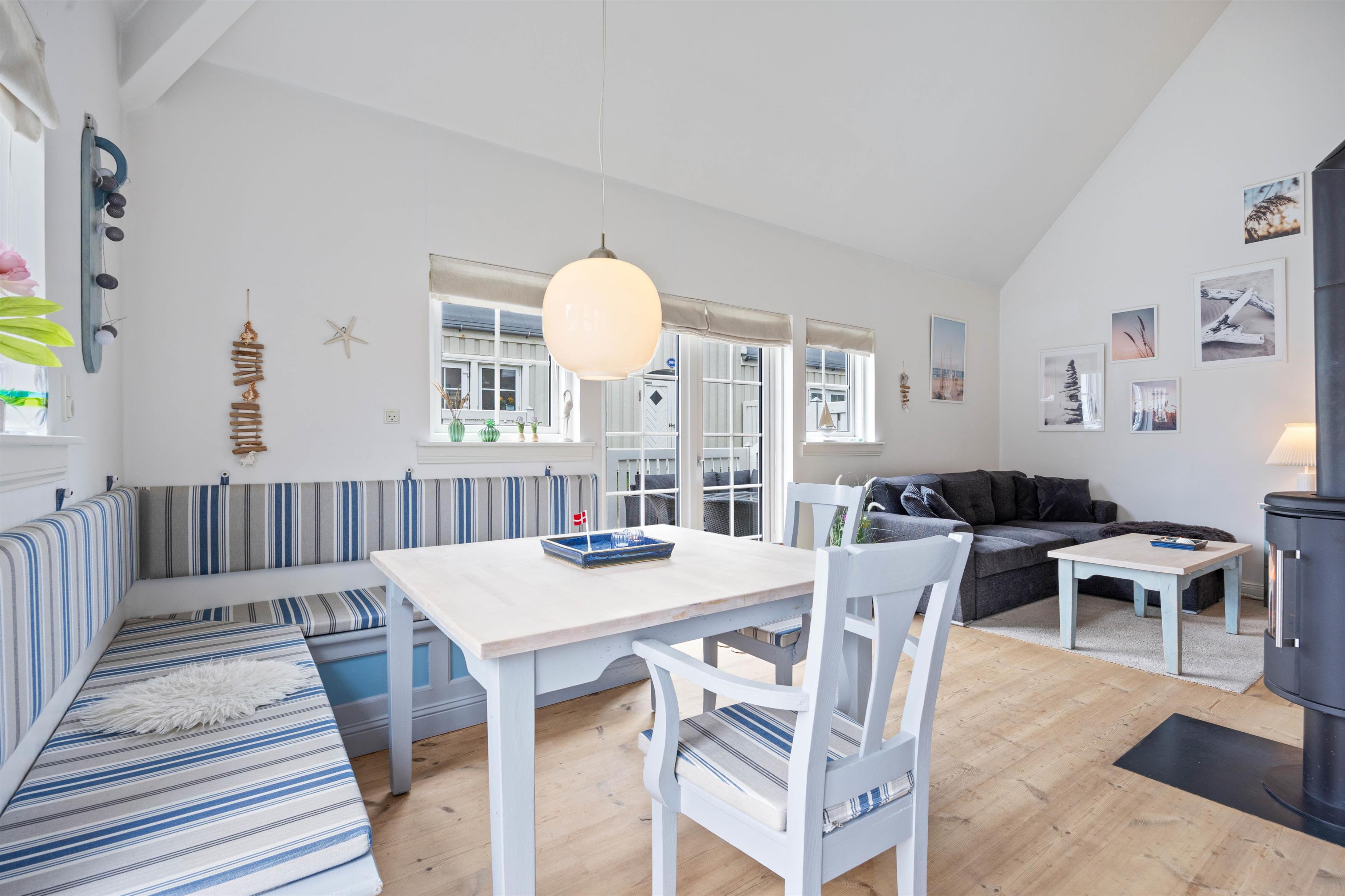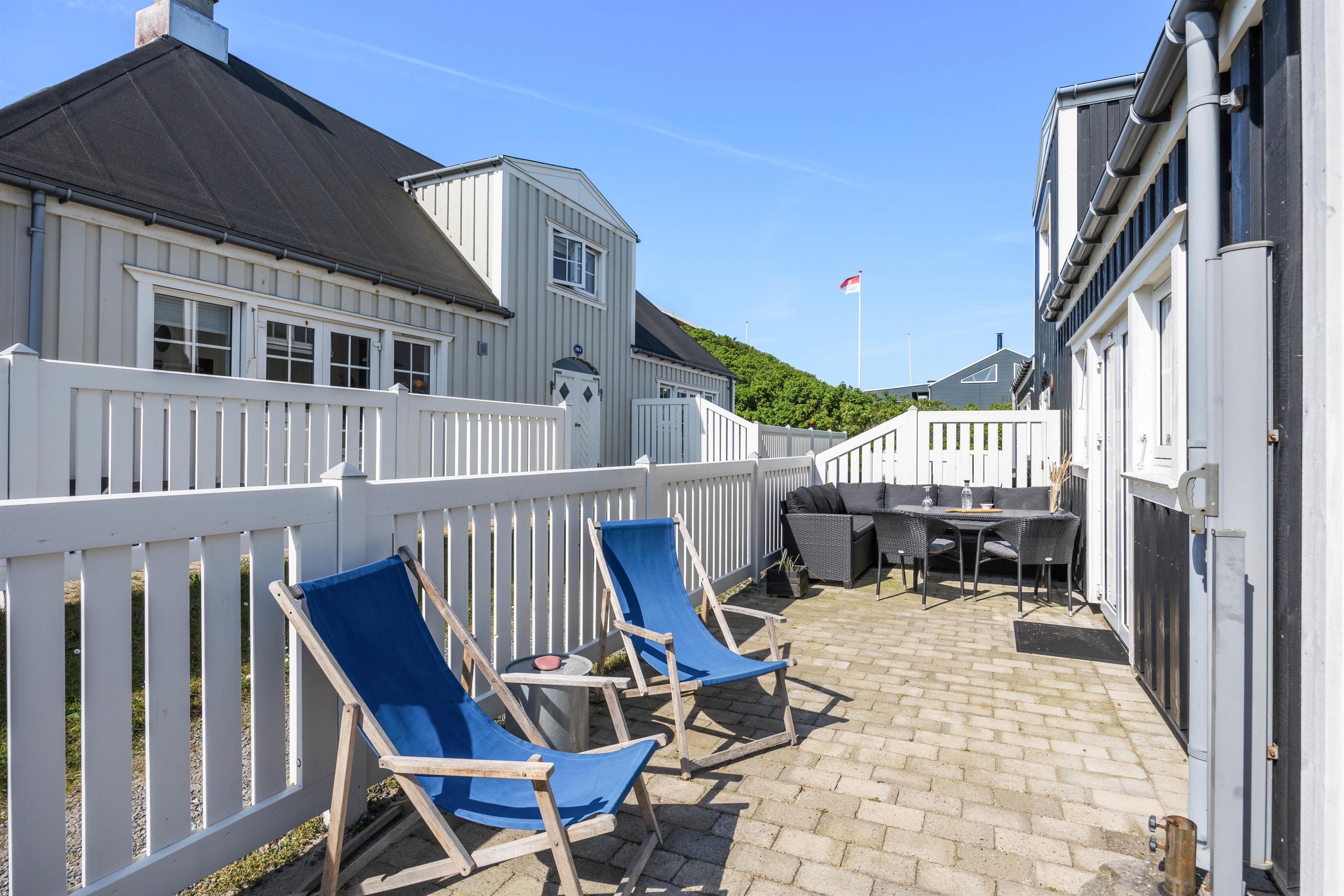 Fra stuen har I adgang til jeres afskærmede og lukkede terrasse, hvor I kan sætte jer godt til rette i ferielejlighedens havemøbler og nyde vejret, når det er til det. Tænd op i grillen på en varm sommeraften og nyd et lækkert måltid sammen med hele familien.