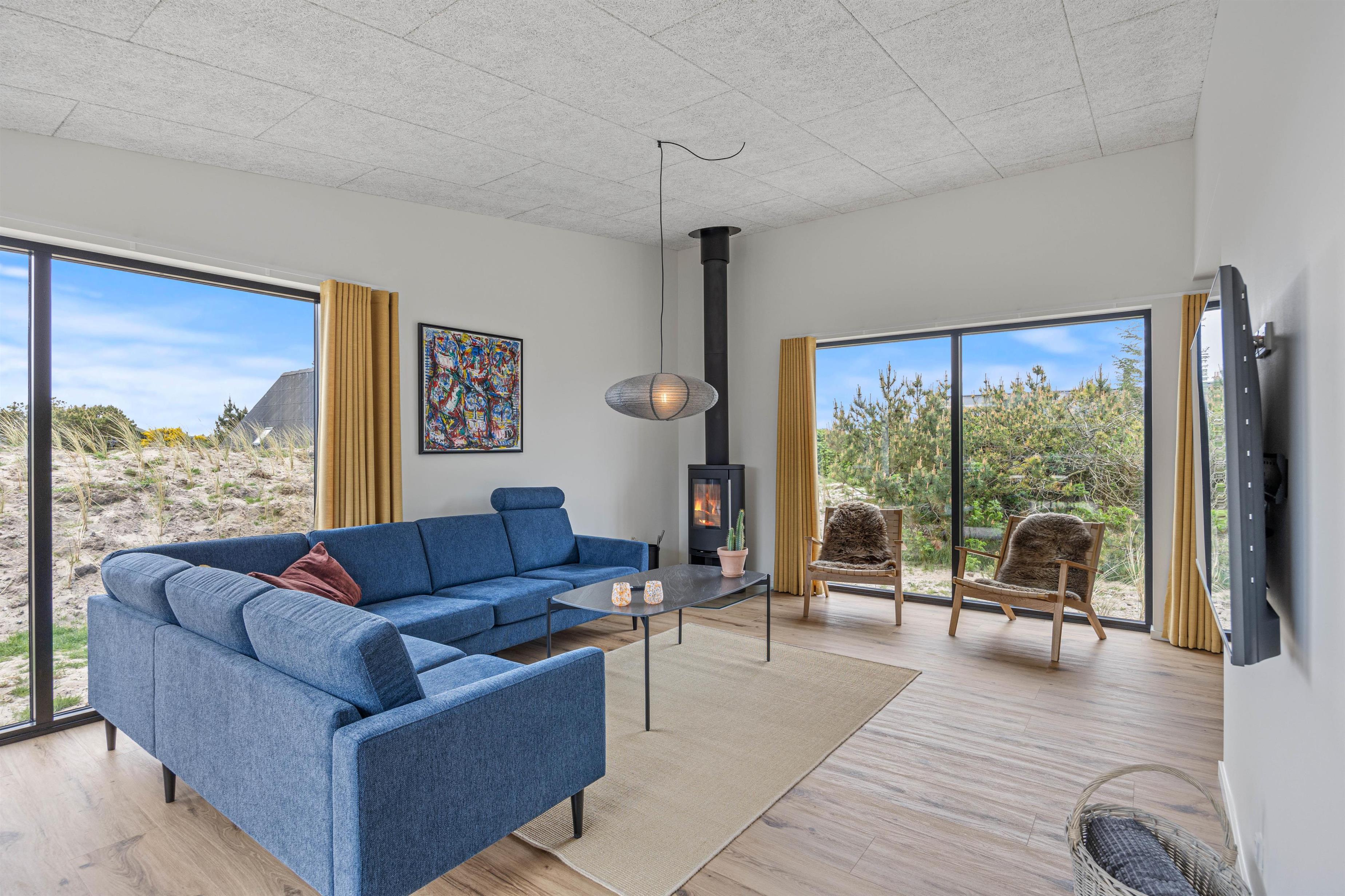 Husets naturlige samlingspunkt er det åbne køkken-alrum, hvor de store vinduespartier ikke blot giver en dejlig udsigt, men også lukker et behageligt lys ind. Køkkenet er veludstyret, og med den tilhørende opvaskemaskine slipper I for besværet med opvasken. Om I vælger at nyde måltiderne sammen ved spisebordet eller slapper af på sofaen, findes der en hyggelig krog for alle. På de køligere aftener kan I tænde op i pejsen, som skaber både varme og en indbydende, hyggelig stemning.