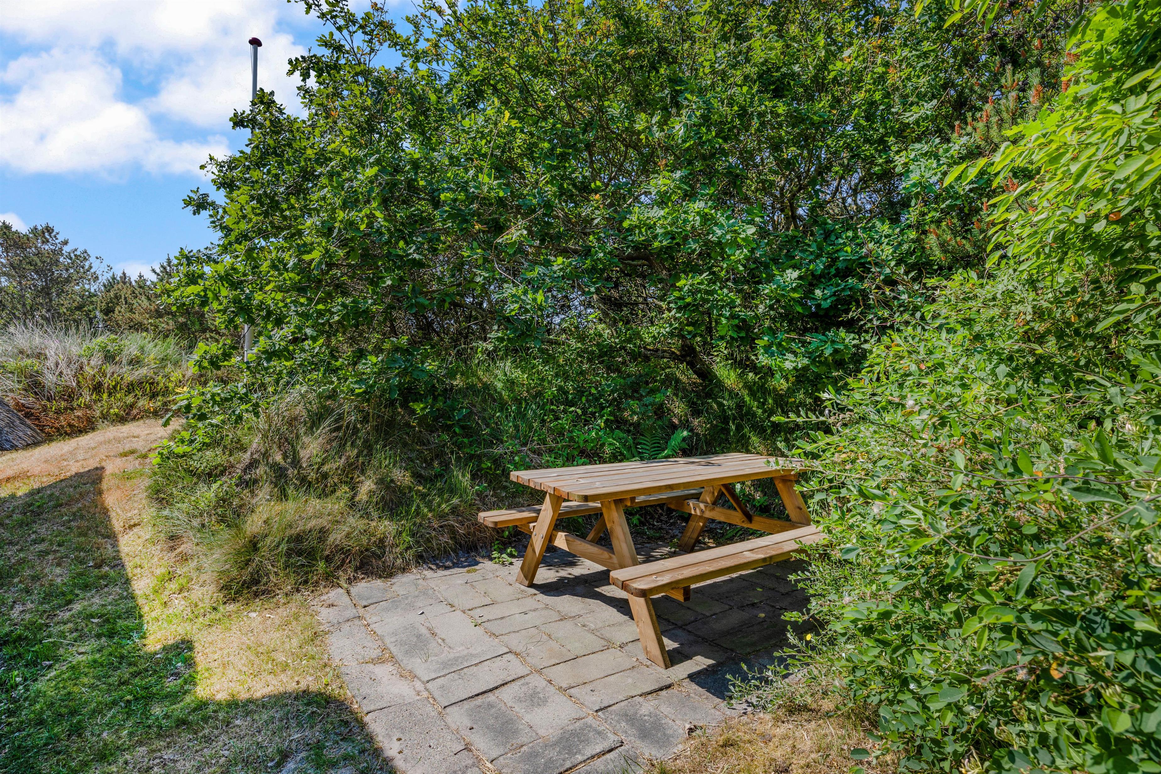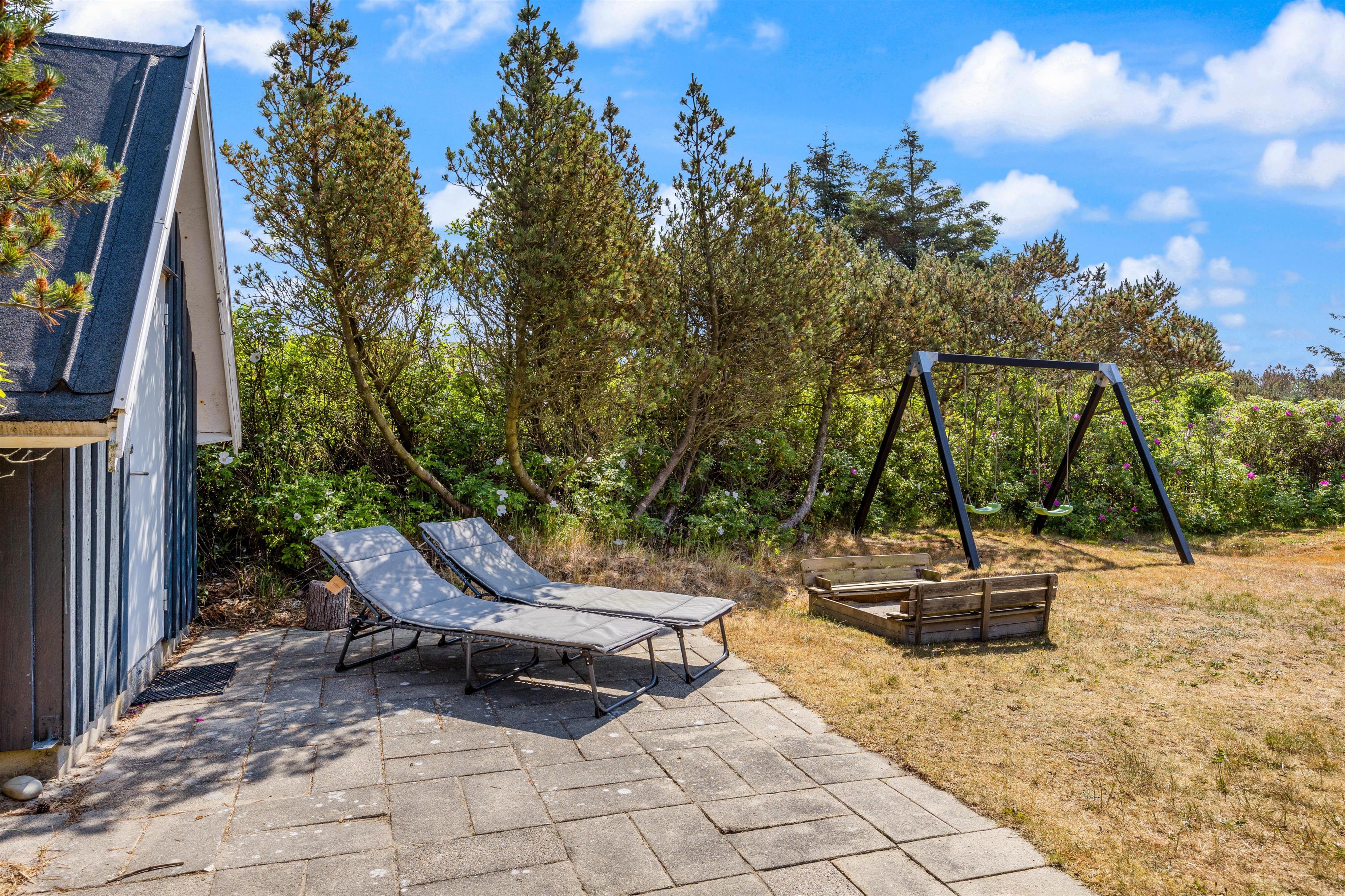 Sommerhuset har desuden en afskærmet terrasse, der vender mod syd. Her kan I finde jer til rette i havemøbler og liggestole, mens I nyder feriefreden og den rolige vestjyske natur.