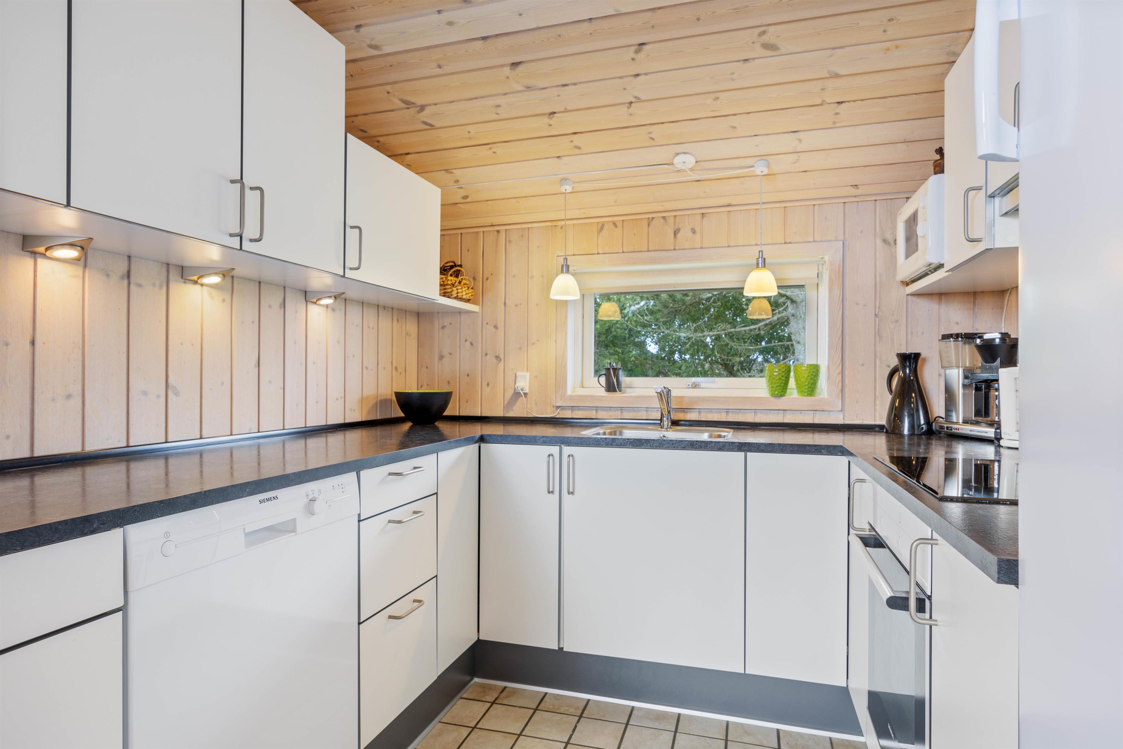 Husets køkken indeholder moderne faciliteter som en opvaskemaskine og en 80 L separat fryser. Desuden har sommerhuset en vaskemaskine, tørretumbler og gulvvarme i badeværelset, der alle er med til at gøre jeres ferie mere bekvem og bekymringsfri.