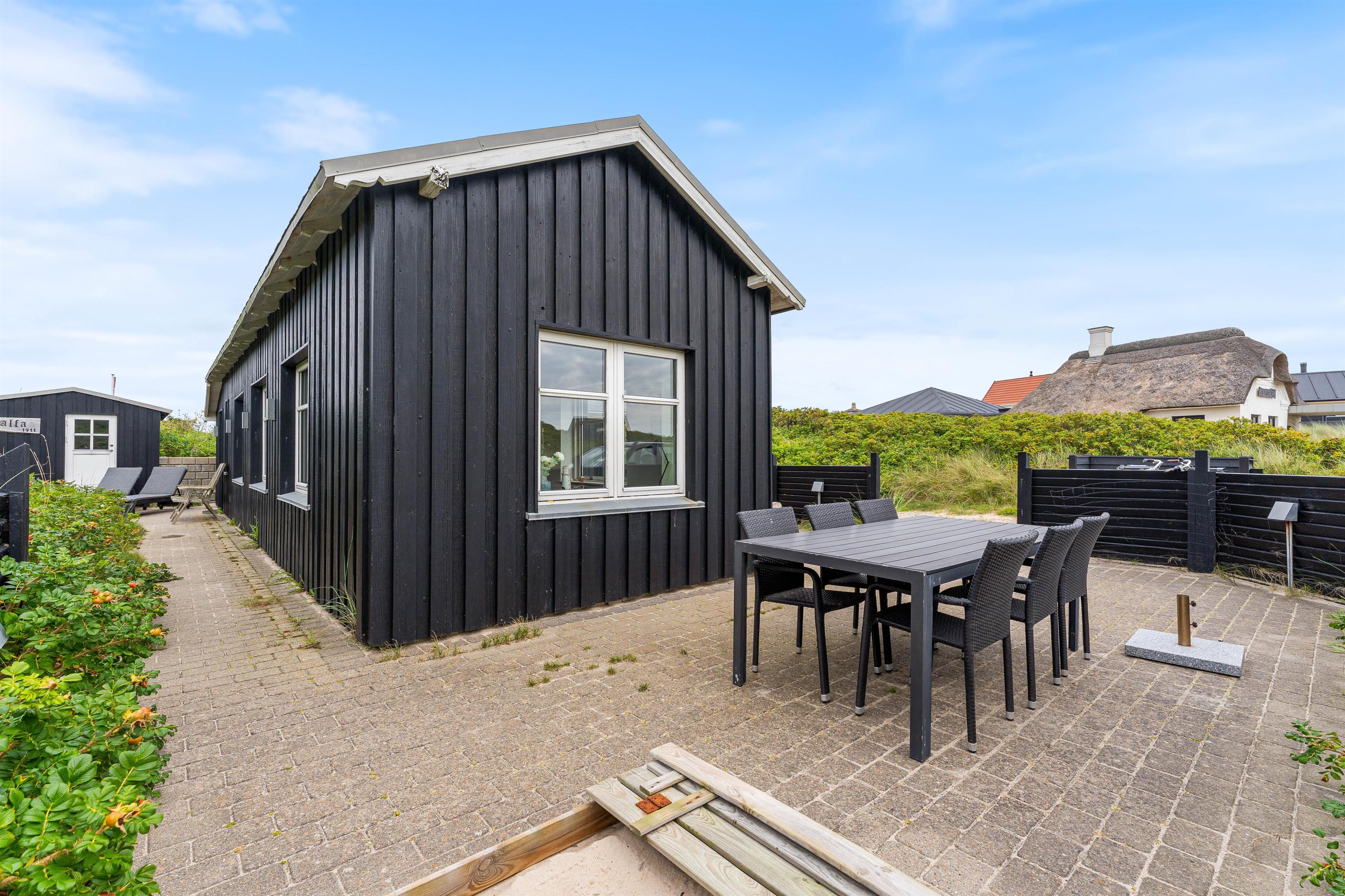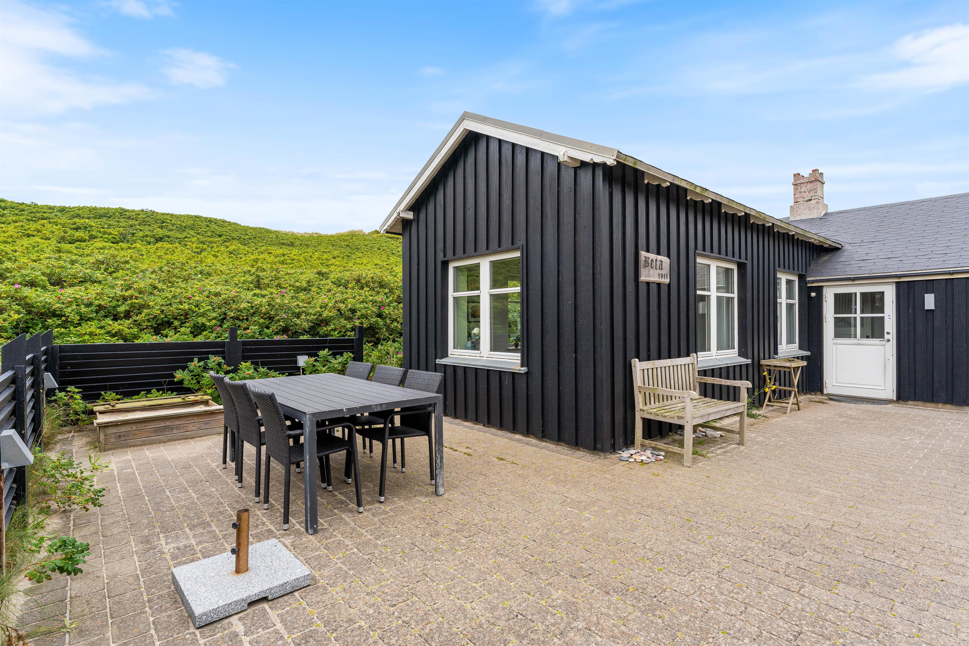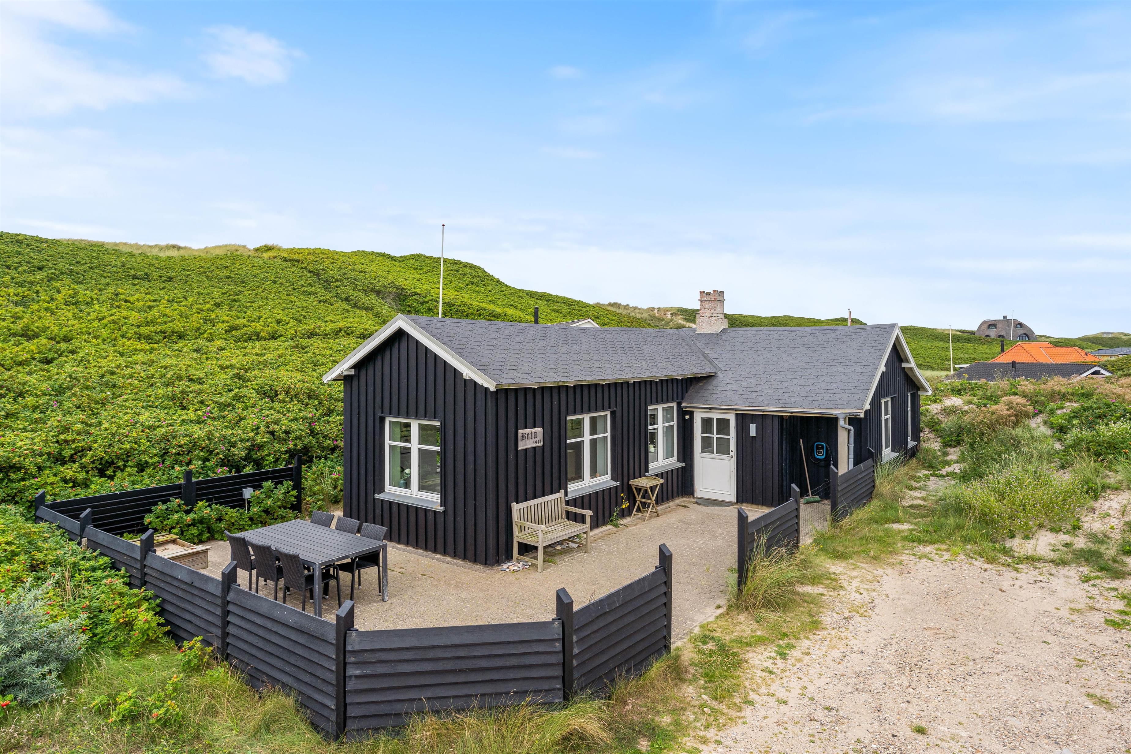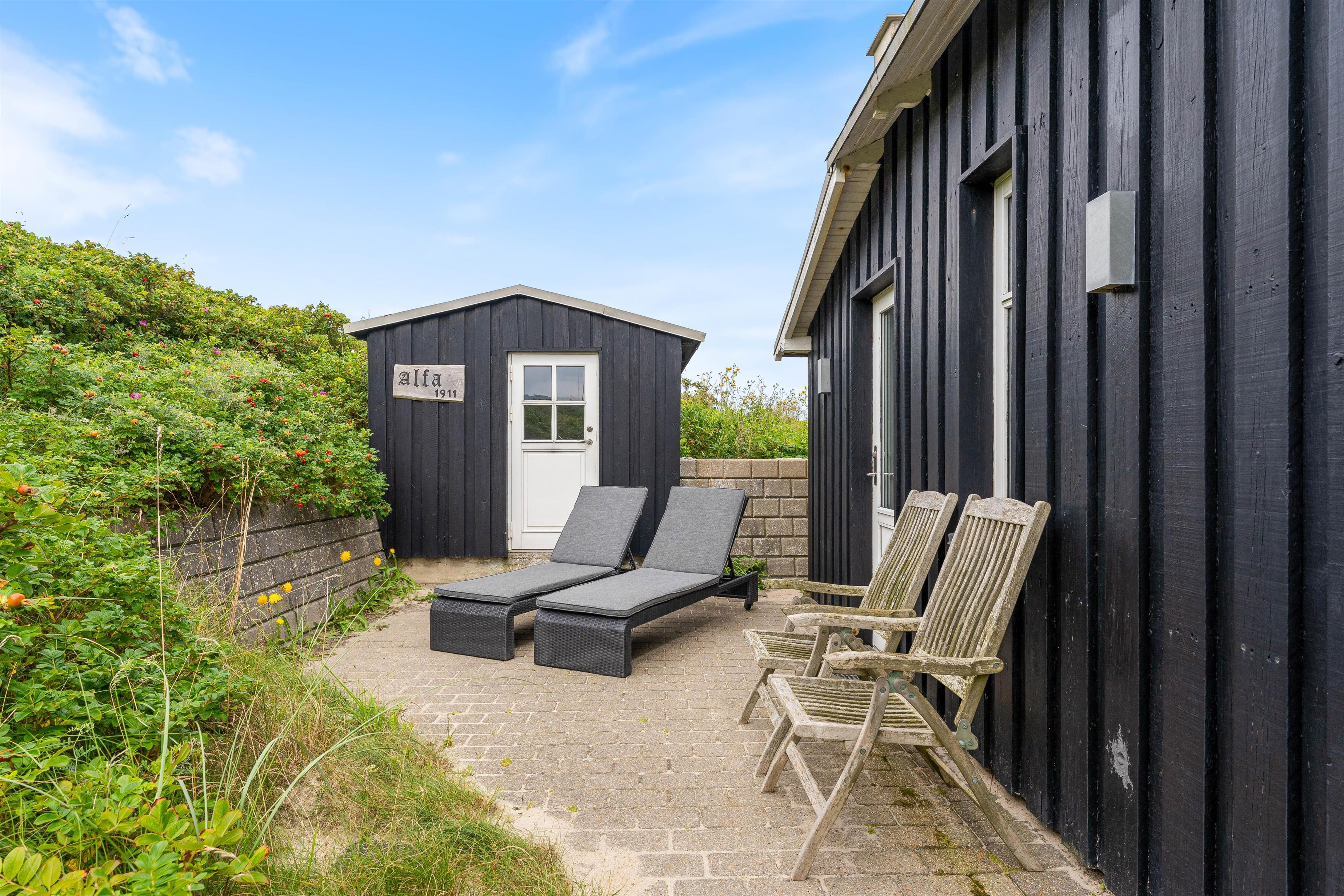 Sommerhusets terrasse er delvist afskærmet, så I kan sidde i læ og nyde solens varme stråler, og udsigten ud over det klitlandskab, der skærmer mod det brusende Vesterhav, og den kilometer lange sandstrand. På de varmere sommerdage kan det anbefales at hoppe i badetøjet, og hoppe en tur i Vesterhavet, for at blive kølet lidt ned i sommervarmen. Om aftenen kan i tænde op i feriehusets tilhørende grill, hvor I kan tilberede et lækkert måltid, som i sammen kan nyde på sommerhusets terrasse.