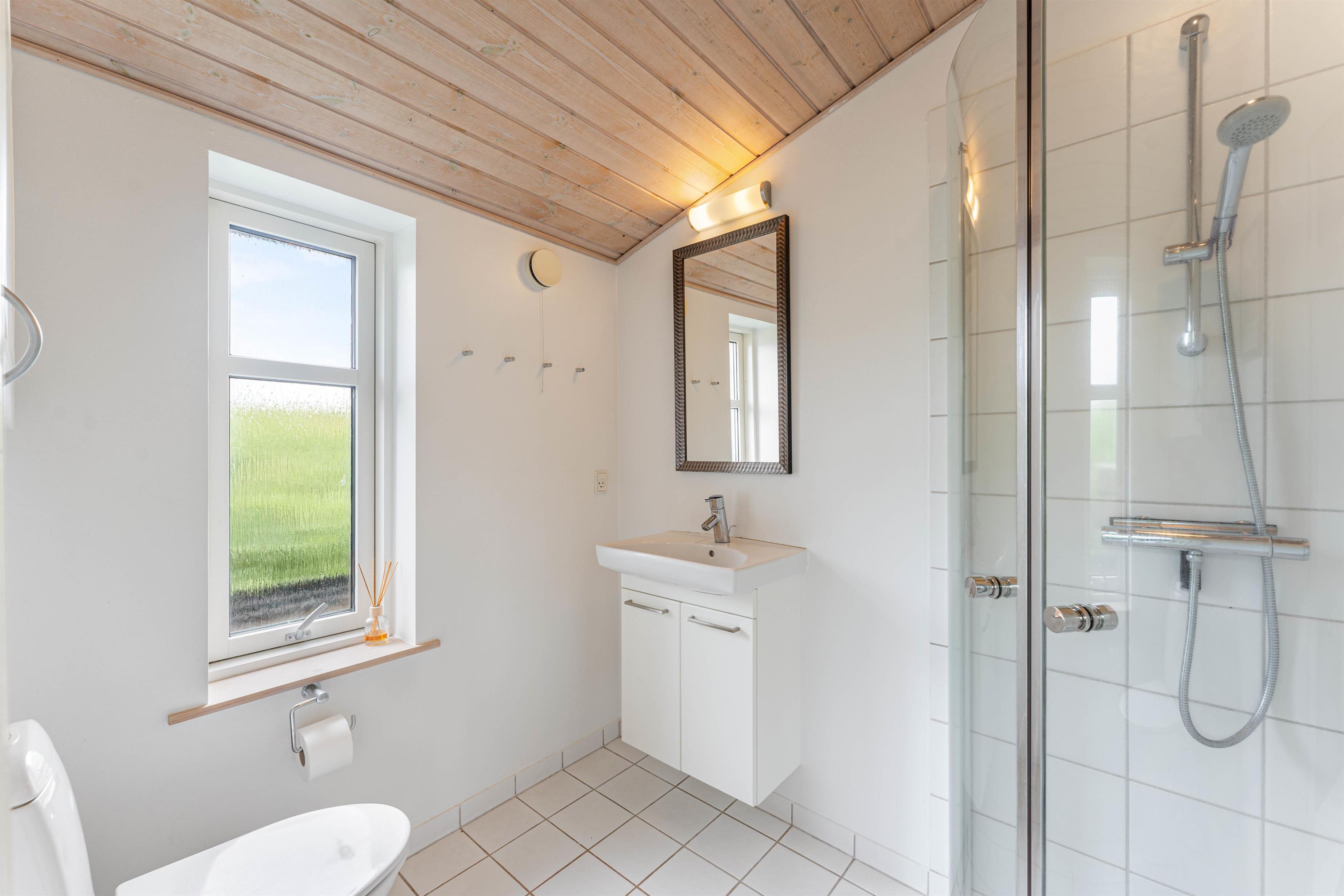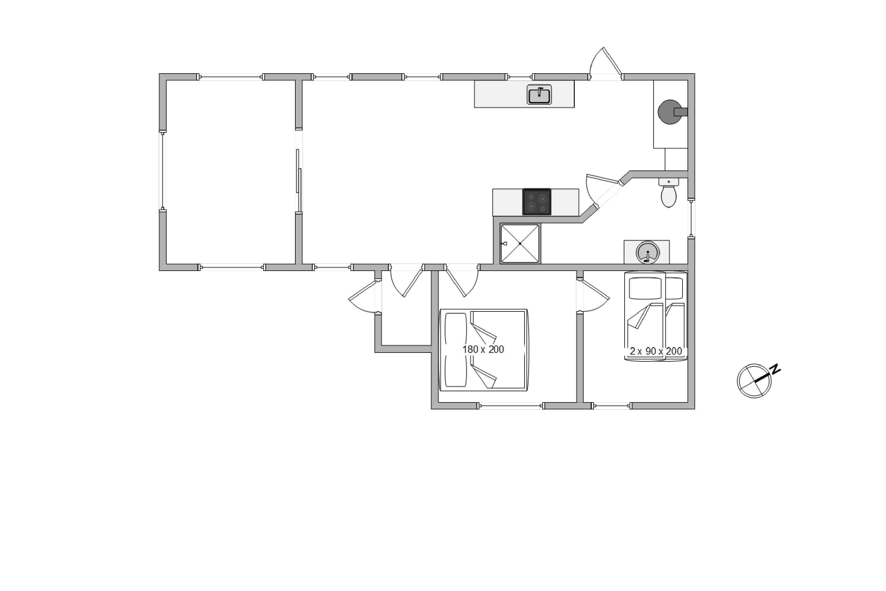 Det 64 m2 store feriehus, er indrettet med 2 soverum, hvoraf det ene er med dobbeltseng og det andet er indrettet med en køjeseng. Sommerhuset er derfor helt perfekt til den lille børnefamilie eller et par. De lyse farver i indretningen skaber et indbydende og behageligt inde rum, som inviterer til hygge og afslapning.