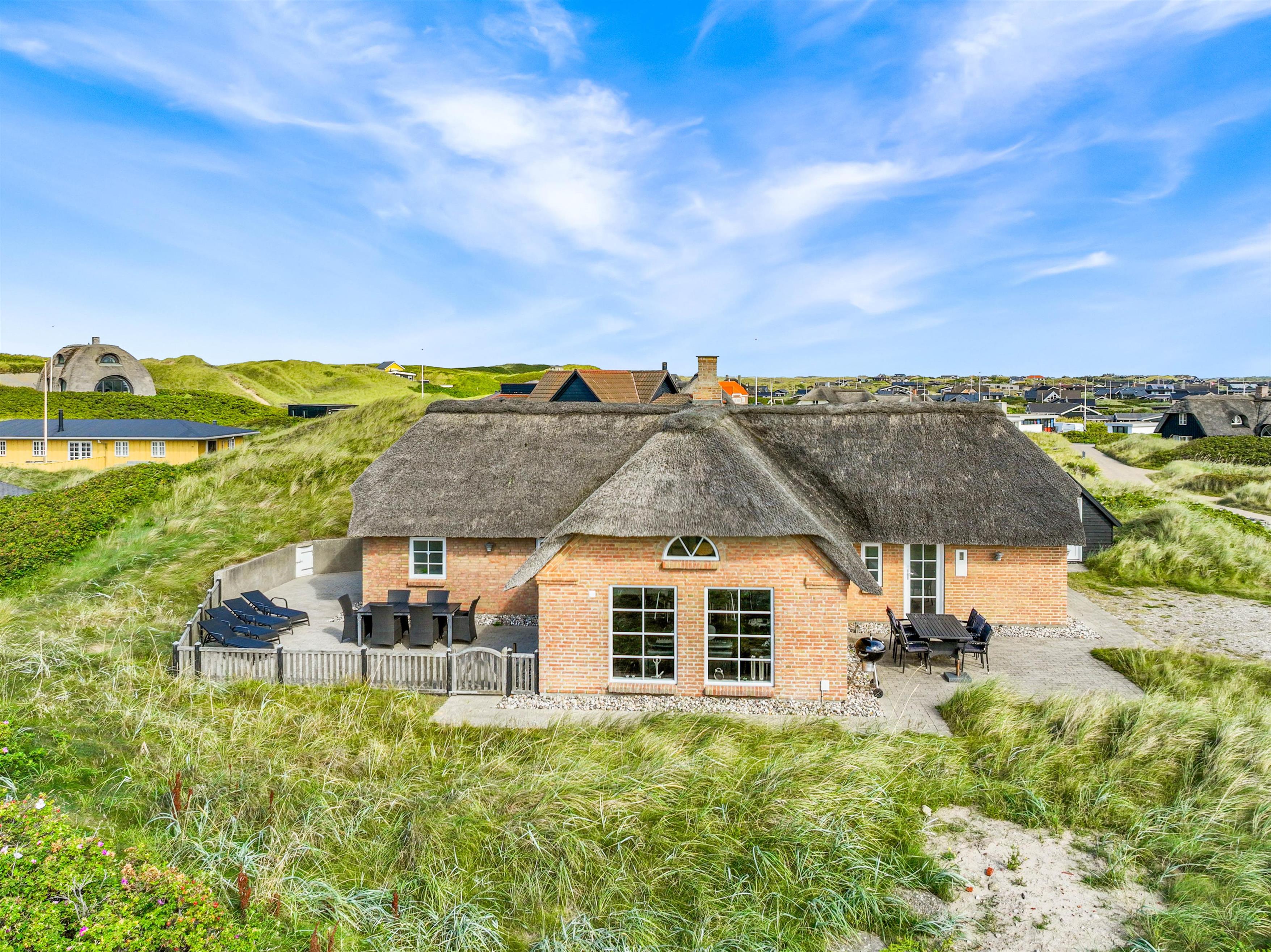 Et fantastisk smukt feriehus, hvor der er kræset for detaljerne, ude såvel som inde. Huset, der er omkranset af dejlige terrasser, har en dejlig beliggenhed kun et stenkast fra stranden og i gåafstand Søndervig Centrum, hvor restauranter og specialforretninger ligger som perler på en snor.