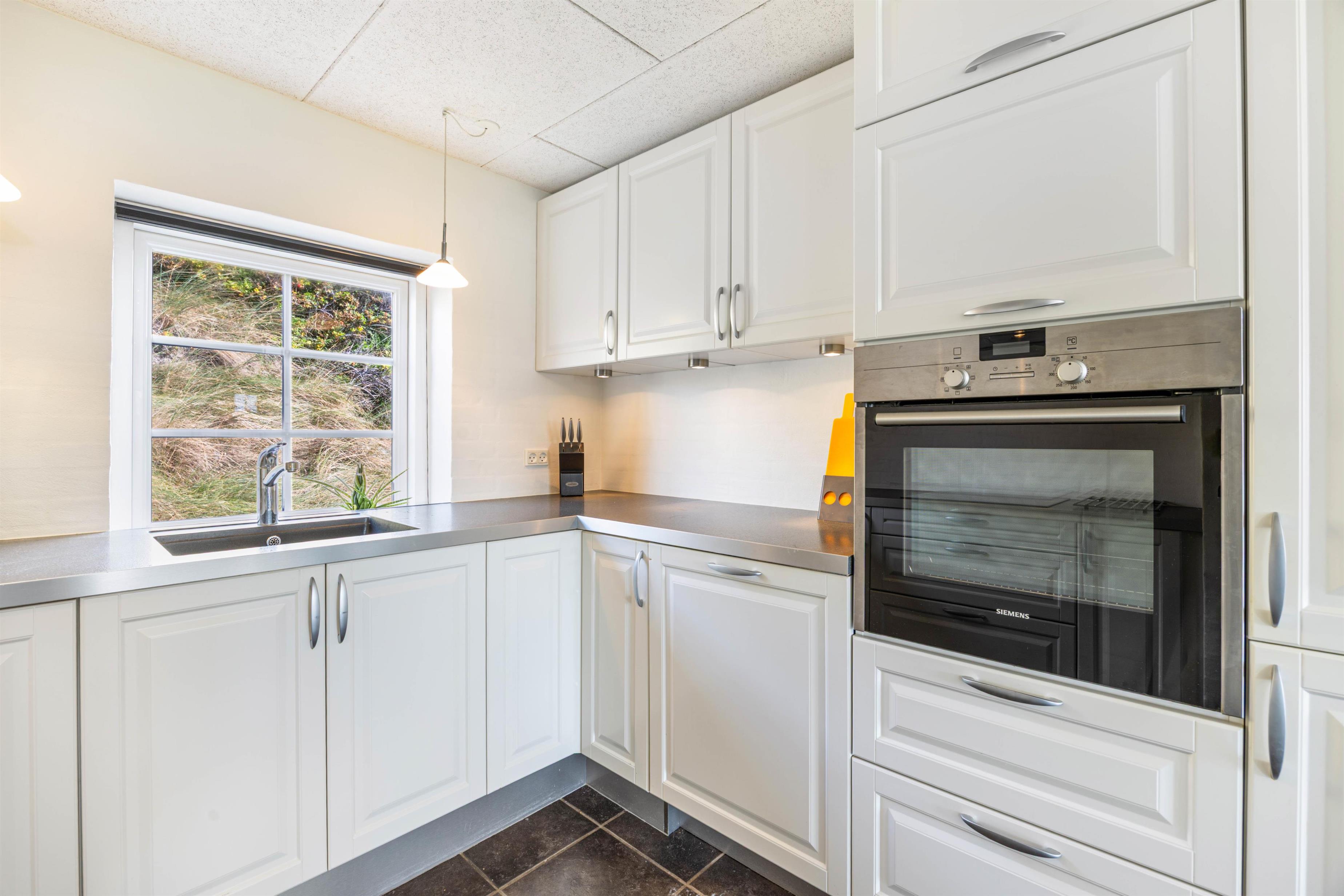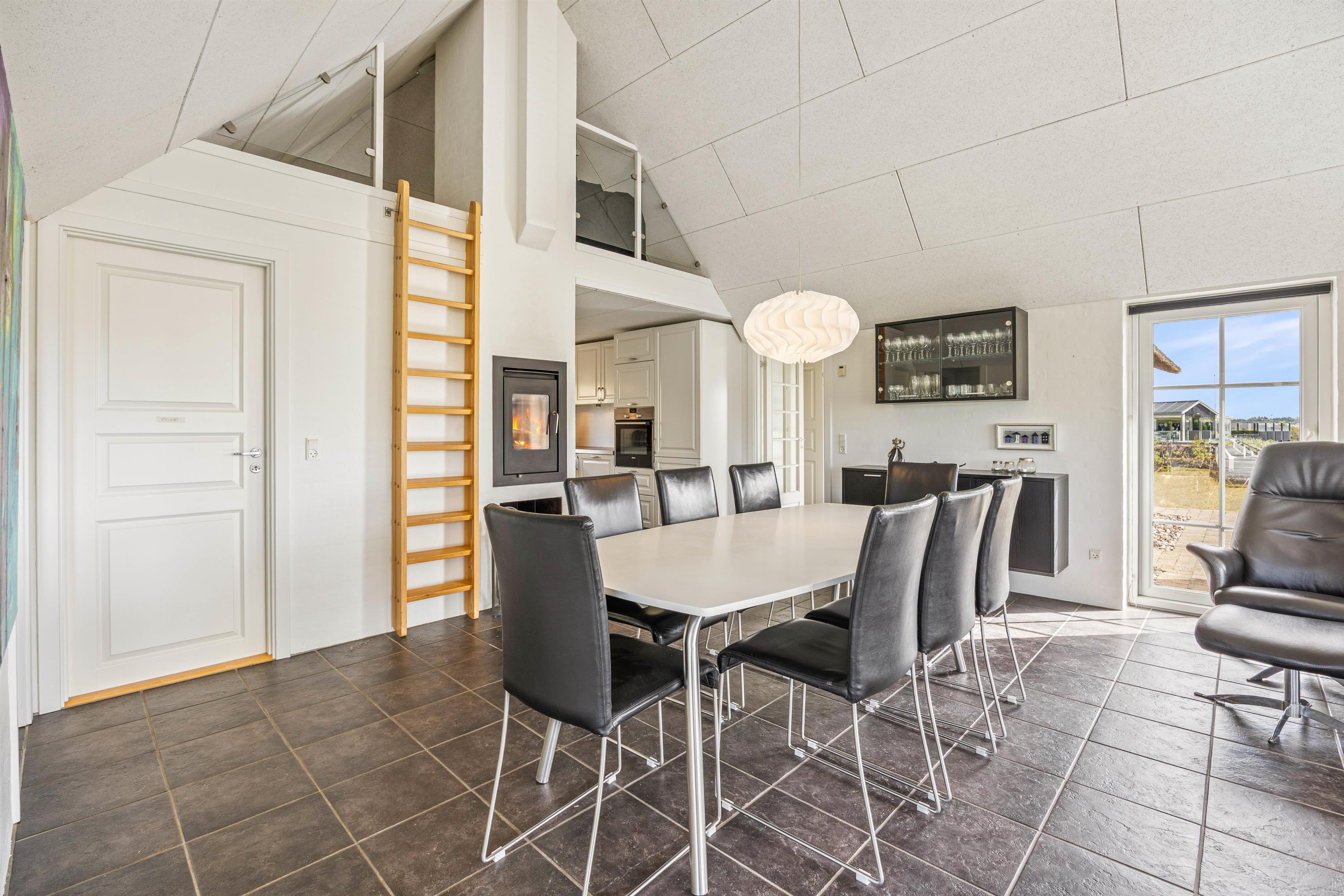 Stuen, spisestuen og køkkenet er i åben forbindelse og indrettet i hjertet af huset. Det er et helt fantastisk flot og spændende rum, hvor man får lyst til at tilbringe mange timer i selskab med familien. De mange behagelige møbler giver jer muligheden for at slå jer ned, og bare slappe af og nyde ferien. Til de lidt koldere dage kan brændeovnrn varme hele rummet op, samtidig med den skaber en hyggelig stemning i huset. Her er selvfølgelig også et stort fladskærms-TV og trådløst internet.