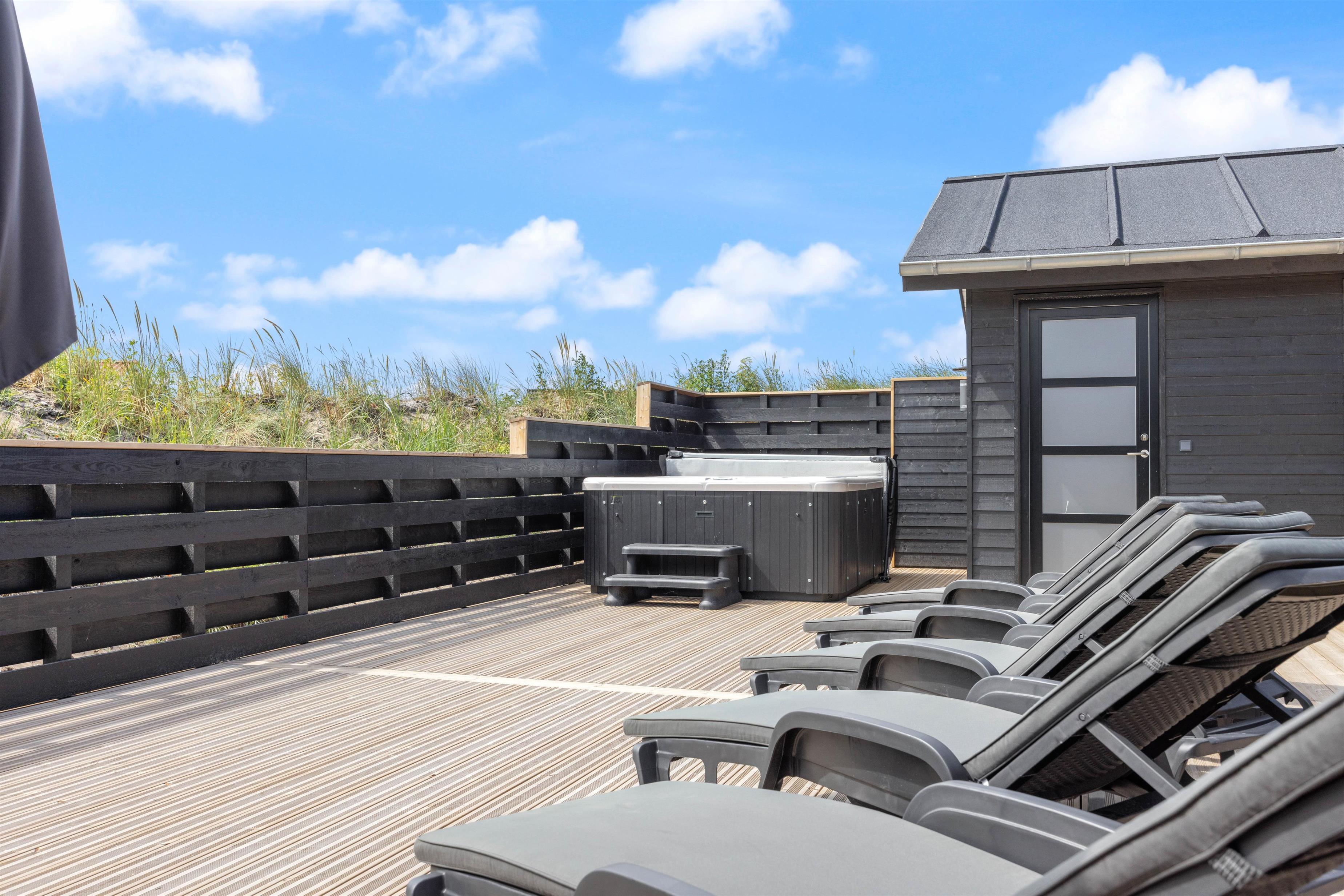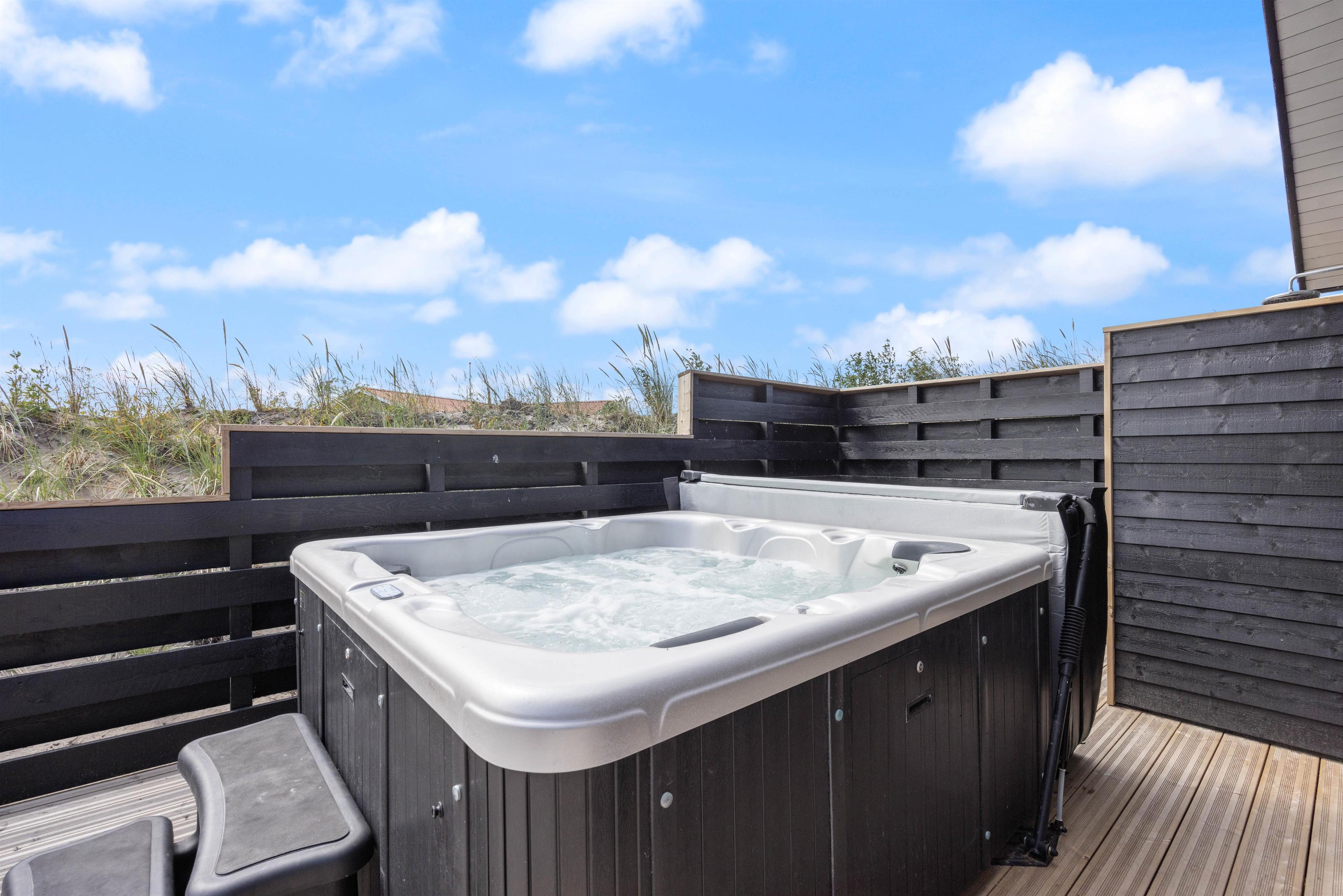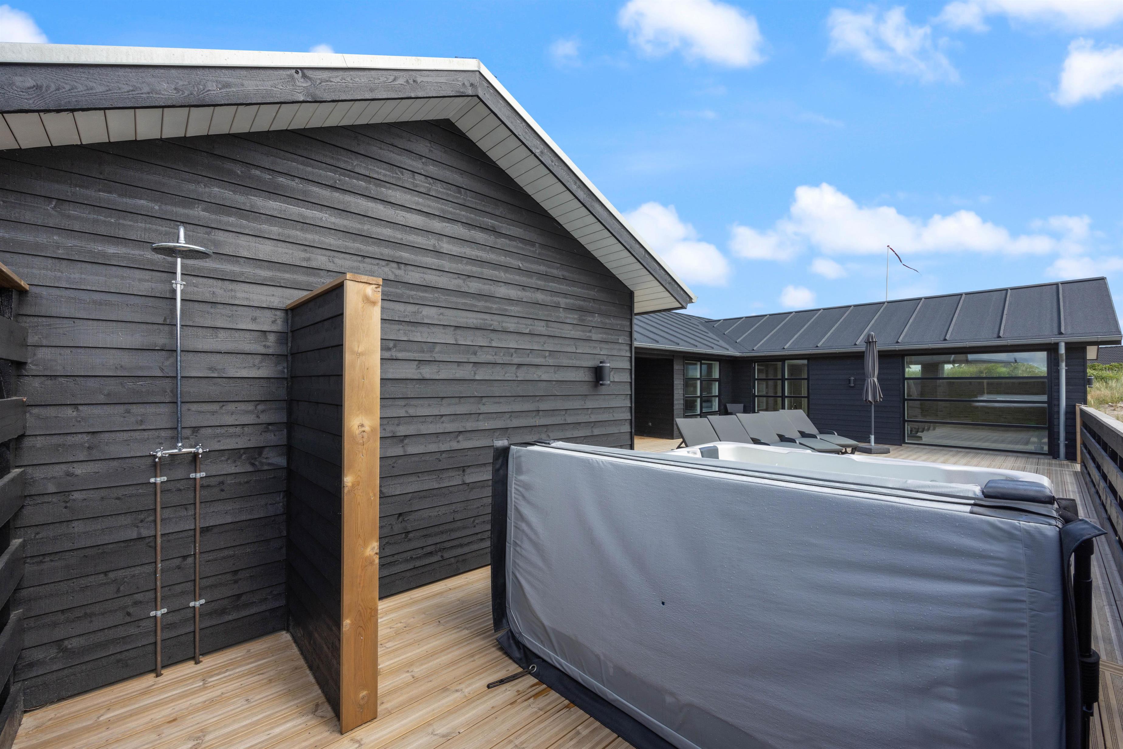 Ude på terrassen, finder i en udespa, hvor i rigtig kan blive varmet godt igennem, og bare nyde at i har ferie. Det er også her i finder feriehusets udebruser, hvor i kan skylle sandet af jer, efter en god tur på stranden. OBS. Udebruseren, er kun åben fra april-november.