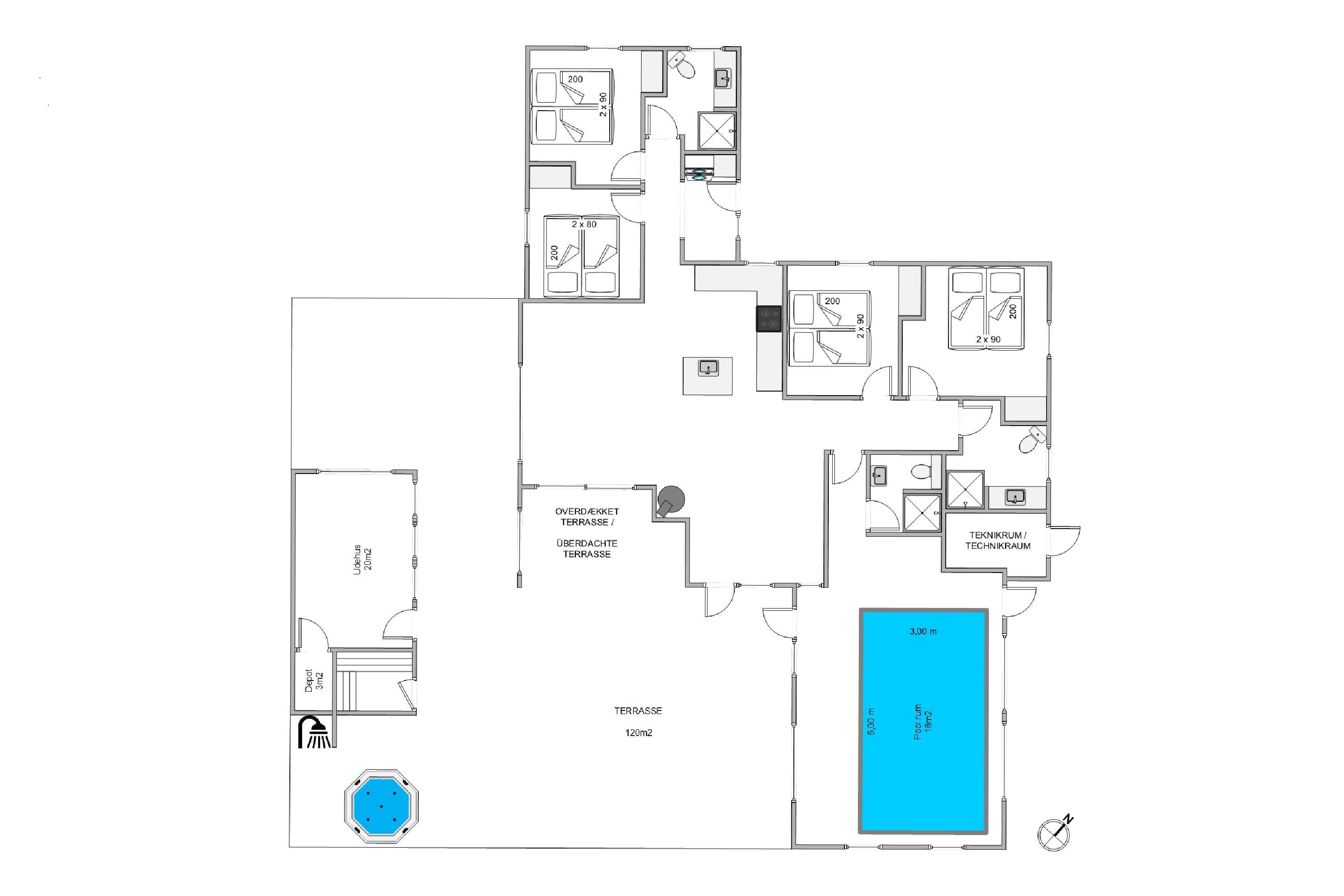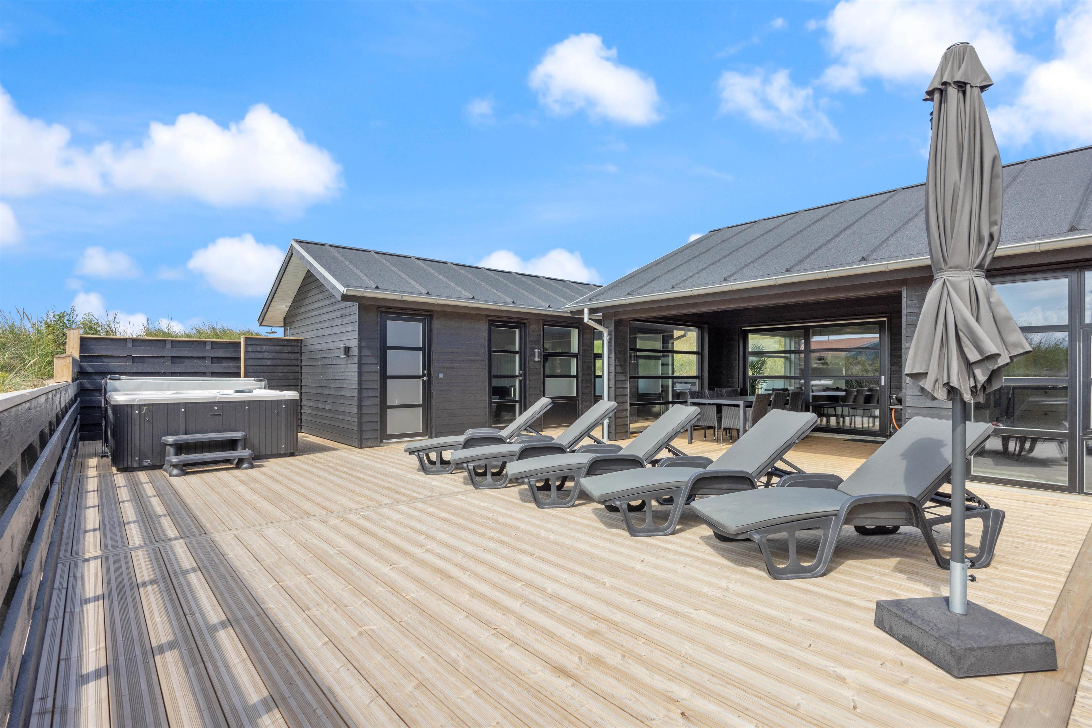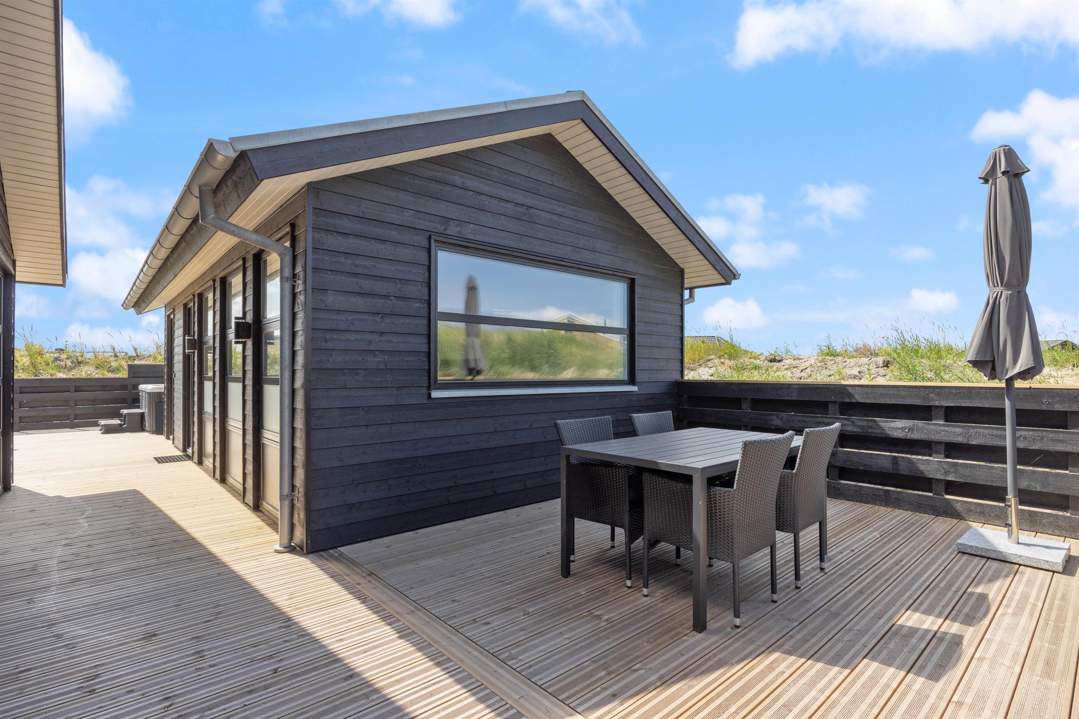 Ude på terrassen, finder i en udespa, hvor i rigtig kan blive varmet godt igennem, og bare nyde at i har ferie. Det er også her i finder feriehusets udebruser, hvor i kan skylle sandet af jer, efter en god tur på stranden. OBS. Udebruseren, er kun åben fra april-november.
