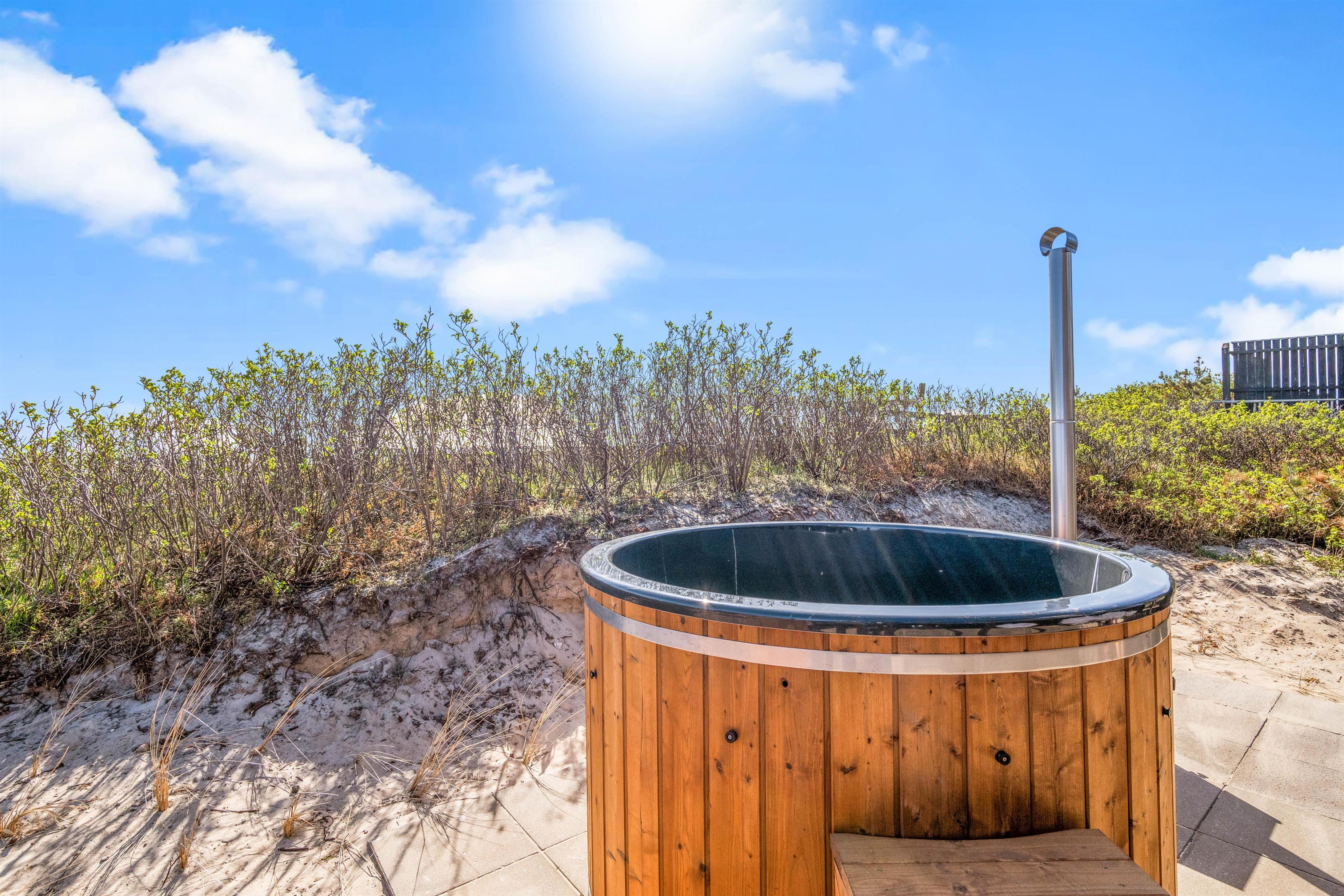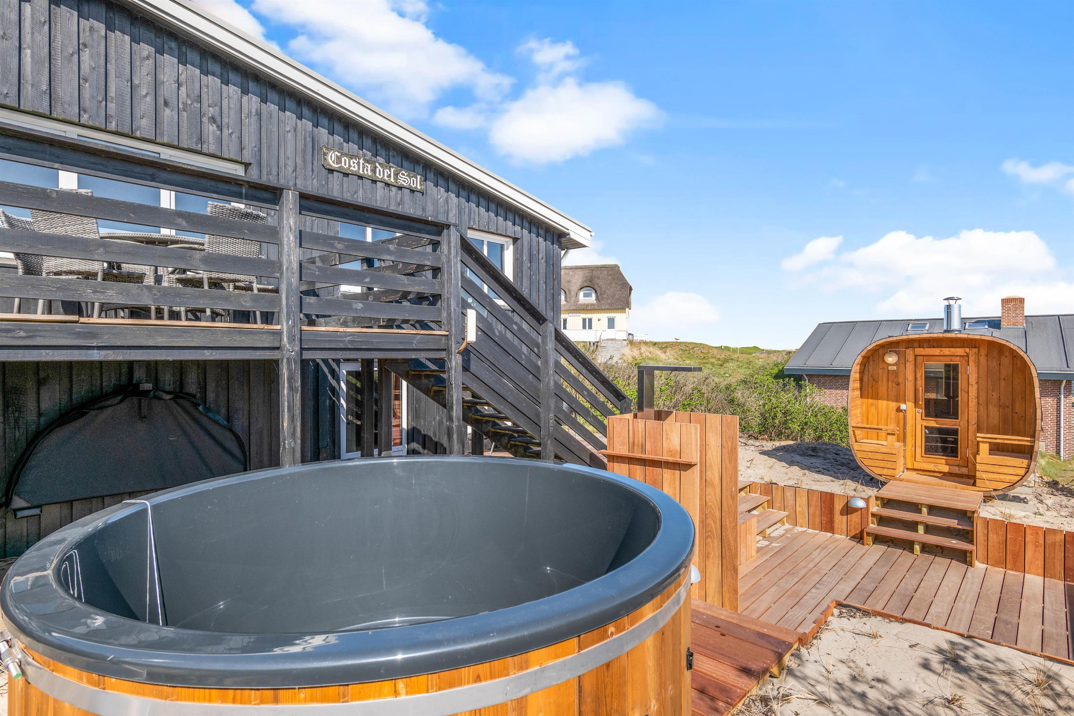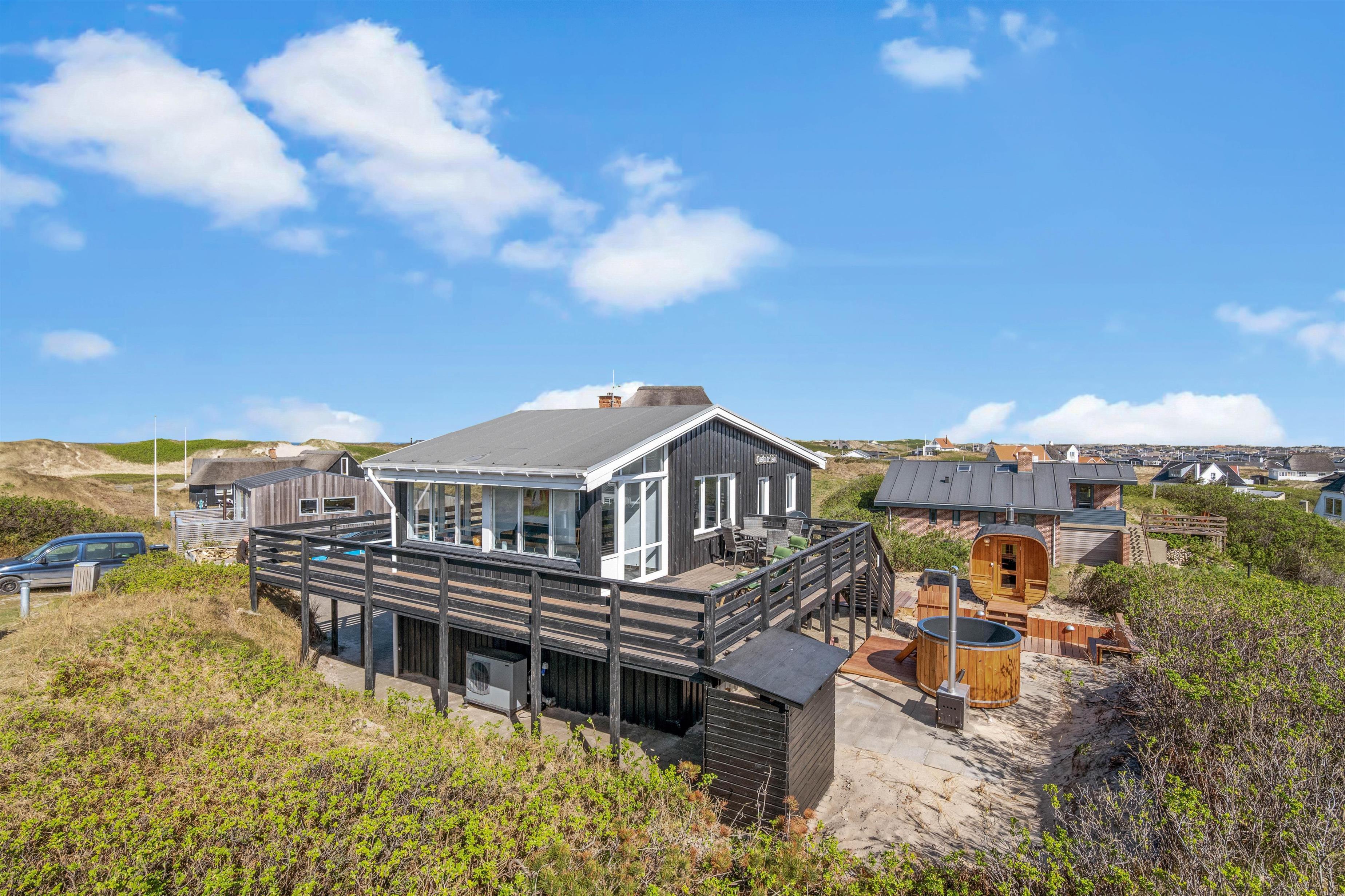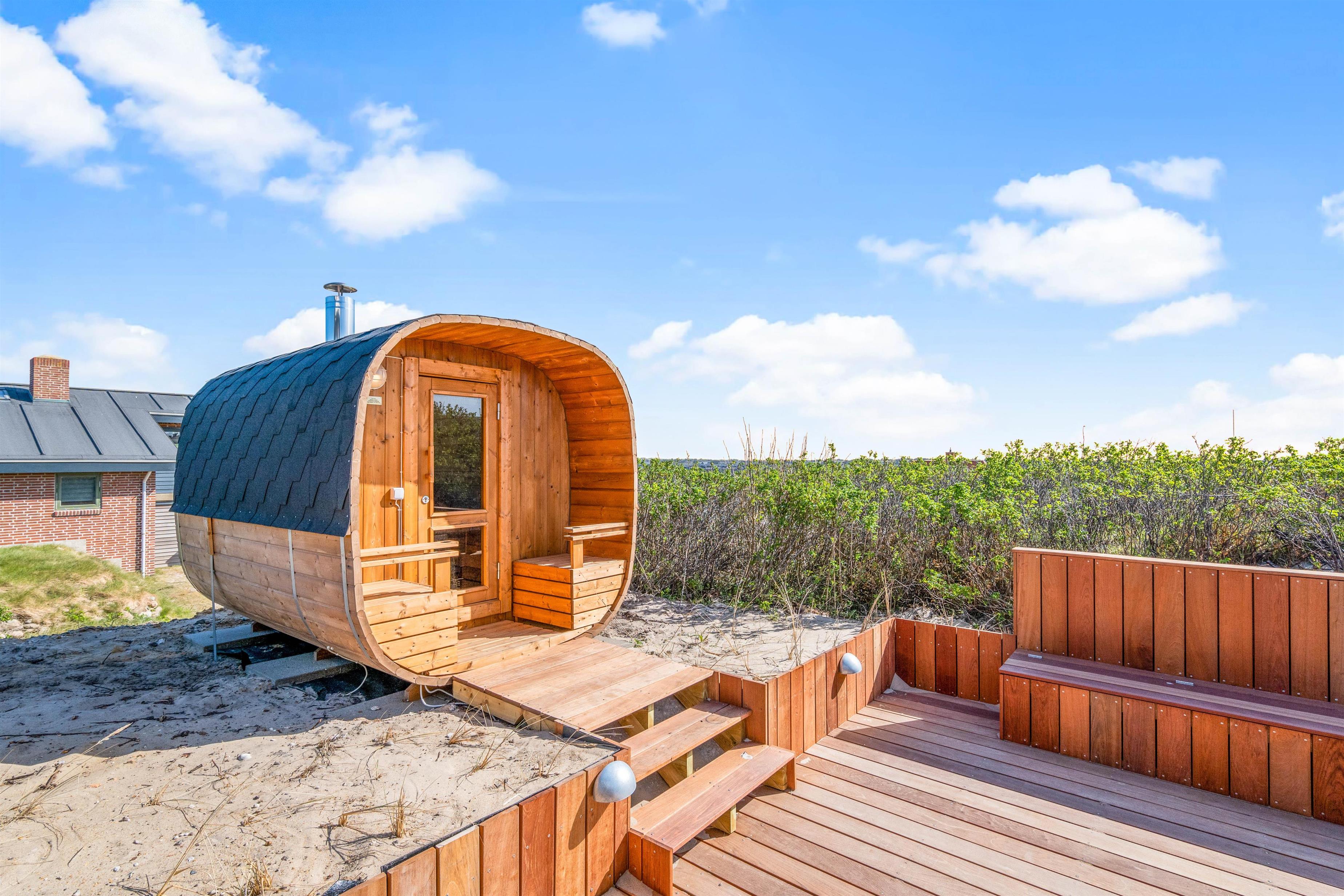 Kun et stenkast – mere præcist 175 meter – fra Søndervigs hvide sandstrand ligger dette skønne sommerhus og venter på jer. Her får I et feriehus fordelt på to plan med plads til 5 personer, og ikke mindst den lækreste terrasse med vildmarksbad, saunatønde og udendørsbruser. Hele herligheden ligger kun en lille gåtur fra Søndervigs bymidte. Der er derudover installeret en ladeboks ved feriehuset, hvis I ankommer med el-bil, så I uden problemer har mulighed for at få ladet bilen op. I skal blot huske at medbringe jeres eget ladekabel.