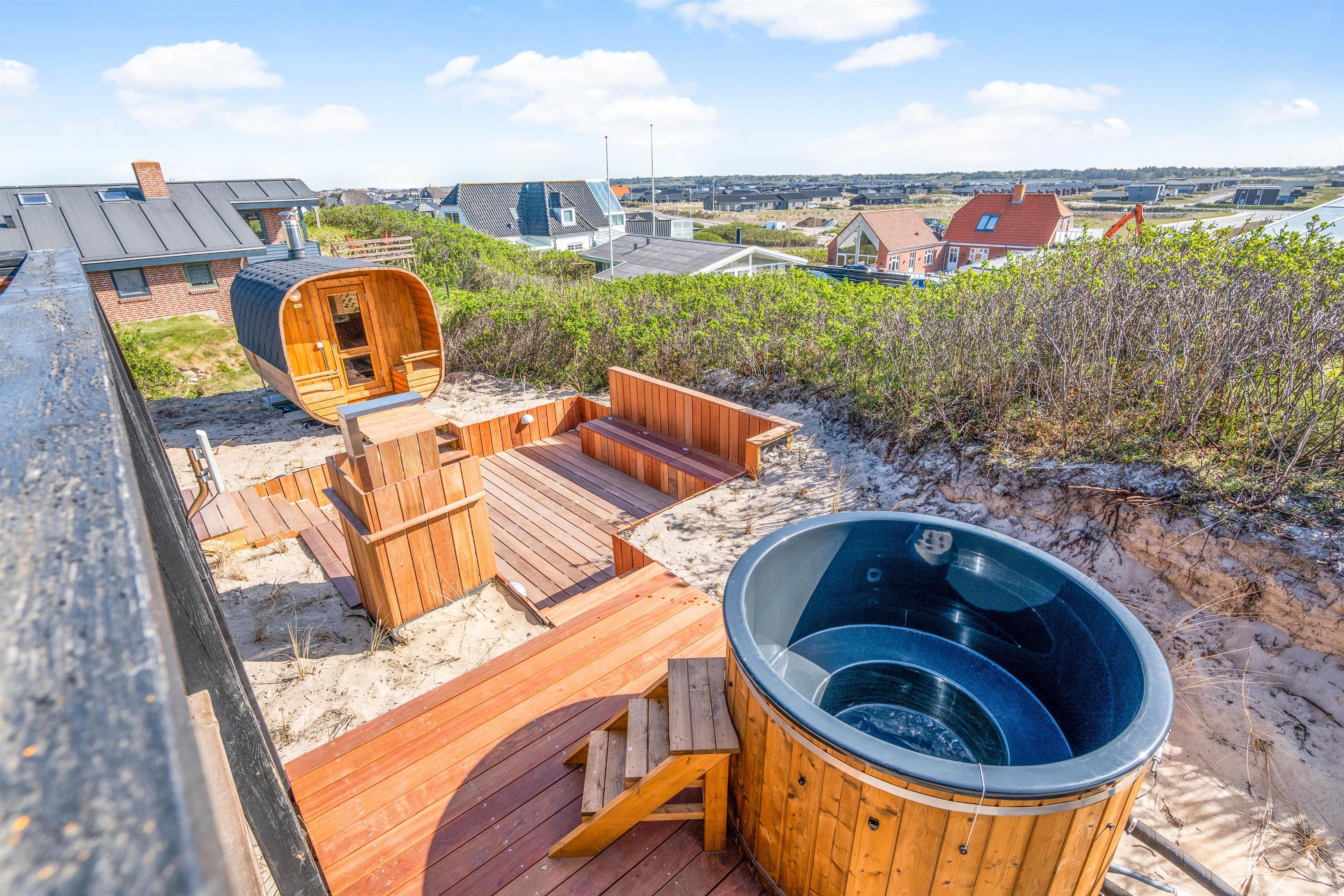 Terrasse med egen wellnessoase – vildmarksbad, saunatønde og udebruser