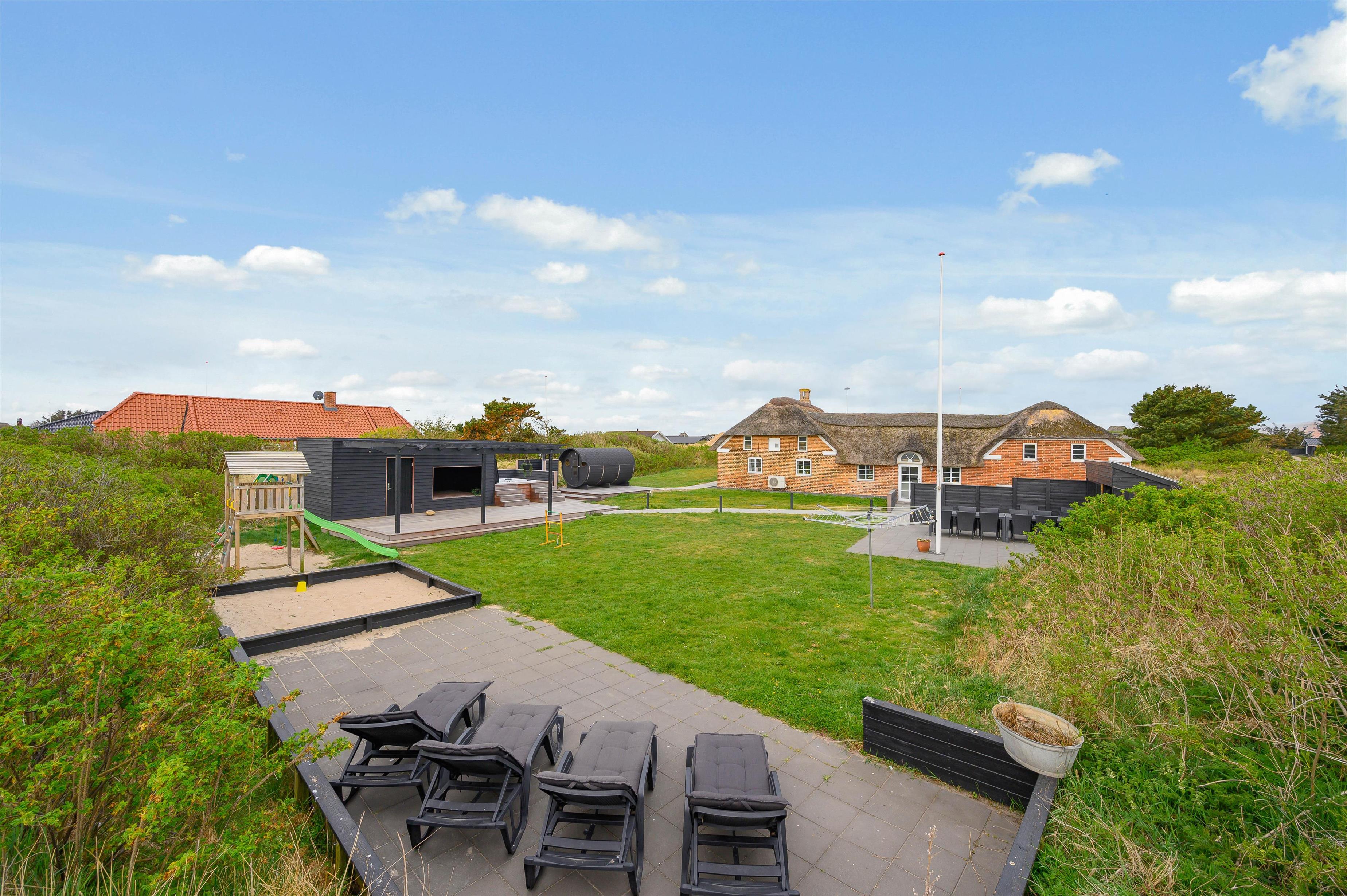 Leder I efter et sommerhus til den næste familieferie? Dette stråtækte feriehus i Søndervig har plads til intet mindre end 14 personer (og 2 hunde) og egner sig perfekt til en eller flere familier. Med en totalrenovering i 2019 er en gennemført moderne indretningsstil lagt, og et stort udeareal med græsplæne gør sommerdagene til et hit for både store og små - og en ekstra bonus er udespaen, som står klar til at give jer de skønneste wellnessoplevelser under åben himmel. Både stranden og Søndervigs centrum ligger desuden kun fem minutters gang væk!