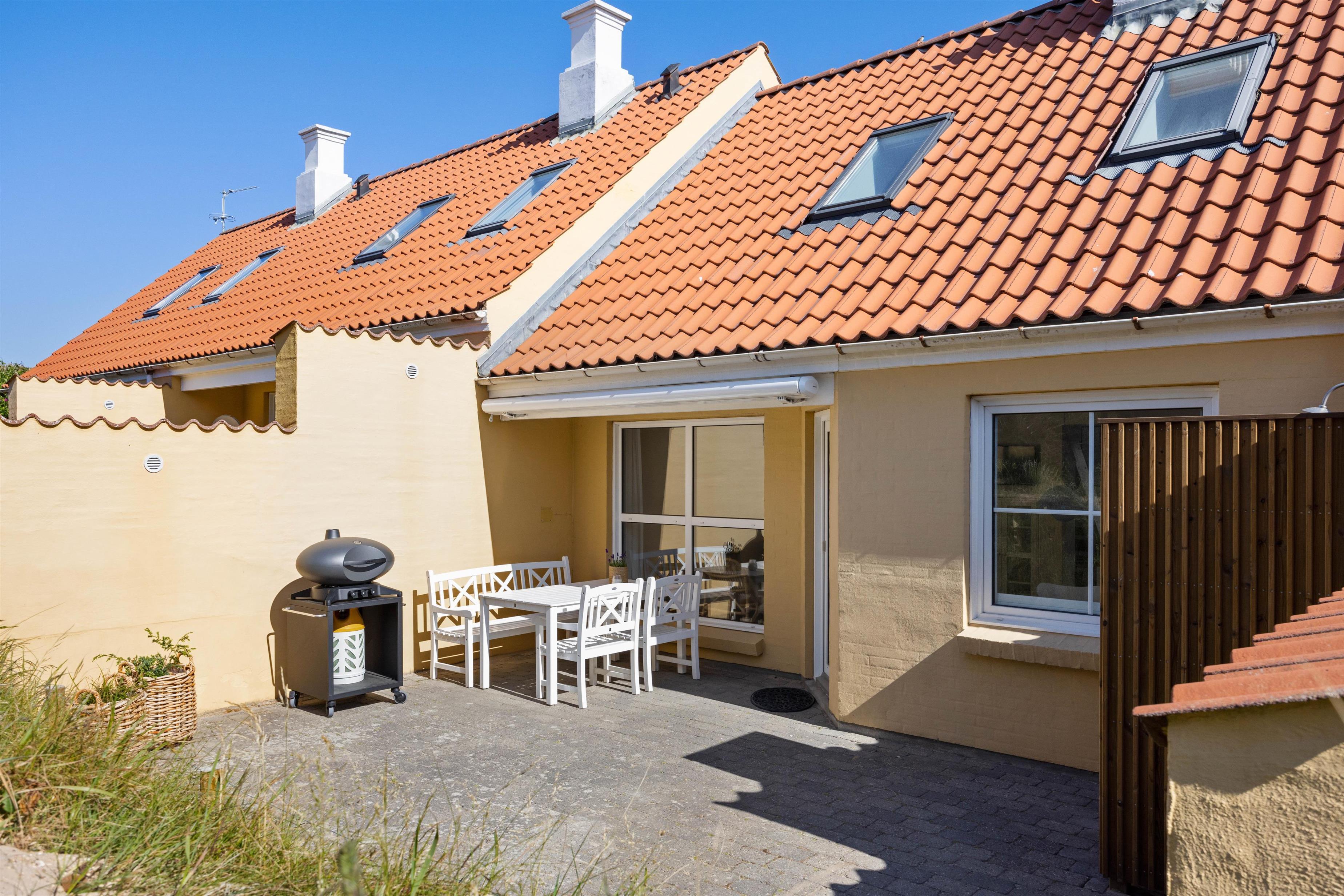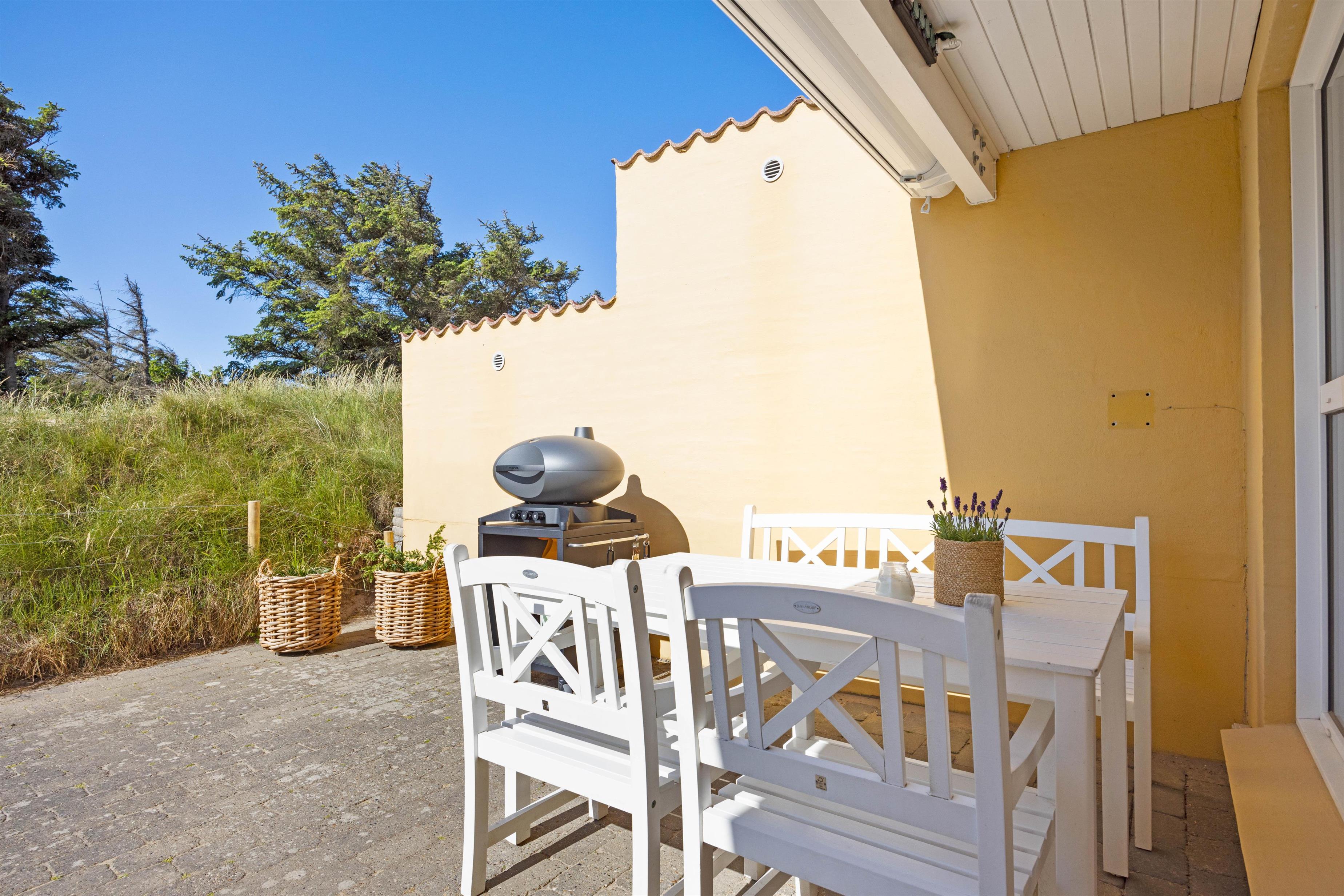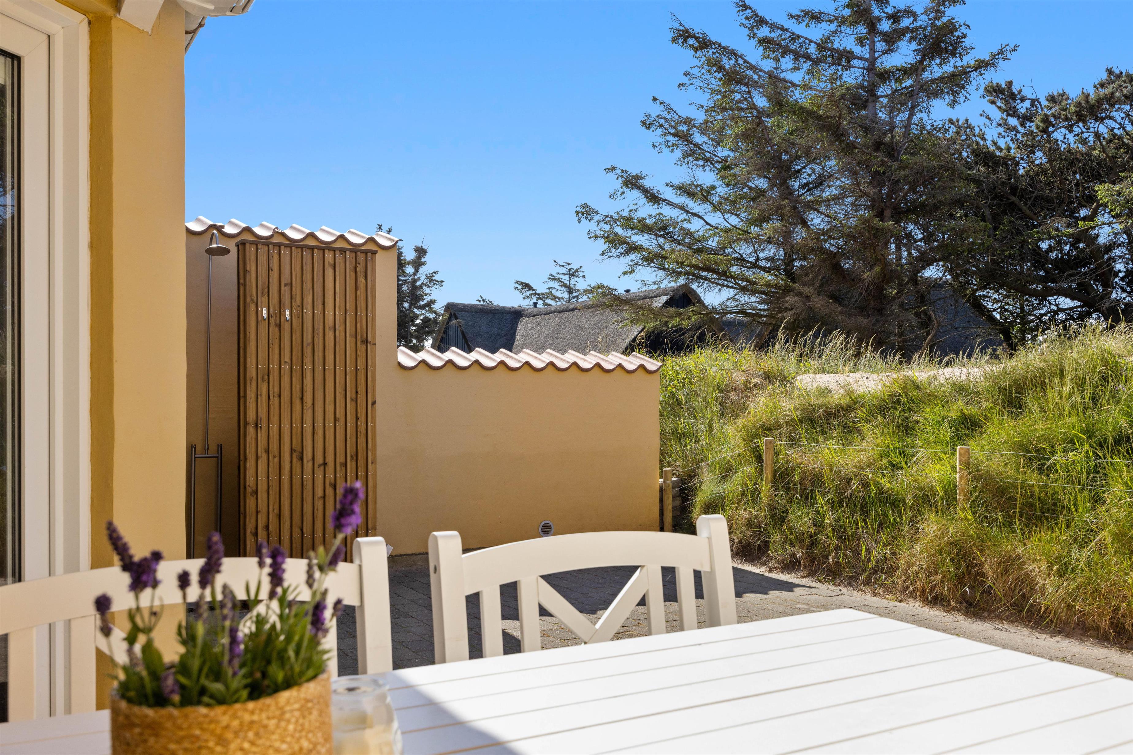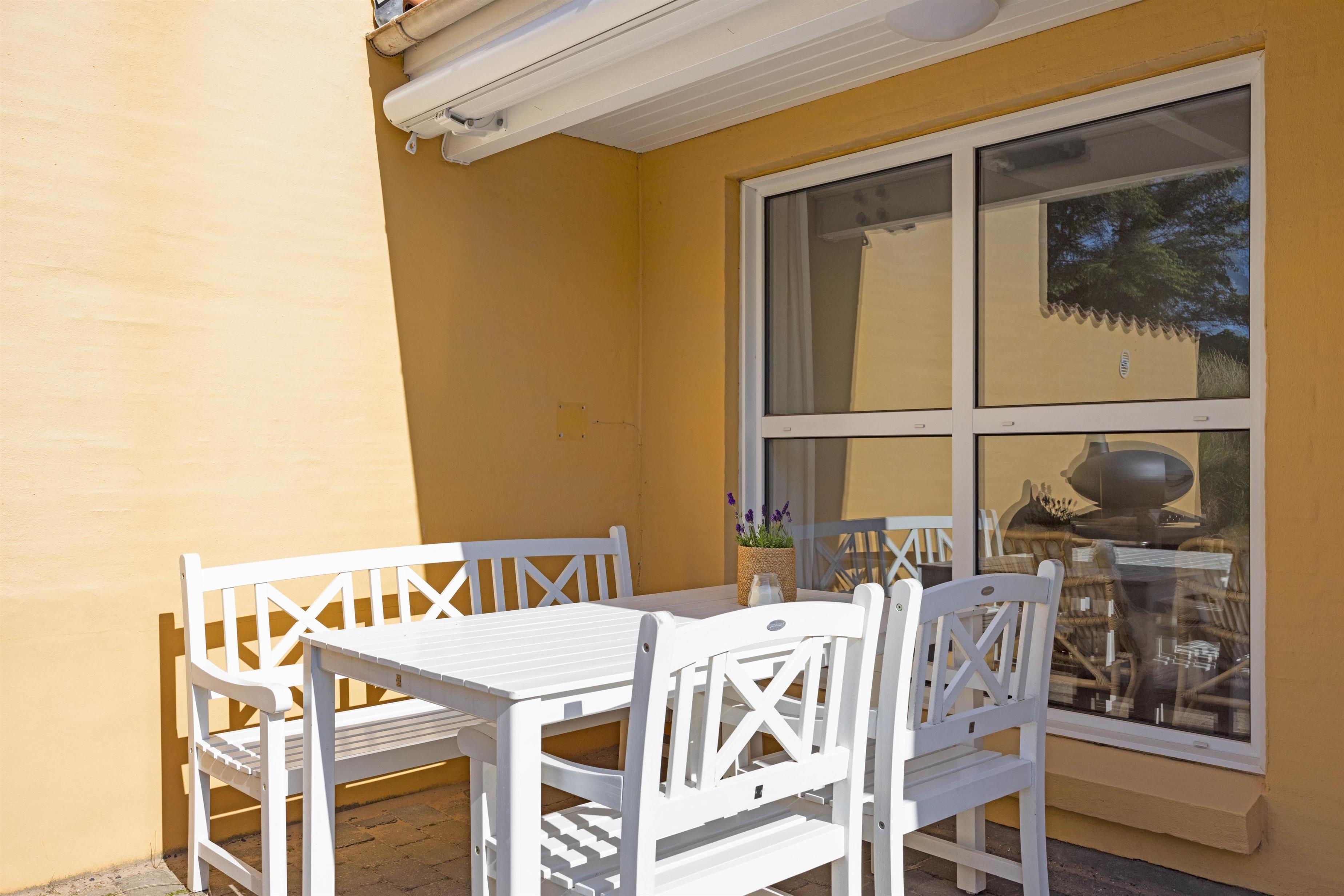 Til ferielejligheden hører en ca. 40 m2 stor terrasse, hvor både morgen-, eftermiddags- og aftenssolen kan nydes i fulde drag. Hvis solen bliver for skarp, kan I slå markisen ud og trække jer tilbage i skyggen eller hoppe under den skønne udebruser og tage et nedkølende brusebad. Den udendørs bruser vil kun kunne benyttes i perioden april til november.